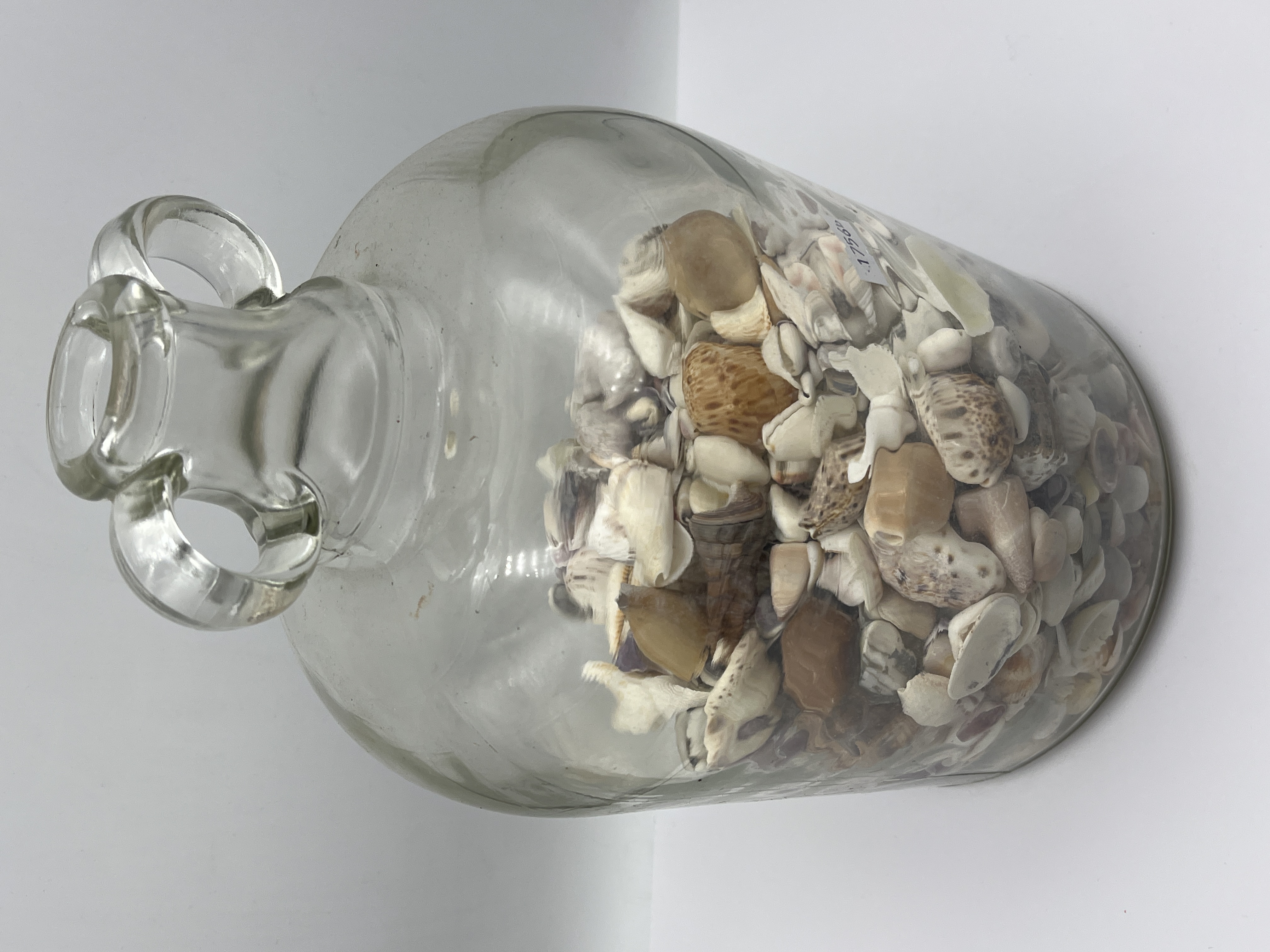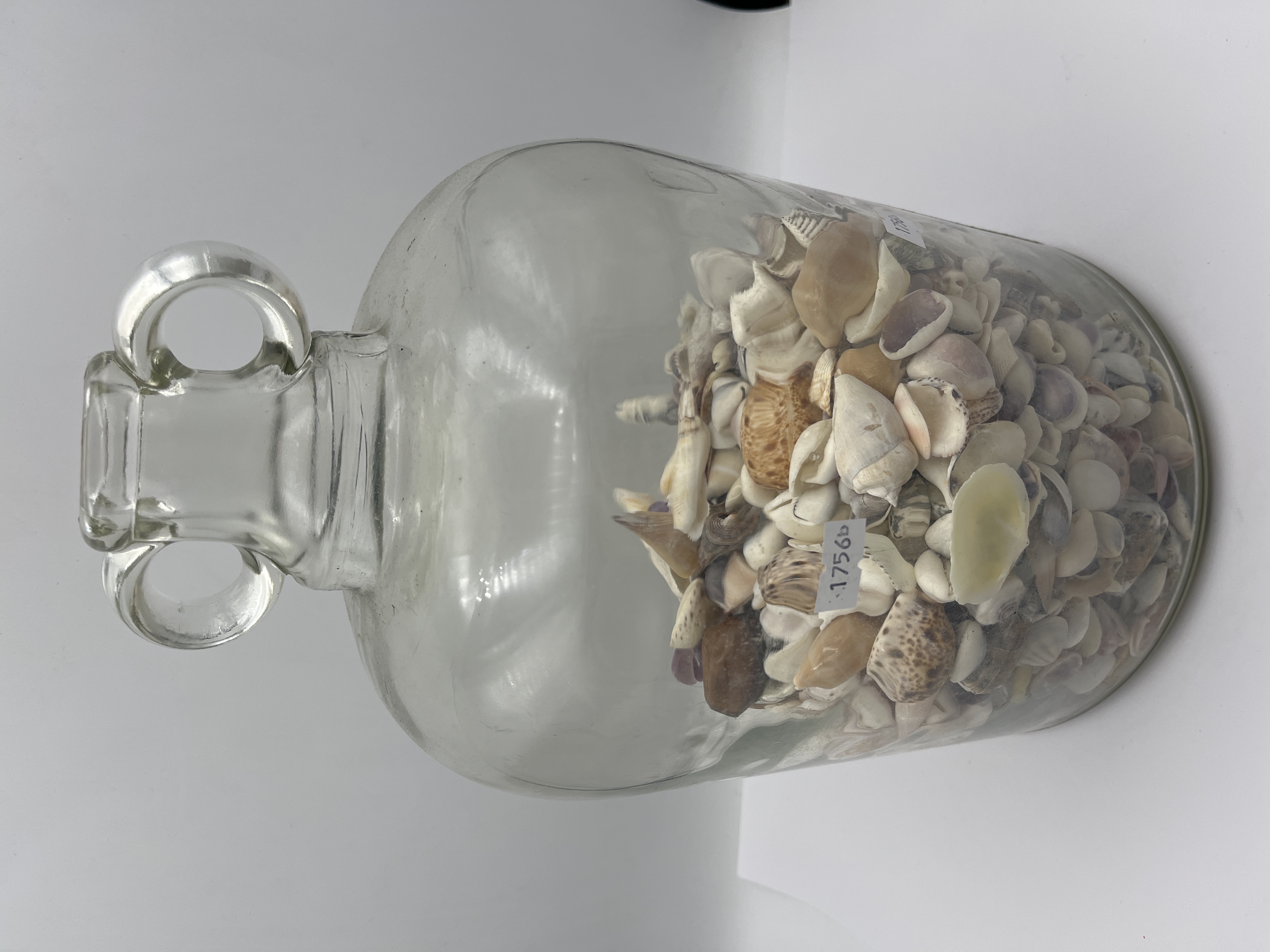 A large clear glass vessel of thick construction, featuring two integral ring handles flanking the neck. The interior contains an assortment of natural seashells of various species and sizes. The exterior bears a small white adhesive label marked 1756b.