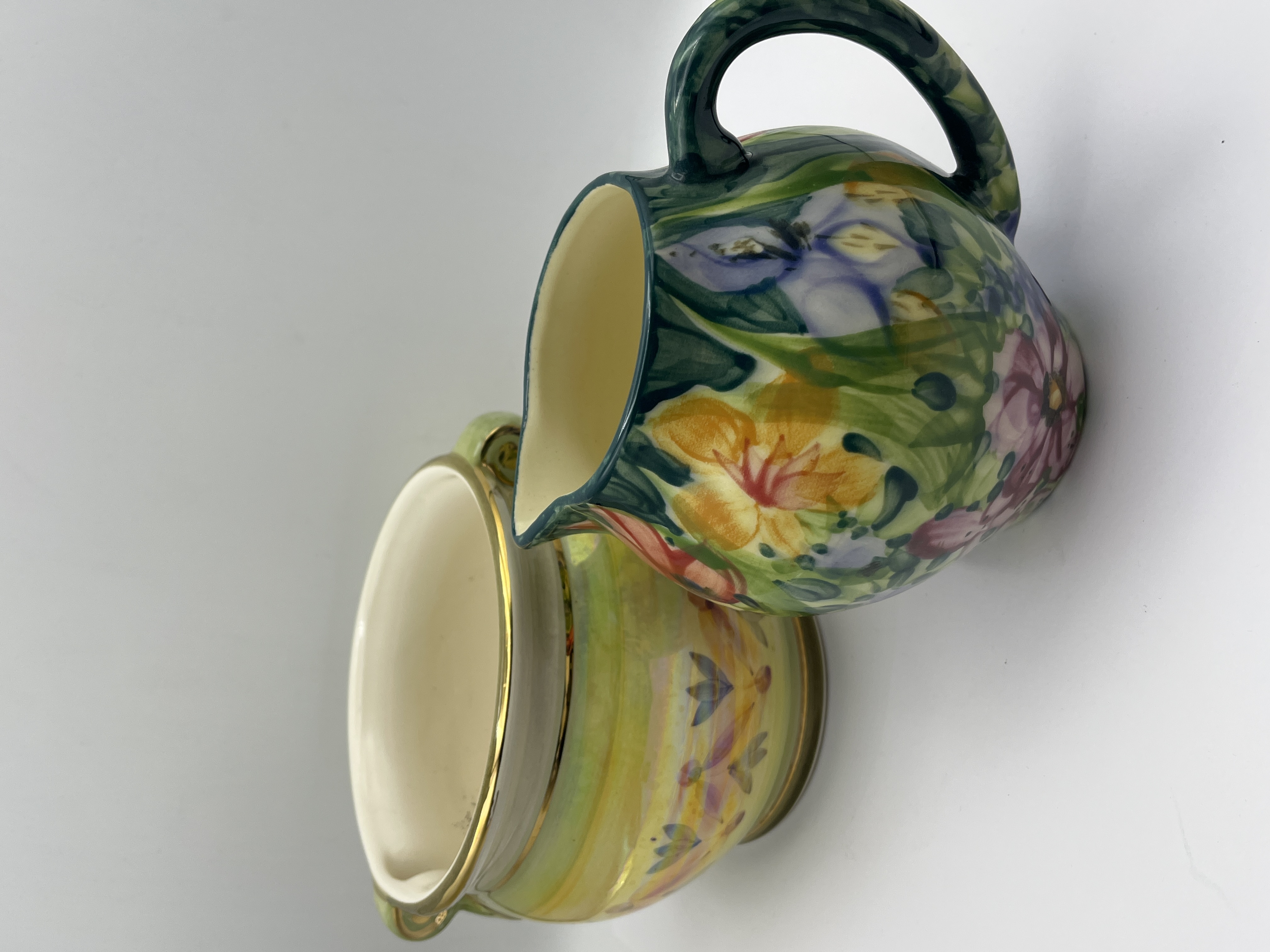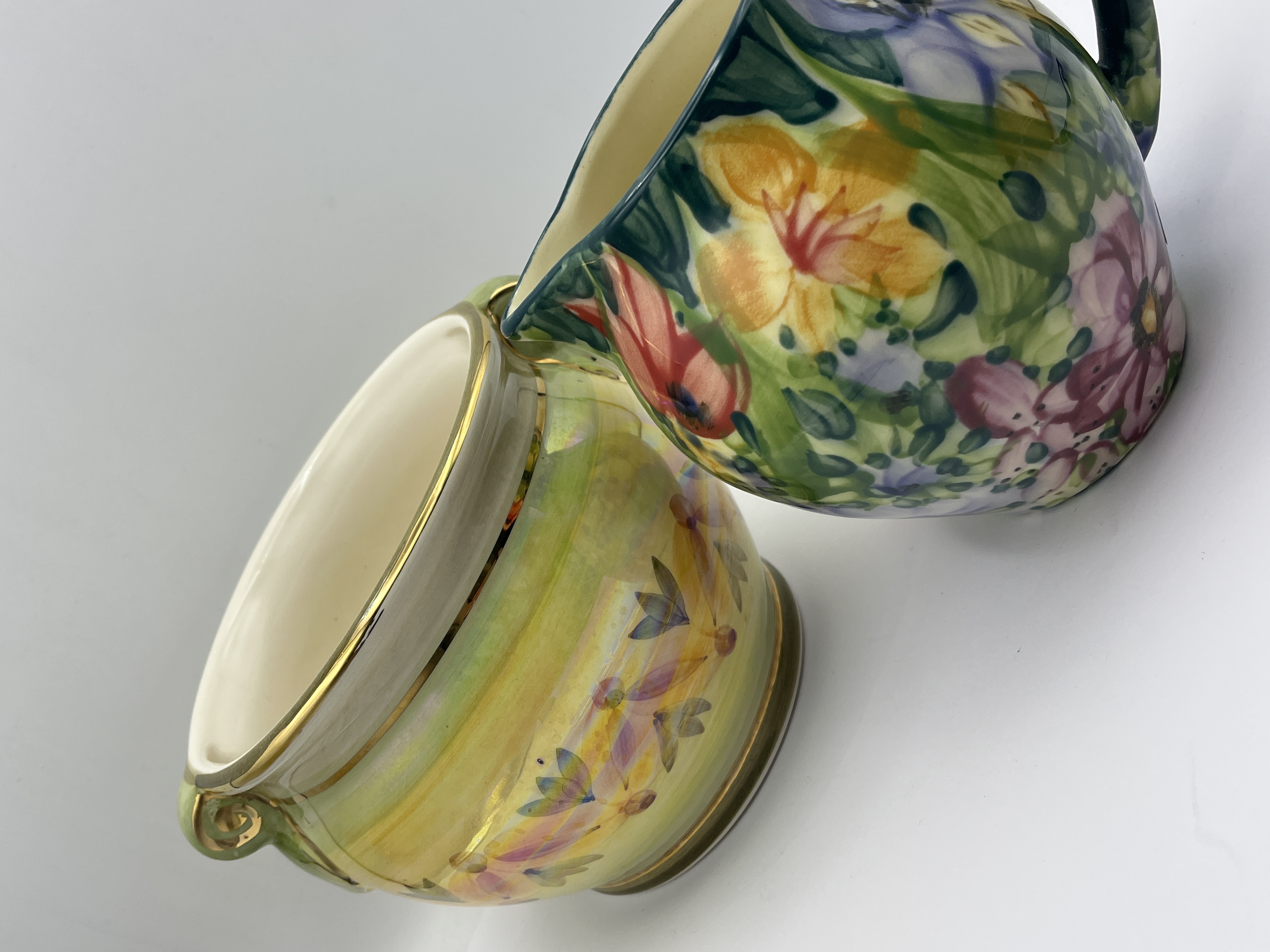 This lot features two hand-painted ceramic items, with the largest measuring 5” x 7”. The first is a floral pitcher attributed to Jay Willfred for Andrea by Sadek, manufactured in Portugal. The body is decorated with a multi-colored floral pattern on a green-tinted ground, featuring a dark green handle and a pale cream interior. The base displays a handwritten artist’s mark in black script. The second item is a rounded decorative vessel produced by Cottage Garden in Poland. This piece exhibits an iridescent luster glaze in shades of yellow and green with stylized floral motifs and a gilded rim. The base is marked with the Cottage Garden stamp, Hand Painted, Made in Poland, and the handwritten designation 2253/FM.