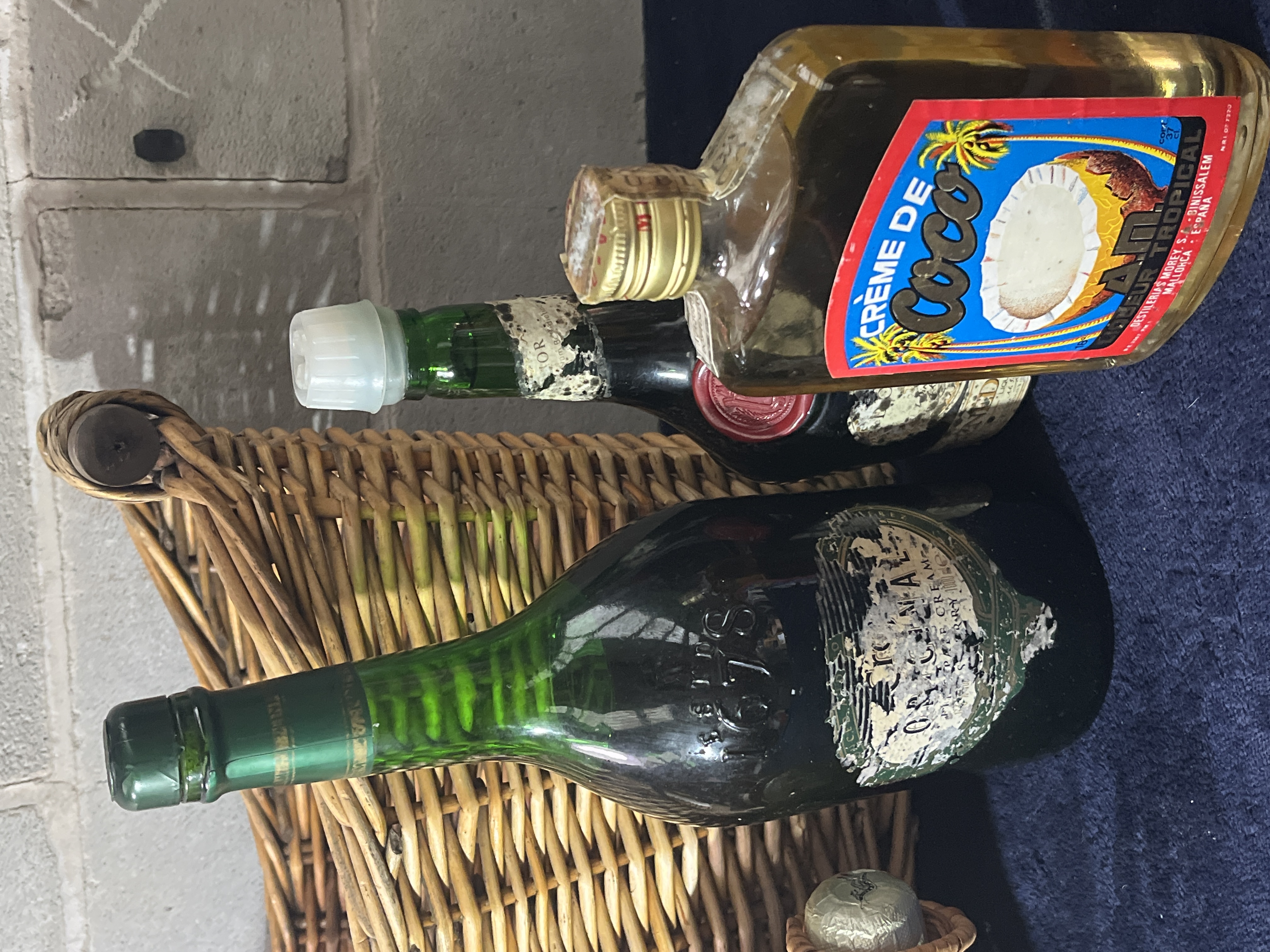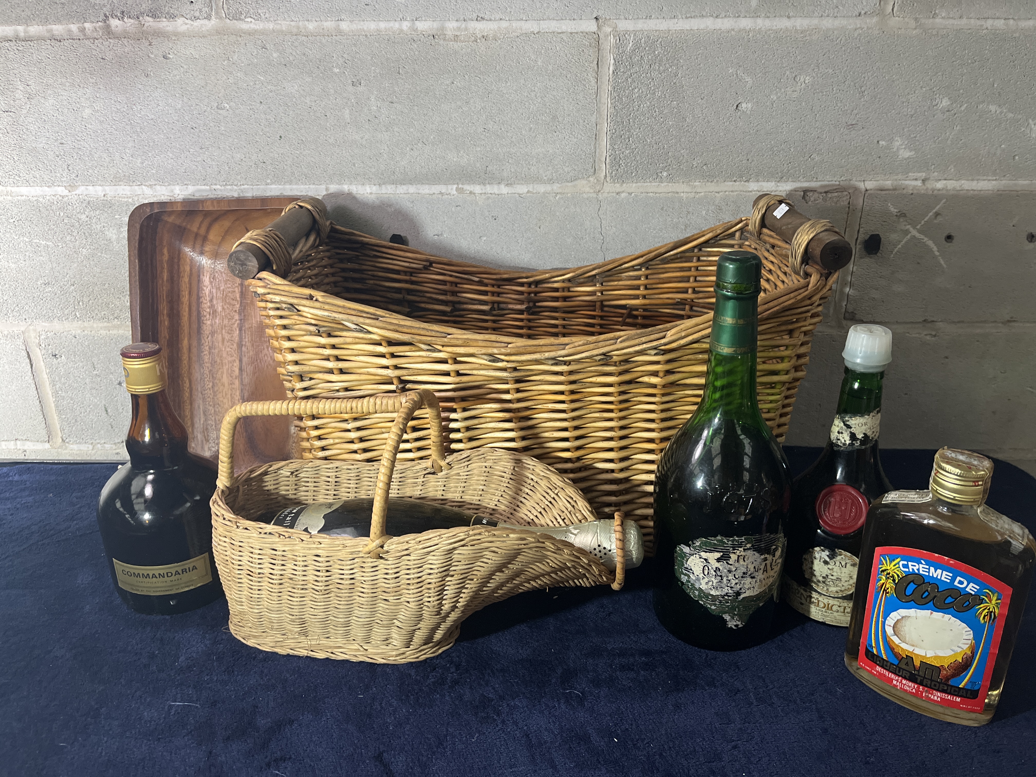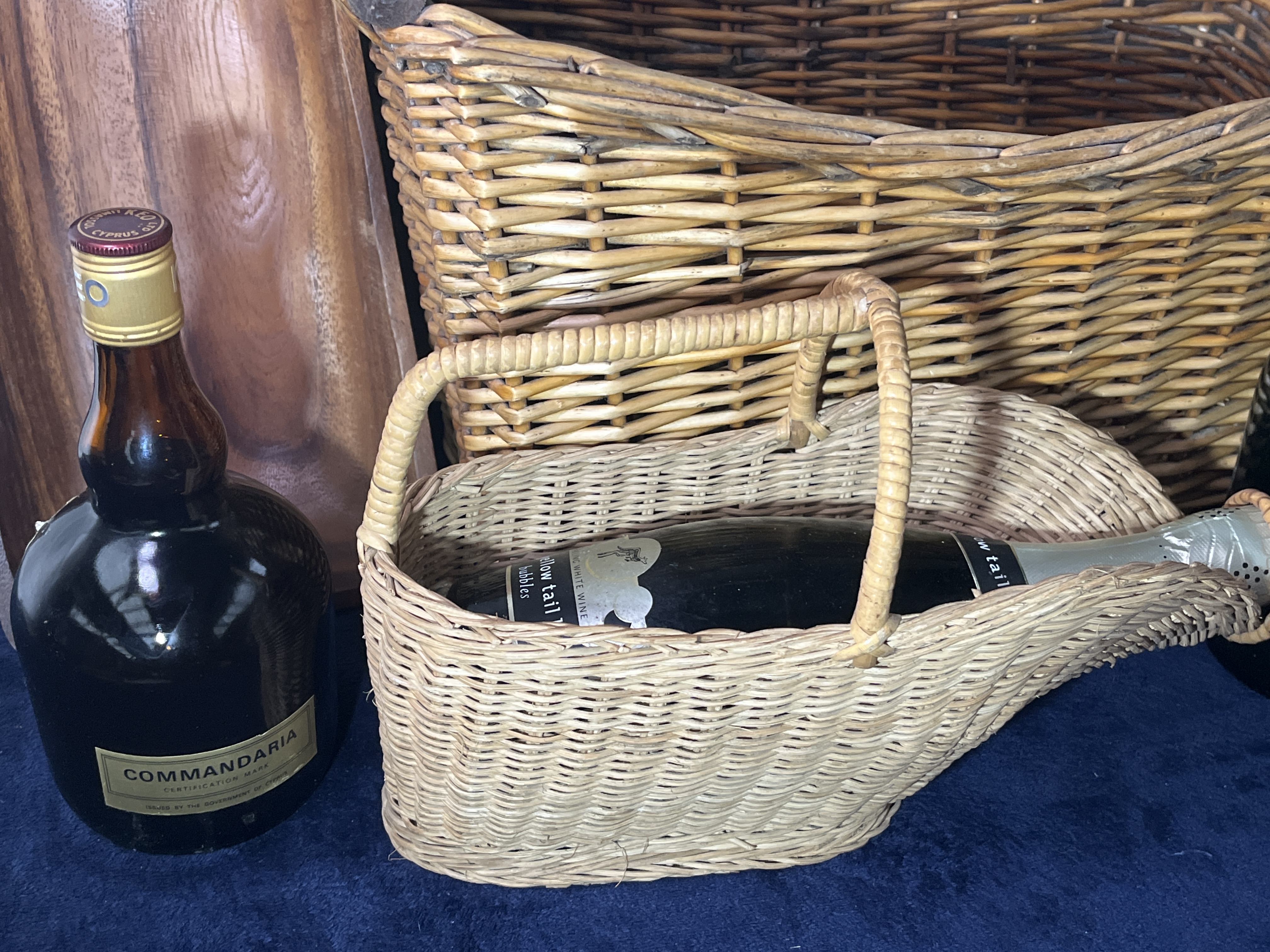 An assortment of vintage and contemporary spirits and barware. The collection includes a bottle of Commandaria Cyprus dessert wine, a bottle of [yellow tail] sparkling wine housed in a woven wicker pouring cradle, a large green glass bottle of Harveys Bristol Cream sherry, a bottle of Bénédictine D.O.M. liqueur featuring a red wax seal, and a bottle of AM Crème de Coco tropical liqueur. Accompanying the bottles is a large rectangular wicker basket with dark-toned wooden handles and a carved wooden serving tray. The wicker components include a pouring basket and a larger basket consistent with French grape harvest styles. Labels on the bottles show various branding and origin markings including Cyprus, France, and Spain.