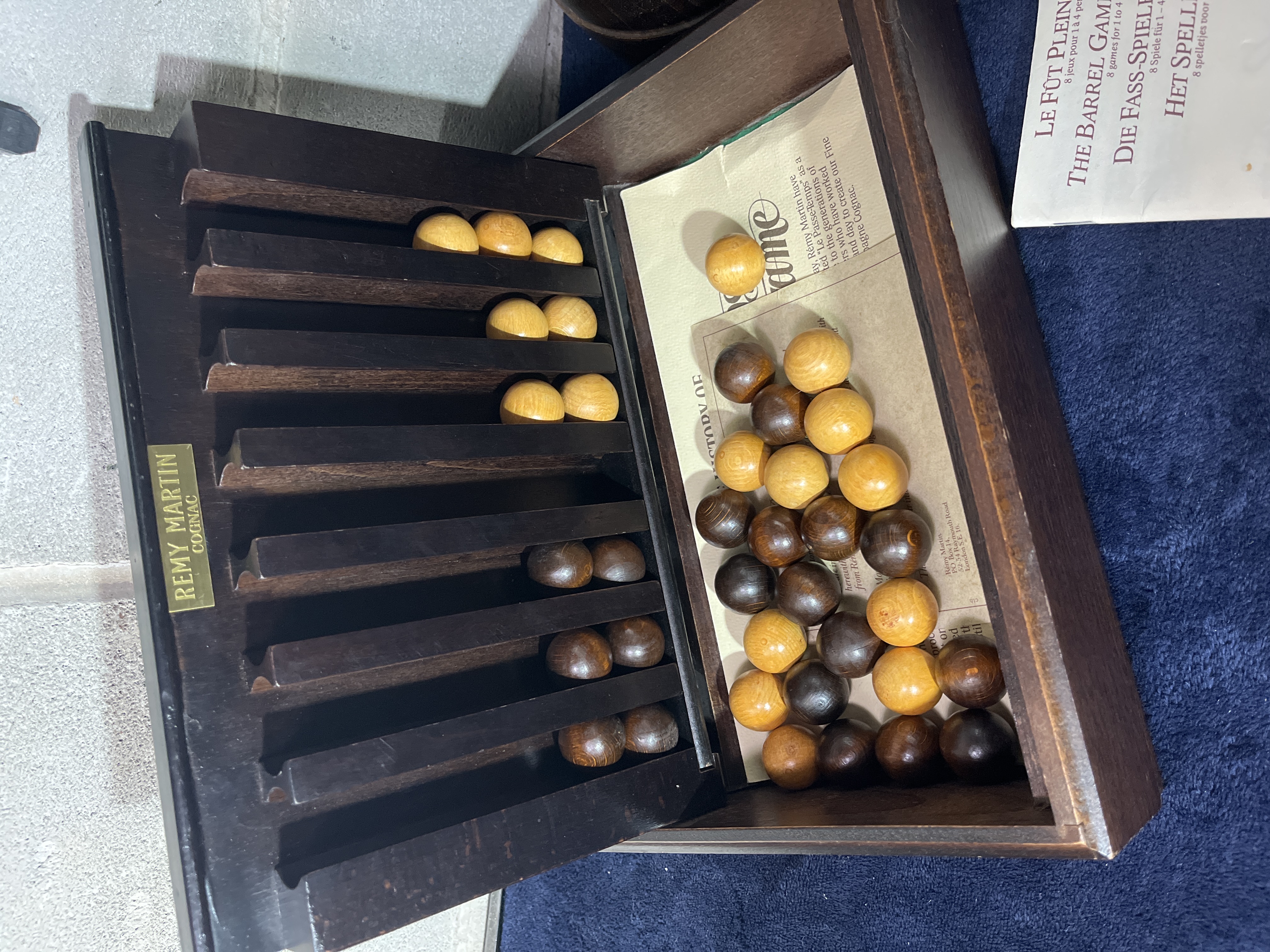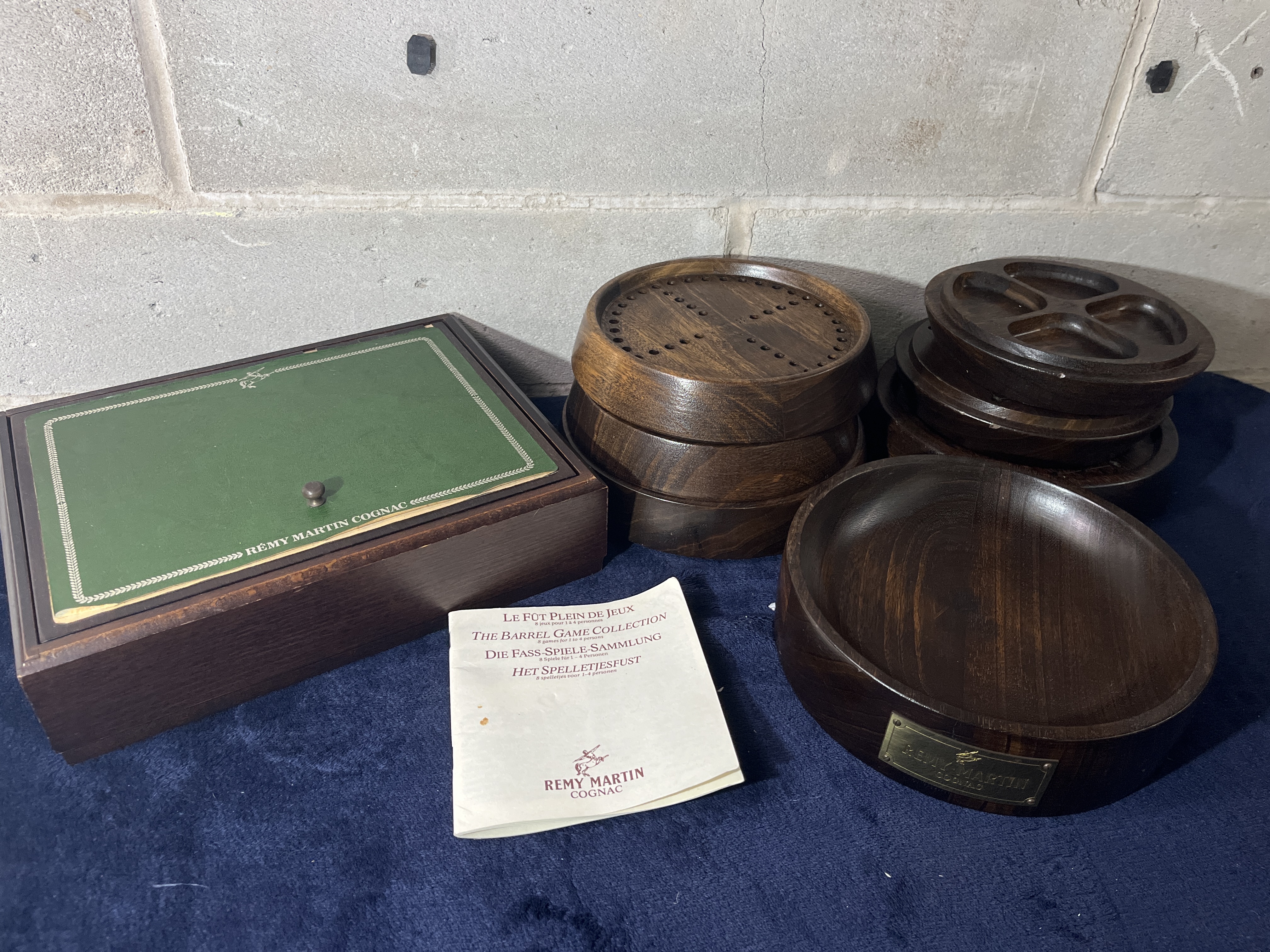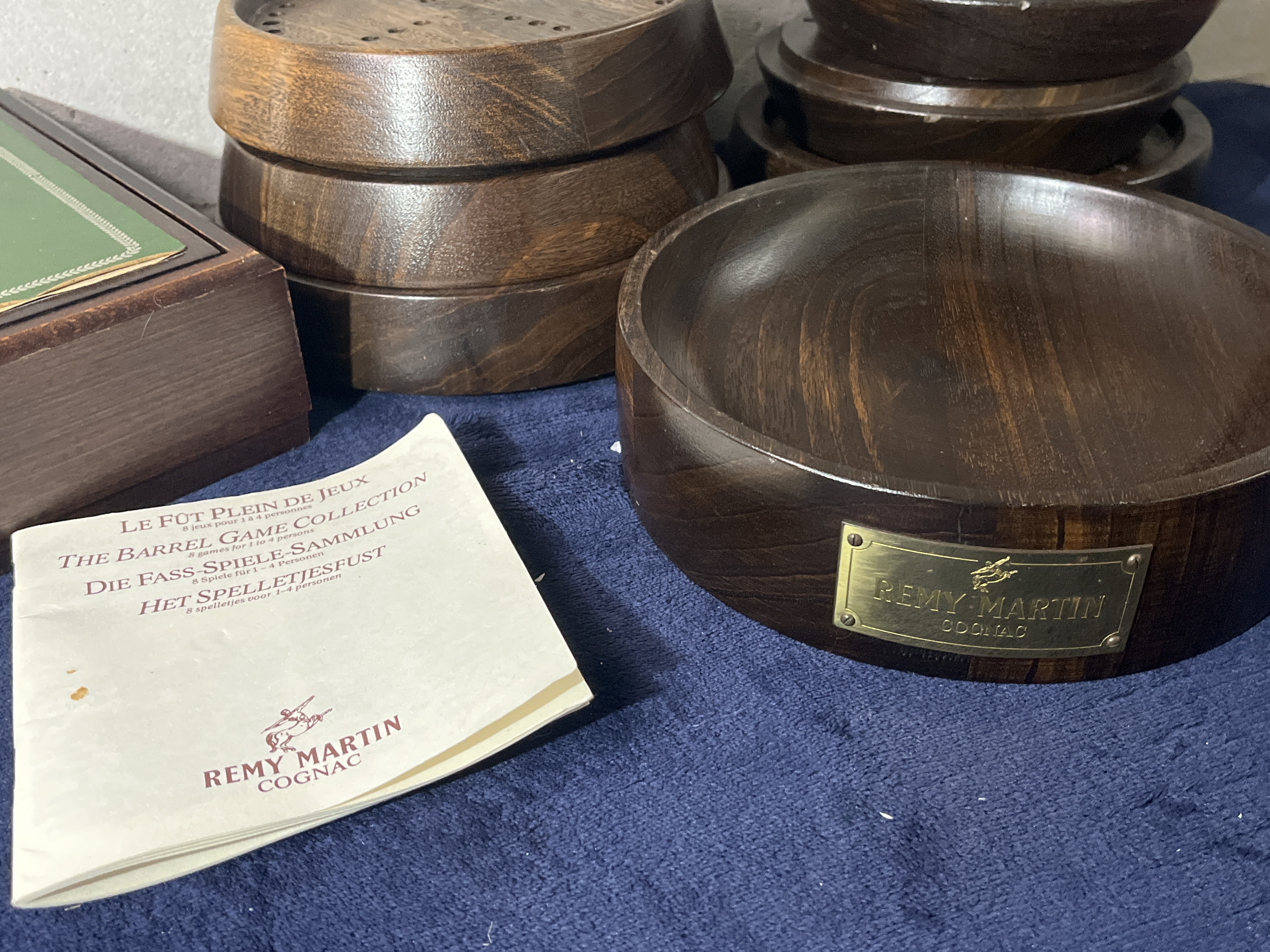 This Remy Martin branded Le Fut Plein de Jeux (The Barrel Game Collection) comprises a series of circular, dark-stained wooden game boards and a coordinating wooden storage box with a green inset lid. The collection includes multiple stackable game tiers with perforated surfaces designed for peg-based games, a base tray featuring a brass Remy Martin Cognac nameplate, and an assortment of light and dark wooden game spheres. An original multilingual instruction manual is included, detailing games for one to four players such as The Cask Full of Games. The storage box features a hinged lid with a green surface and a small wooden pull knob. The base tray is fitted with a brass plaque inscribed Remy Martin Cognac.