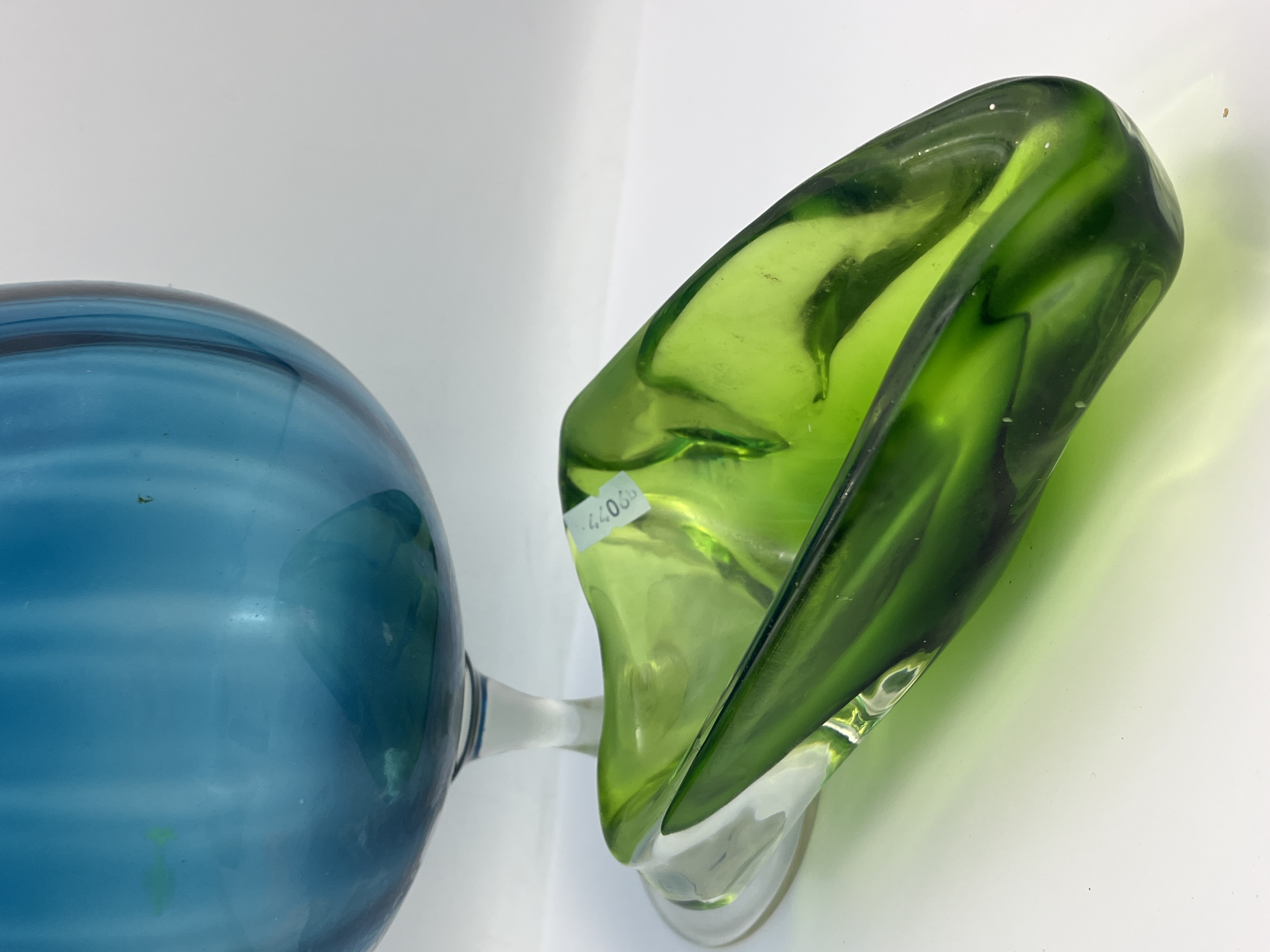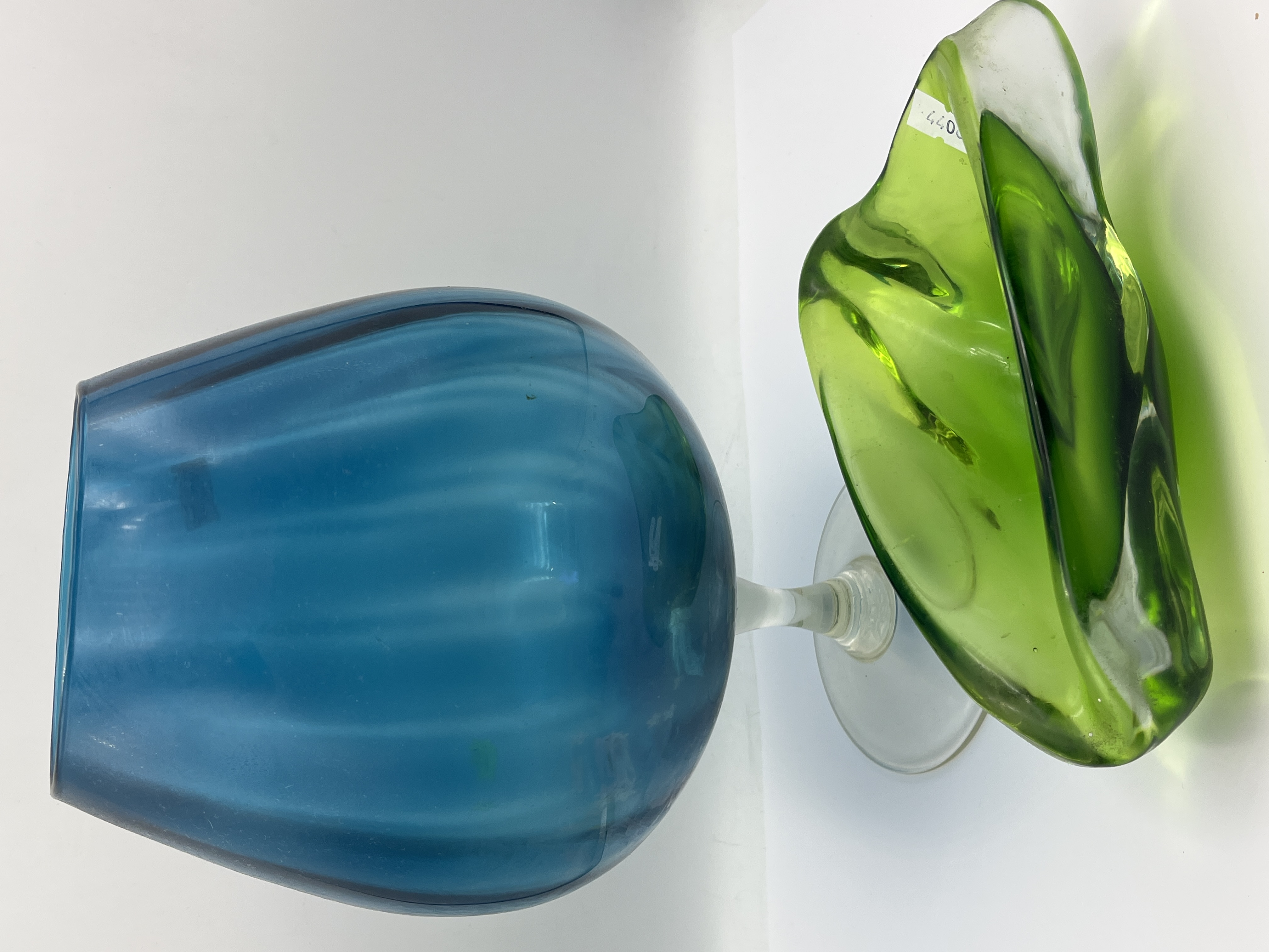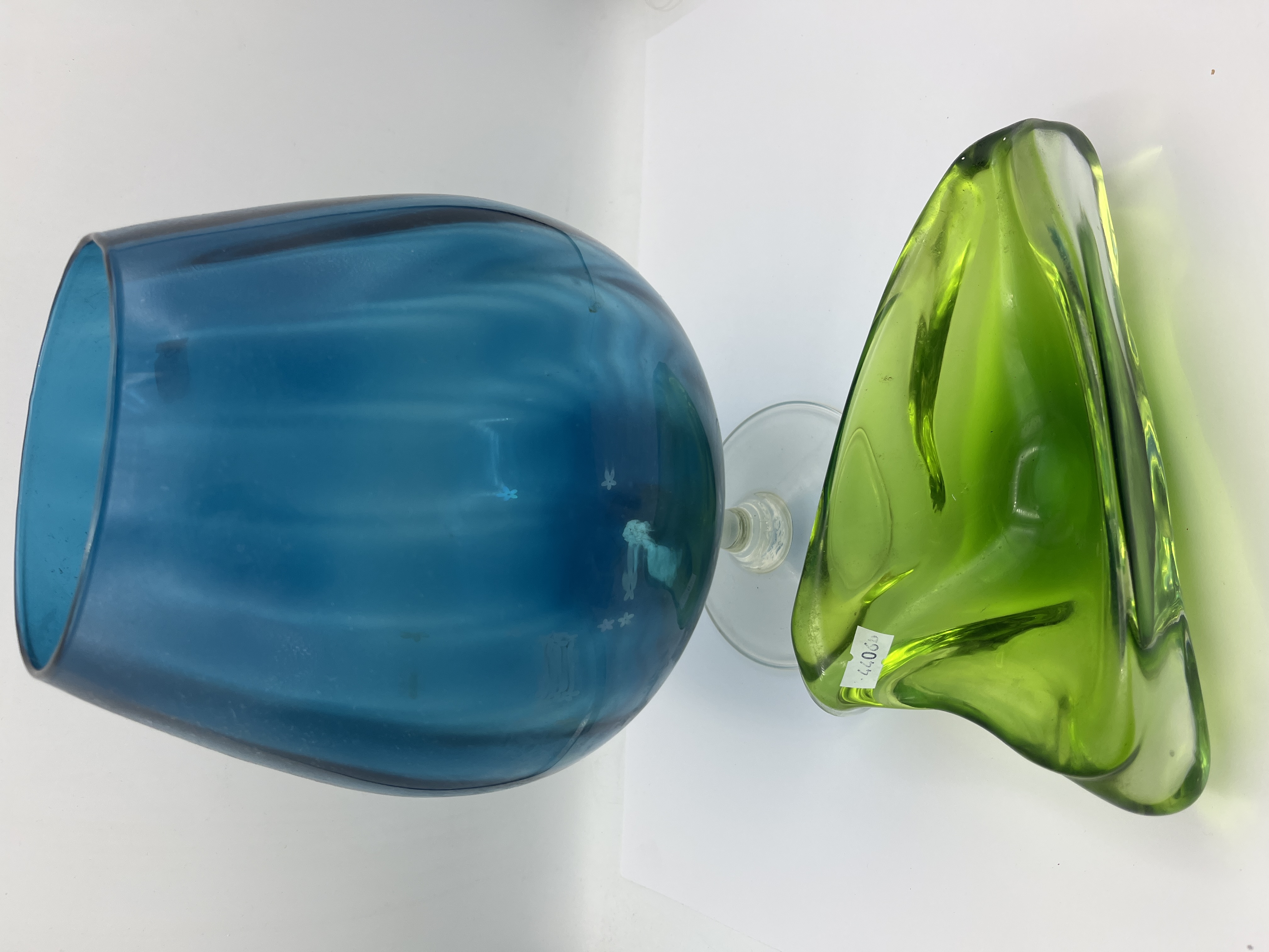 This lot consists of two pieces of mid-century modern art glass. The first is an oversized blue glass decorative vessel in a brandy snifter form, featuring a vertical optic rib pattern and a clear glass stem on a circular foot. This item is consistent with the Epic line produced by Viking Glass. The second item is a green glass bowl of organic, triform sculptural shape with thick, folded rims. The bowl is hand-blown and retains a small white adhesive label marked 44066.