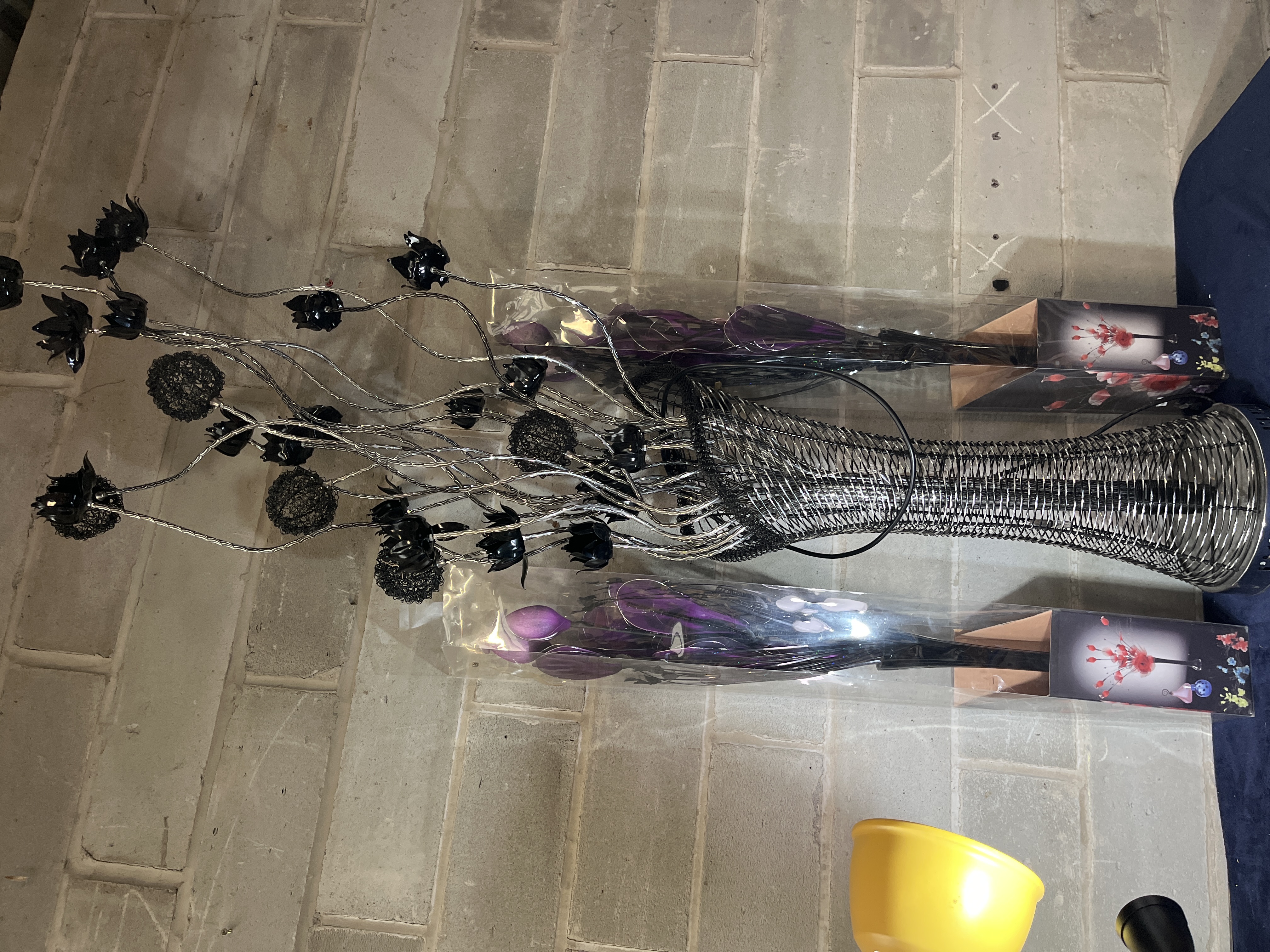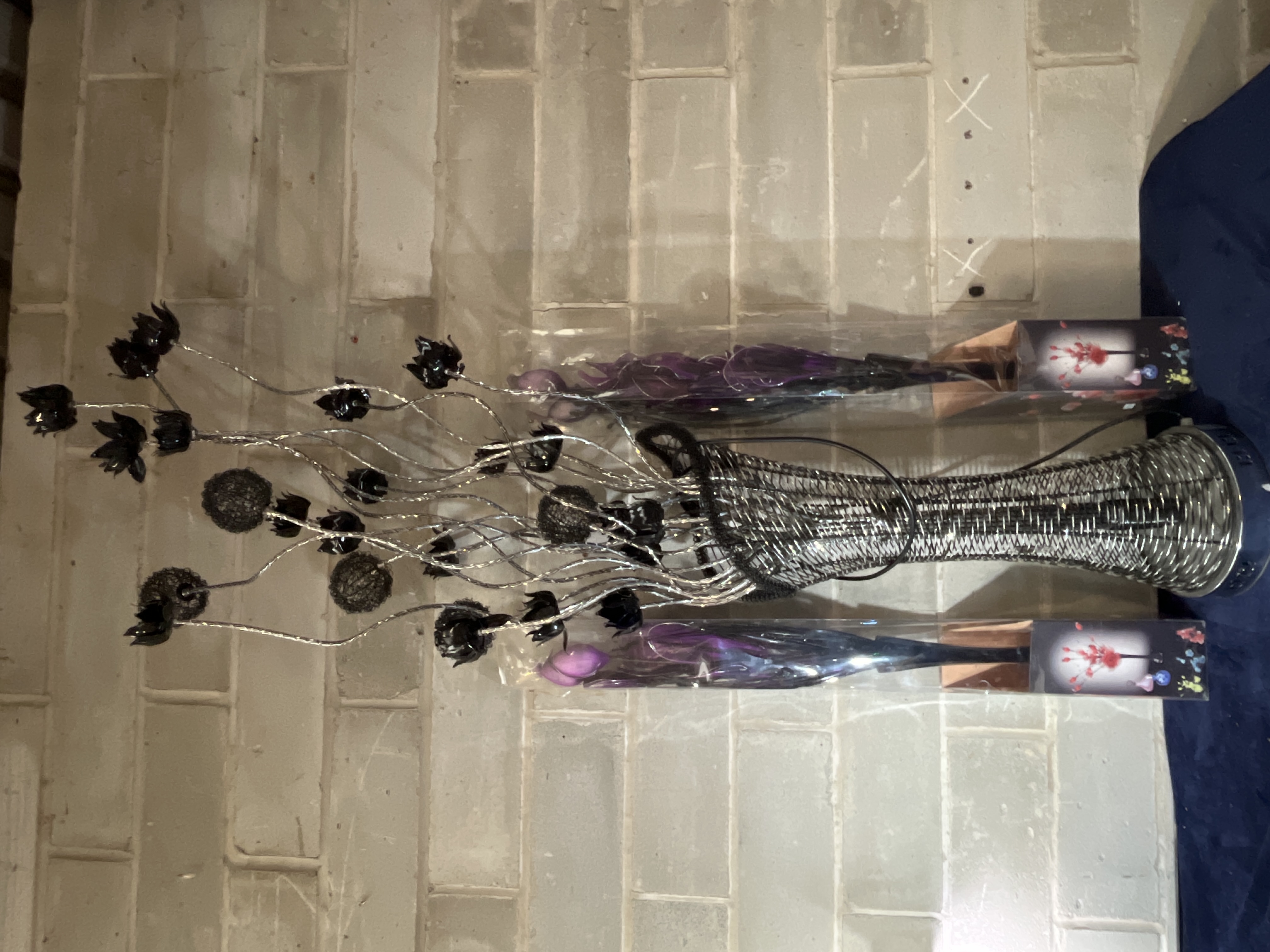 A trio of lighting items comprising one ELUKHT aluminum flower vase LED floor lamp and two packaged sets of decorative lighting branches. The floor lamp is constructed with a silver-tone woven wire mesh base and neck in a stylized vase form. Multiple silver-colored twisted wire branches extend from the neck, tipped with black decorative botanical ornaments including stylized floral heads and woven mesh spheres. The additional components consist of two sets of purple-toned decorative lights or branches in their original clear plastic and cardboard retail packaging.