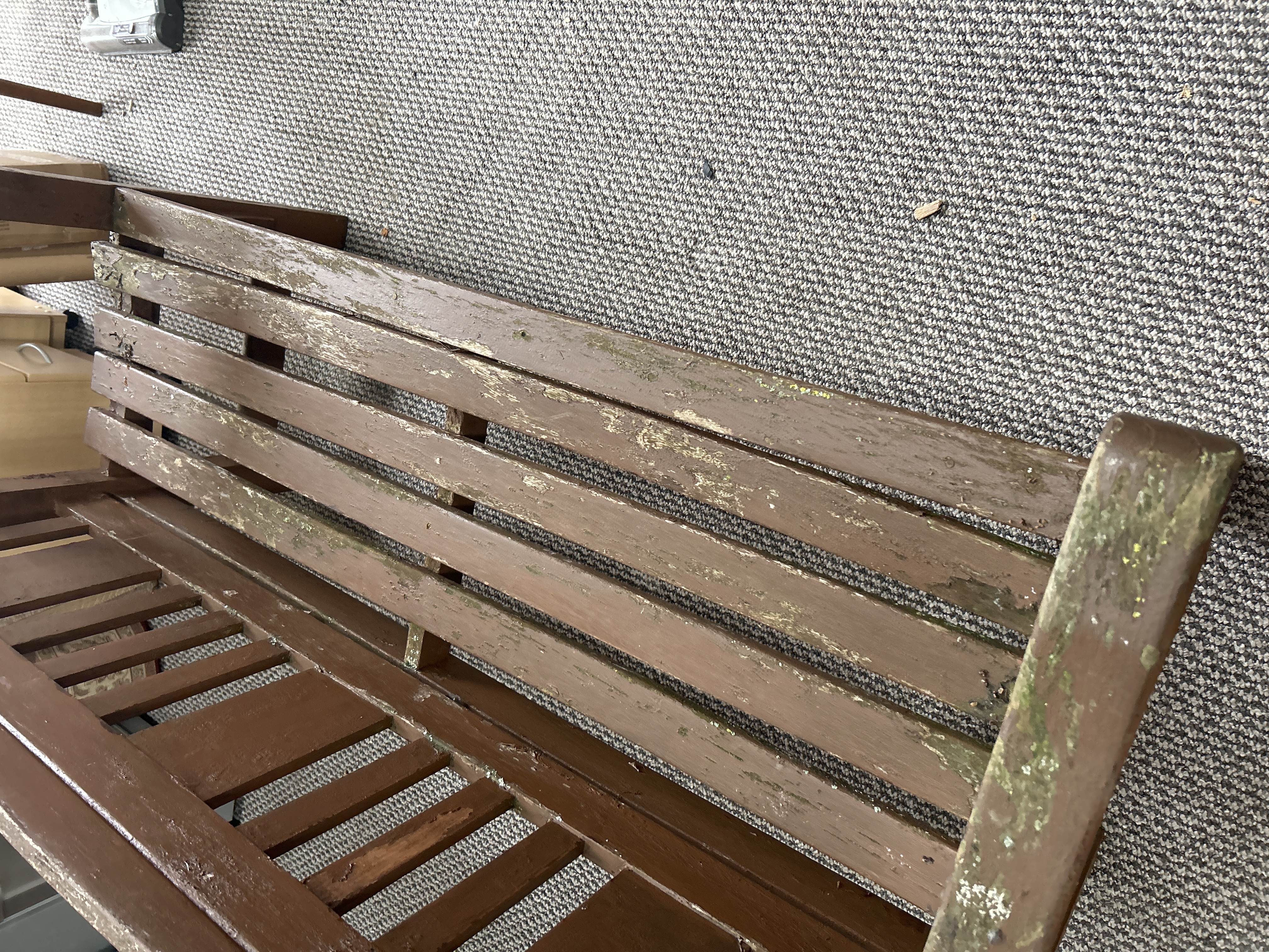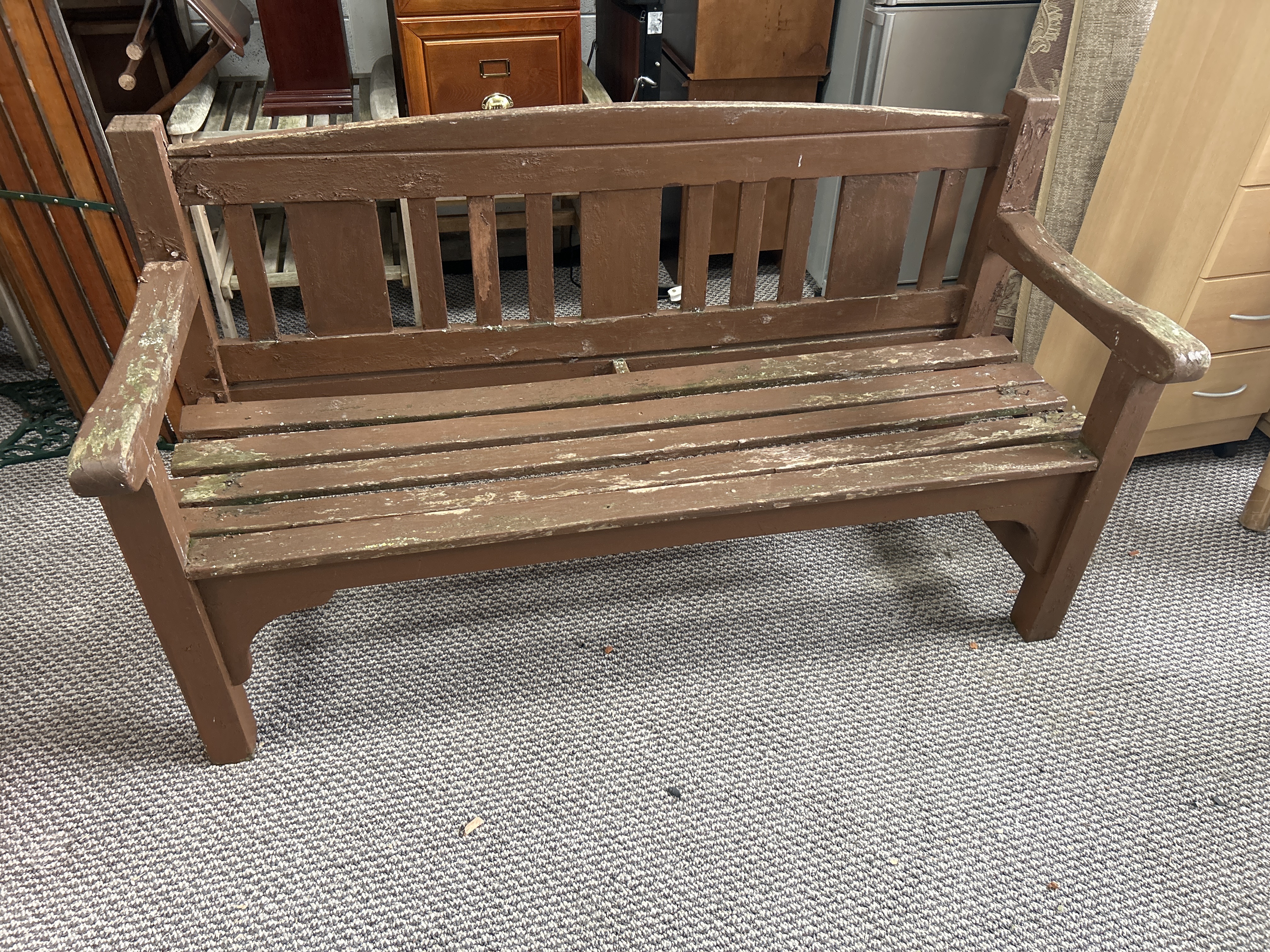 A wooden garden bench featuring a slatted seat and a backrest composed of vertical slats beneath a slightly arched top rail. The structure is built with square-cut legs and broad armrests. The piece is finished in a brown paint and lacks any visible manufacturer’s markings or stamps.