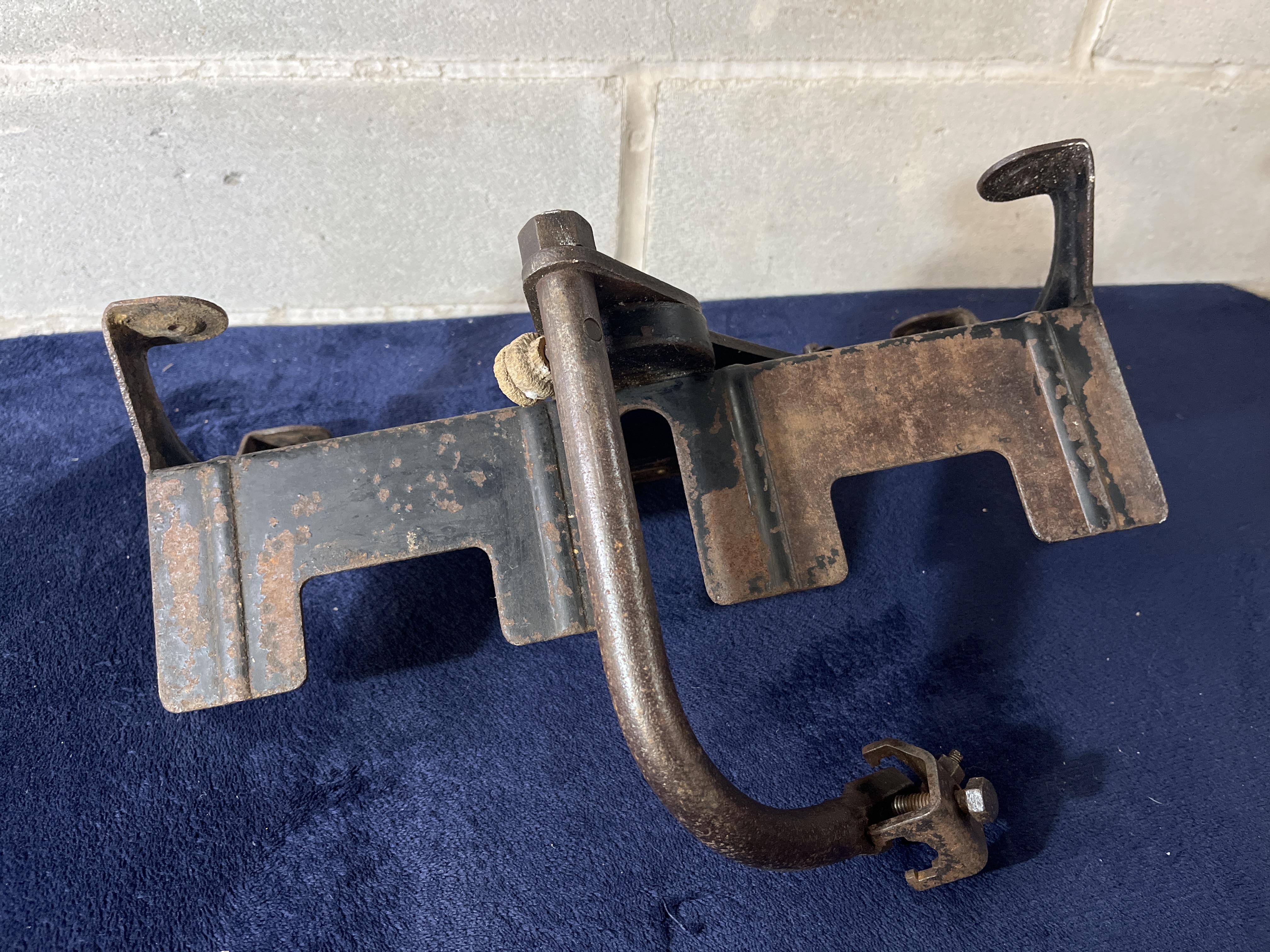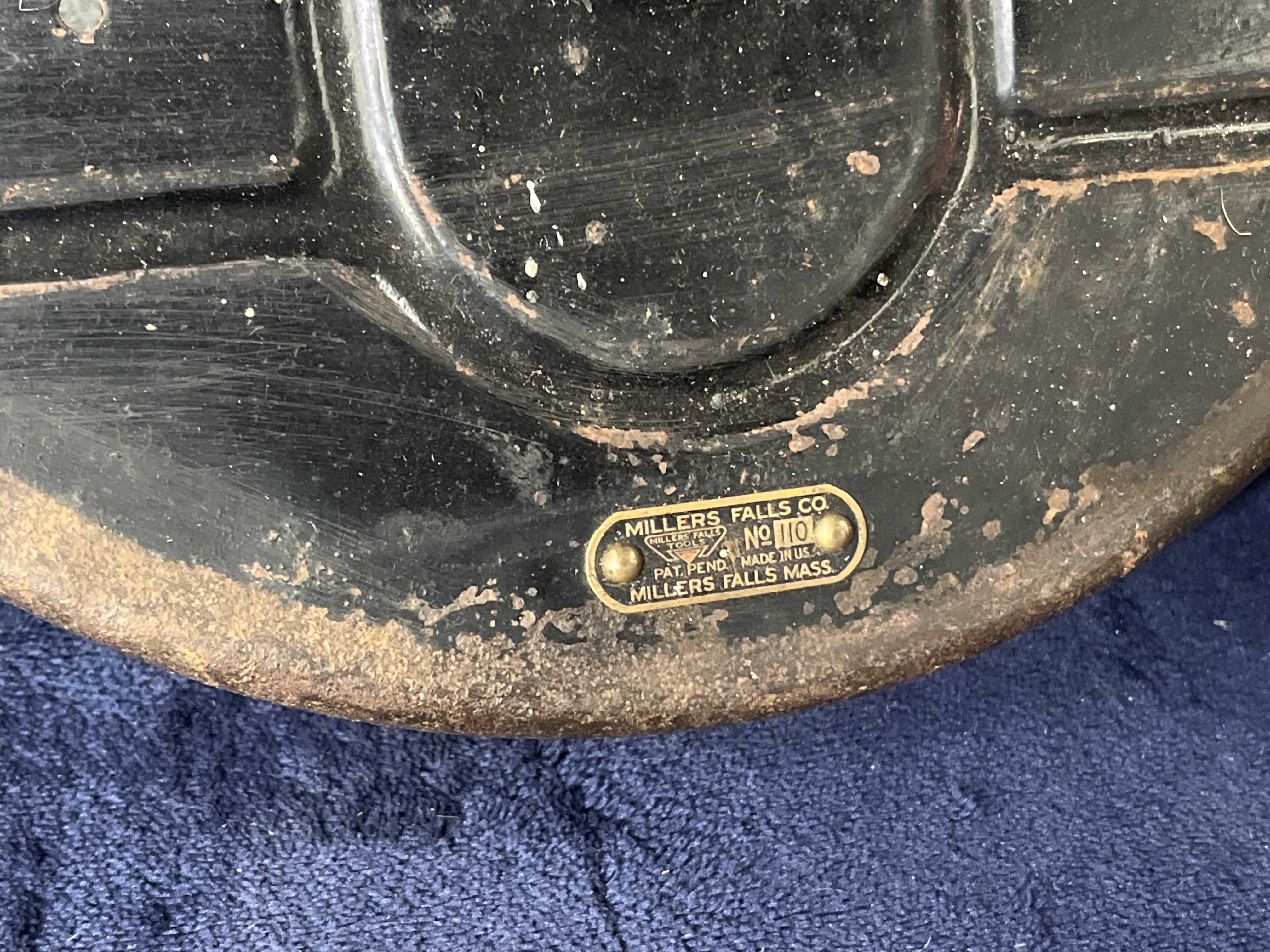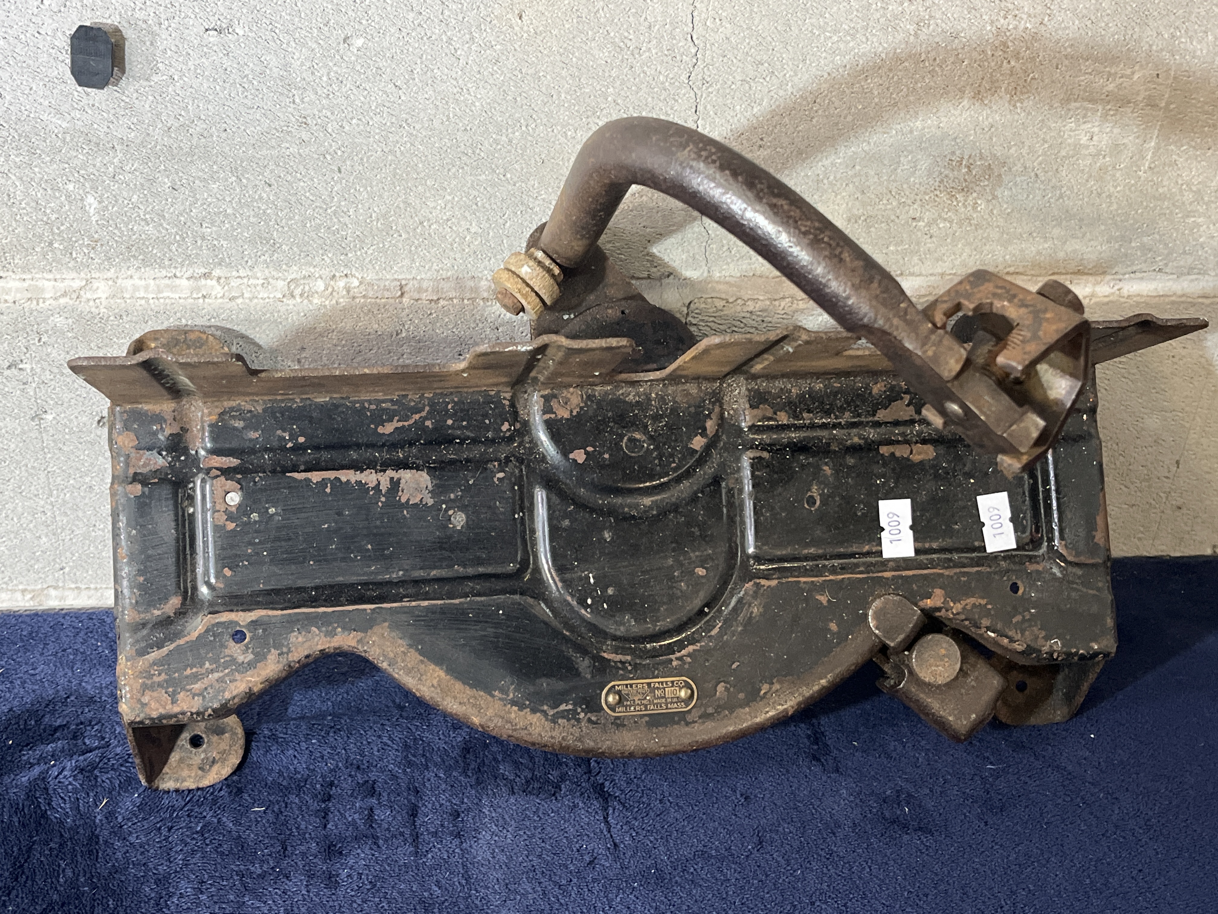 A Millers Falls Co. No. 110 miter box constructed of heavy-gauge metal with a black enamel finish. This industrial hand tool features a curved guide arm and an original brass manufacturer’s identification plate. The plate is stamped with the text MILLERS FALLS CO. No 110 PAT. PEND. MADE IN U.S.A. MILLERS FALLS MASS. The front face of the tool displays two white inventory stickers numbered 1009.
