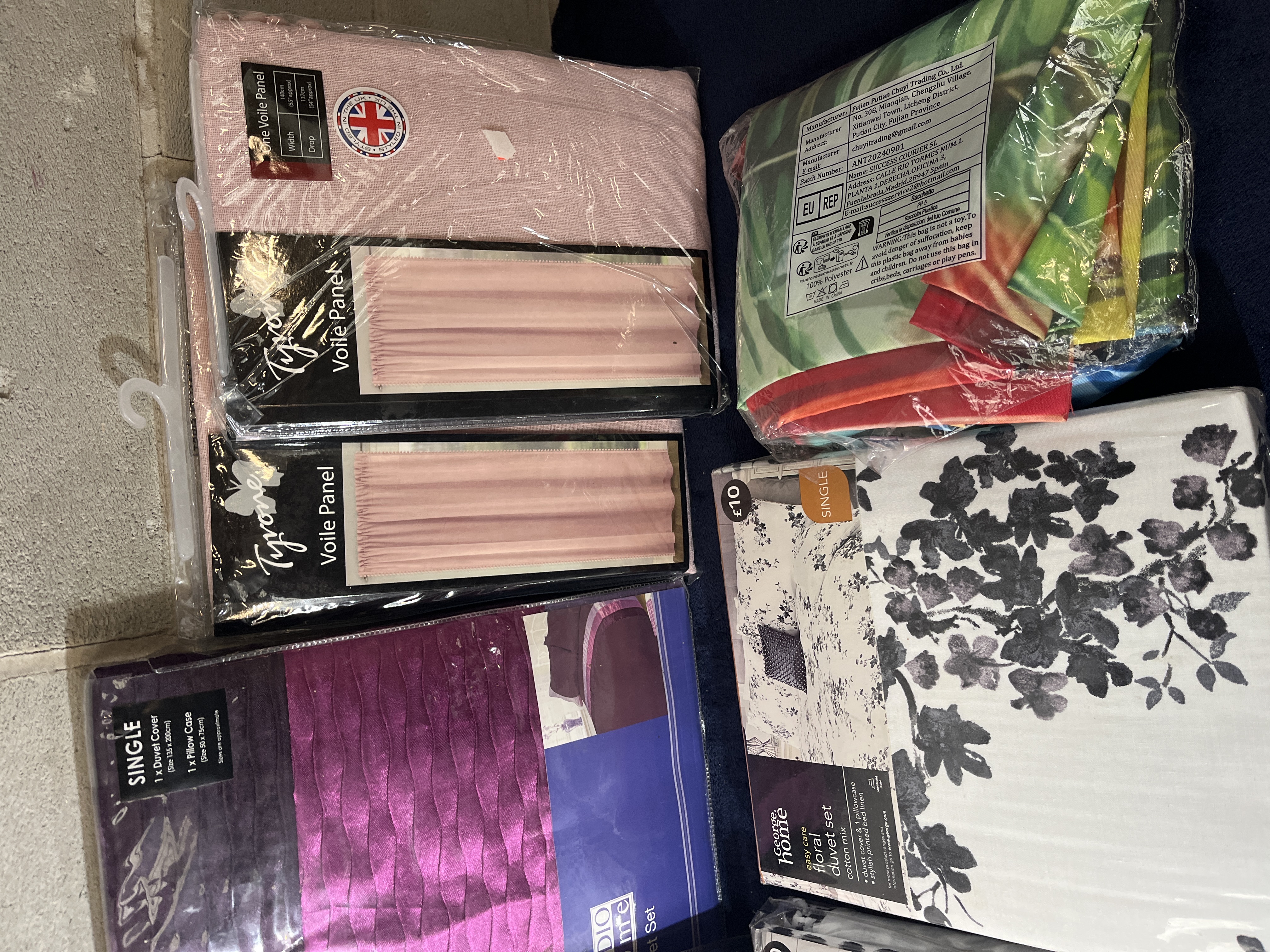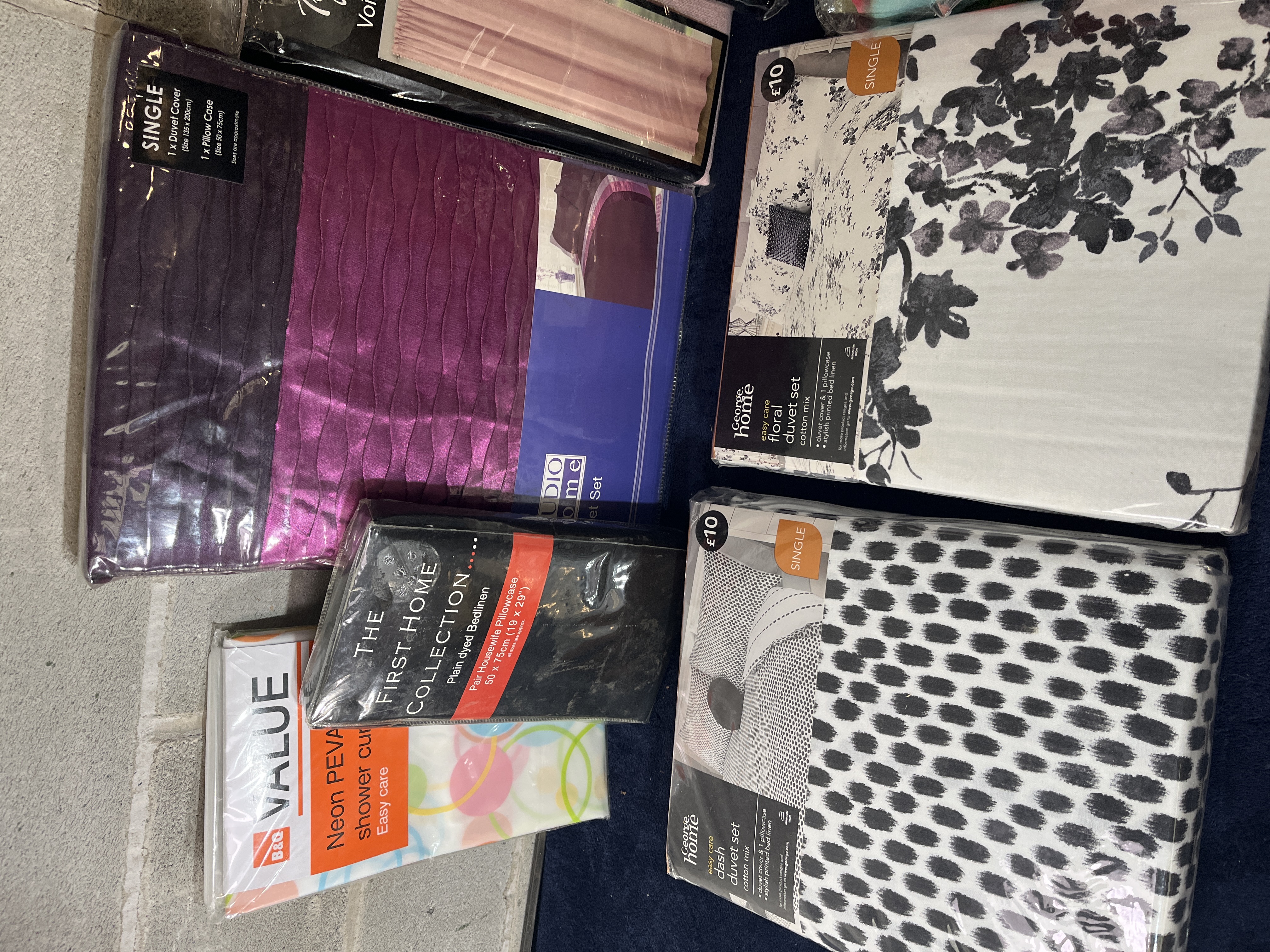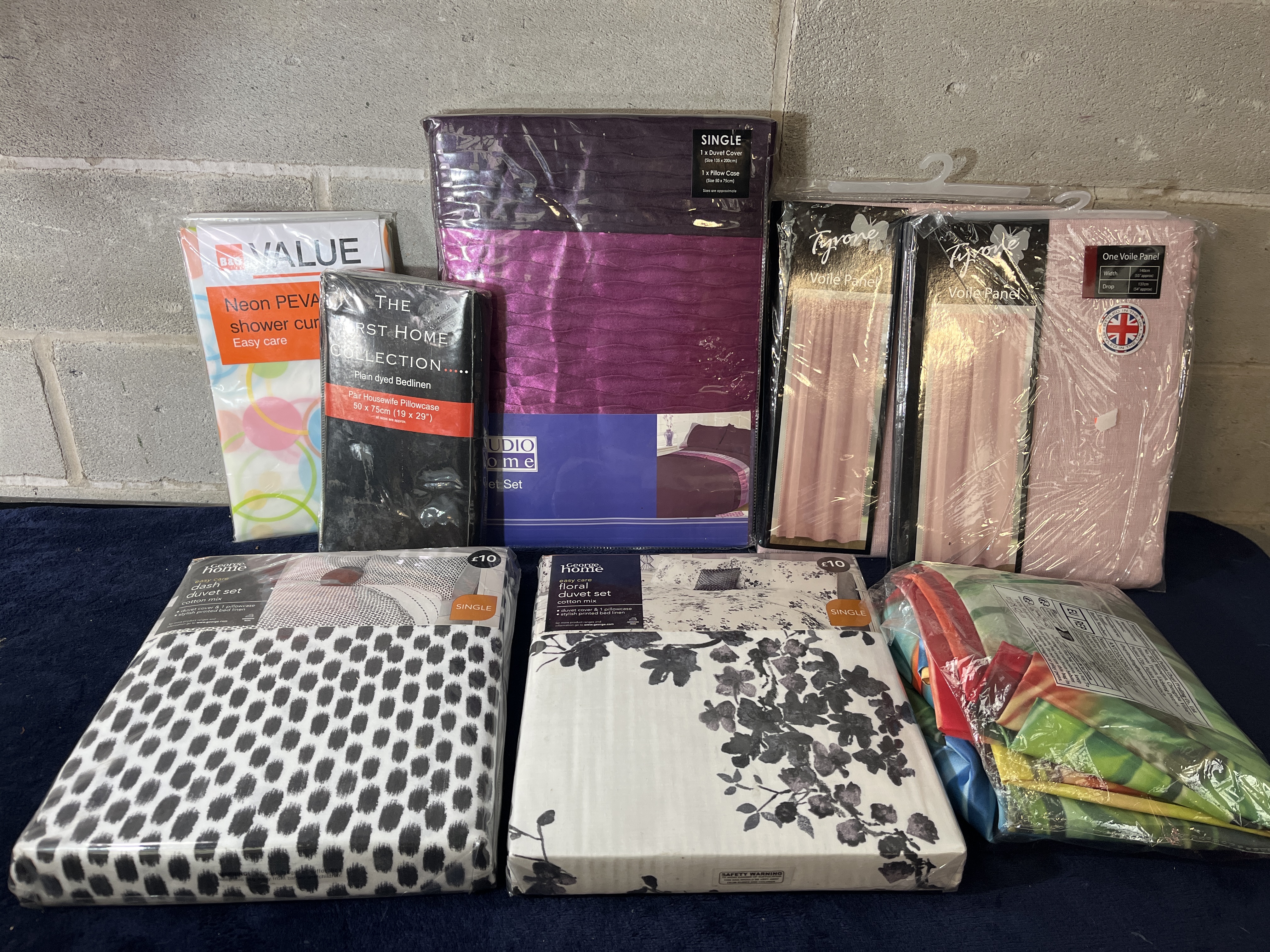 A collection of various home textile items, primarily new-in-packaging bedding and window treatments. The group includes George Home single duvet sets in dash and floral patterns, featuring cotton mix construction. Also present is a Studio Home purple satin-effect single duvet set and black housewife pillowcases from The First Home Collection. Window coverings include pink Tyrone voile panels and a B&Q Neon PEVA shower curtain. The lot also contains a multi-colored fabric item in clear plastic packaging with a shipping label from Fujian Putian Chuyi Trading Co., Ltd. Materials indicated on packaging include cotton blends, 100% polyester, and PEVA.