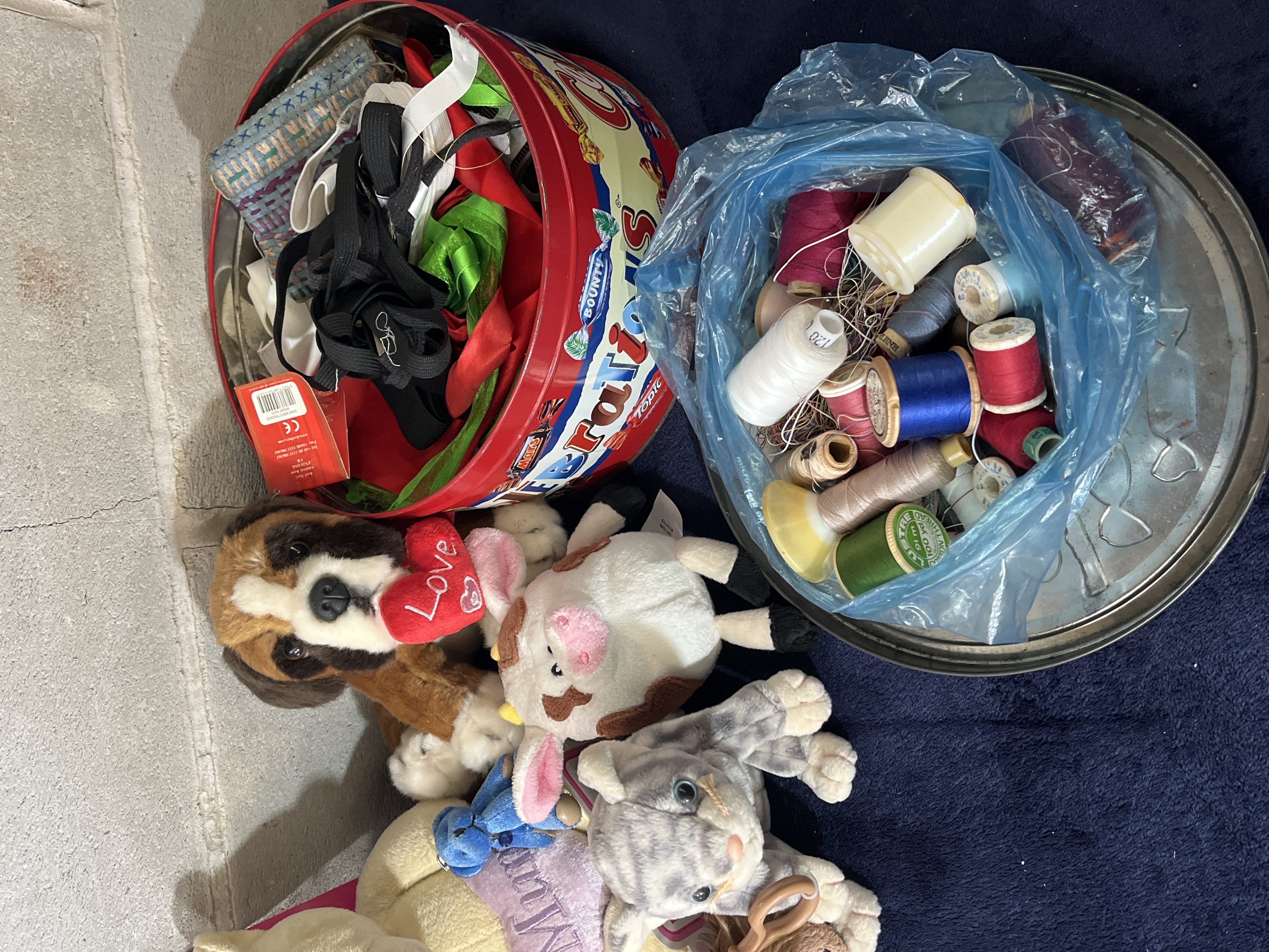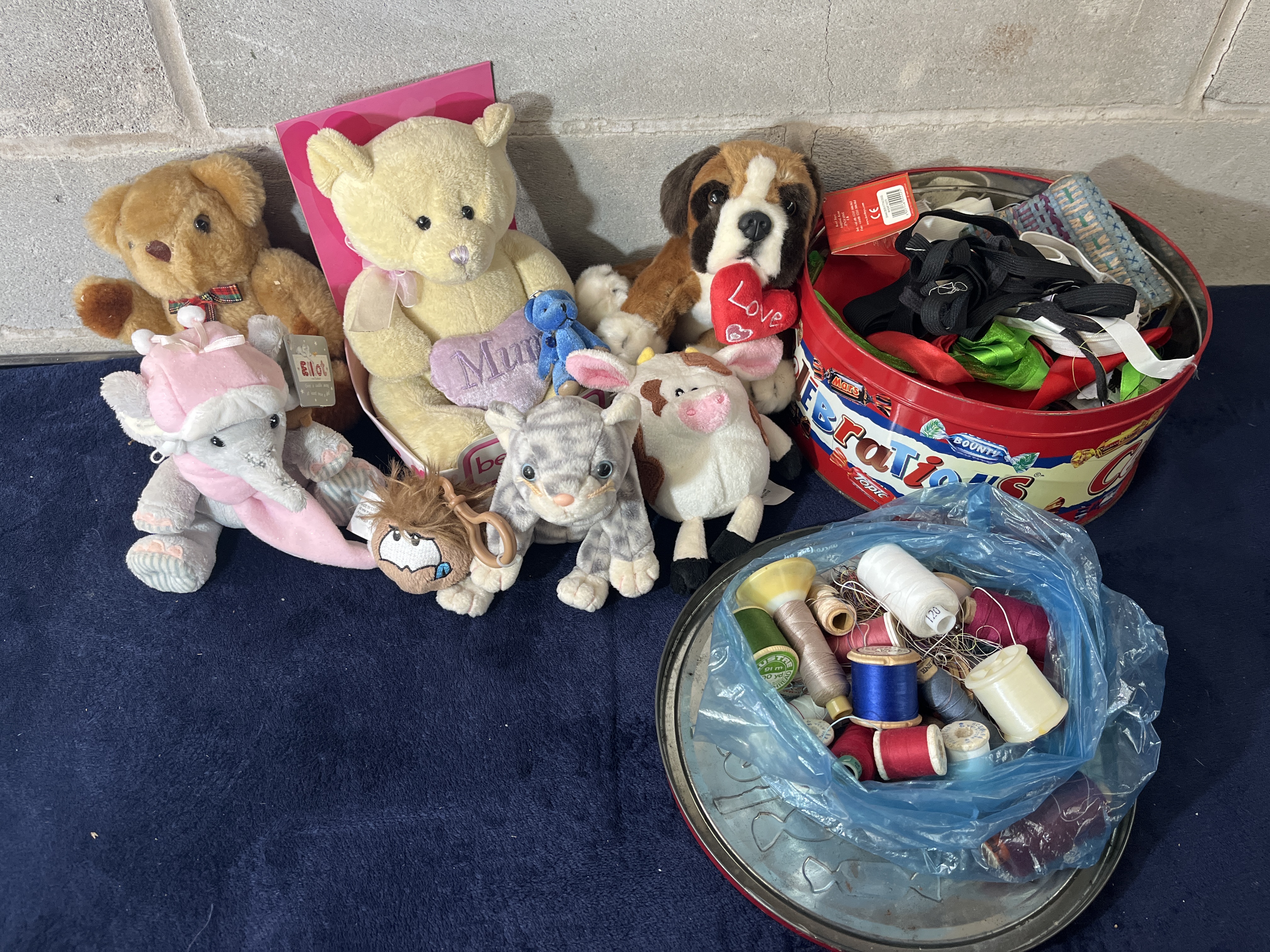 A miscellaneous collection of household items comprising various plush soft toys, a repurposed metal confectionery tin, and an assortment of sewing supplies. The plush toy grouping includes multiple animals such as a cream-colored bear holding a purple heart inscribed with Mum, a St. Bernard-style dog holding a Love heart, a gray tabby cat, a spotted cow, and a gray elephant in pink winter attire, along with several smaller soft figures. A circular red metal tin featuring Mars Celebrations confectionery branding is filled with various fabric ribbons, elastic bands, and notions. Accompanying these is a collection of thread spools in multiple colors and sizes, including both plastic and wooden bobbins, contained within a clear blue plastic bag.