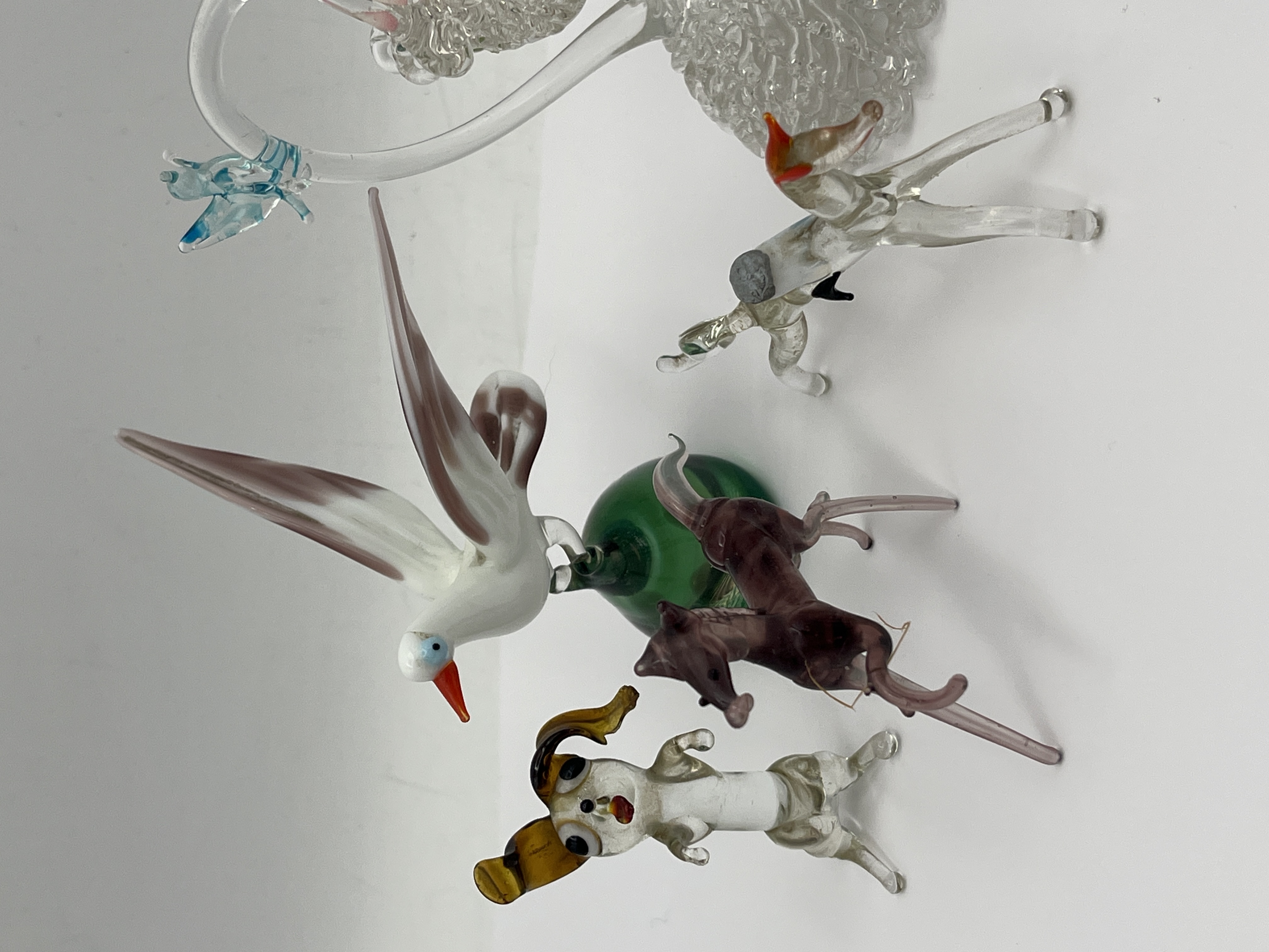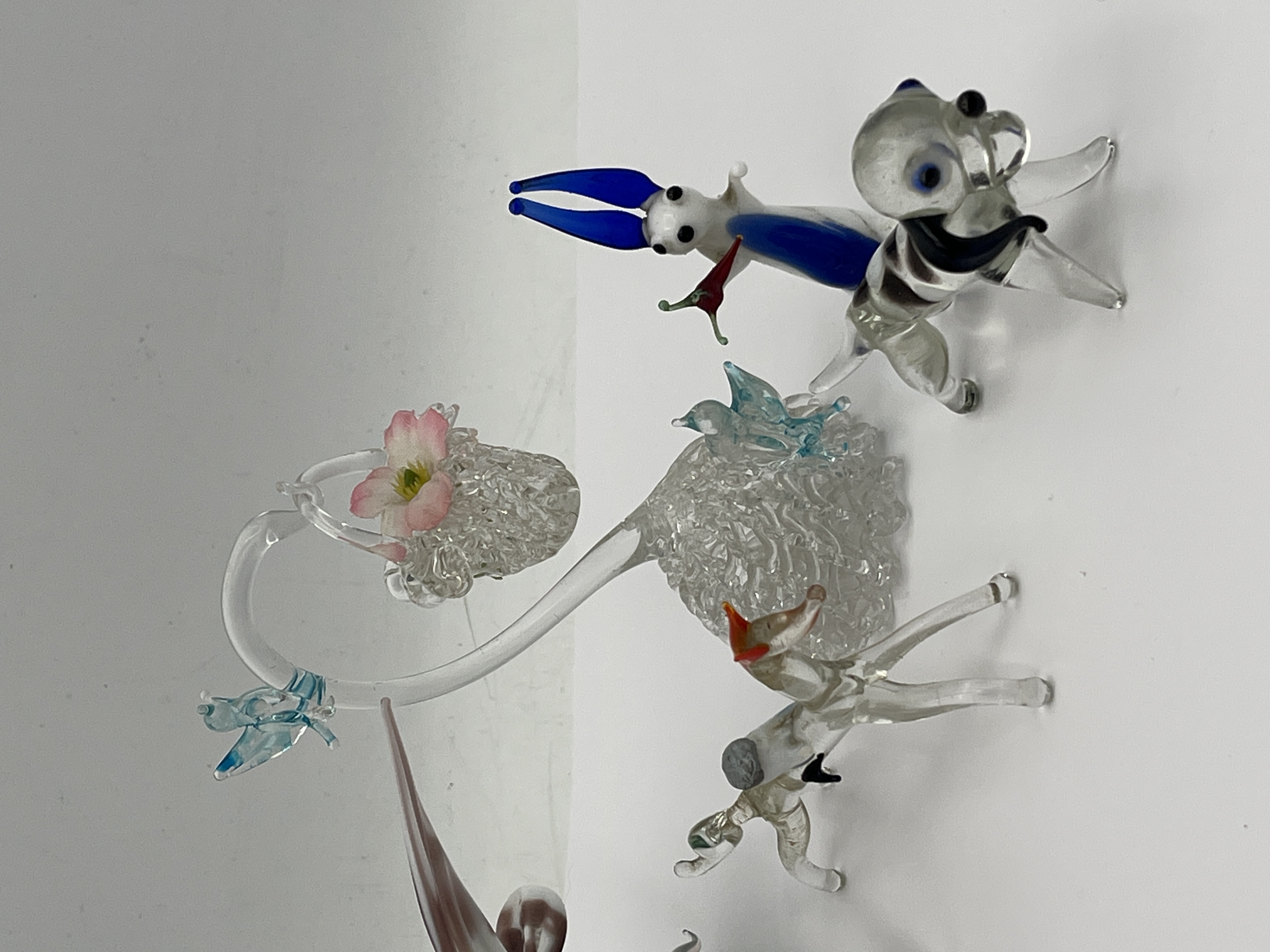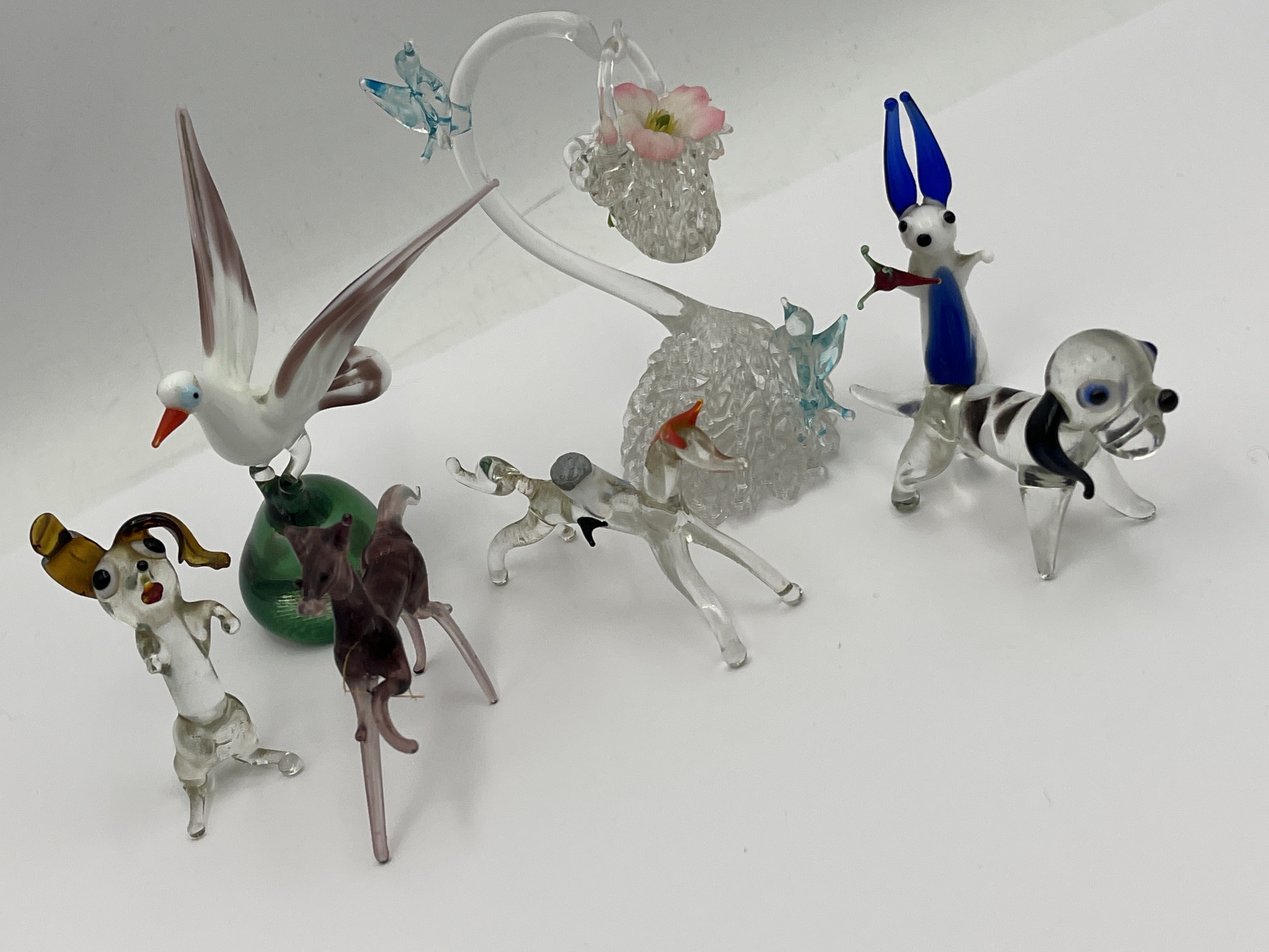 This collection consists of several hand-formed lampwork glass figurines featuring various animal and nature-inspired motifs. The group includes multiple canine figures in different colors and poses, such as a standing spotted dog and a seated figure with floppy ears. Also included is a larger bird with outstretched wings perched atop a green glass base, a stylized blue and white creature with elongated ears, and a decorative clear glass piece featuring a textured base, a pink floral detail, and small blue avian accents. The items are crafted from clear and multi-colored glass using traditional lampworking techniques. No visible maker marks or signatures were observed on any of the pieces.