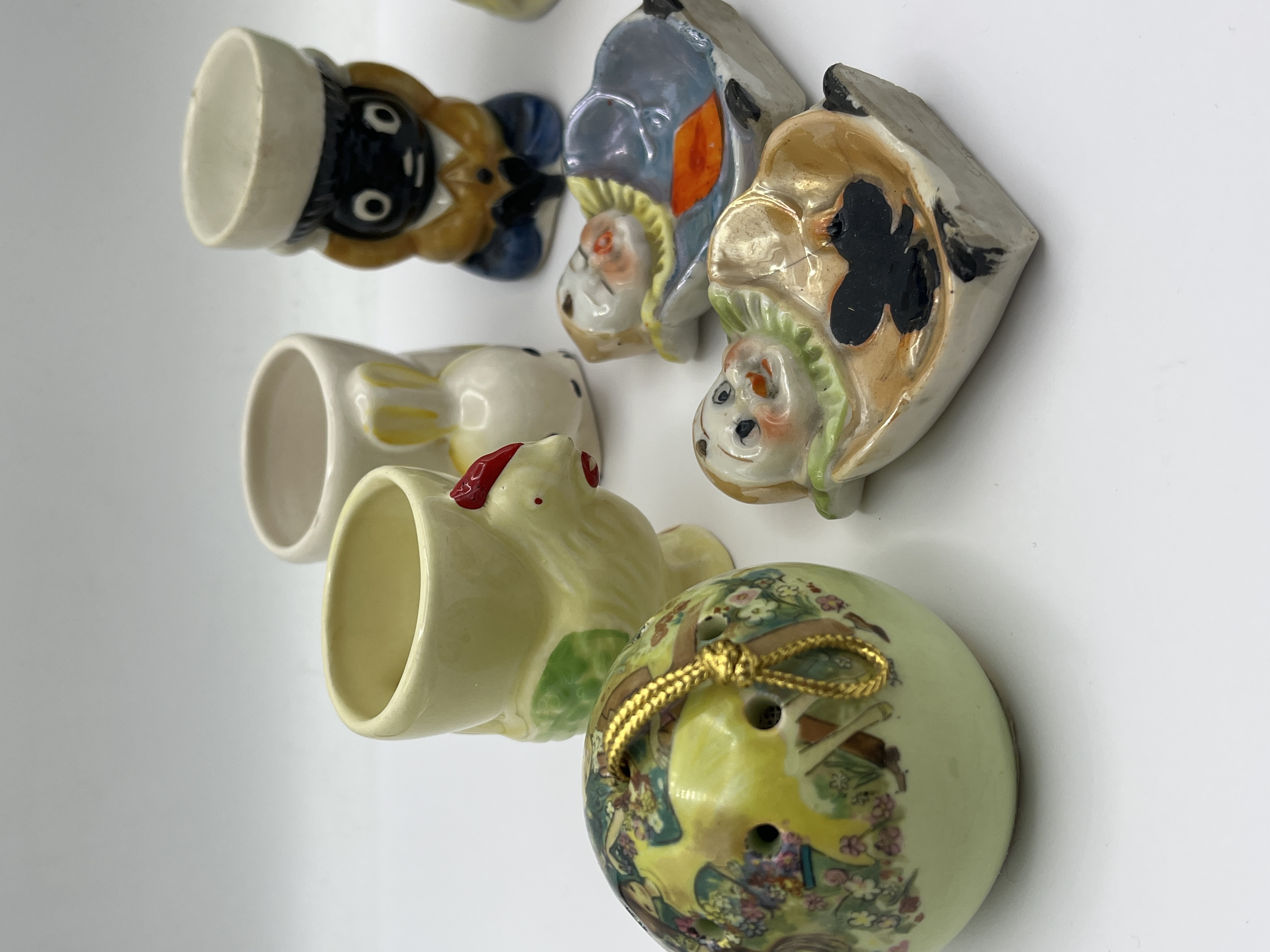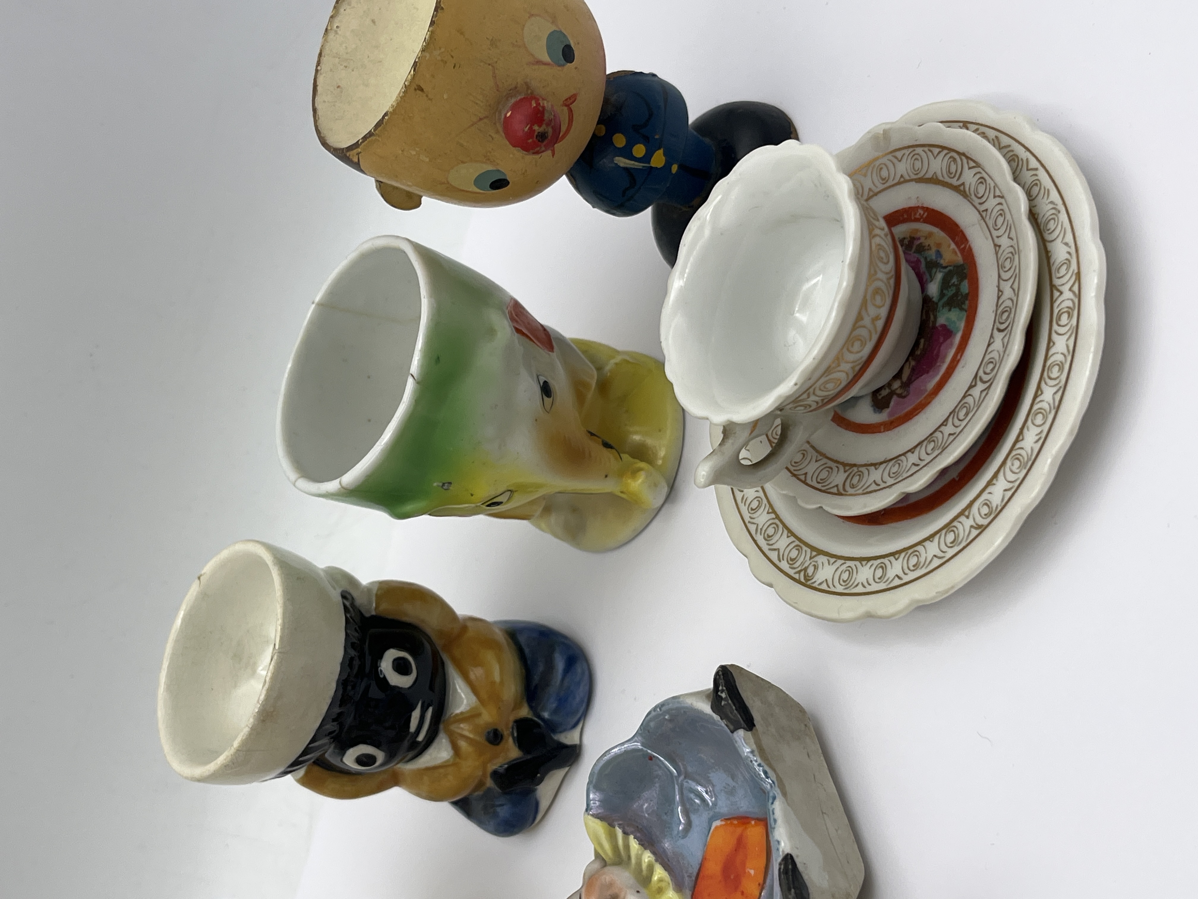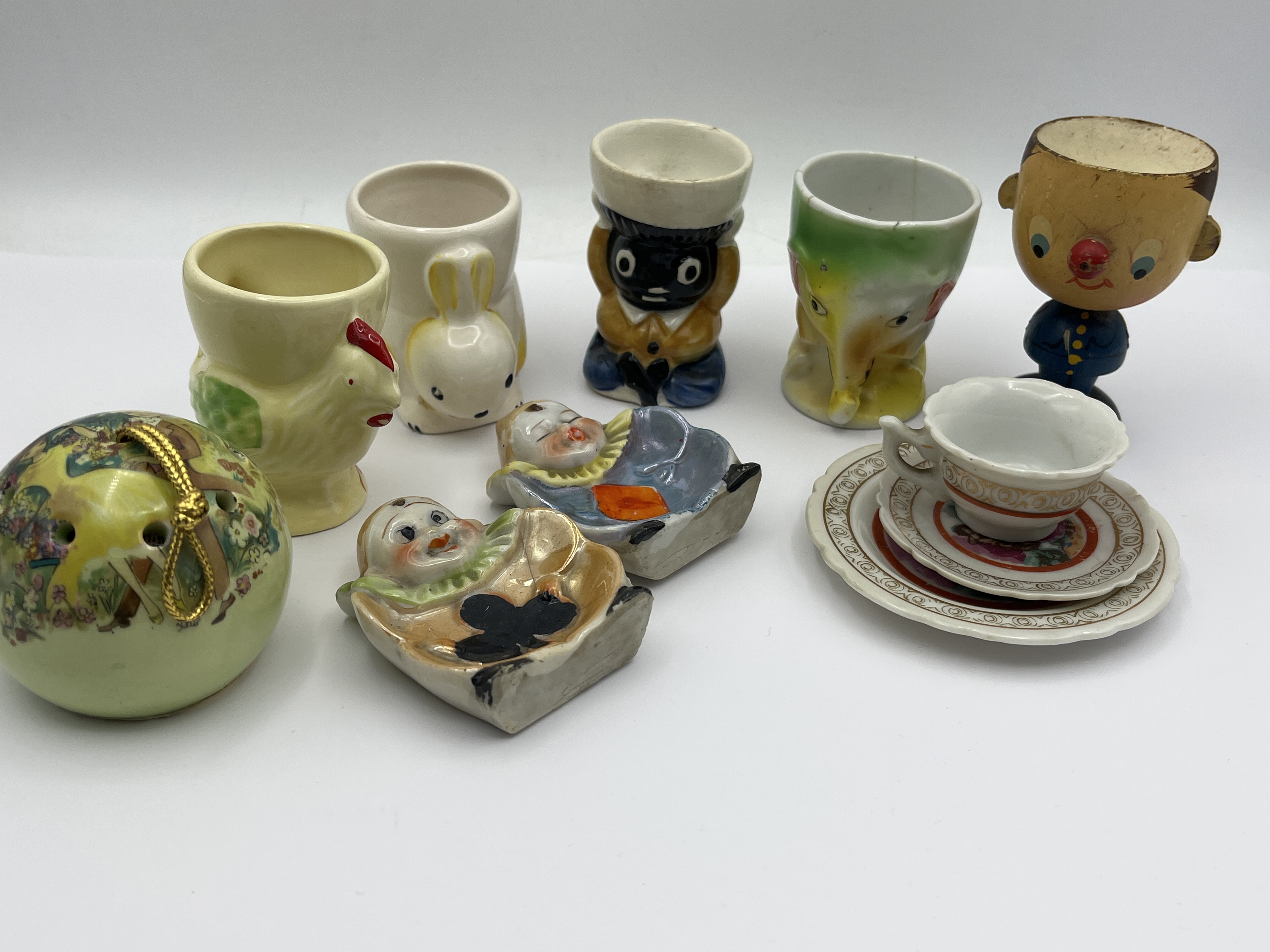 An assortment of vintage ceramic and porcelain items, including several figural egg cups attributed to mid-20th century Japanese manufacture. The group includes egg cups modeled as a rooster, a rabbit, an elephant, and a golly-style figure. Also present is a painted wooden or composition figure of a character. The collection further contains a miniature porcelain teacup with multiple matching saucers featuring gilt and red decorative bands, two small figural dishes depicting character faces, and a round green ceramic pomander with floral motifs and a gold cord. The items are primarily constructed of glazed ceramic and porcelain with hand-painted details.