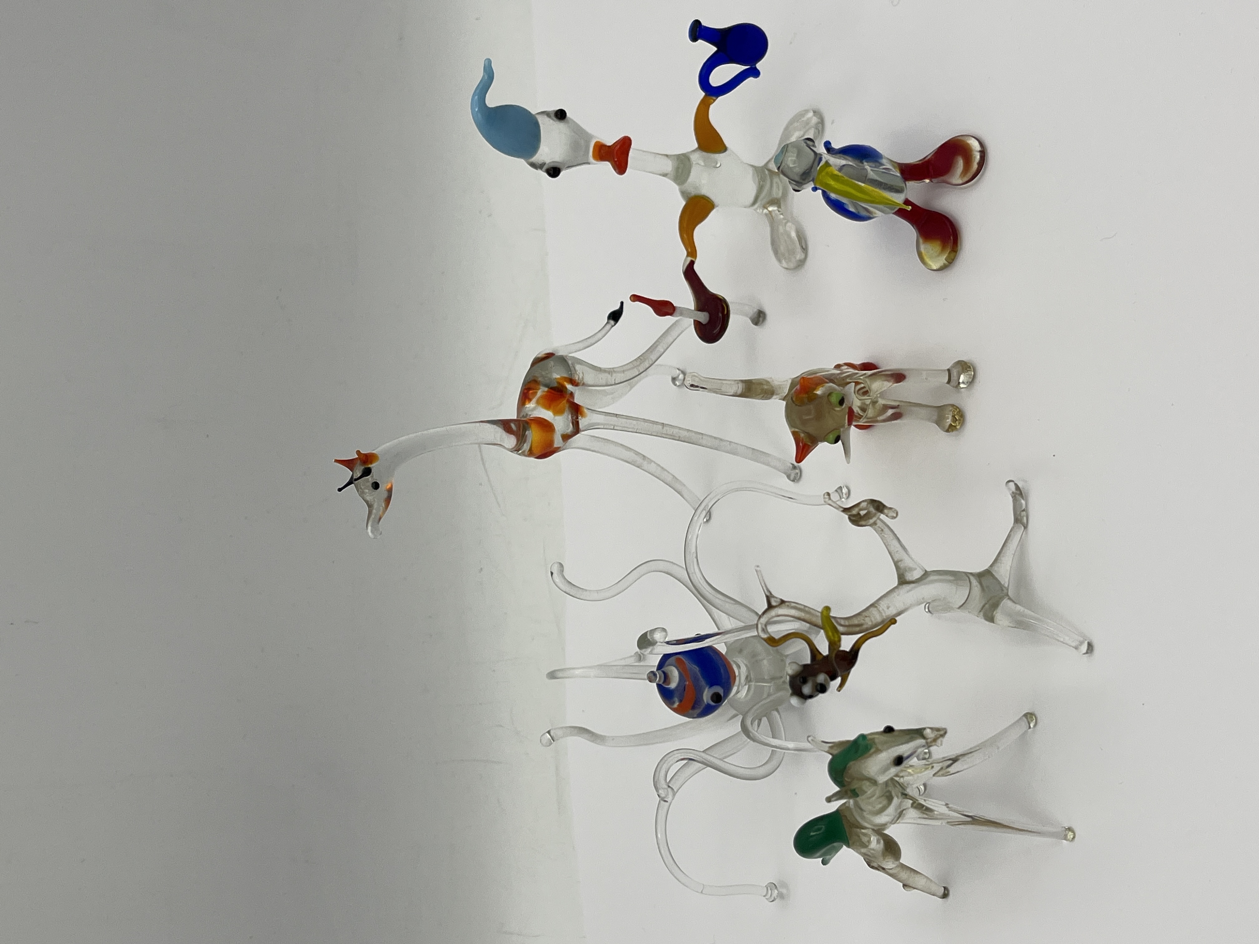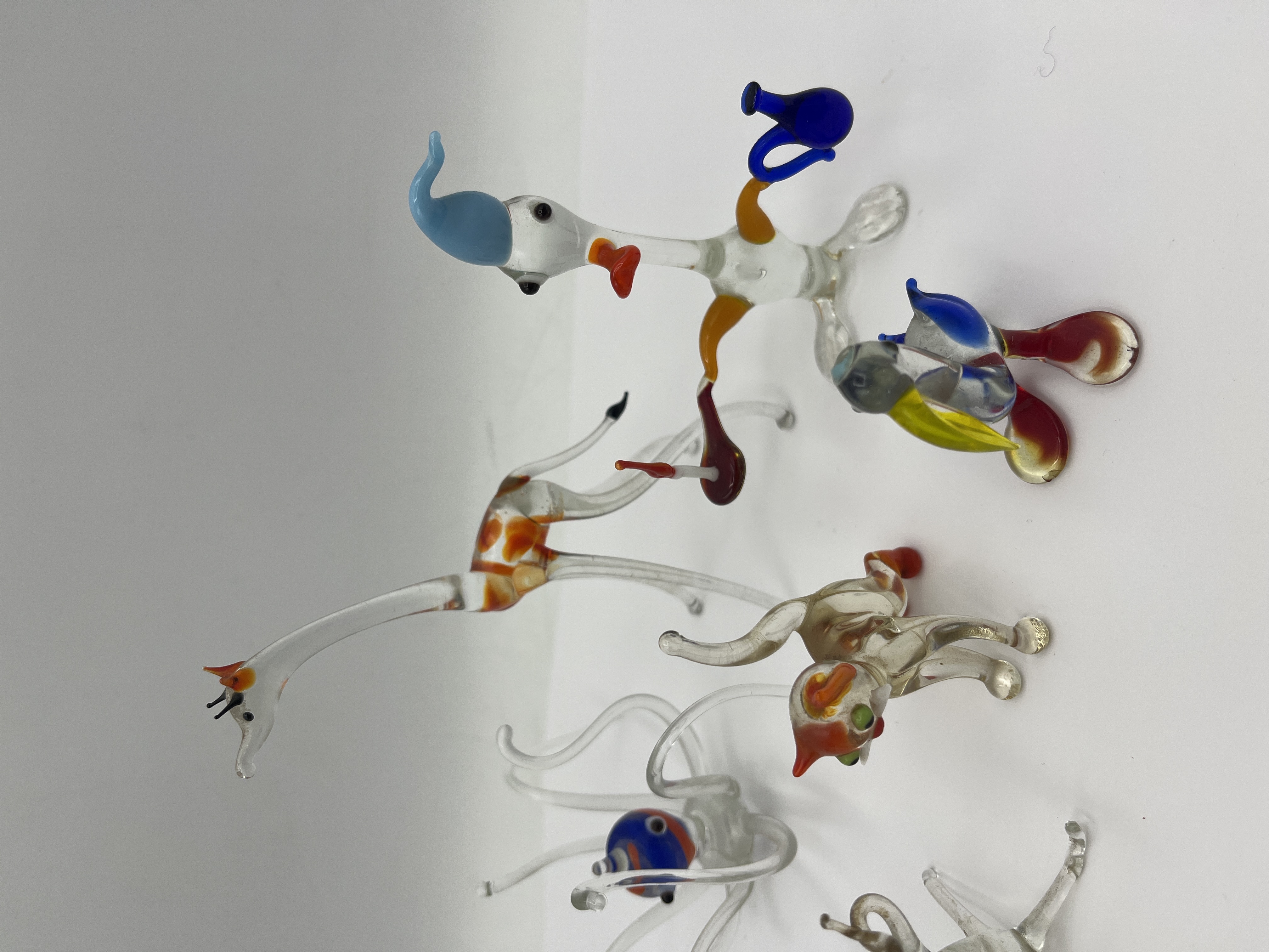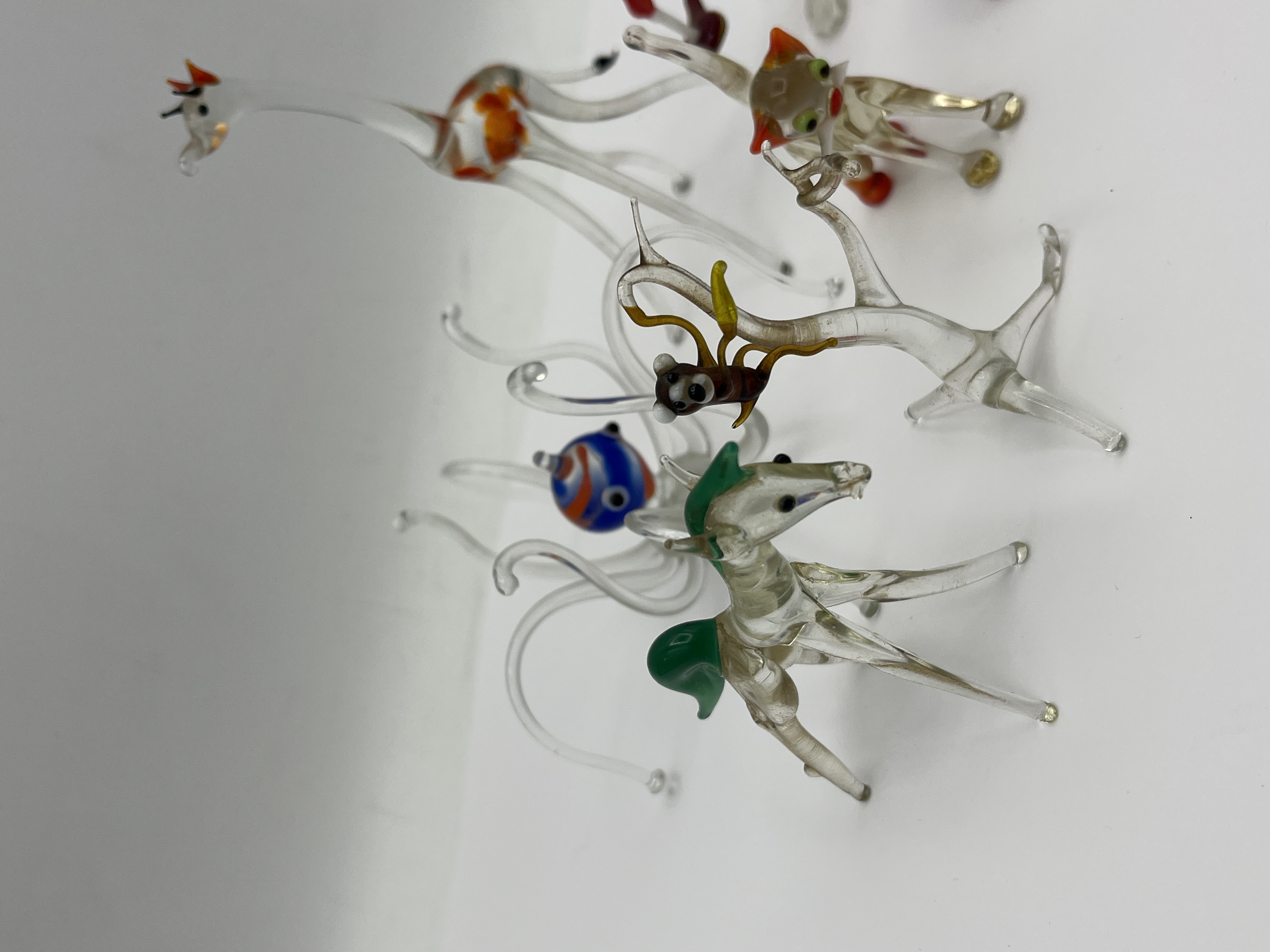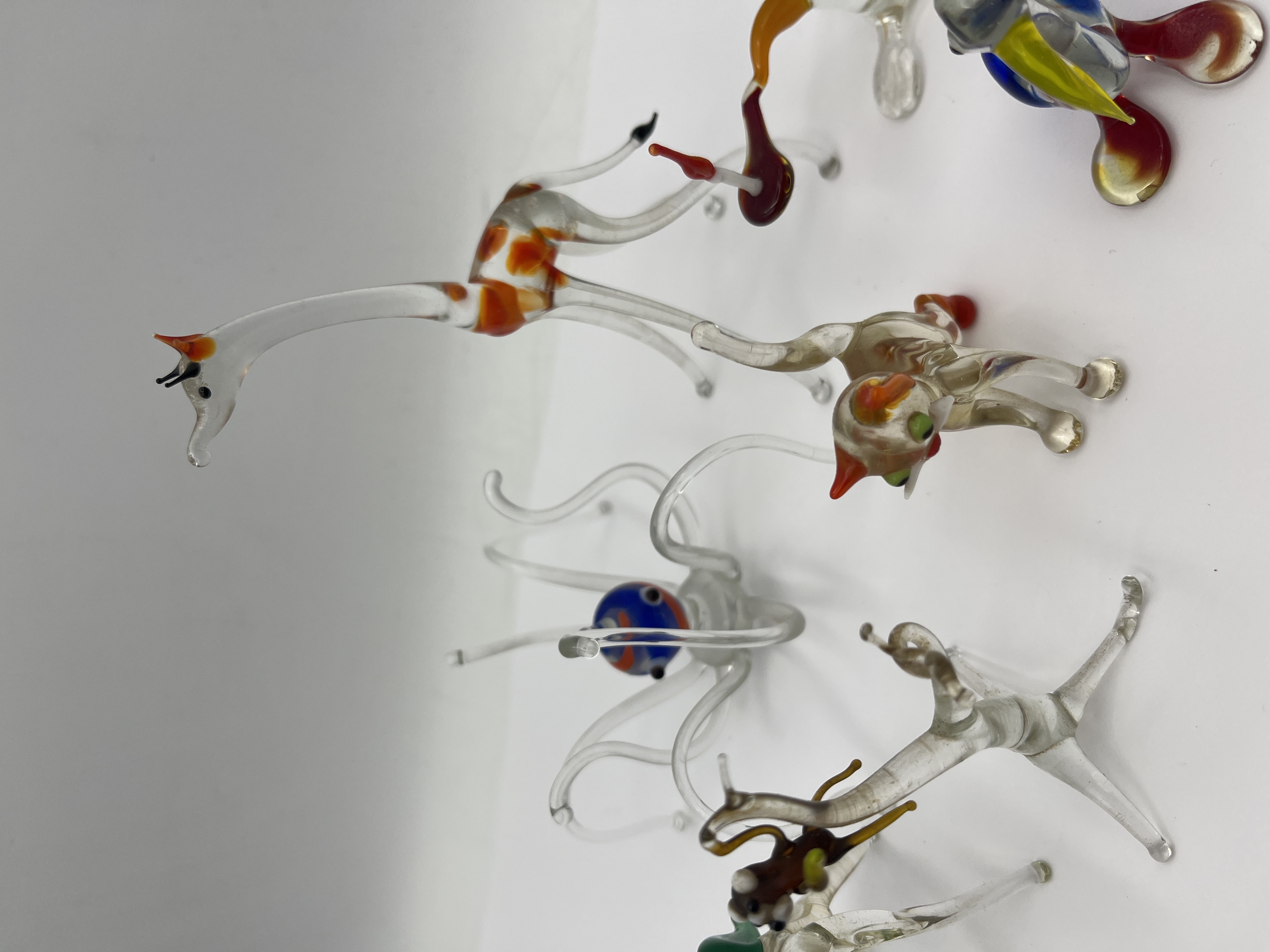 A collection of Murano miniature hand-blown glass animal figurines. Each piece is crafted from clear glass using lampwork techniques with vibrant polychrome details in colors including red, blue, green, and orange. The assortment features various stylized forms, including a giraffe with orange spotting, a bird with blue and yellow accents, an octopus with a striped blue and orange body, a horse with green features, and a primate figure suspended from a branch. These delicate objects exhibit the whimsical and modern style characteristic of Italian miniature glasswork.