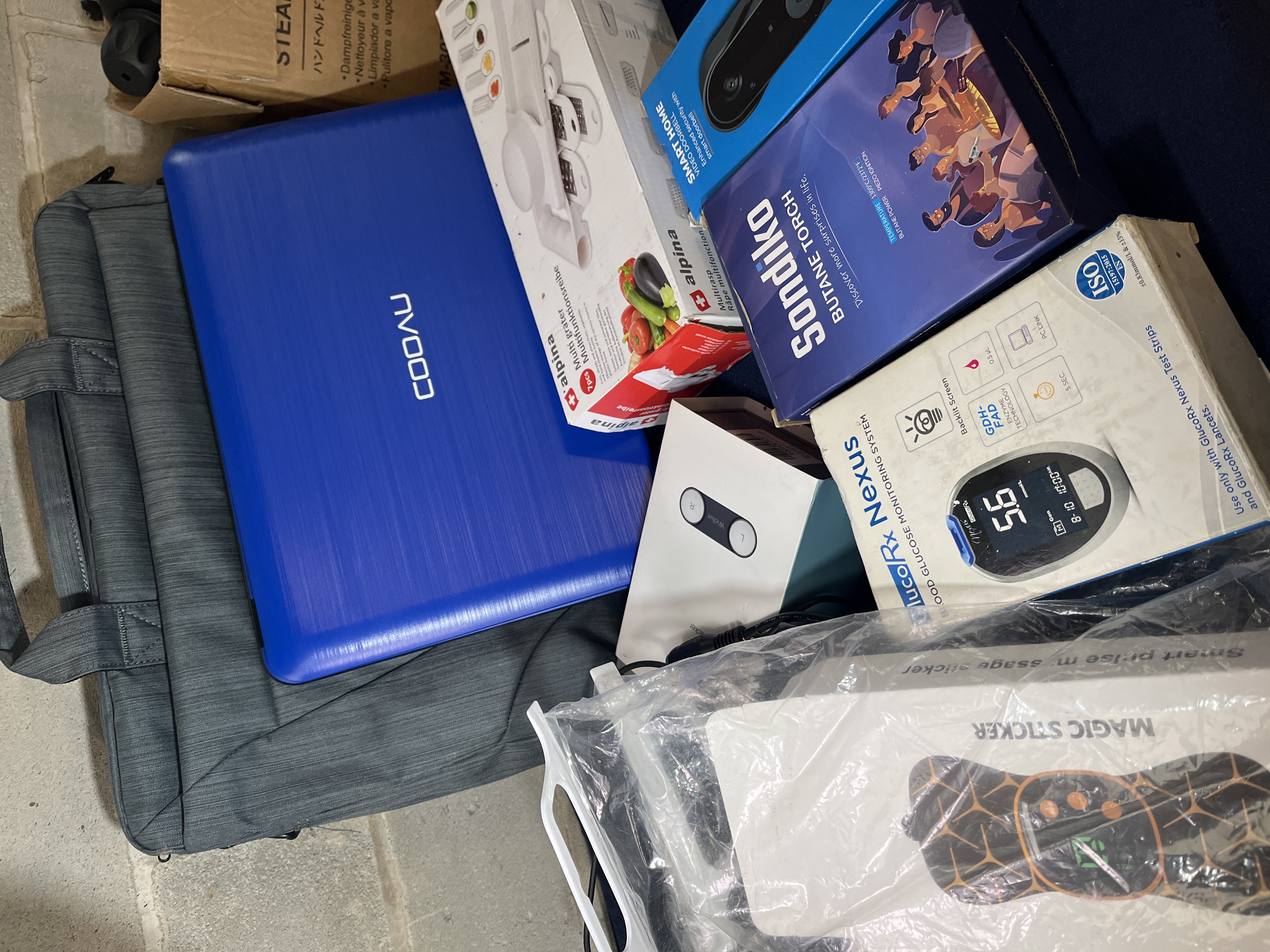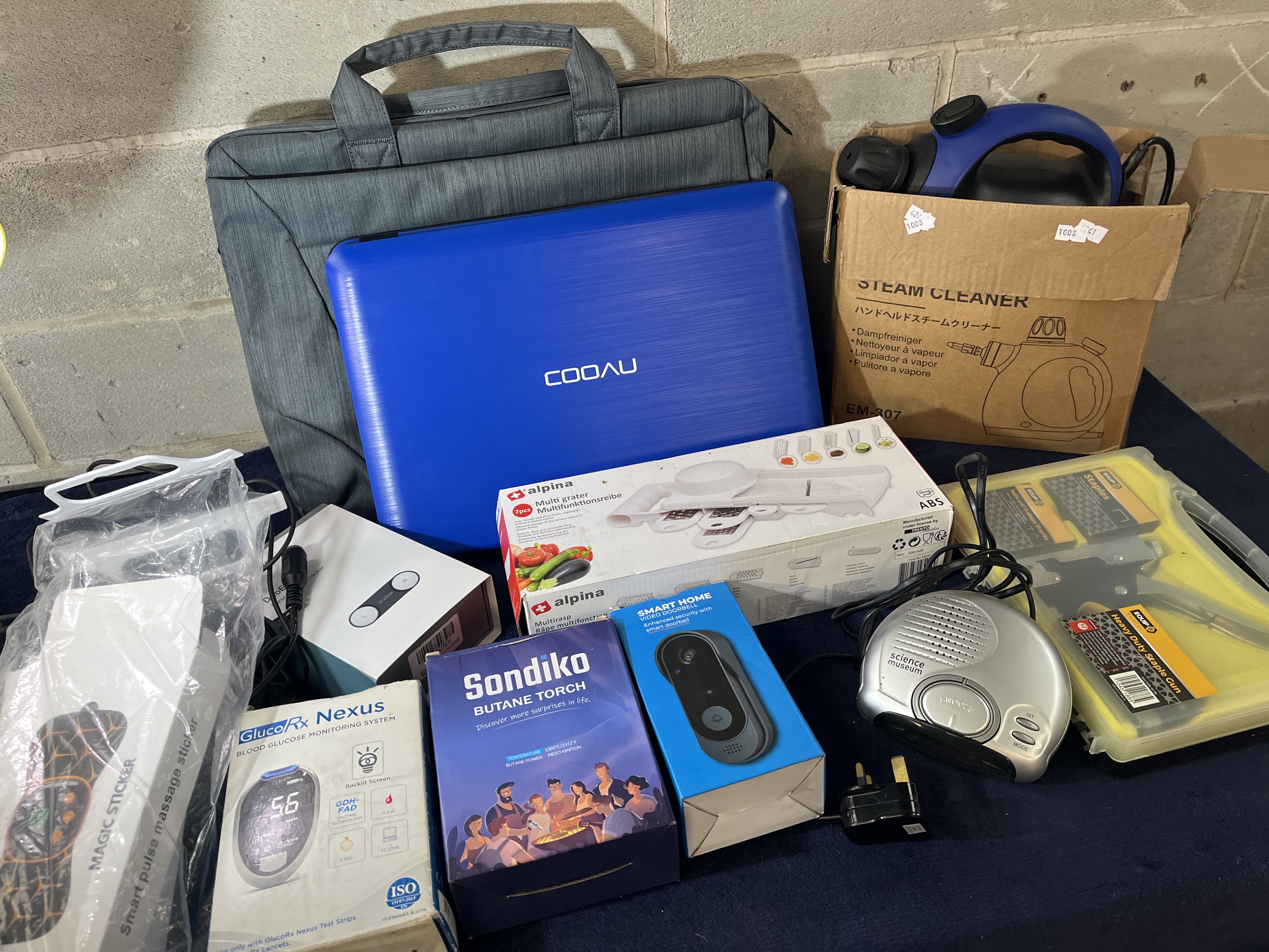 A group of various household electronics and tools, primarily in original retail packaging. The collection includes a blue COOAU portable electronic device with a gray textile carrying case, a handheld steam cleaner model EM-307, and a Sondiko butane torch. Also present are an Alpina multi-grater, a smart home video doorbell, and a GlucoRx Nexus blood glucose monitoring system. Additional items comprise a heavy-duty staple gun set in a yellow plastic case, a Science Museum-branded silver electronic alarm, and a smart pulse massage sticker. The items are constructed from various materials including plastic, metal, and cardboard.