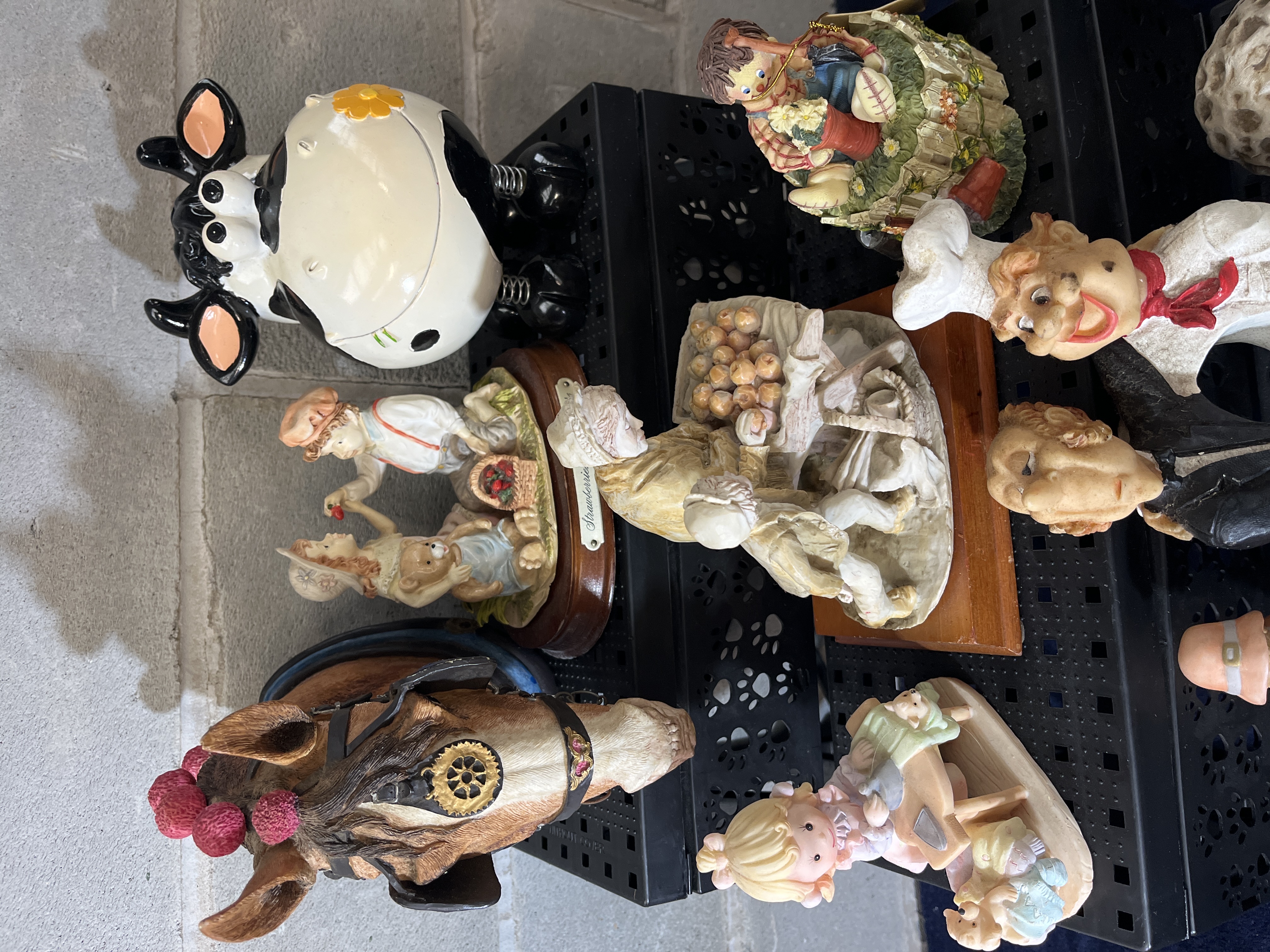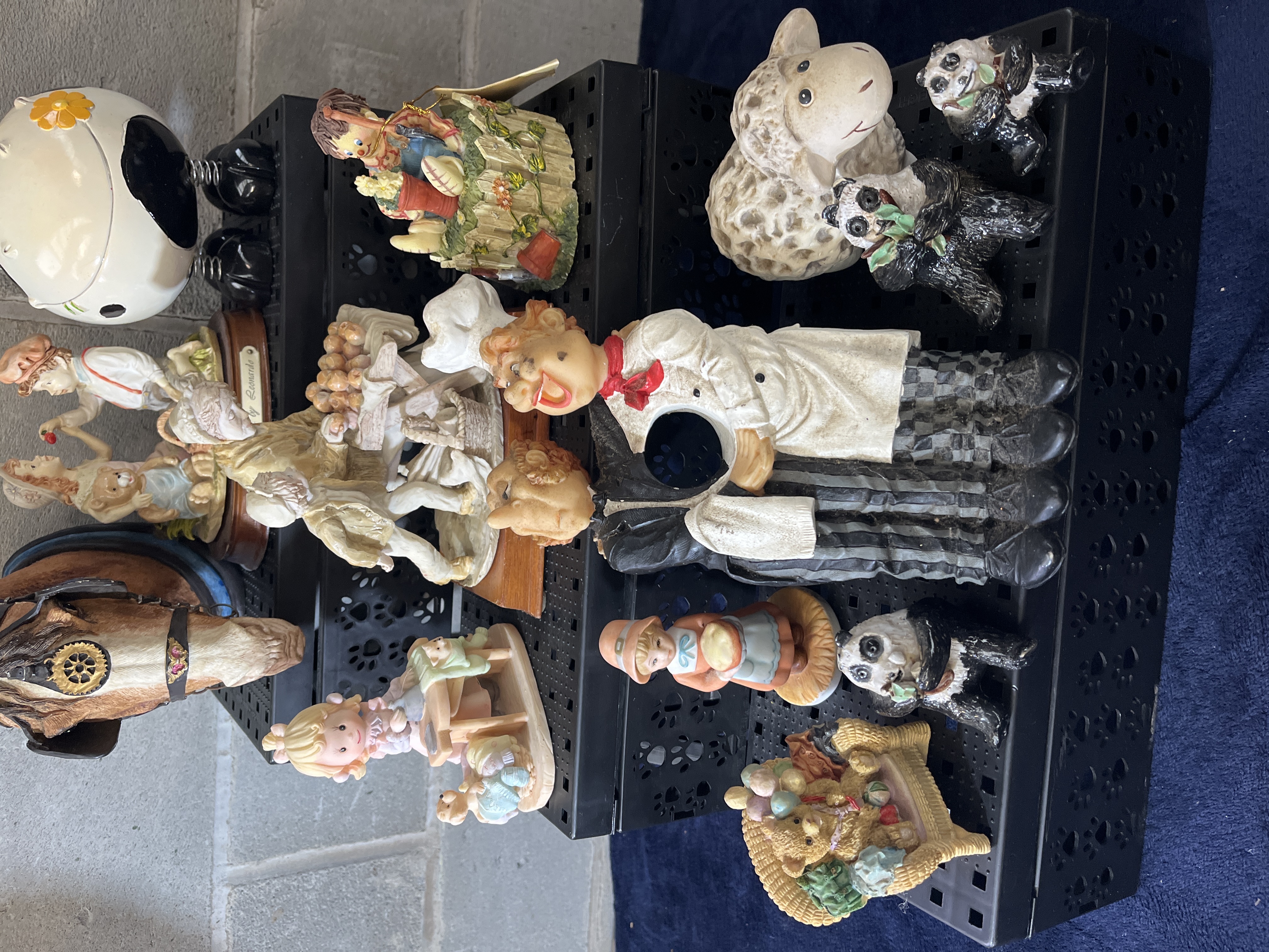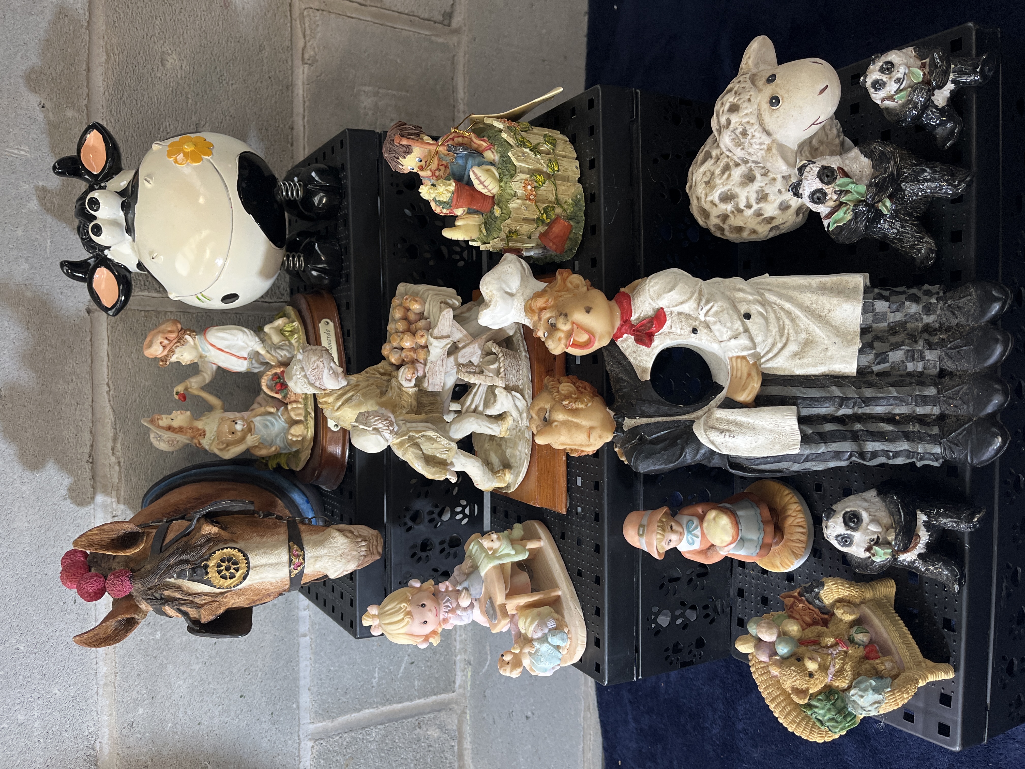 An assortment of decorative figurines and tabletop objects of various styles and subjects, likely dating from the late 20th century. The collection includes a stylized black and white cow with spring-mounted legs, a molded horse head wall plaque featuring harness and rosette details, and several human-form figurines depicting bakers, a gardener, and children. Animal figures are also present, including pandas, a sheep, and a teddy bear-themed basket. The items are primarily constructed from cast resin and ceramic, with some pieces mounted on wooden bases. One figurine features a plaque marked by Leonardo titled Strawberries. A large chef figurine includes a central circular aperture.