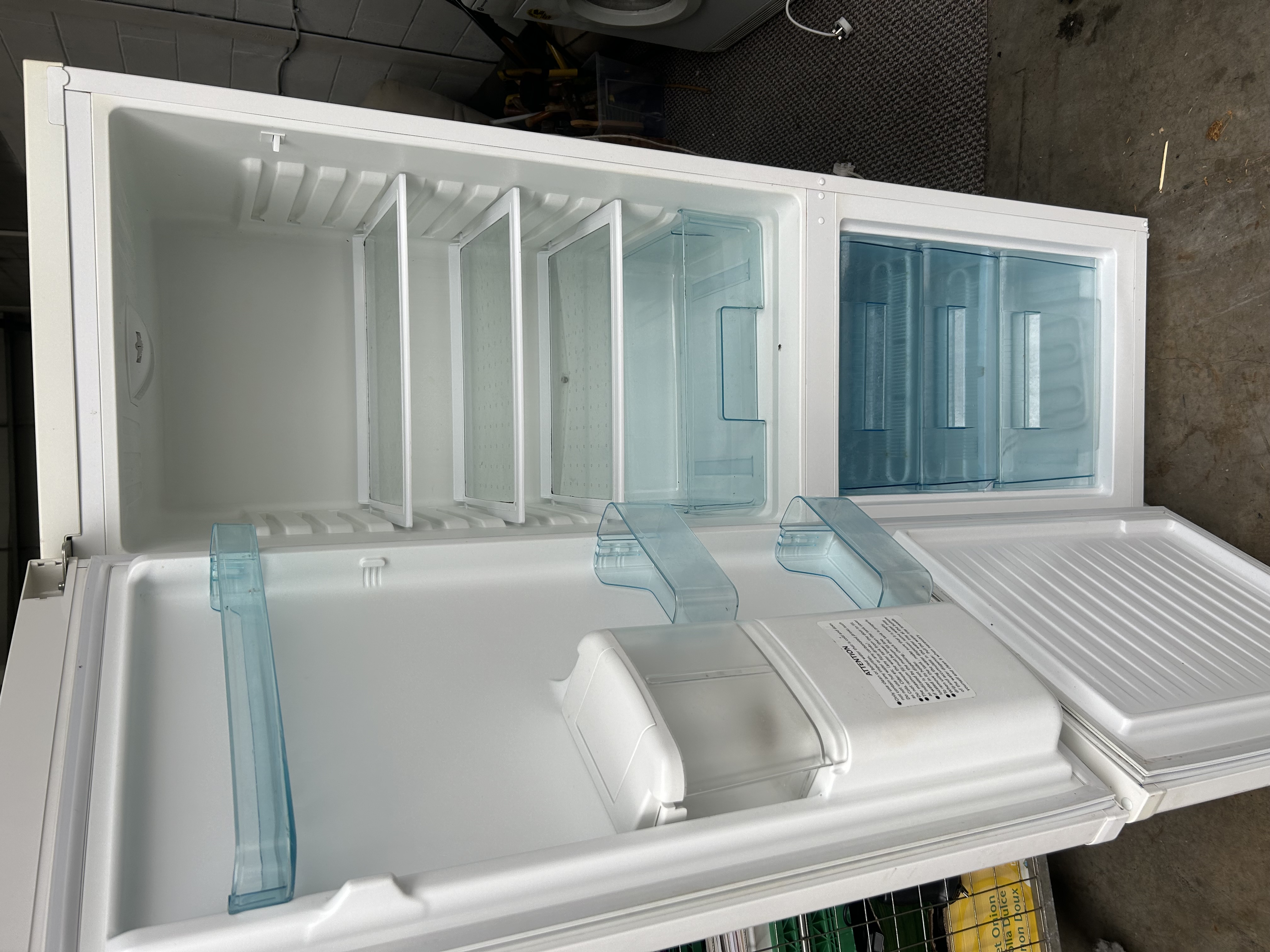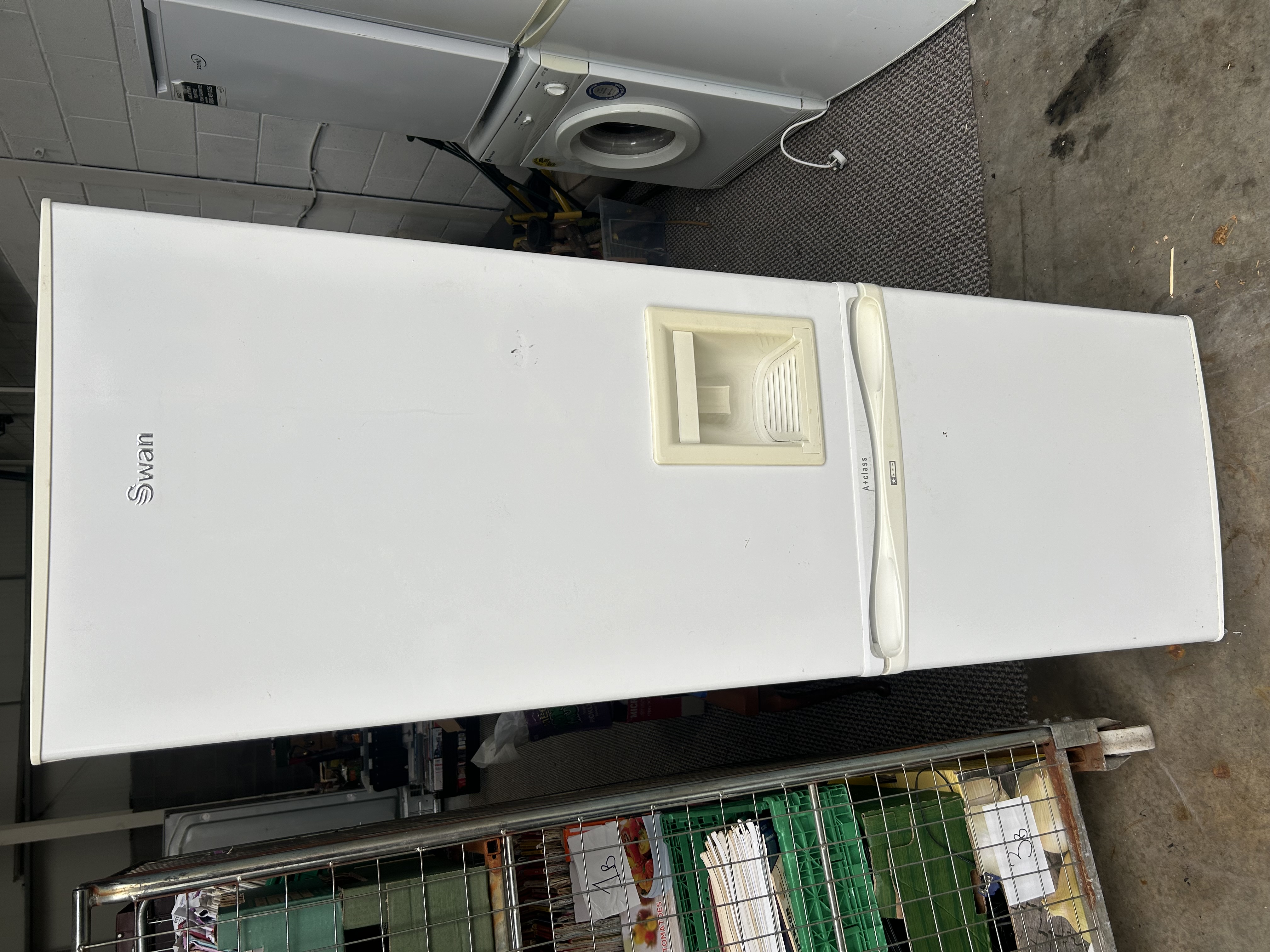 A Swan brand upright refrigerator-freezer unit featuring a white exterior finish. The appliance is configured with a refrigerator compartment on the upper section and a freezer on the lower section. The upper door includes an integrated water dispenser and displays the Swan logo alongside an A+ class energy rating marking. The interior of the refrigerator is equipped with glass shelving, clear plastic door bins, and a dedicated water reservoir. The freezer section contains three blue-tinted translucent plastic drawers.