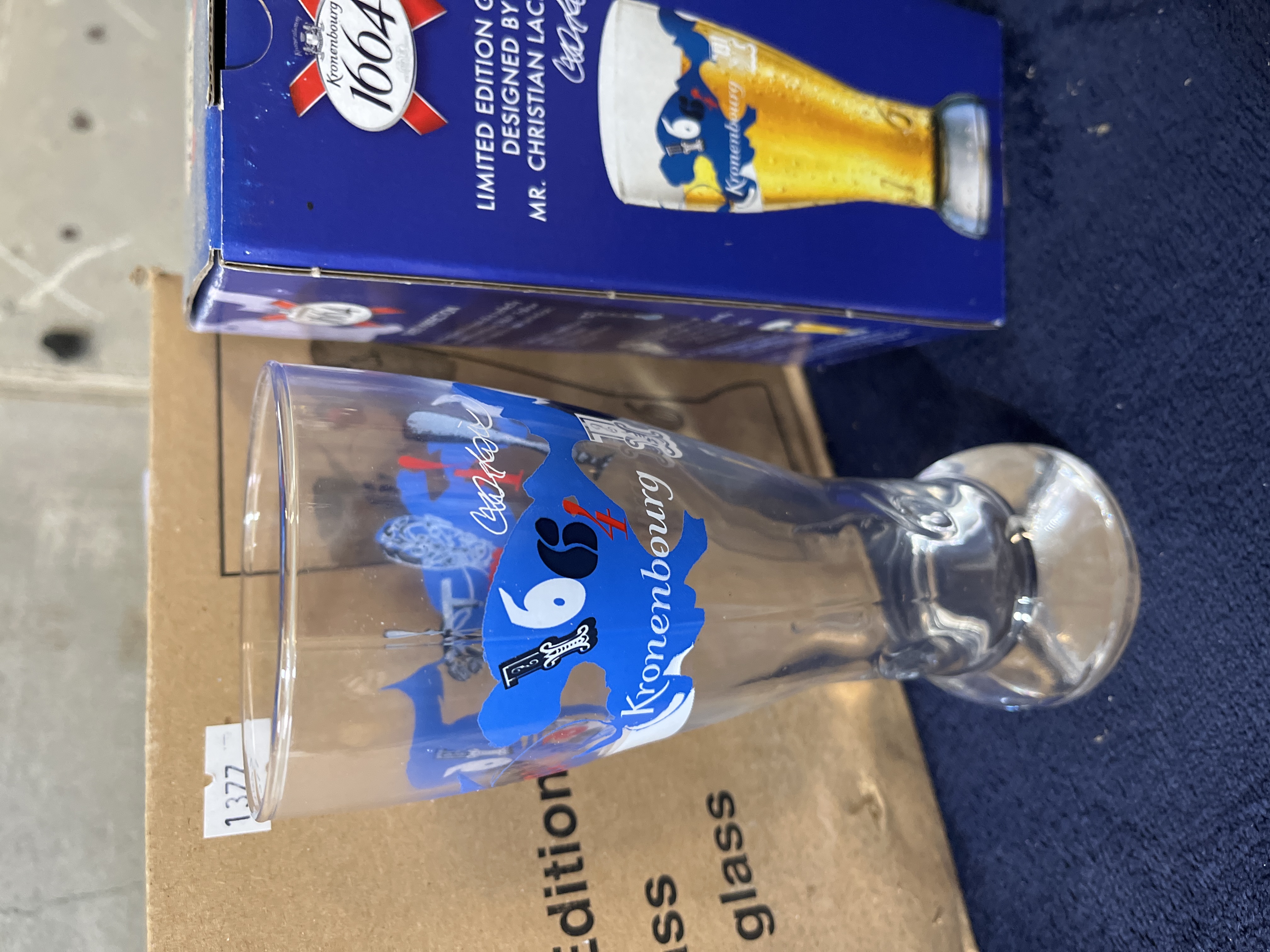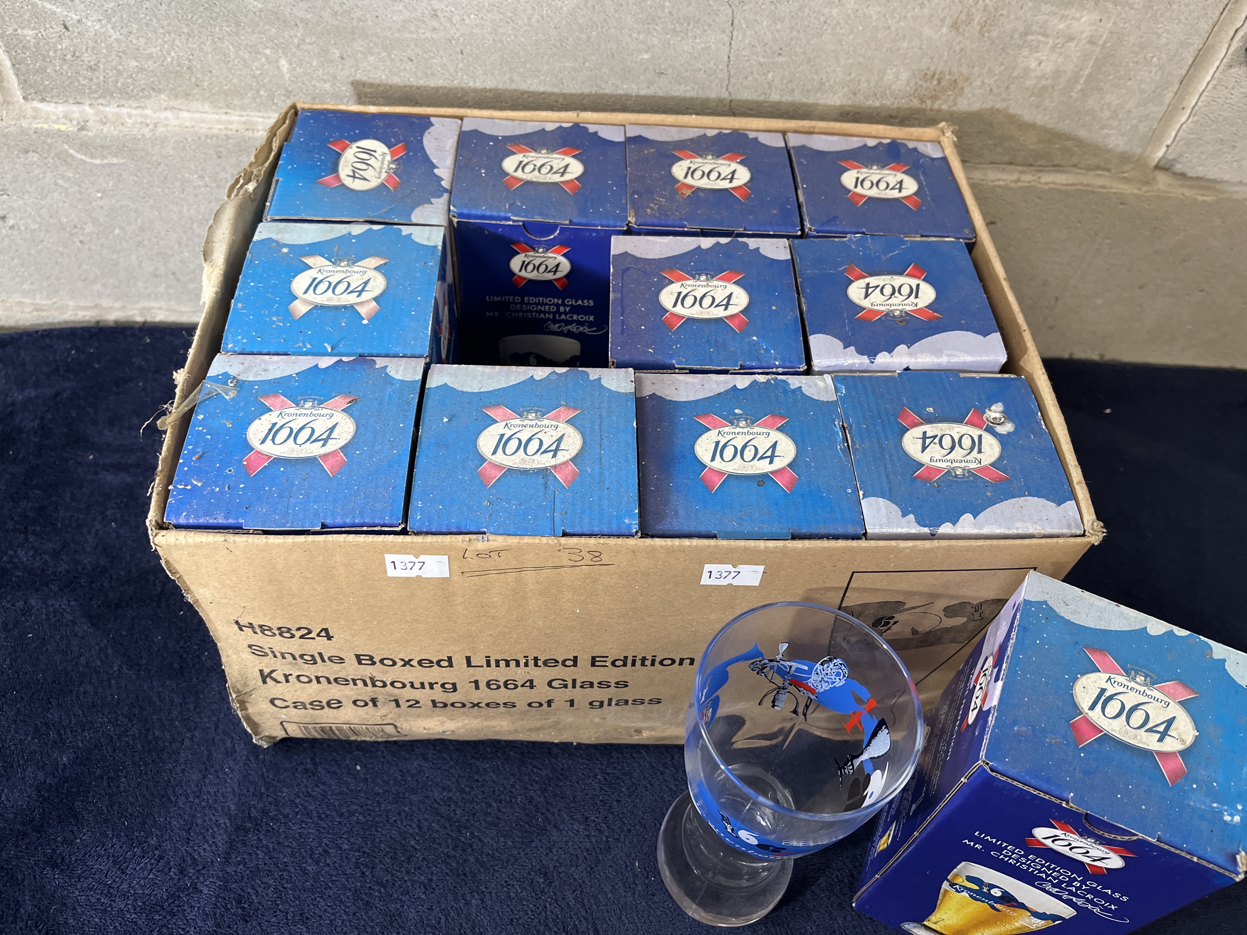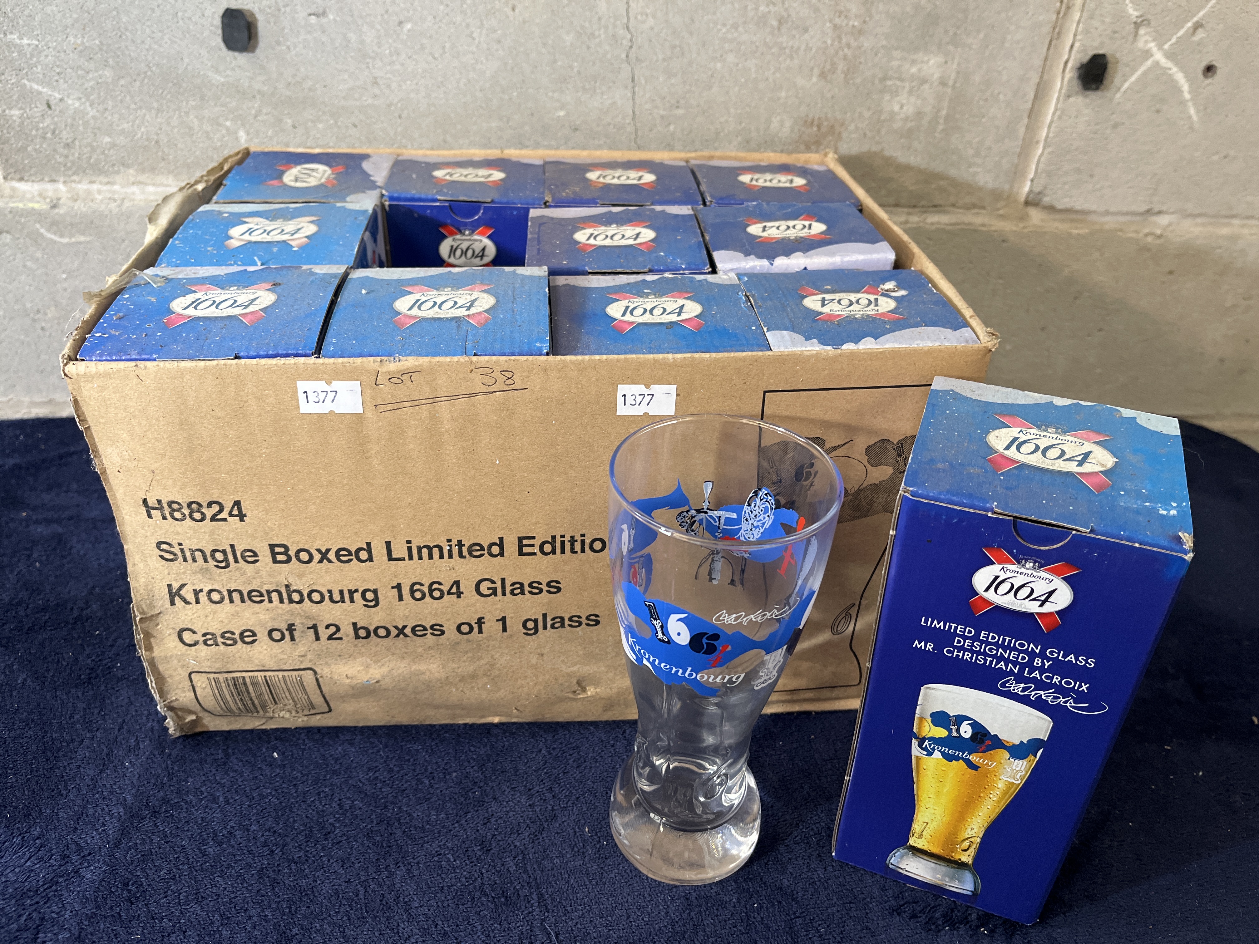 A collection of Kronenbourg 1664 limited edition lager glasses designed by Christian Lacroix. Each clear glass is of tulip-style form and features a colorful abstract graphic wrap incorporating the Kronenbourg 1664 logo and the designer signature. The glasses are contained within individual blue and white retail boxes. The collection is housed in a larger cardboard shipping carton marked H8824 Single Boxed Limited Edition Kronenbourg 1664 Glass, Case of 12 boxes of 1 glass.