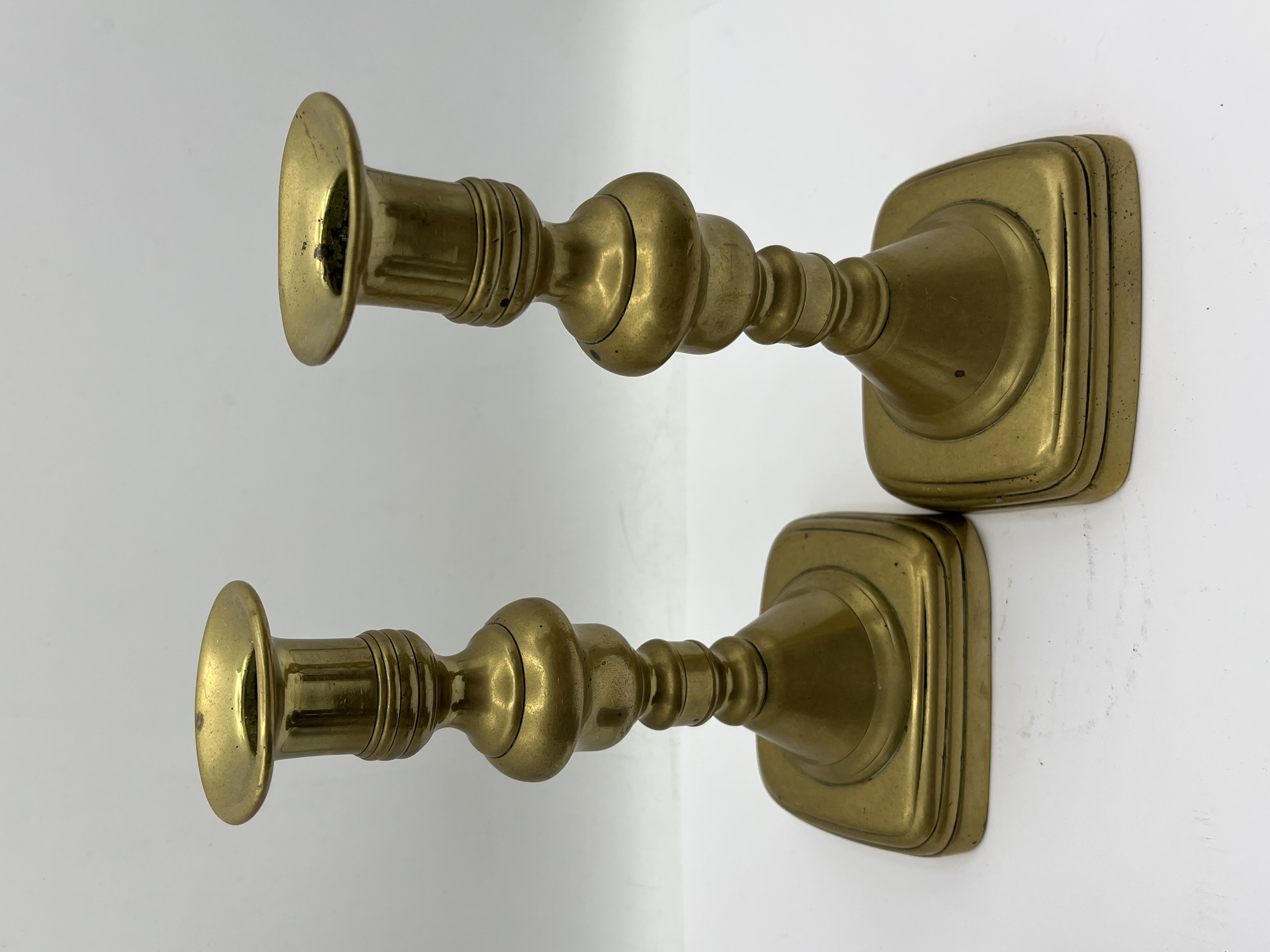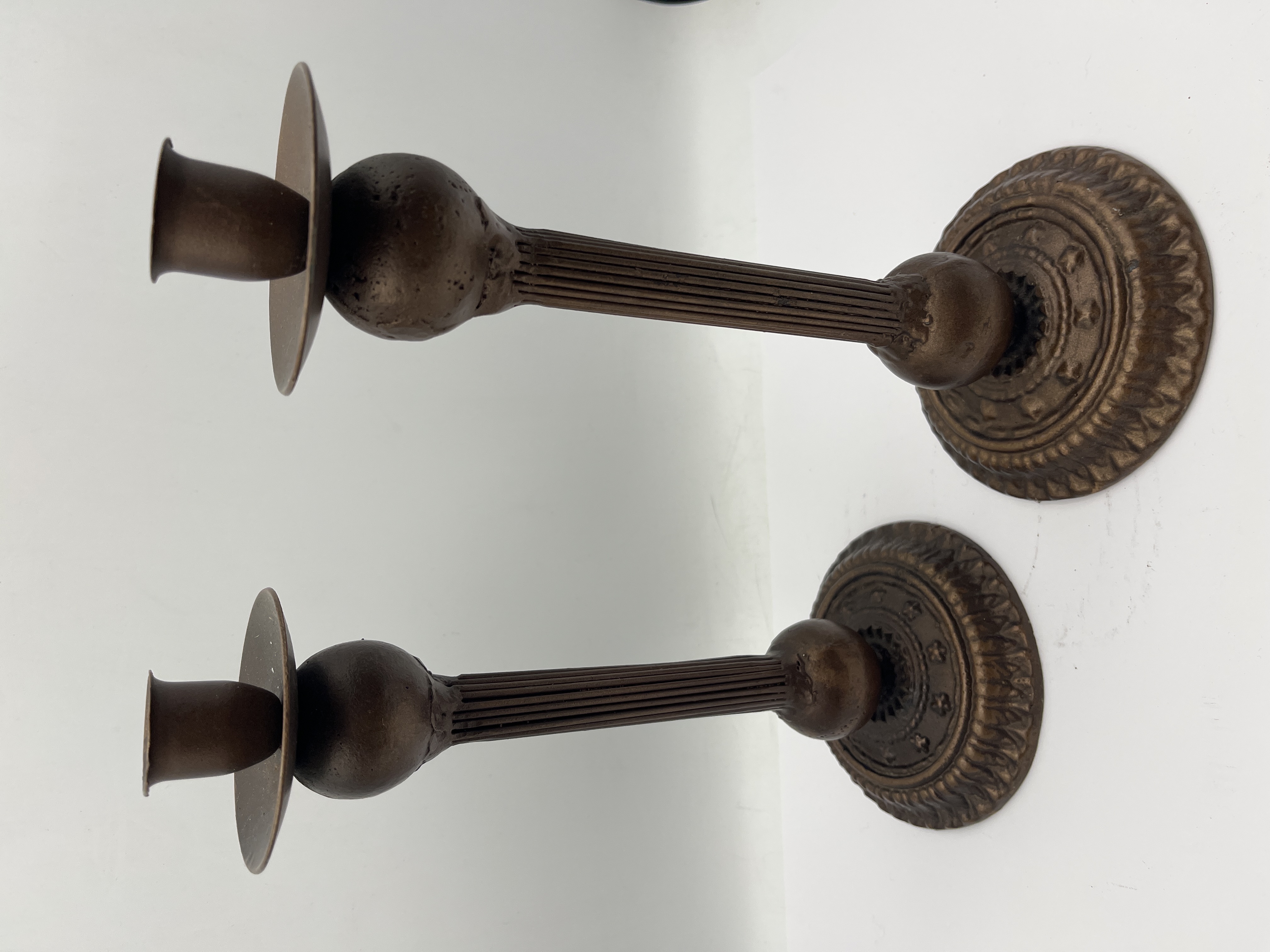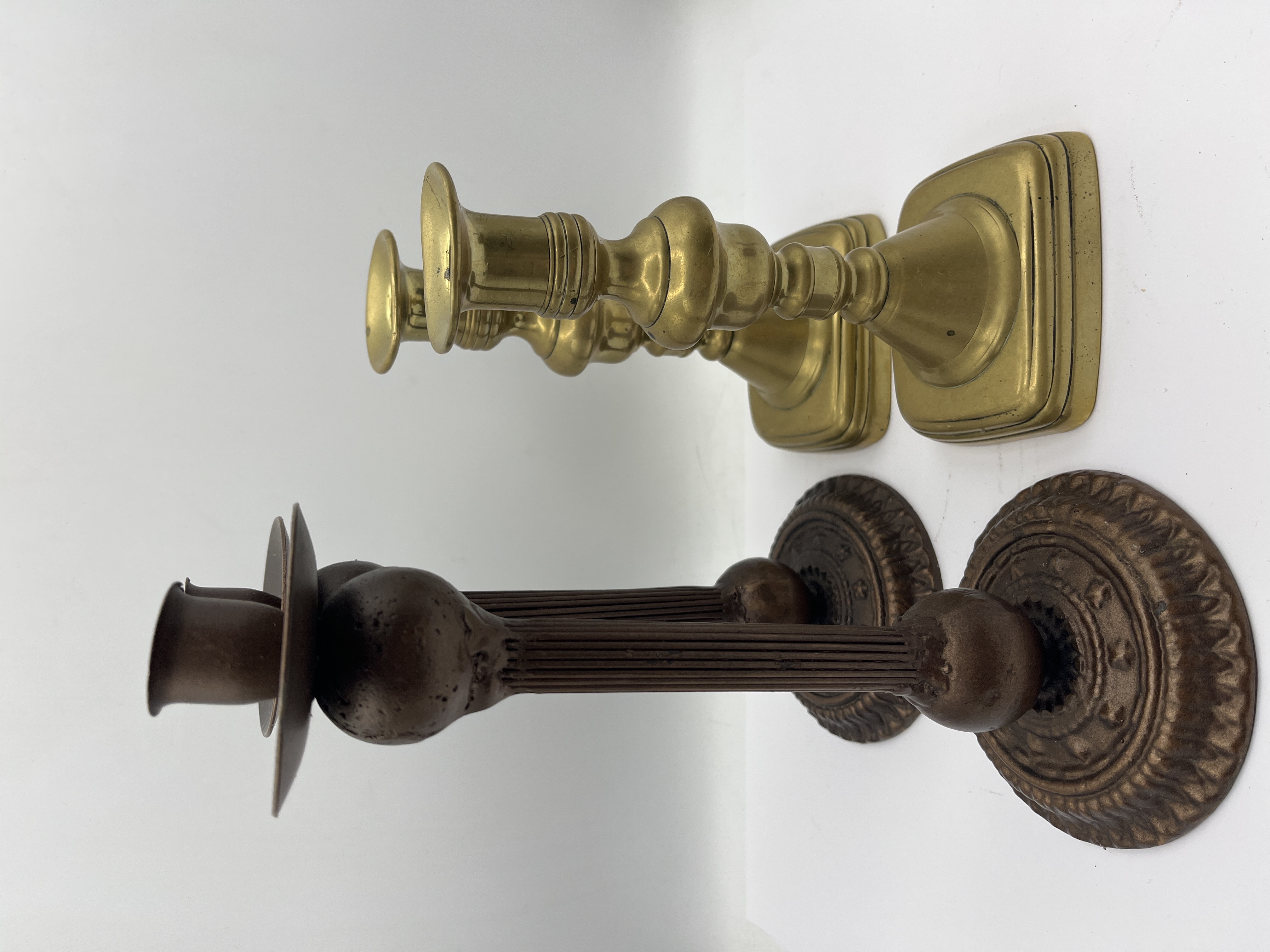 A collection of metal candlesticks featuring two distinct styles. One group is crafted from yellow metal, likely brass, featuring traditional baluster-turned stems resting on square, stepped bases with flared candle nozzles. The other group consists of dark-patinated metal, possibly cast iron or bronze, displaying a neo-classical aesthetic with fluted columnar shafts, integral wide drip pans, and circular bases embellished with molded decorative borders including rosettes and gadrooning. The tallest examples in the collection reach a height of 10 inches. No maker marks are visible.