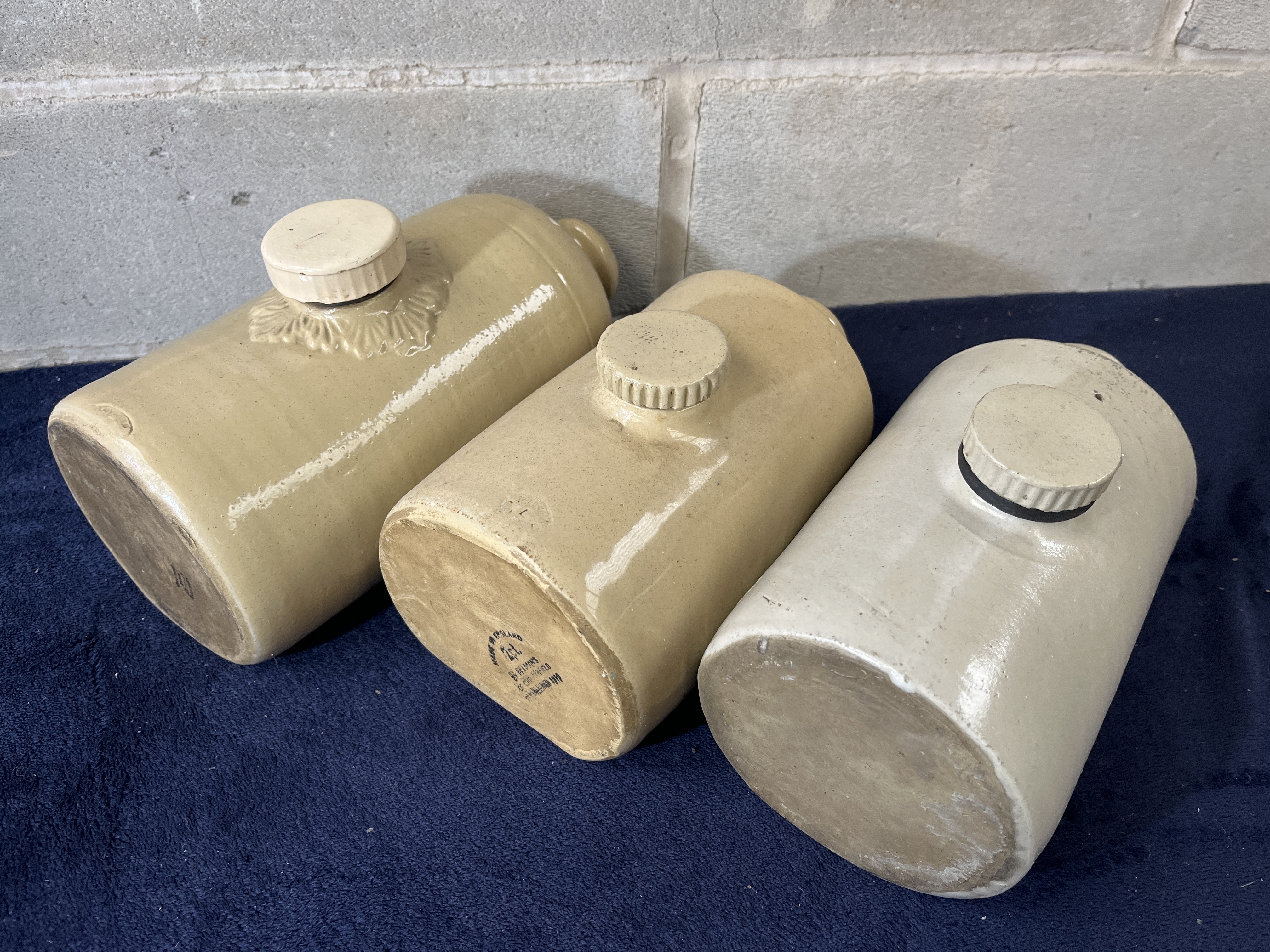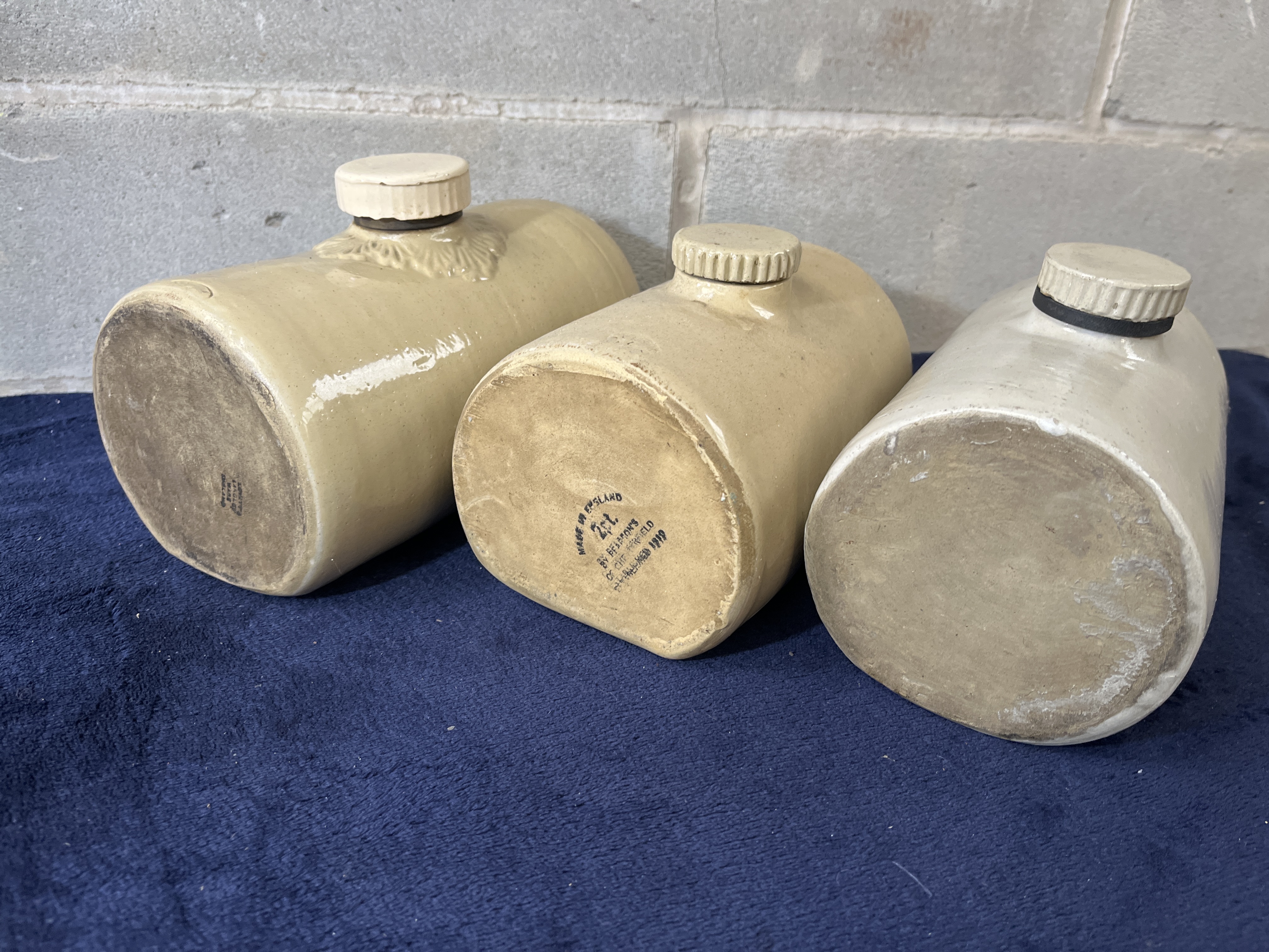 A trio of glazed stoneware foot warmers, also referred to as bed warmers, crafted with cylindrical bodies, rounded shoulders, and flattened bases. The collection features varying shades of cream and tan salt glaze. Each vessel is equipped with a ceramic screw-top stopper. One example includes a decorative molded foliate motif encircling the filling port. The base of one bottle bears a clear black maker’s mark reading MADE IN ENGLAND BY PEARSON’S OF CHESTERFIELD ESTABLISHED 1810. Another bottle features an impressed mark indicating a 2pt capacity. These items were traditionally used as heat reservoirs for domestic bedding.