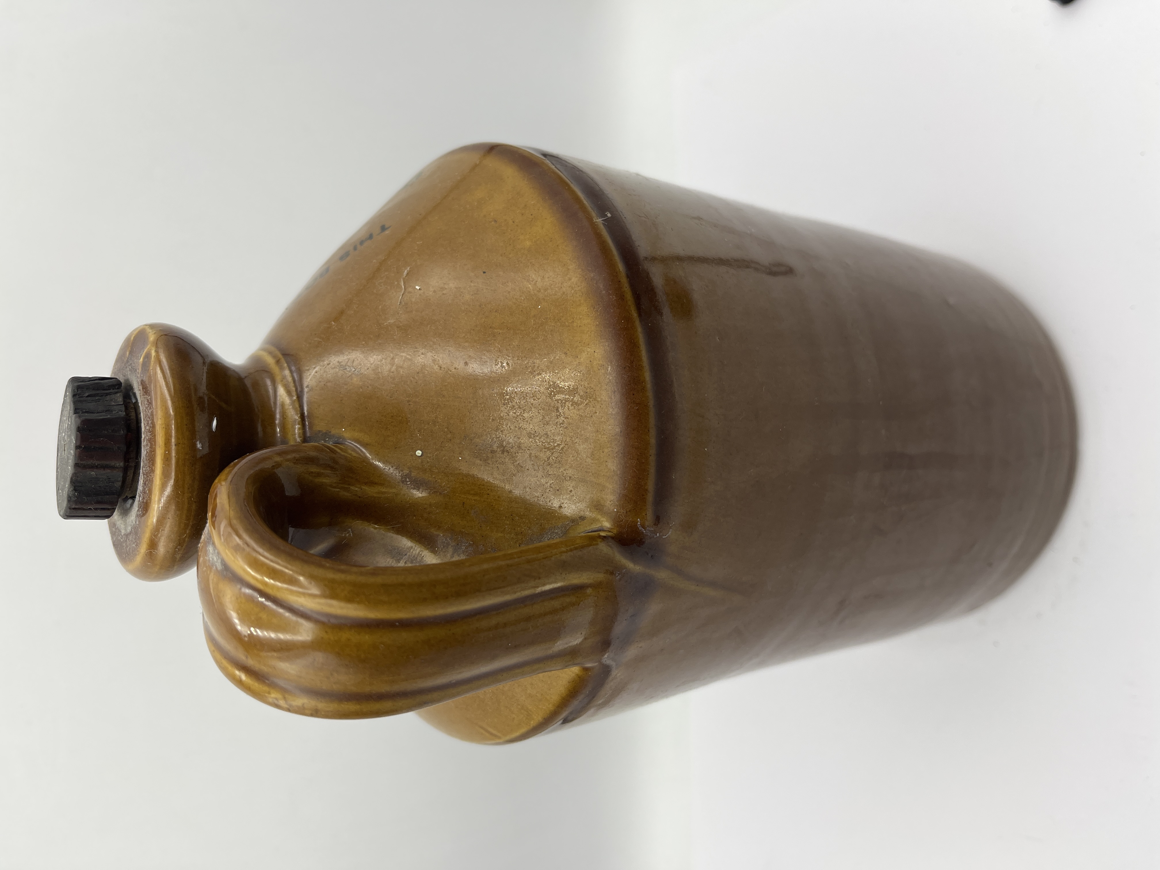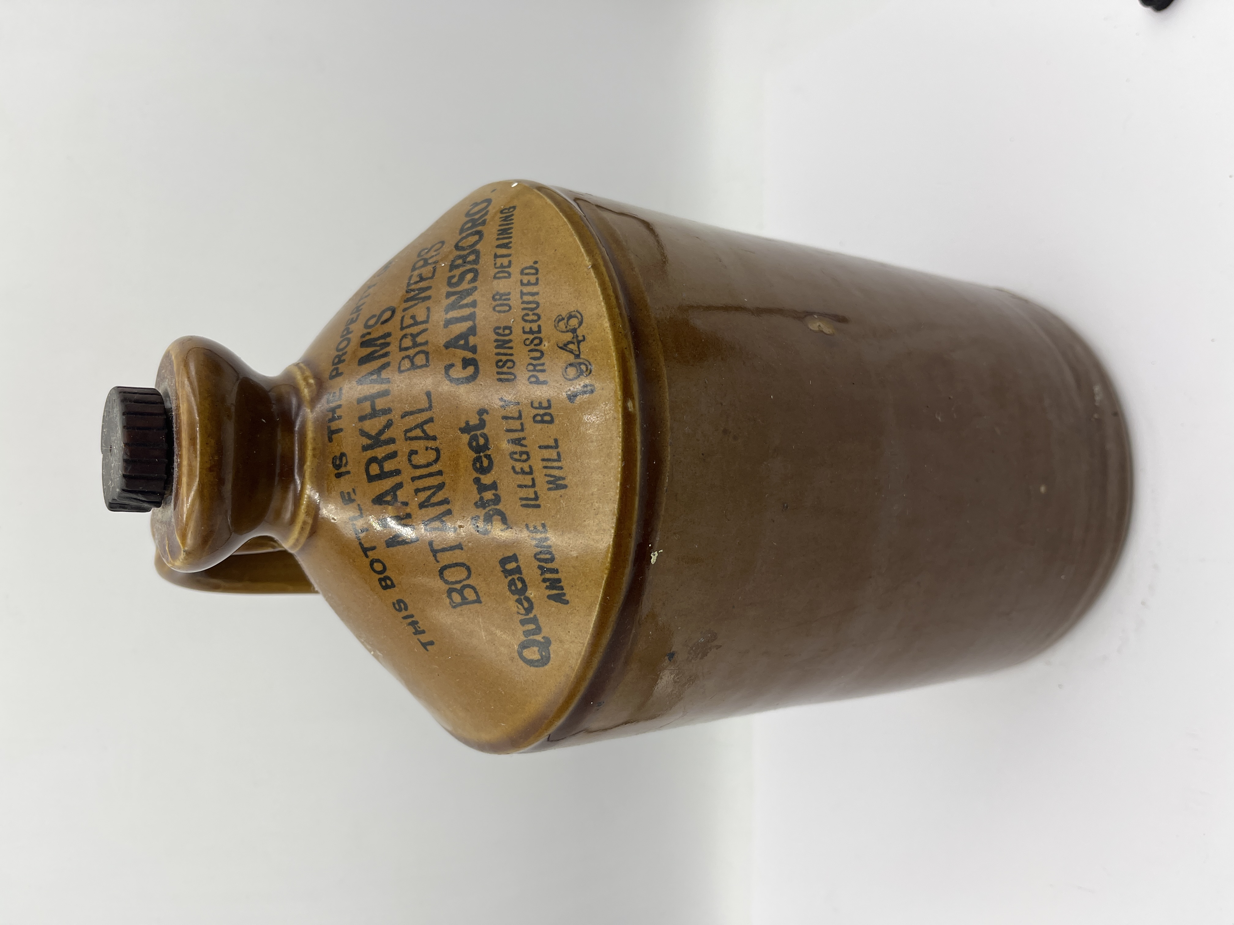 A mid-20th-century salt-glazed stoneware flagon produced for Markham’s Botanical Brewers of Queen Street, Gainsboro. The vessel features a cylindrical body, a sloping shoulder, and a single loop handle. The shoulder is decorated with a black transfer print reading This bottle is the property of Markham’s Botanical Brewers, Queen Street, Gainsboro, dated 1946, and includes a legal warning regarding unauthorized detention. The flagon stands 12 inches tall and is fitted with a dark-colored threaded screw-cap.