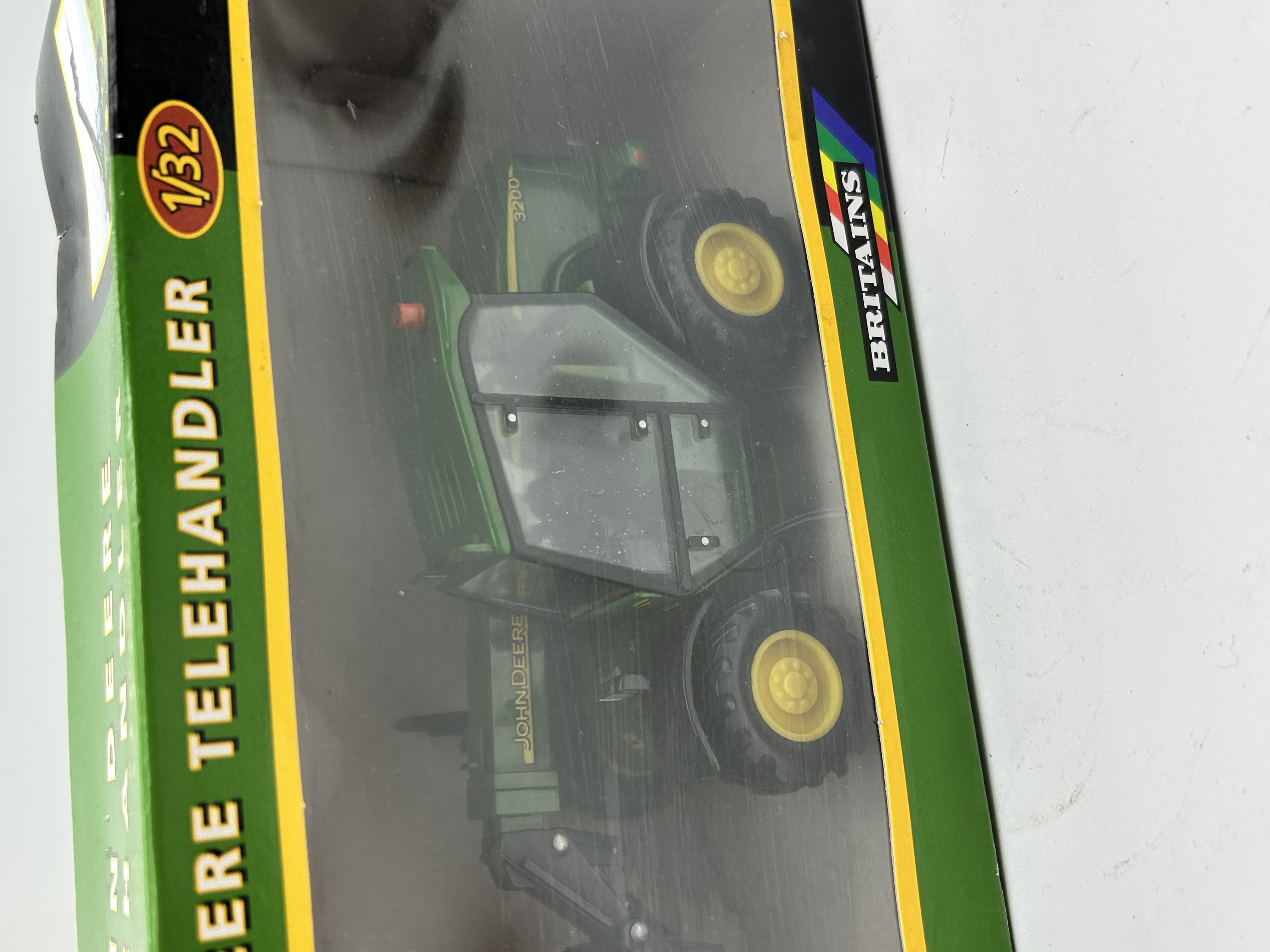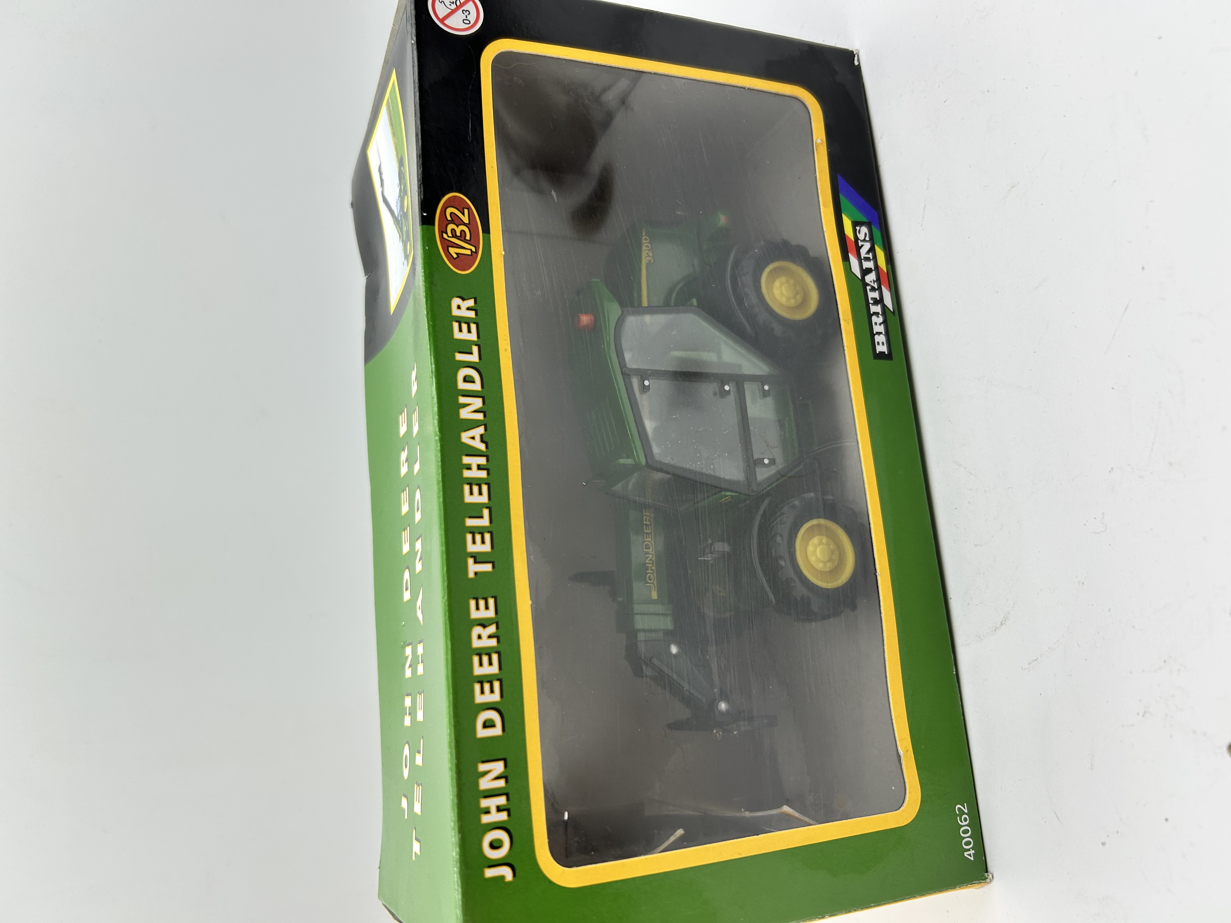 A Britains 1:32 scale die-cast model of a John Deere 3200 Telehandler, item number 40062. The model is finished in John Deere green and yellow with black accents. It features an enclosed cab, tires with yellow rims, and an extendable boom. The model is presented in its original color-printed window box displaying Britains branding and model specifications.