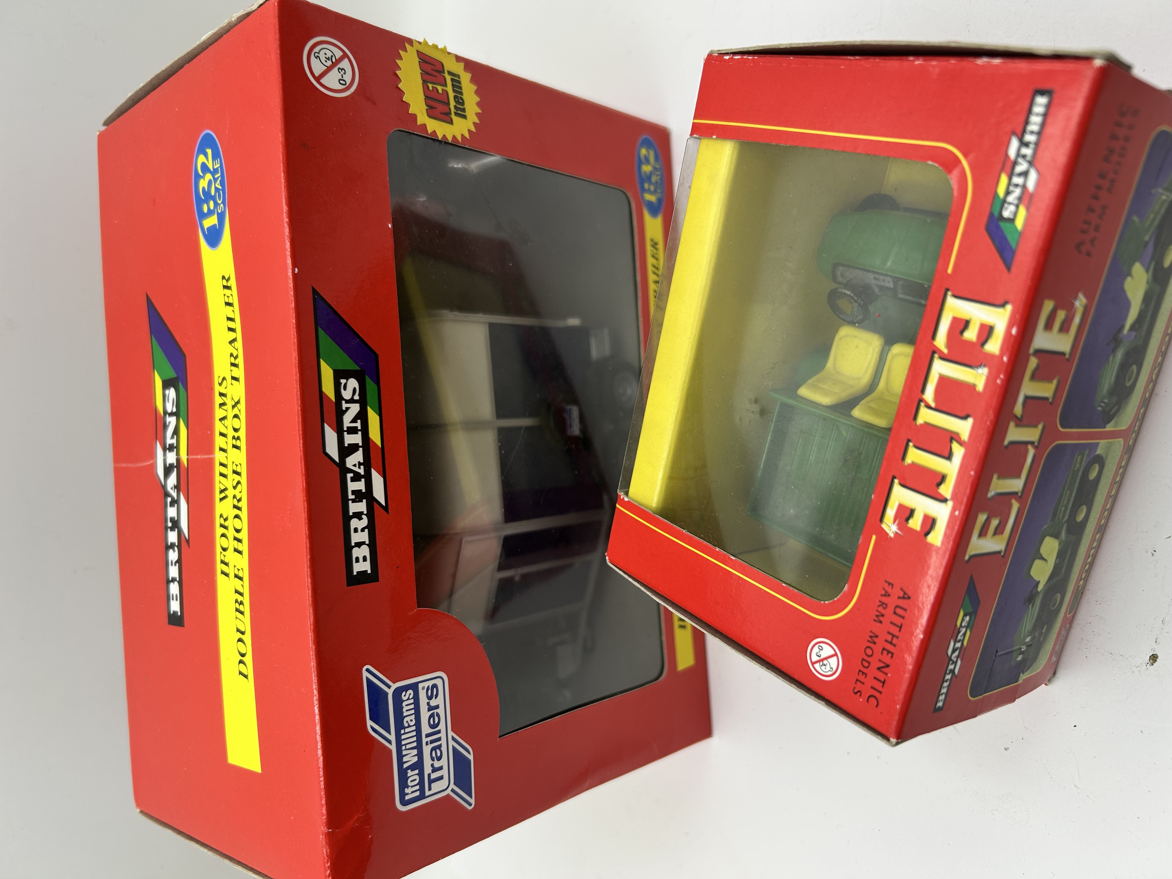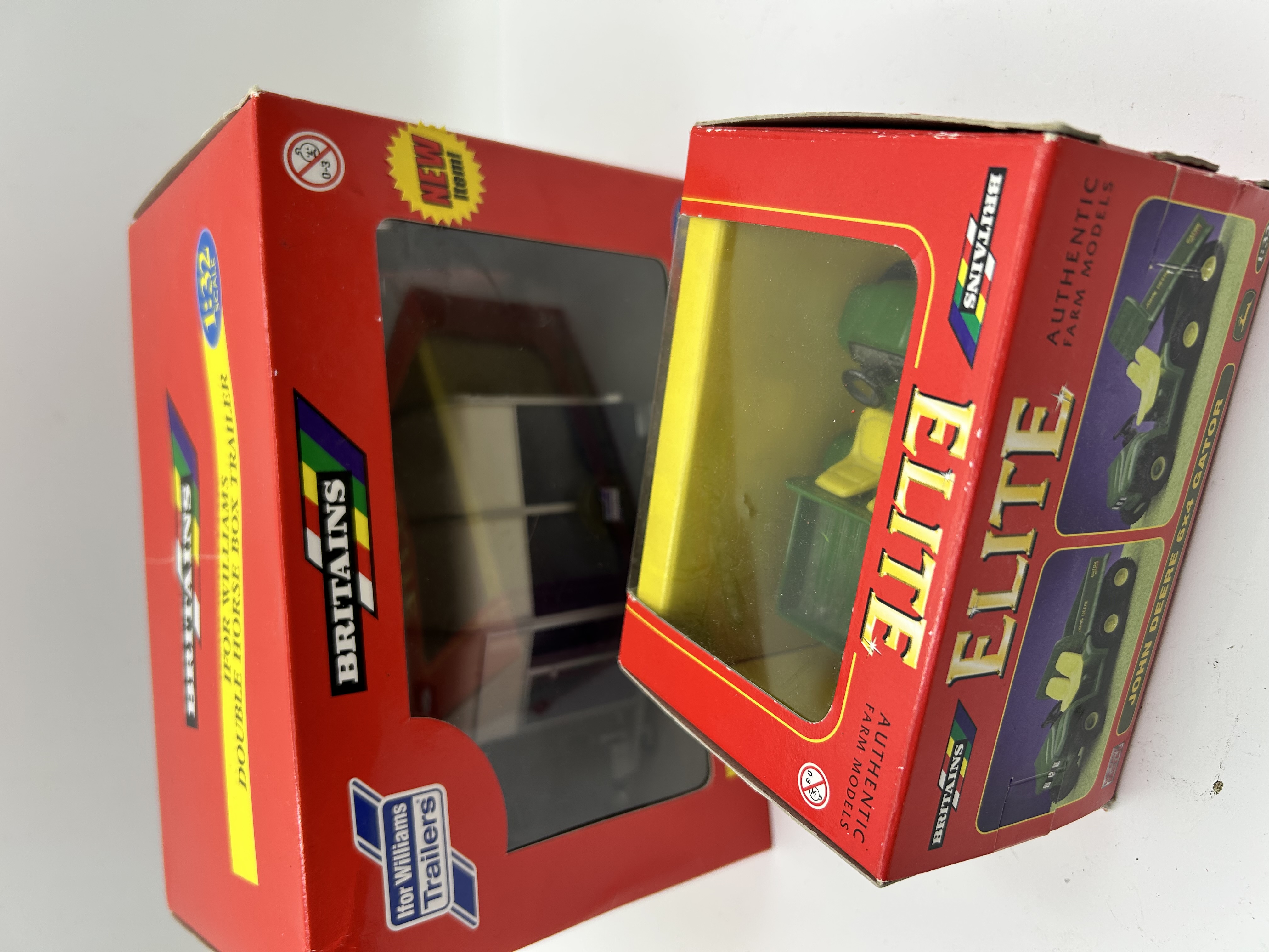Two Britains die-cast farm models in their original retail packaging. The first model is an Ifor Williams Double Horse Box Trailer produced in 1:32 scale. The second model is a John Deere 6×4 Gator from the Britains Elite Authentic Farm Models series. Both models are constructed from a combination of die-cast metal and plastic components. The items are housed in their original red cardboard window boxes featuring the Britains logo, Ifor Williams Trailers branding, and John Deere identification.