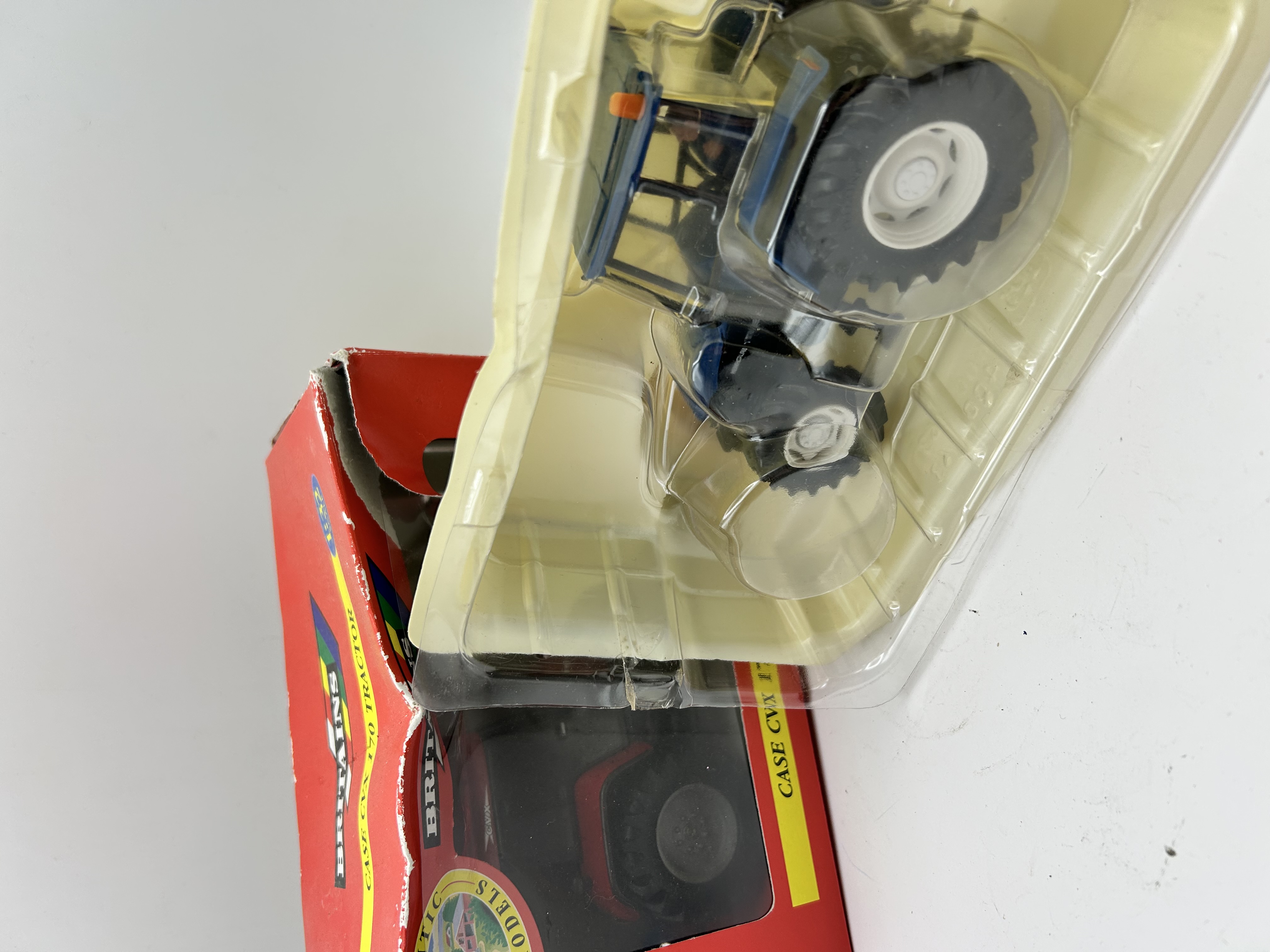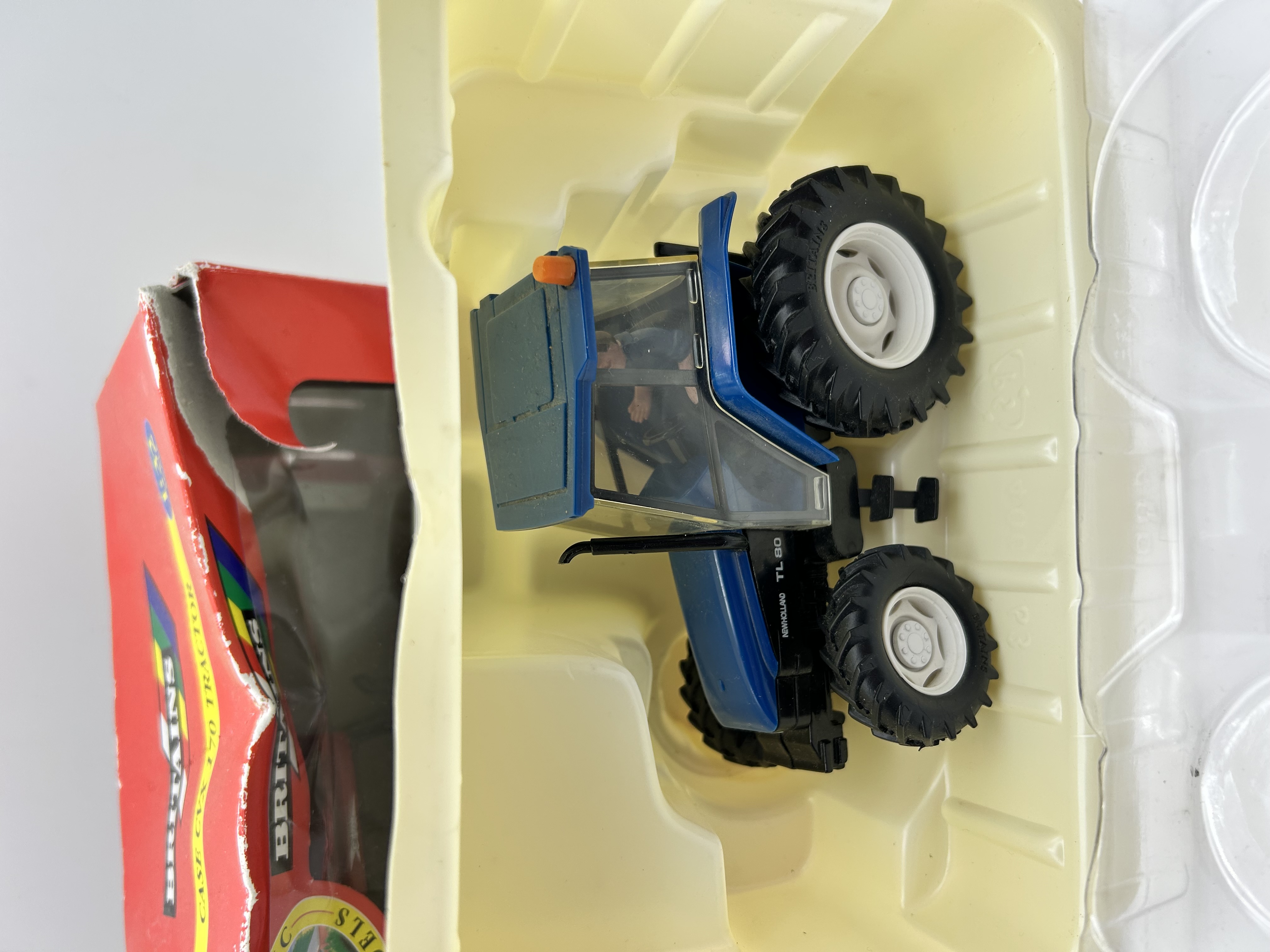 Two Britains Ertl 1:32 scale die-cast model farm tractors, including a red Case CVX 170 and a blue New Holland TL 80. These models are constructed from die-cast metal and plastic components, featuring realistic details such as manufacturer decals and treaded rubber tires. The Case CVX 170 is accompanied by a red and yellow window box. The New Holland TL 80 is presented in a molded plastic insert tray.