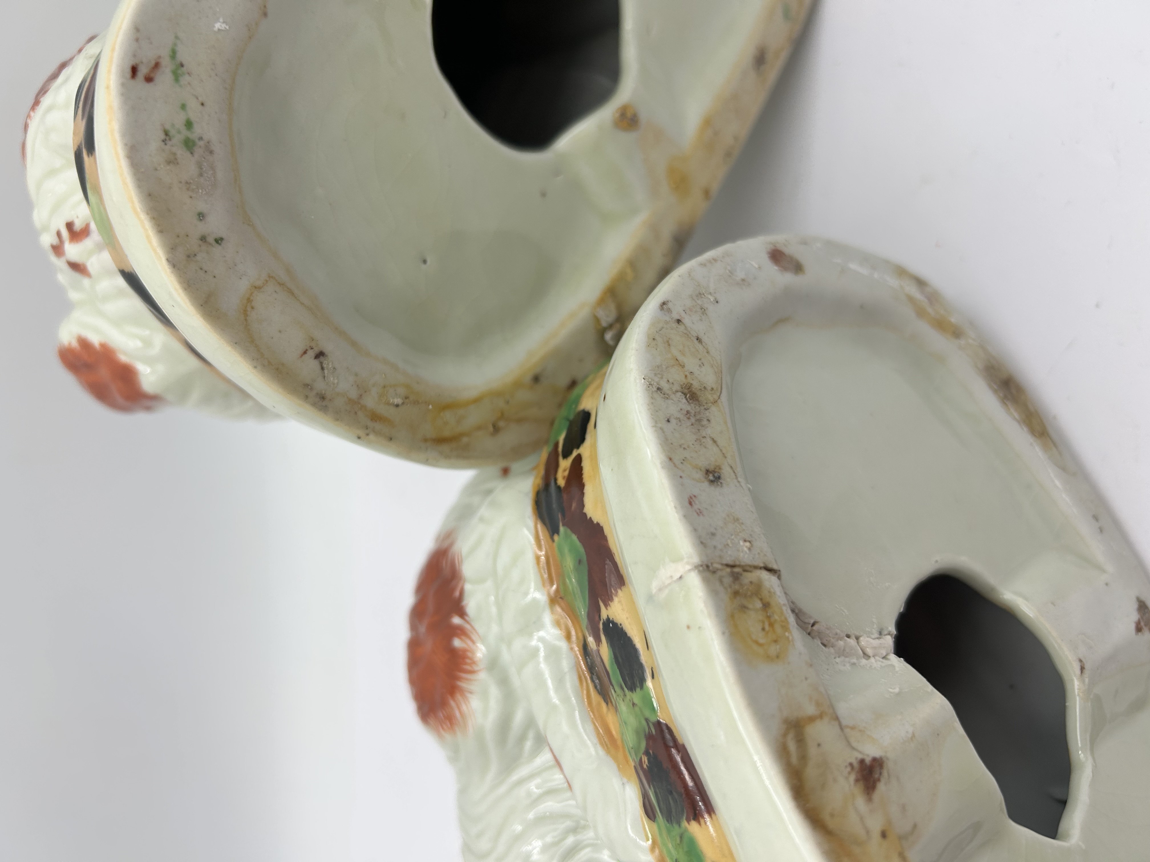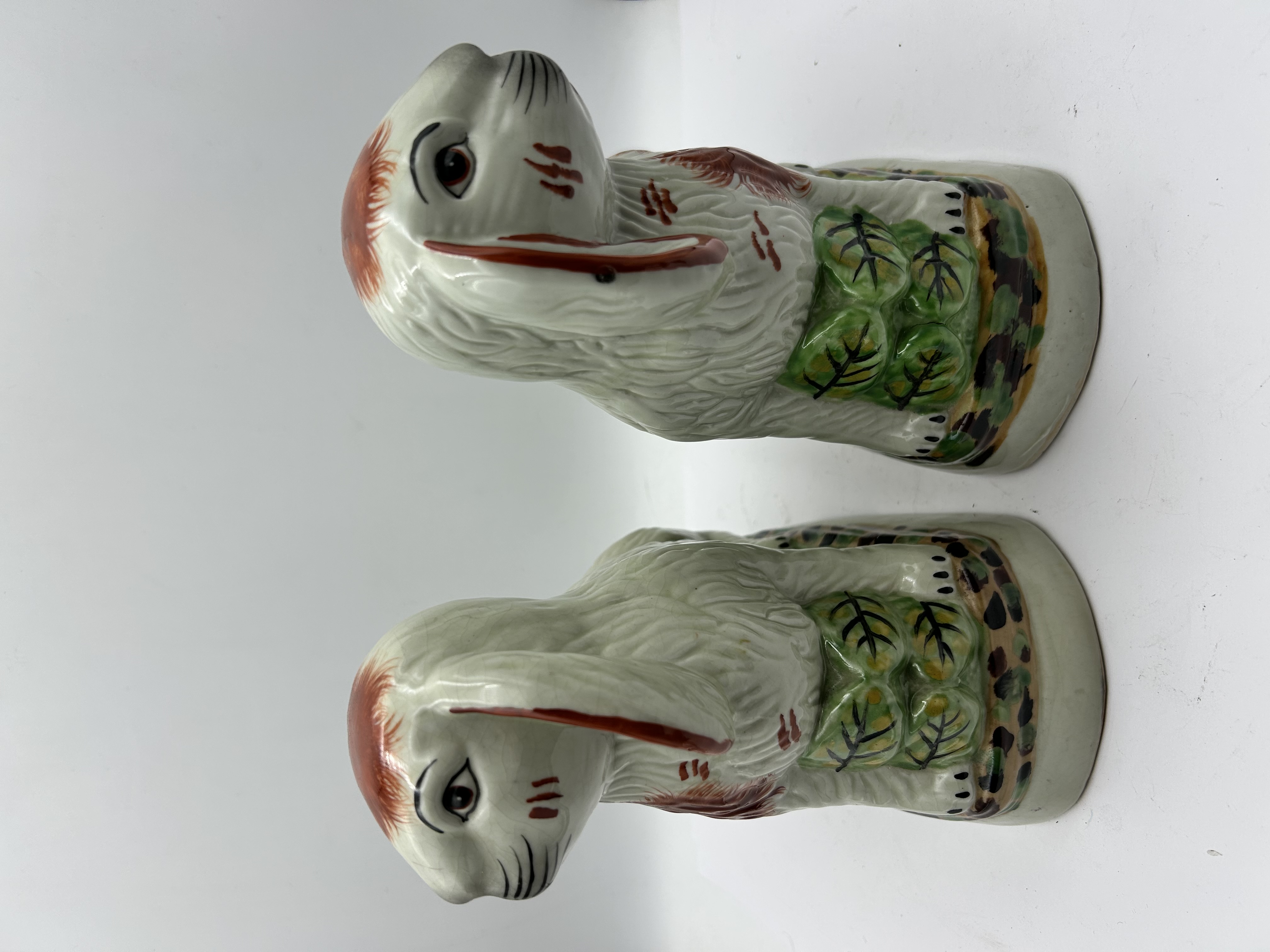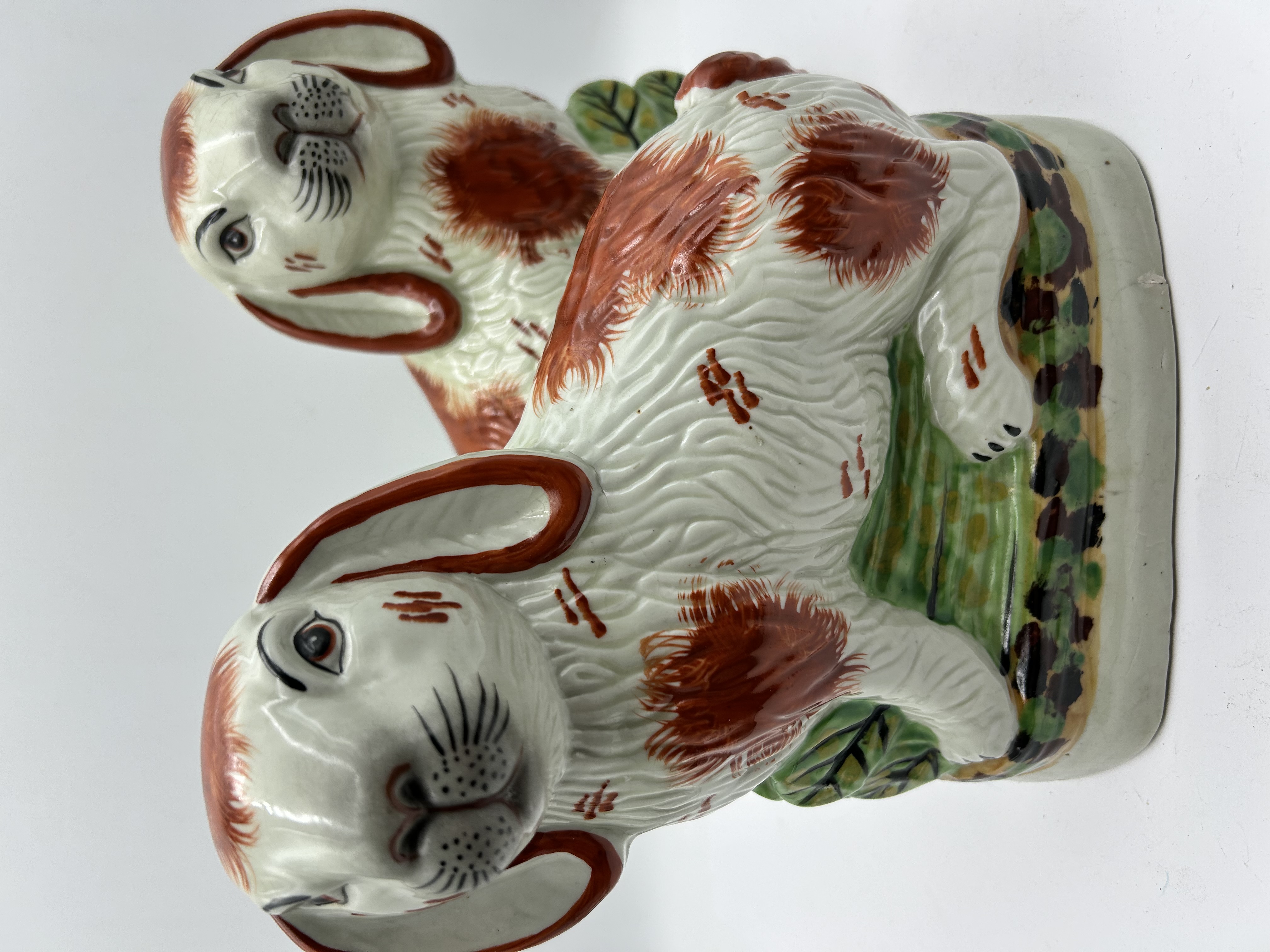 A pair of Staffordshire style rabbit figurines crafted from glazed earthenware. Each figure is modeled in a seated pose featuring a textured white body decorated with russet-colored spots and black-painted facial details. The rabbits are set upon integral bases accented with molded green leaves and a polychrome-patterned rim. The items exhibit a hollow interior construction. No maker’s marks are apparent on either piece.