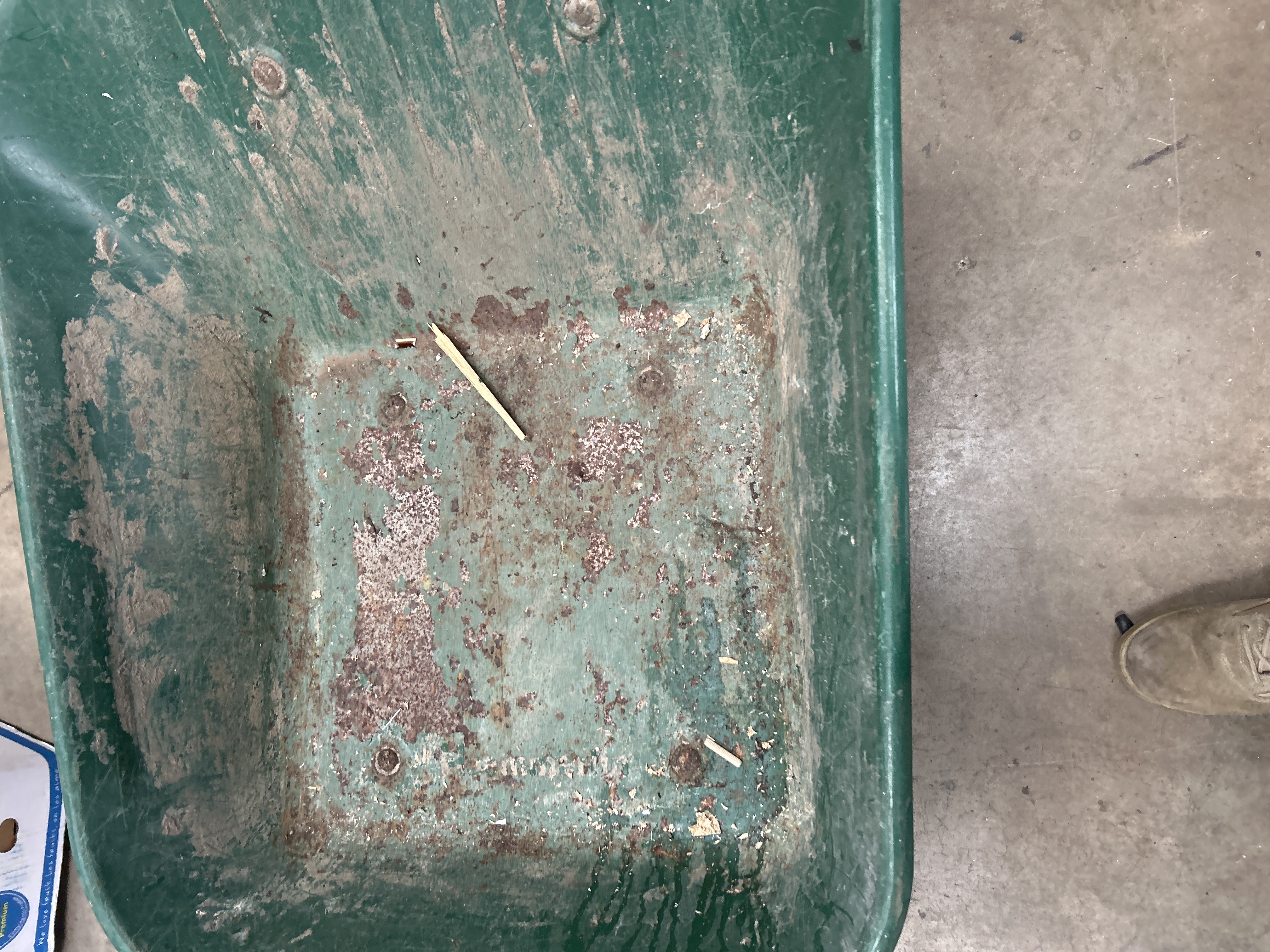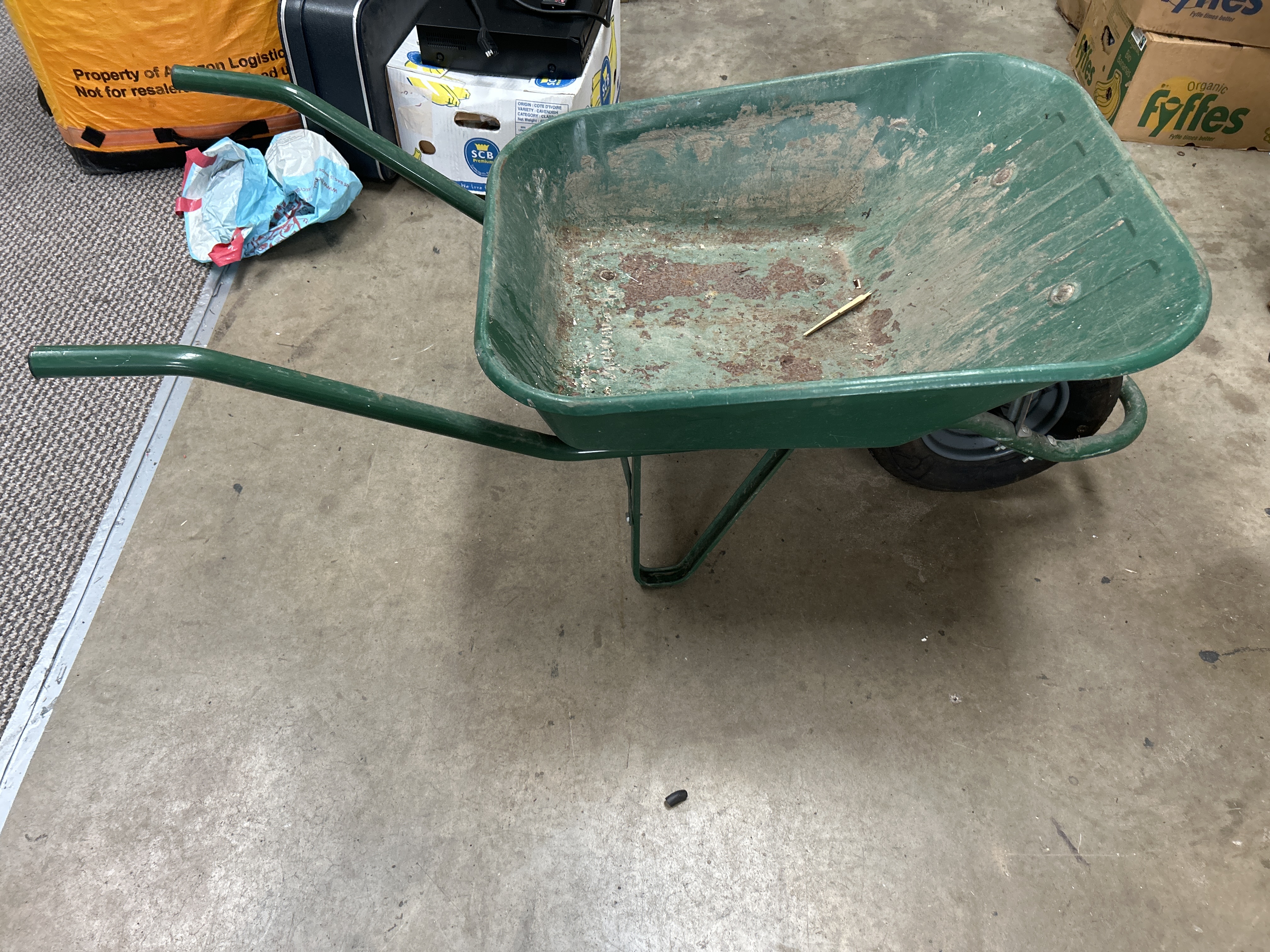 A Trimate metal wheelbarrow featuring a hunter green painted finish. The item is constructed with a single wheel design, utilizing a black pneumatic tire on a metal rim. The frame consists of integrated tubular metal handles and support legs. The interior base of the metal tub is embossed with the WALSALL brand name.