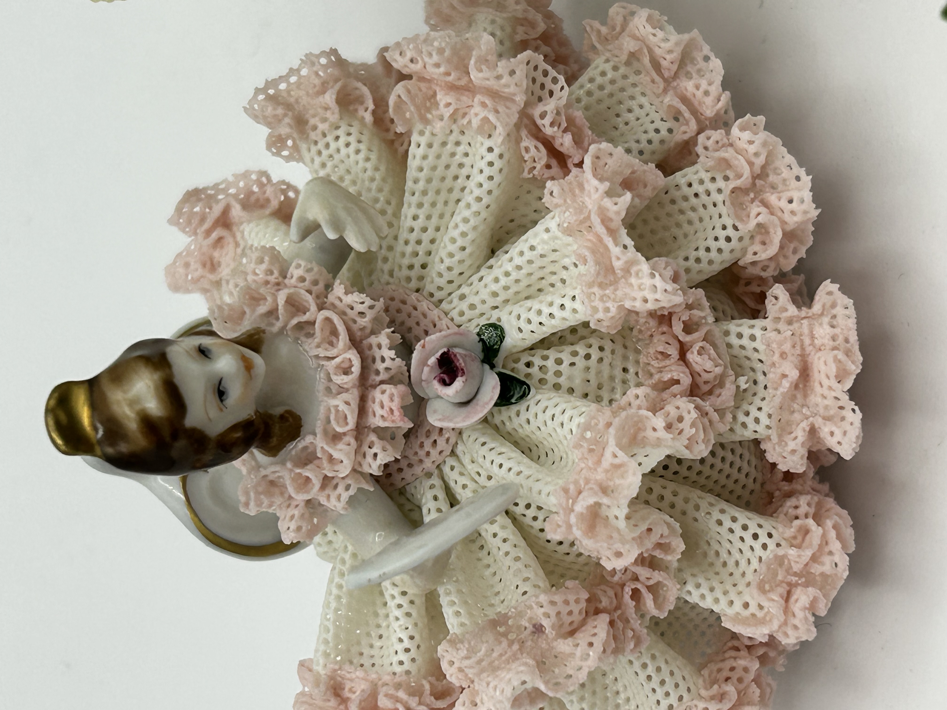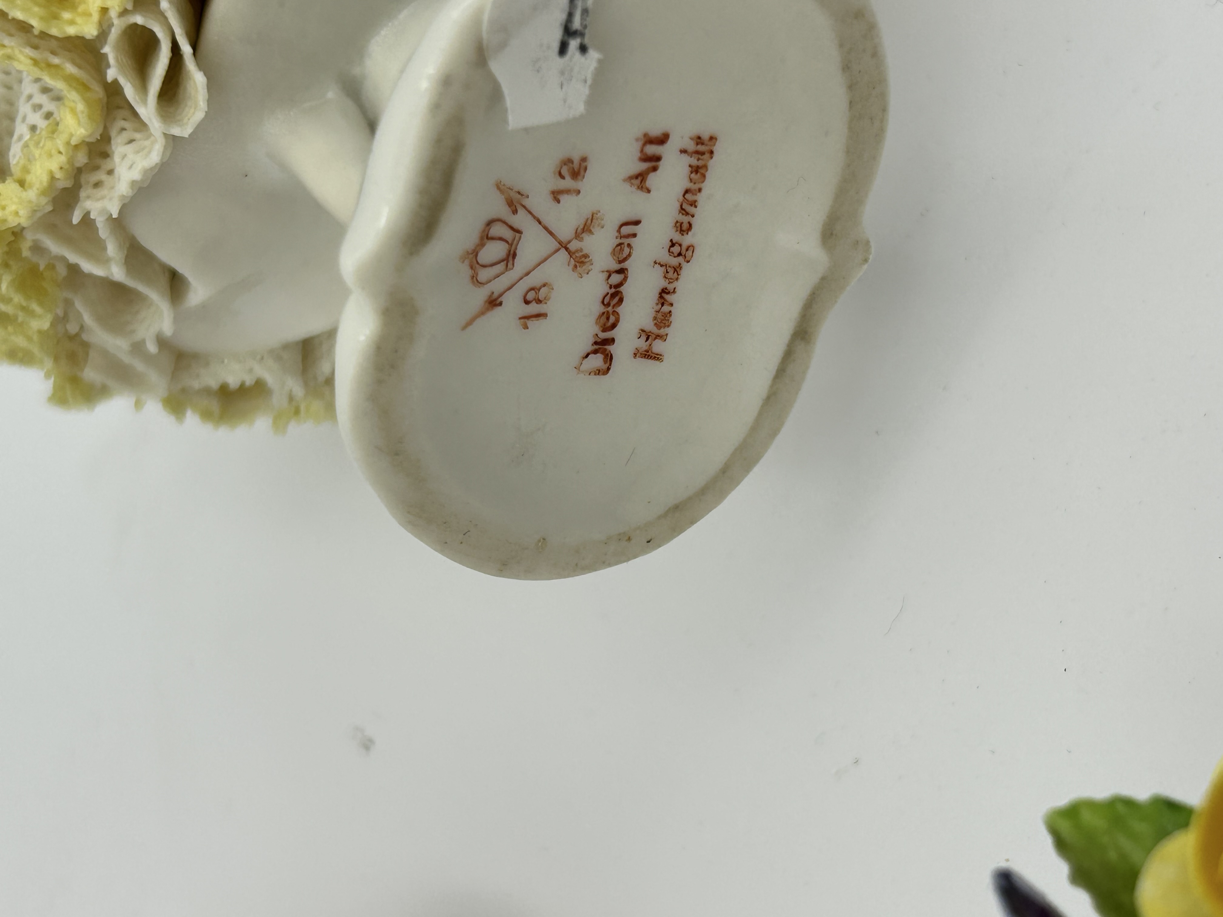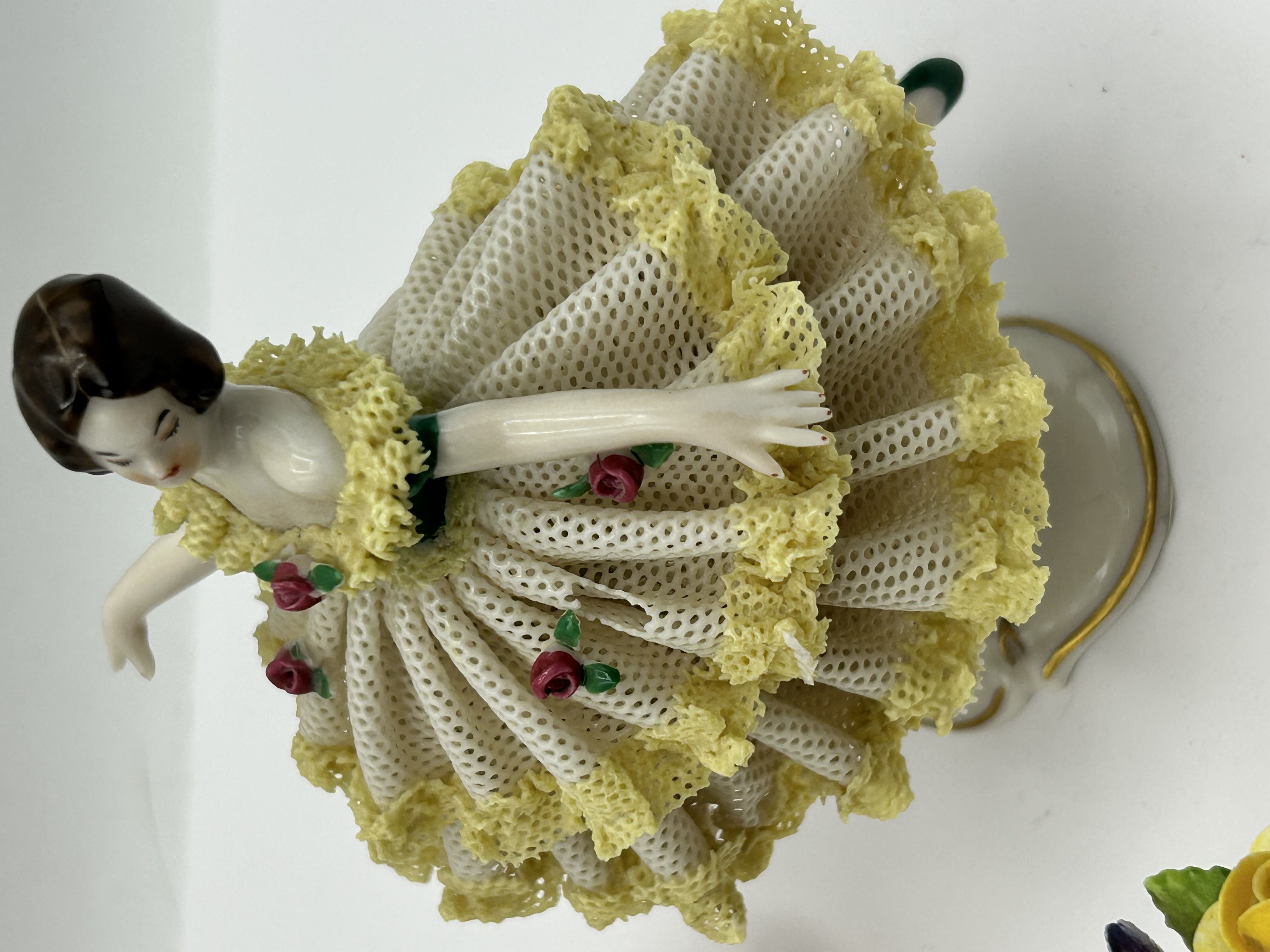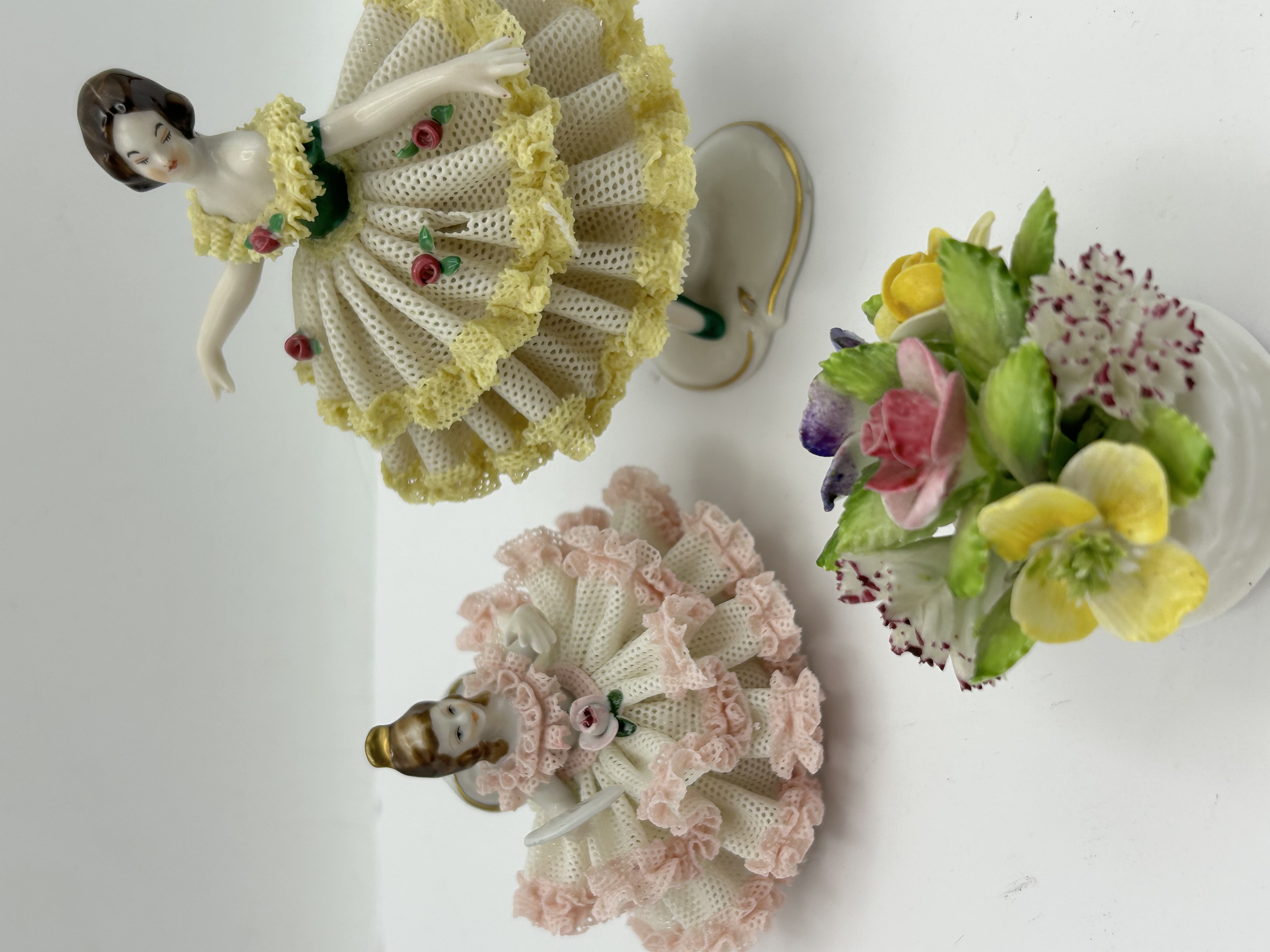 Dresden Art porcelain lace figurines and floral arrangement. This group includes two female figures in gowns featuring delicate porcelain lace construction. One figure is decorated with yellow ruffled trim and red rosebuds, while the other features pink ruffles and a central pink rose. The collection includes a small multi-colored porcelain floral bouquet with hand-painted blooms. The base of one figurine is marked in red with a crown over crossed arrows, the numbers 18 12, and the text Dresden Art Handgemalt.