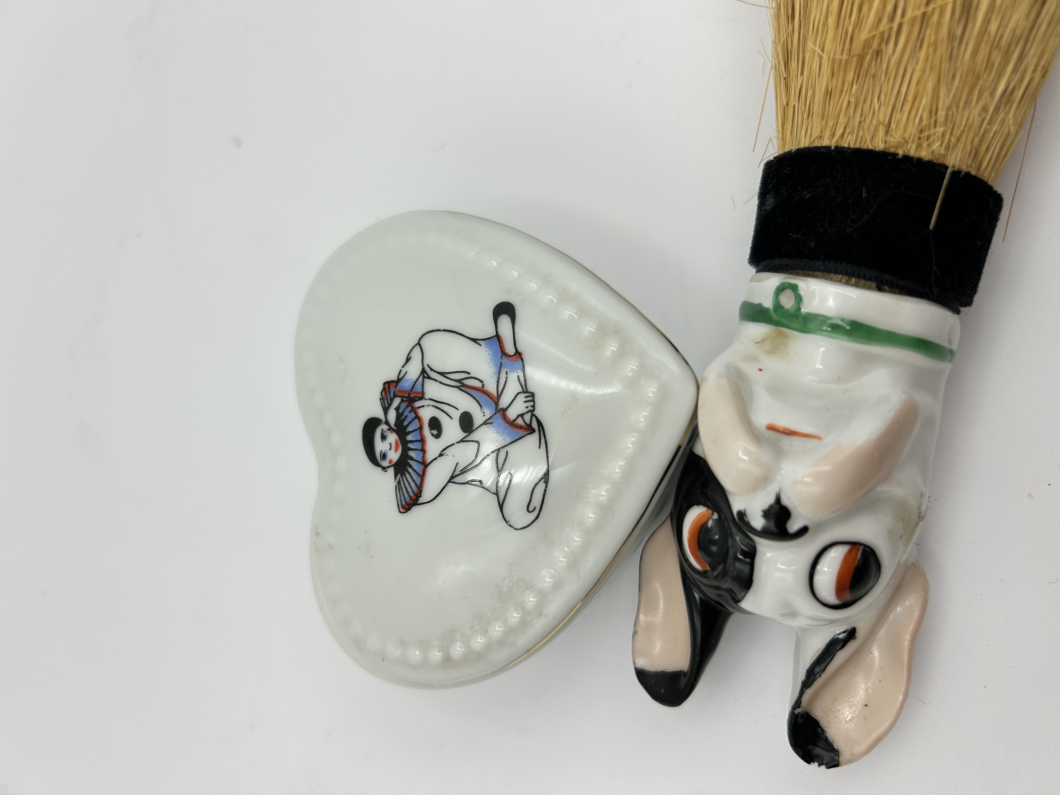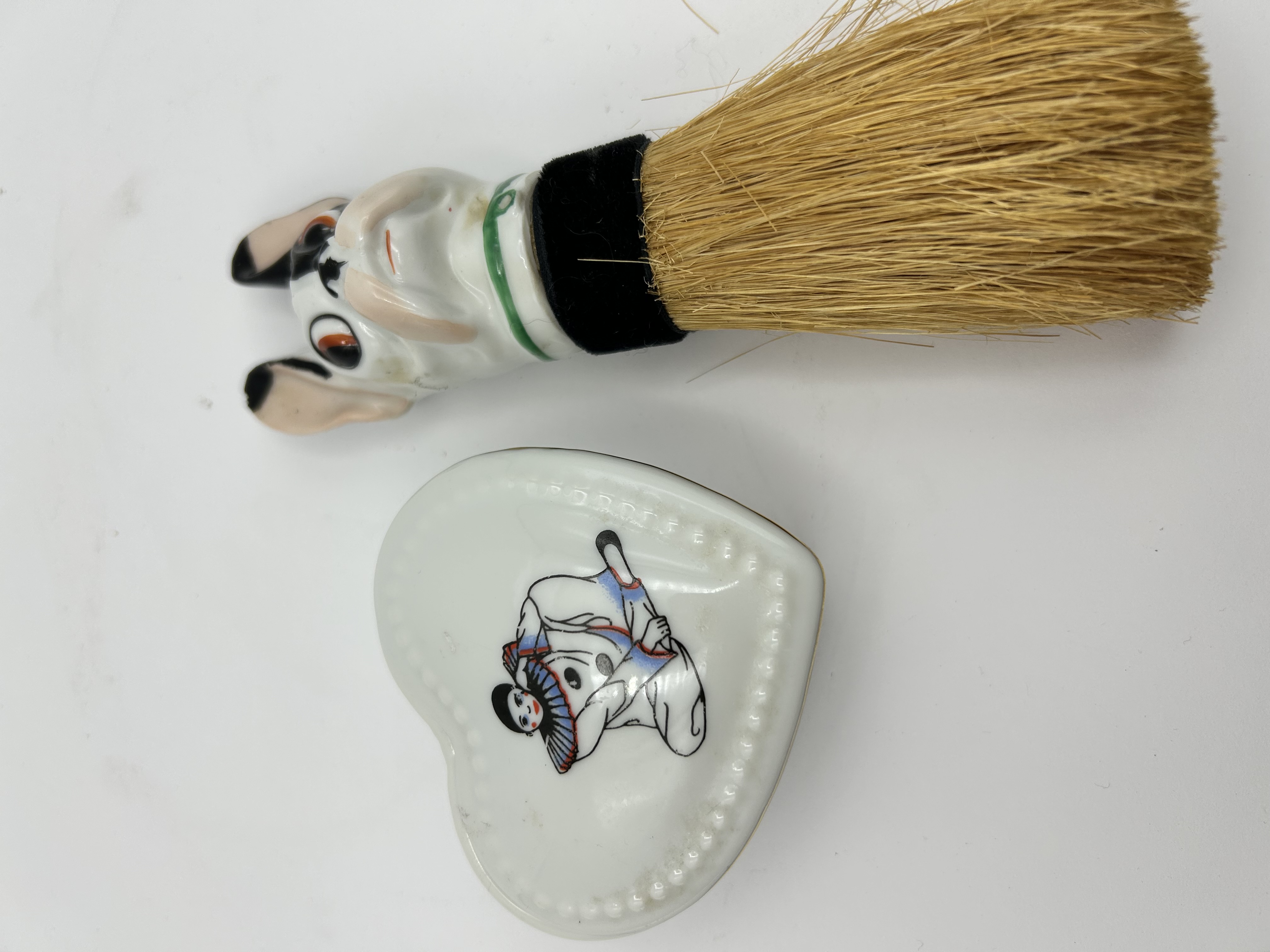 Two vintage ceramic novelty vanity items. The first is a heart-shaped trinket box lid constructed of white glazed ceramic featuring a raised beaded border and a central graphic of a seated Pierrot clown in a traditional white costume with blue and red accents. Web intelligence indicates this motif is consistent with 1980s retro collectible sets. The second item is a figural shaving brush with a glazed porcelain handle modeled in the form of a stylized dog, possibly a Boston Terrier, featuring large orange and black eyes and a painted green collar. The handle is fitted with natural-tone bristles held by a black band.