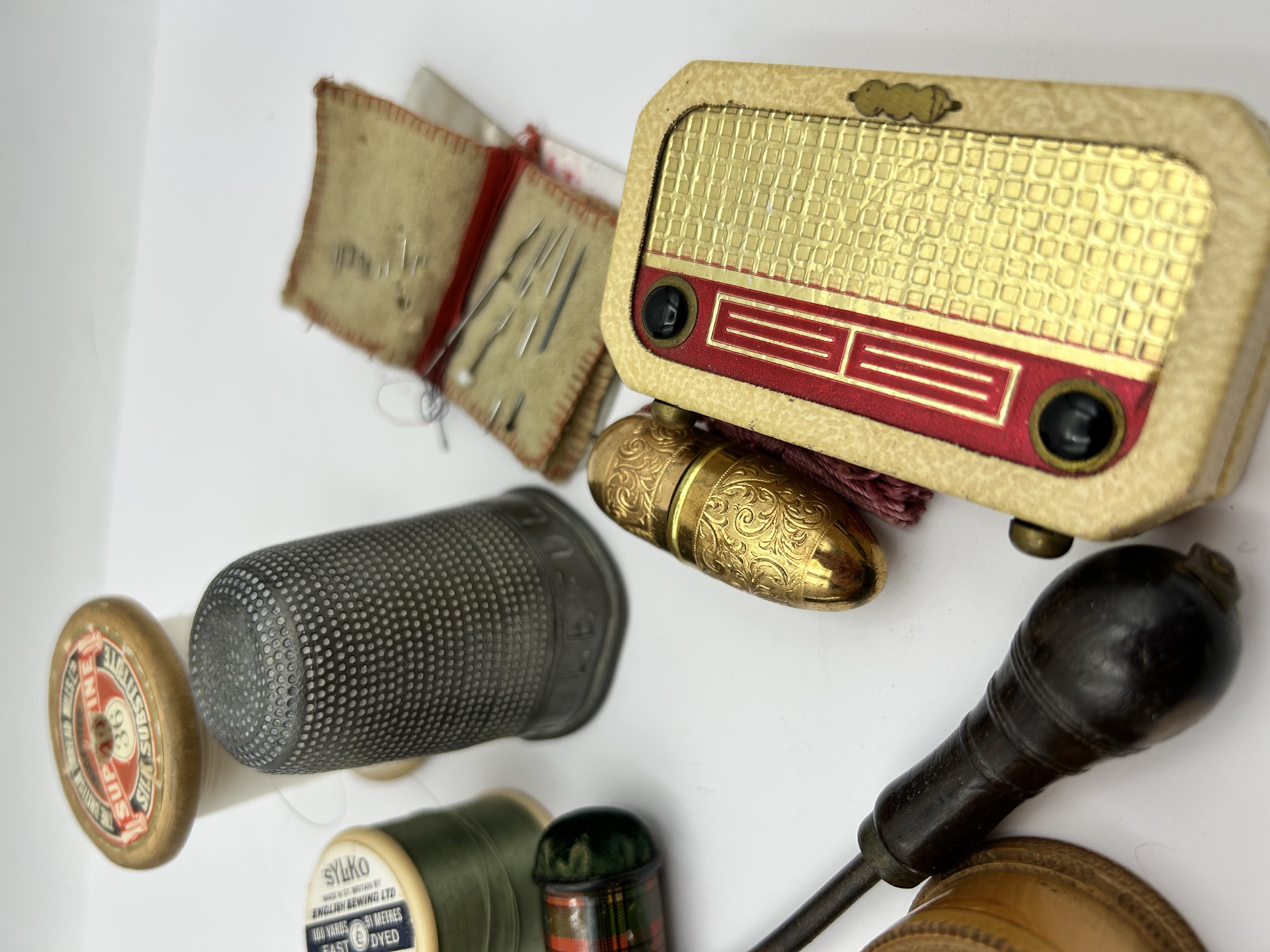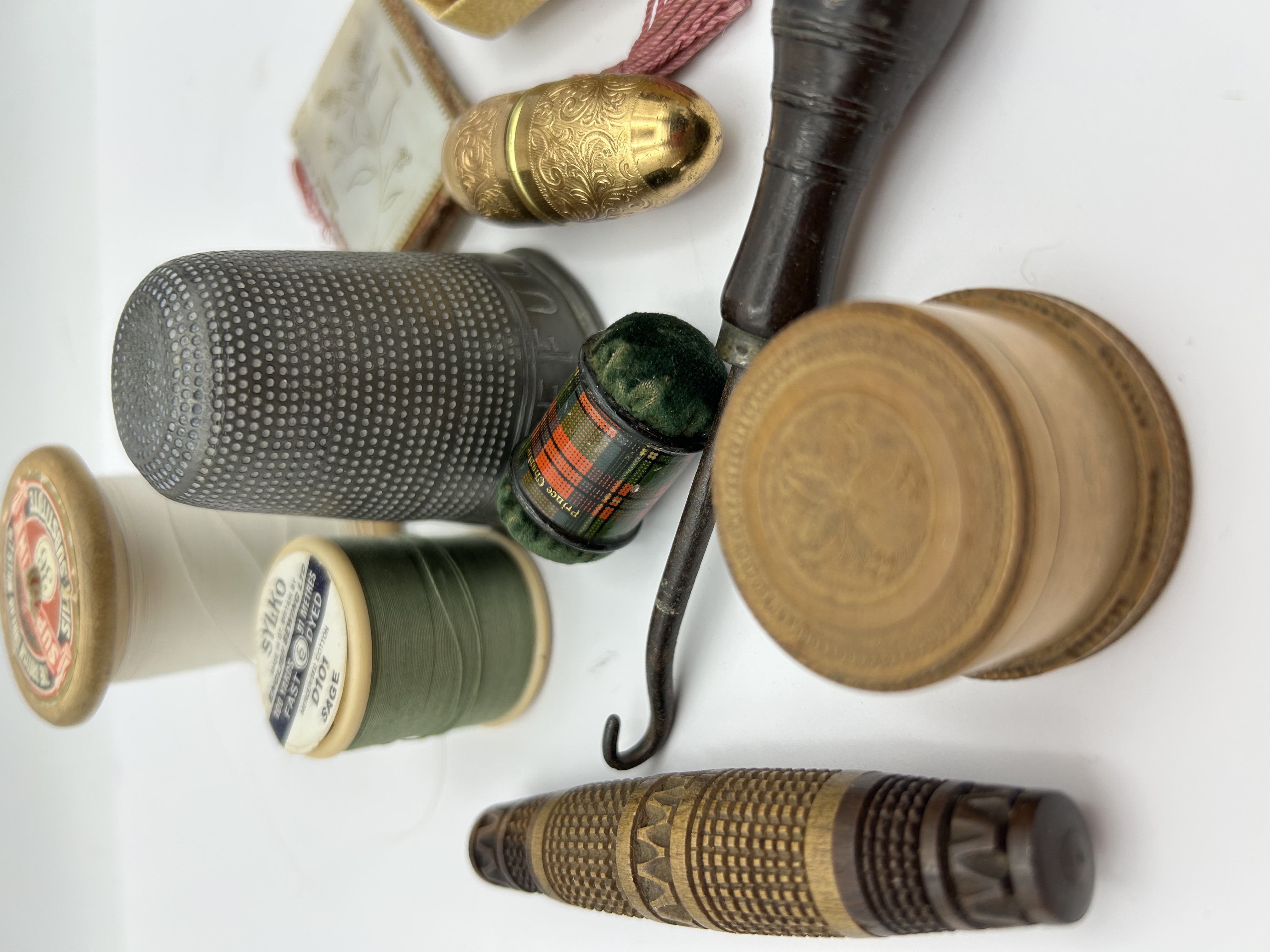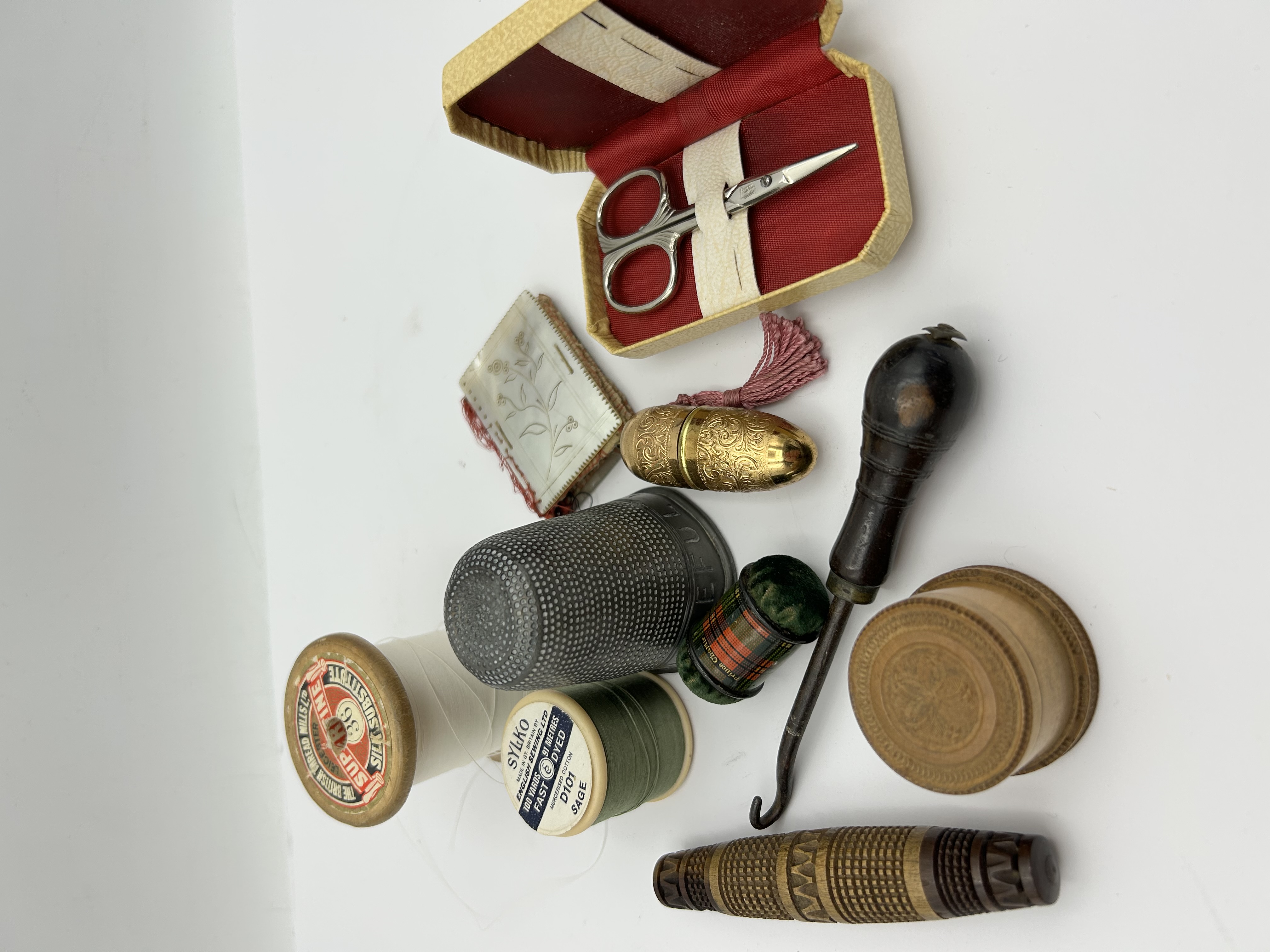 A group of various vintage and antique sewing accessories and notions. The collection includes a pair of small sewing scissors housed in a cream and red decorative case featuring a gold-tone lid panel with a grid pattern. Also present is a needle book with a carved floral cover and internal felt leaves containing several needles. The assortment features an ornate, engraved gold-tone metal needle case with an attached pink tassel, a large stippled metal thimble, and several wooden thread spools. Notable spools include one labeled Sylko in sage green and another from The British Thread Mills. Additional items comprise a miniature tartan and green velvet pincushion, a dark wood-handled button hook, a small circular carved wooden container with a floral motif on the lid, and a turned wooden needle case with decorative bands. The items are constructed from materials including wood, metal, bone or celluloid, and fabric.