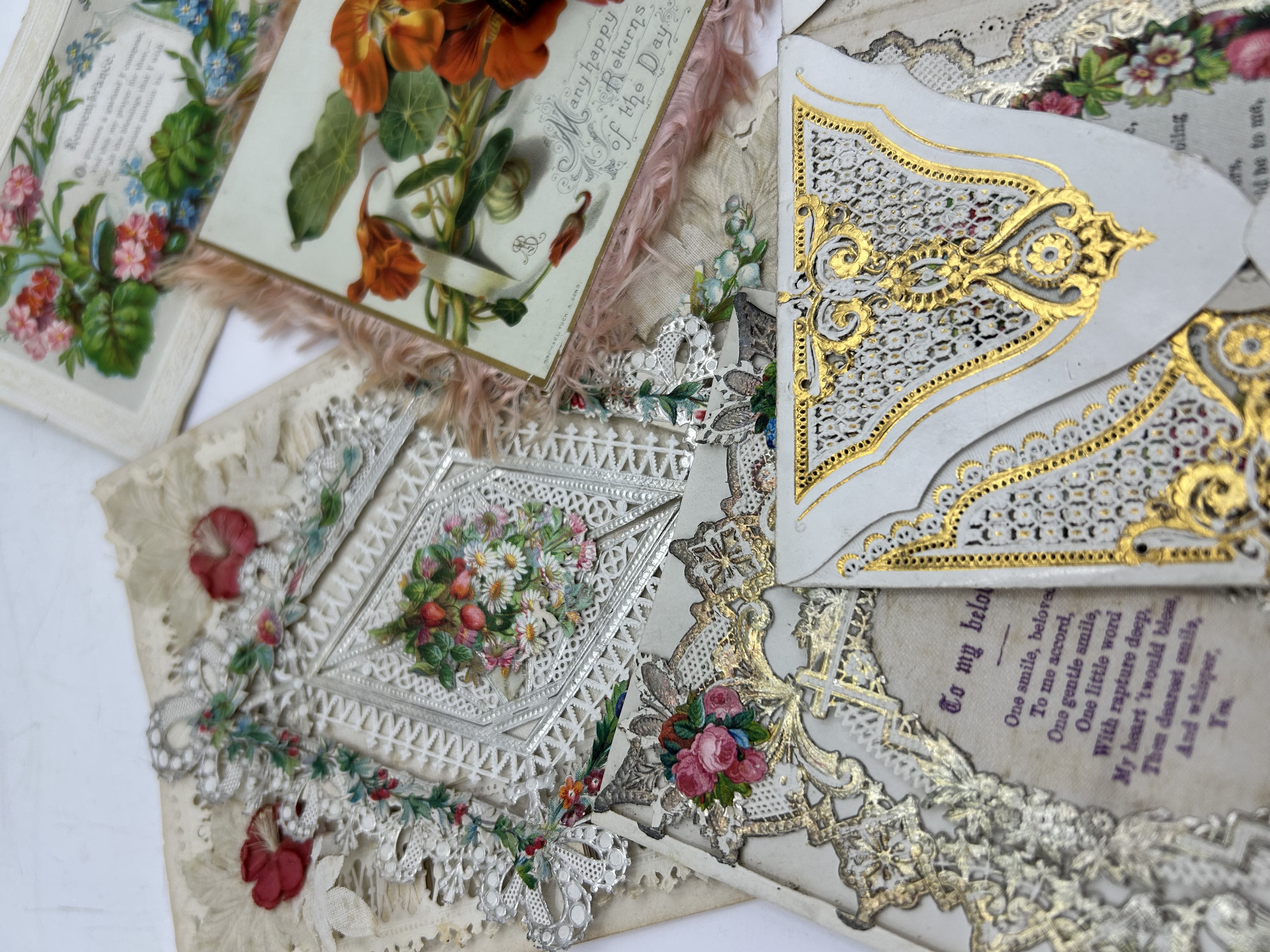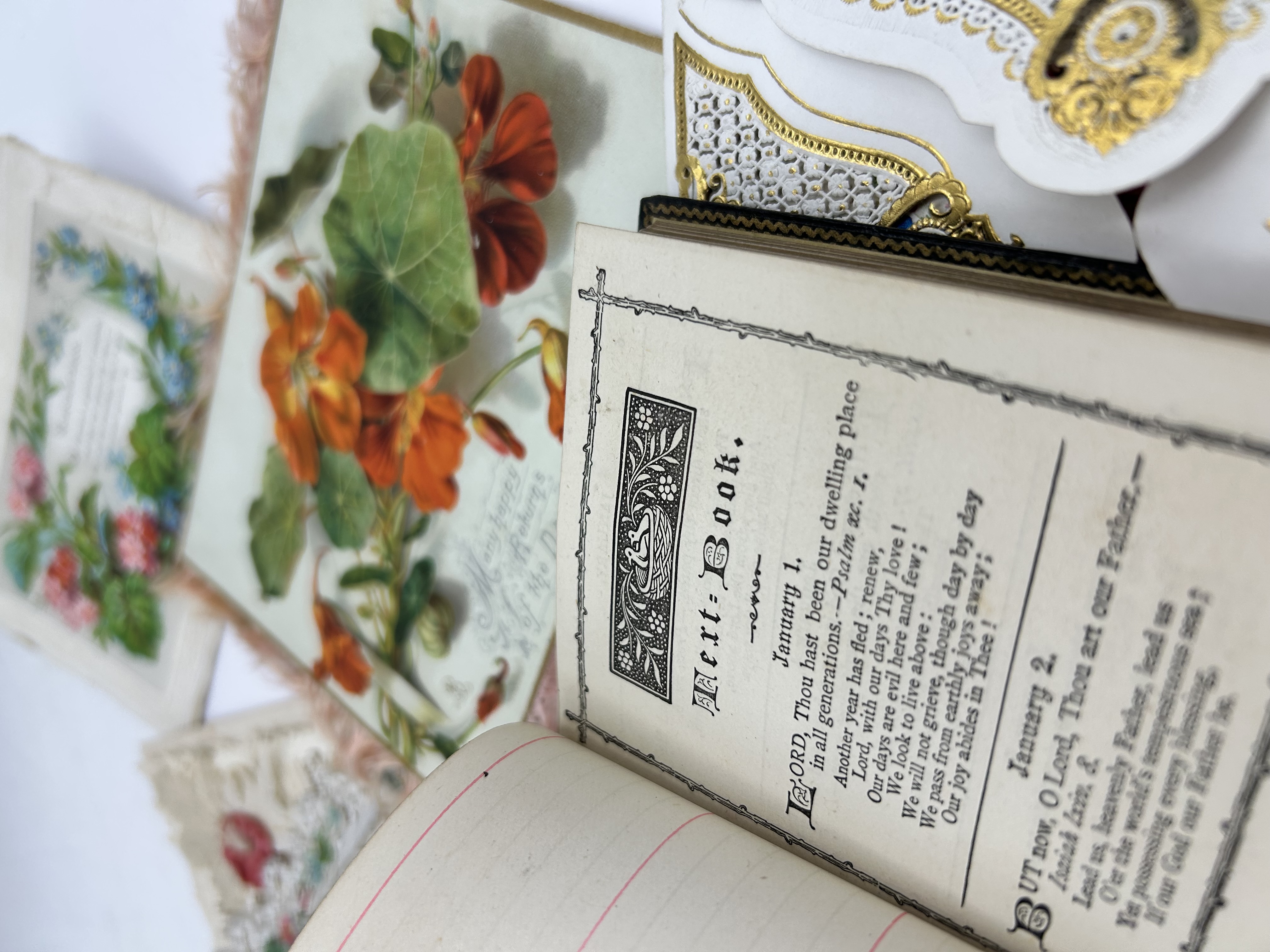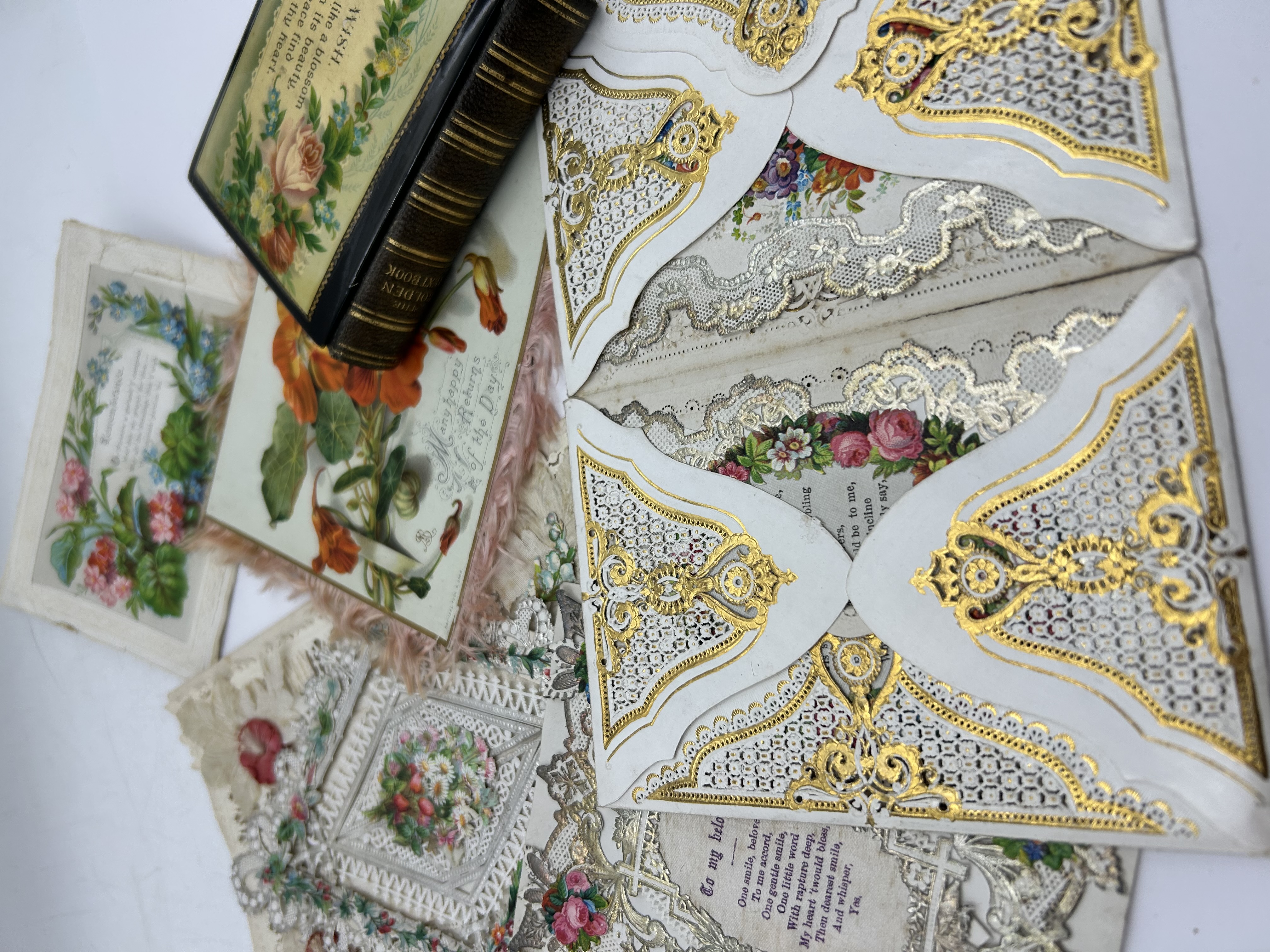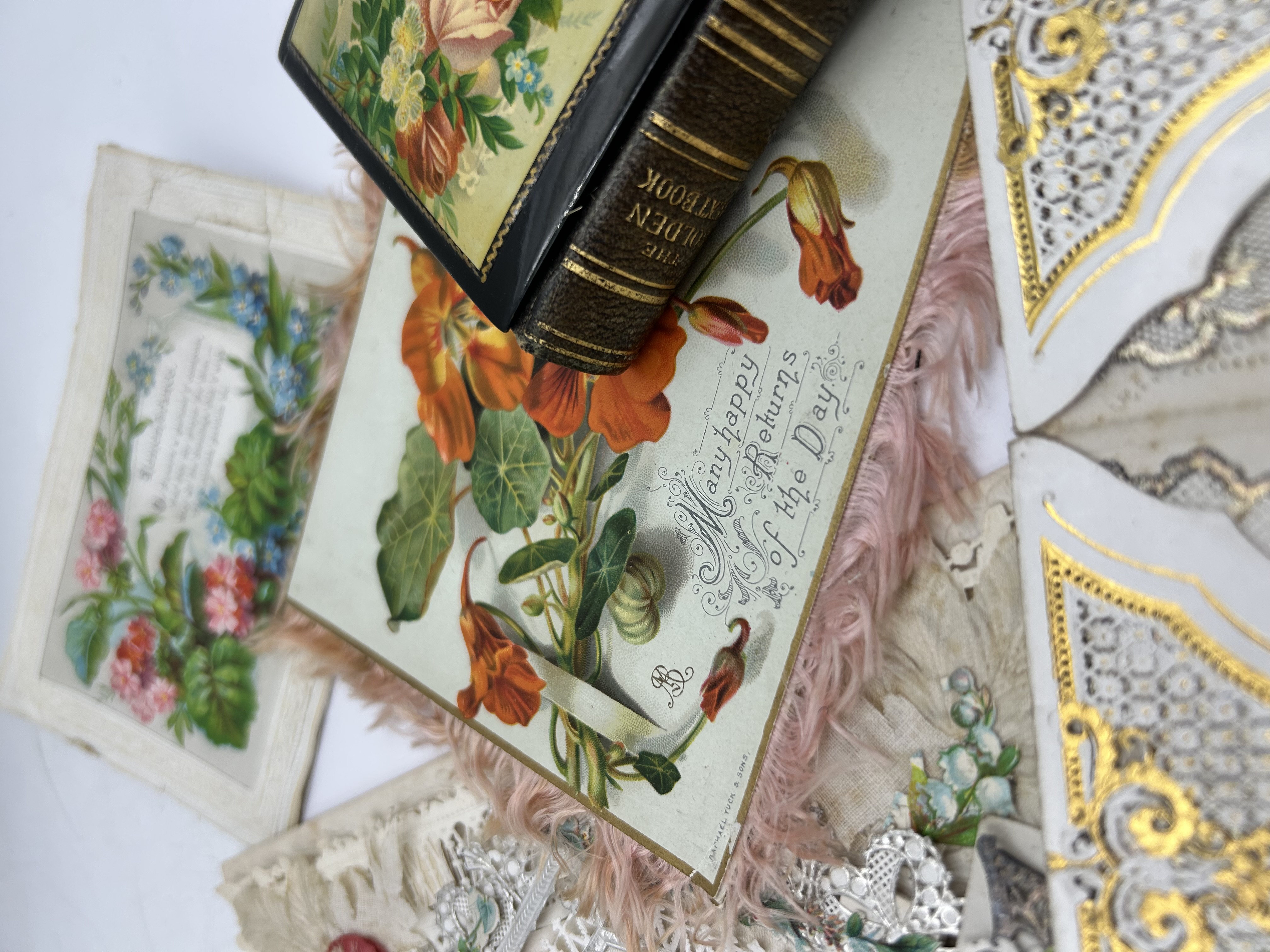 A collection of Victorian gold embossed and die-cut ephemera and a small devotional volume dating from the late 19th to early 20th century. The group includes several greeting cards and valentines featuring chromolithographed floral motifs and intricate paper lace. One birthday card is marked Raphael Tuck and Sons. The cards feature various themes including birthday greetings and remembrance, with decorations such as roses, nasturtiums, and lilies of the valley. Some cards utilize layered paper construction and pink silk fringe borders. The accompanying small volume is titled The Golden Text Book, bound in leather with gilt titles on the spine and a floral-decorated cover. The interior features daily biblical passages arranged by date.
