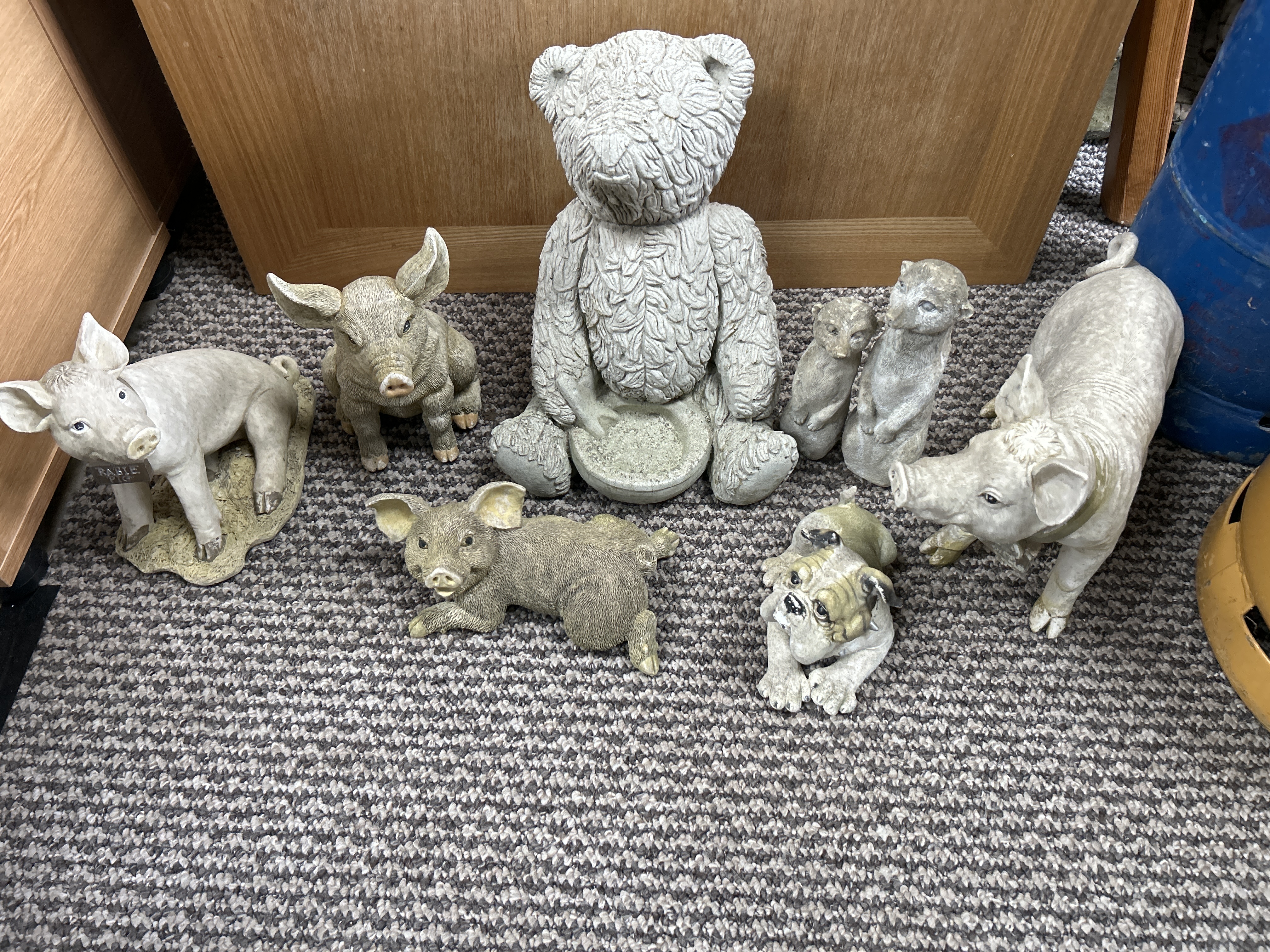 A collection of cast stone and composite garden ornaments featuring various animal figures. The group includes a large seated teddy bear identified as a Border Stoneware Big Ted model, featuring a textured fur-like finish and holding a shallow bowl. The collection also contains several pig figures in standing, sitting, and reclining poses, one of which includes an attached tag with the text RARE PIG. Additional figures include a reclining bulldog and meerkats. All items are fashioned from cast stone or a similar concrete composite with a weathered matte gray finish and molded textures.