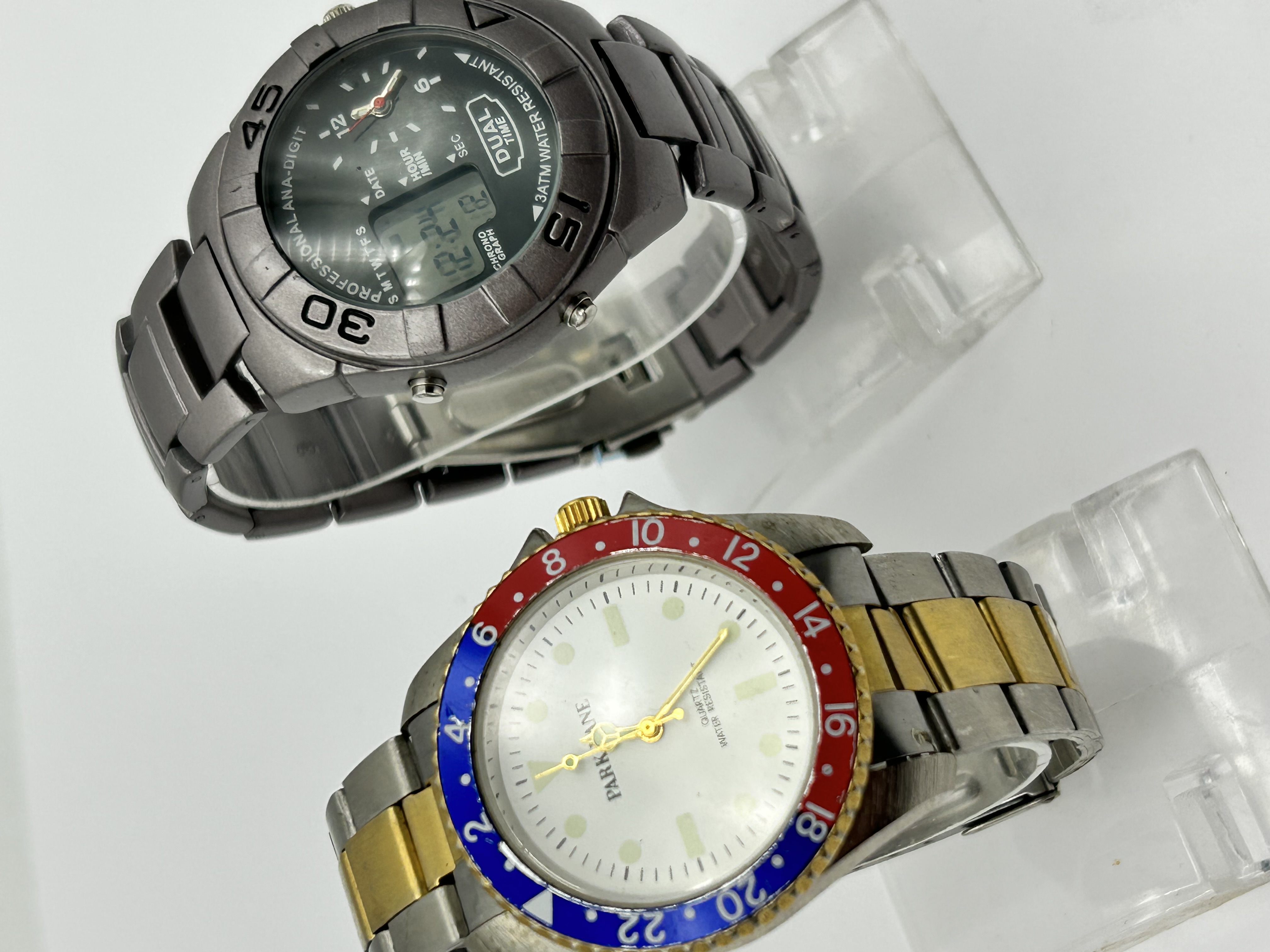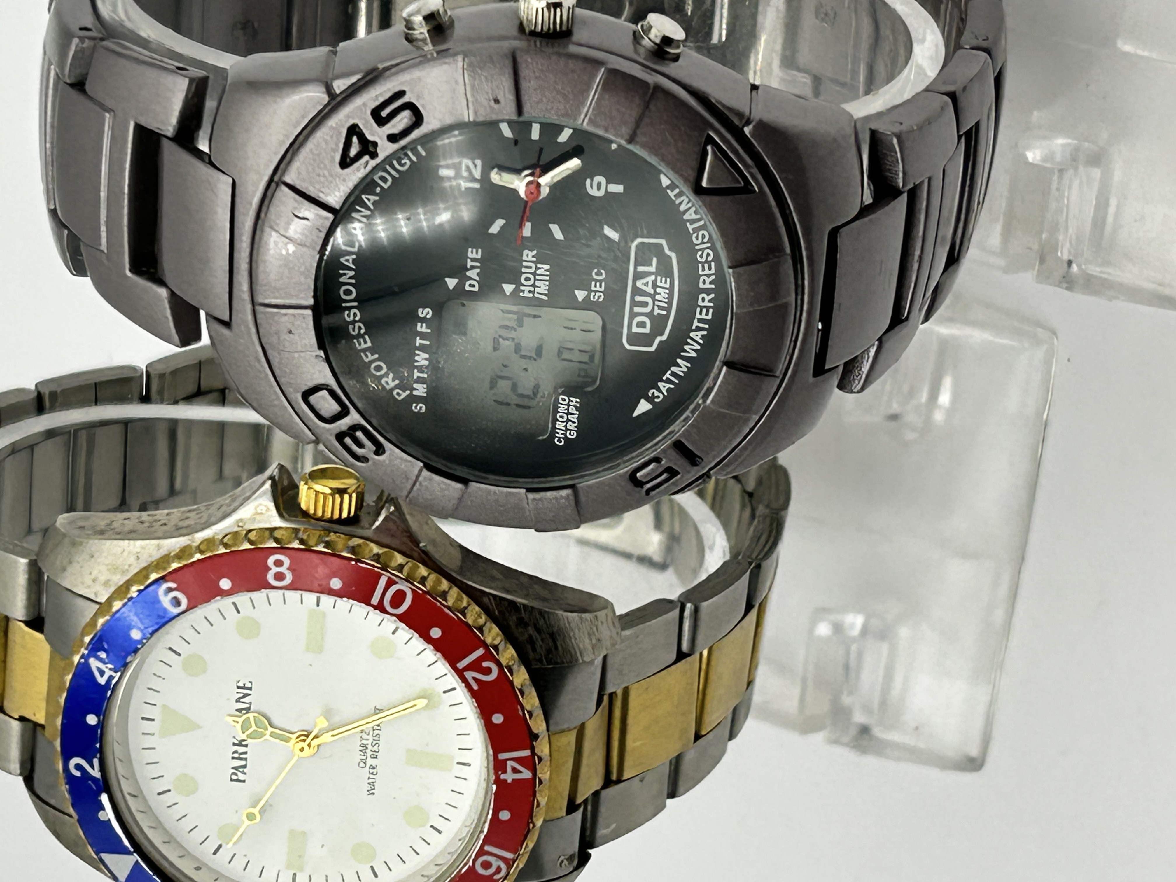 Two wristwatches comprising a Professional Ana-Digit Dual Time F408 and a Park Lane quartz timepiece. The Professional Ana-Digit model is constructed with a matte gunmetal-tone metal case and an integrated link bracelet. It features a dark dial with combined analog and digital readouts, marked Professional Ana-Digit, Dual Time, and 3ATM Water Resistant. The second timepiece is a Park Lane quartz wristwatch with a two-tone silver and gold-tone case and bracelet. It features a white dial with luminous geometric markers and a red and blue Pepsi style bezel with a 24-hour scale.