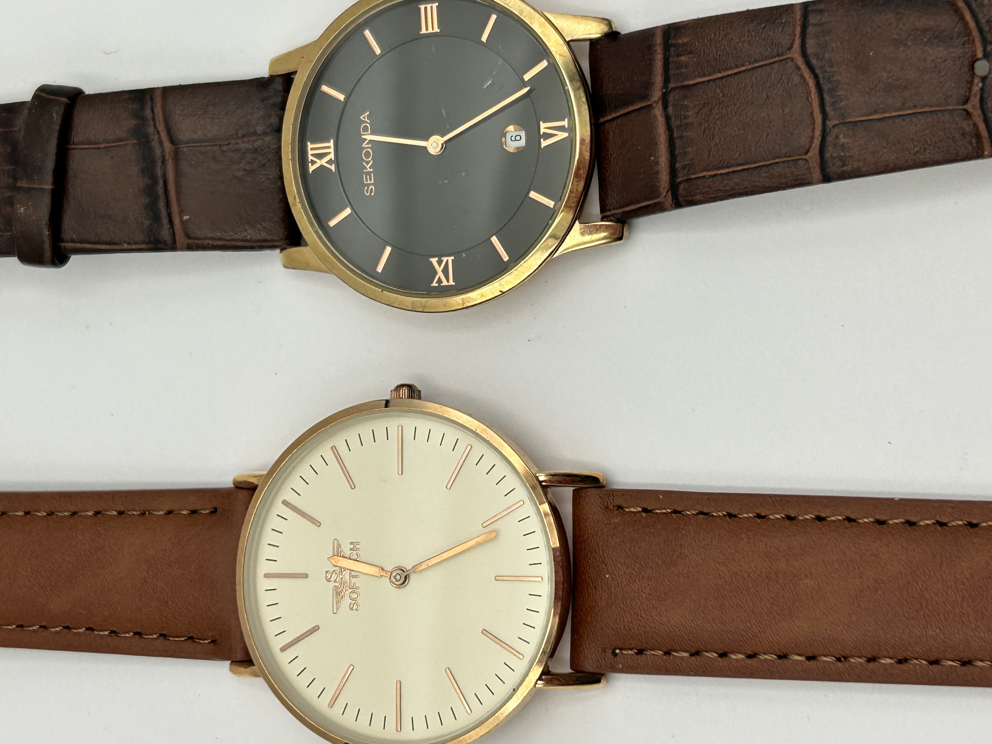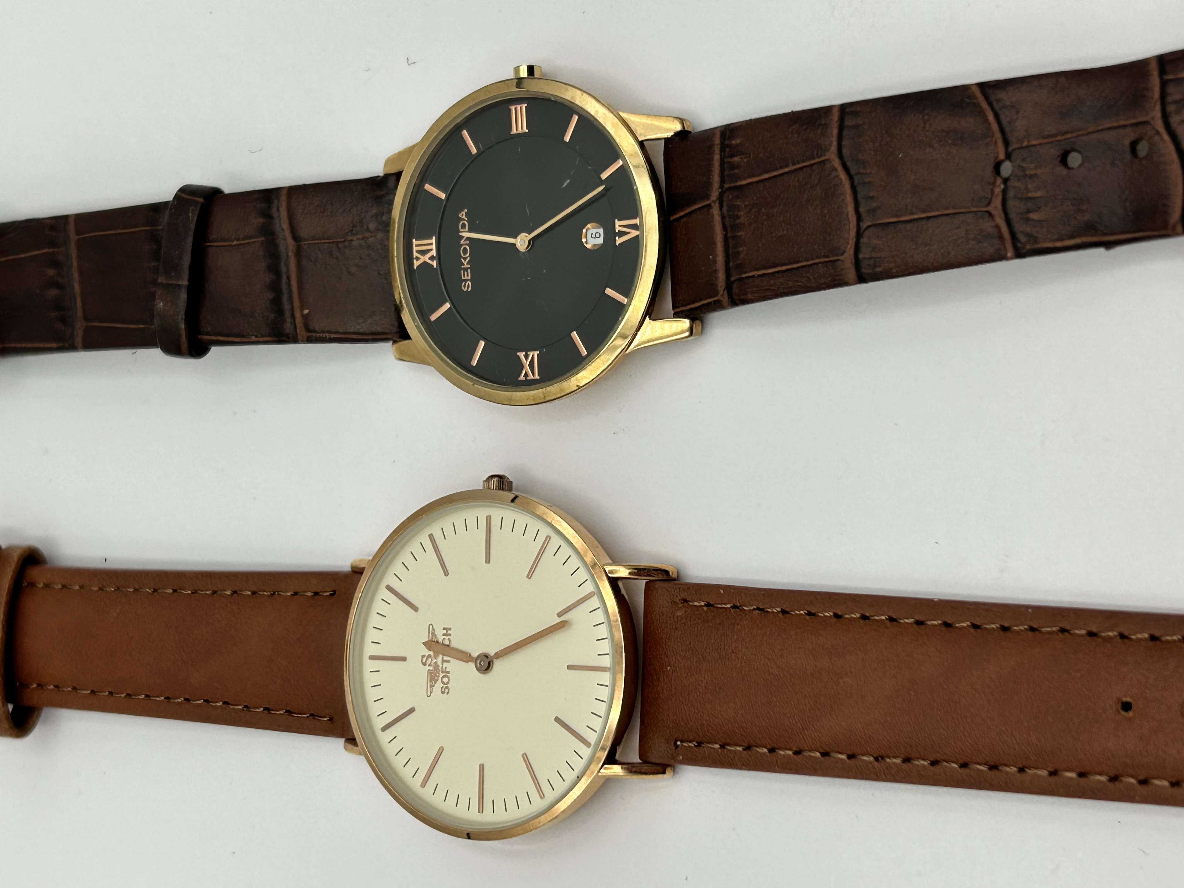 Two contemporary men’s wristwatches. The first is a Sekonda model 3207 featuring a gold-toned case and a black dial. The dial is set with rose gold-toned Roman numeral indices at the twelve, three, six, and nine o’clock positions, with baton indices for the remaining hours. It includes a date aperture at the six o’clock position and is fitted with a dark brown crocodile-embossed leather strap. The second timepiece is a Soft Touch wristwatch with a gold-toned case and a cream-colored dial. The dial features rose gold-toned baton indices and a winged logo below the twelve o’clock position. This watch is mounted on a light brown leather strap with contrast stitching. Both watches utilize quartz movements.