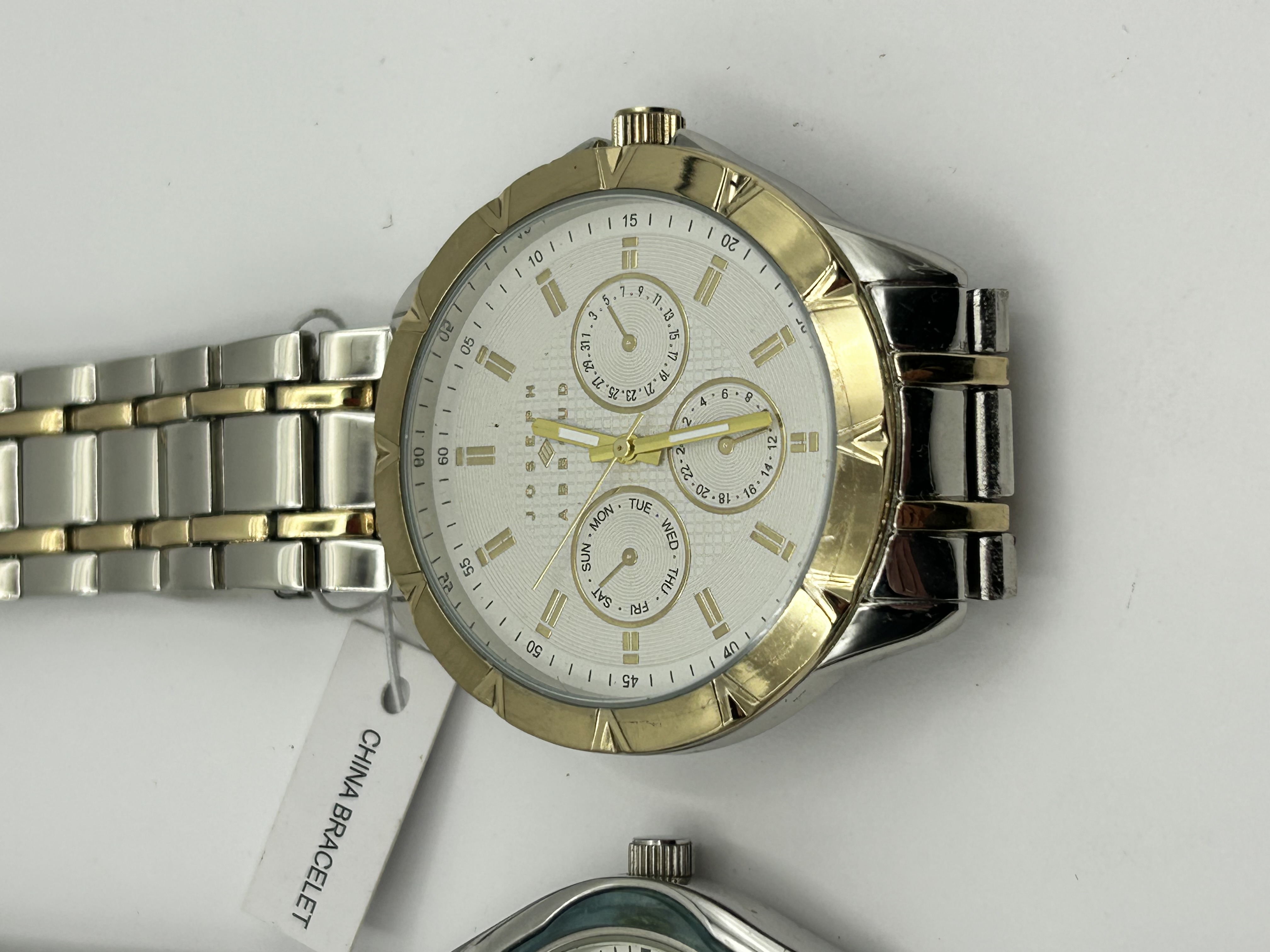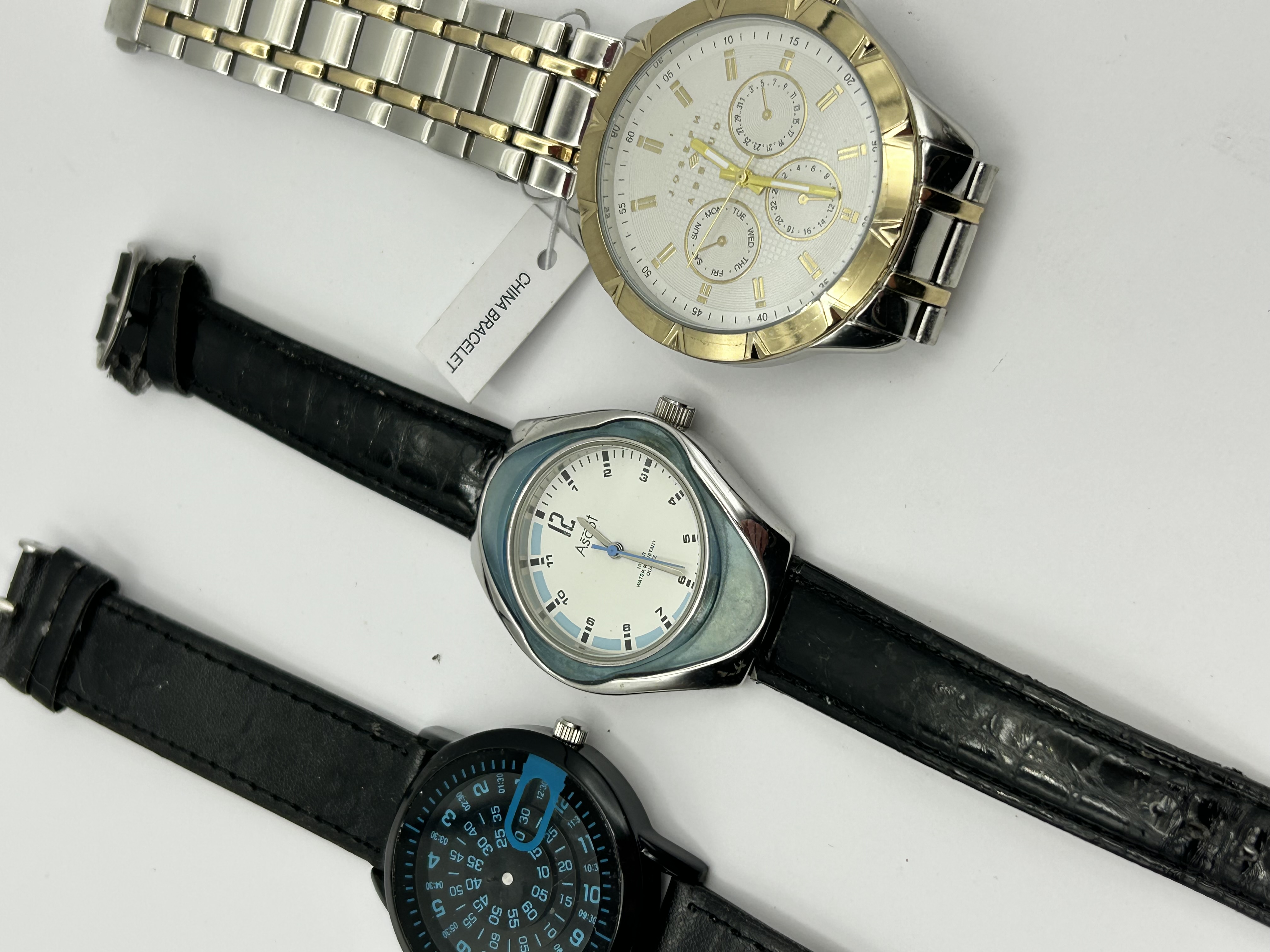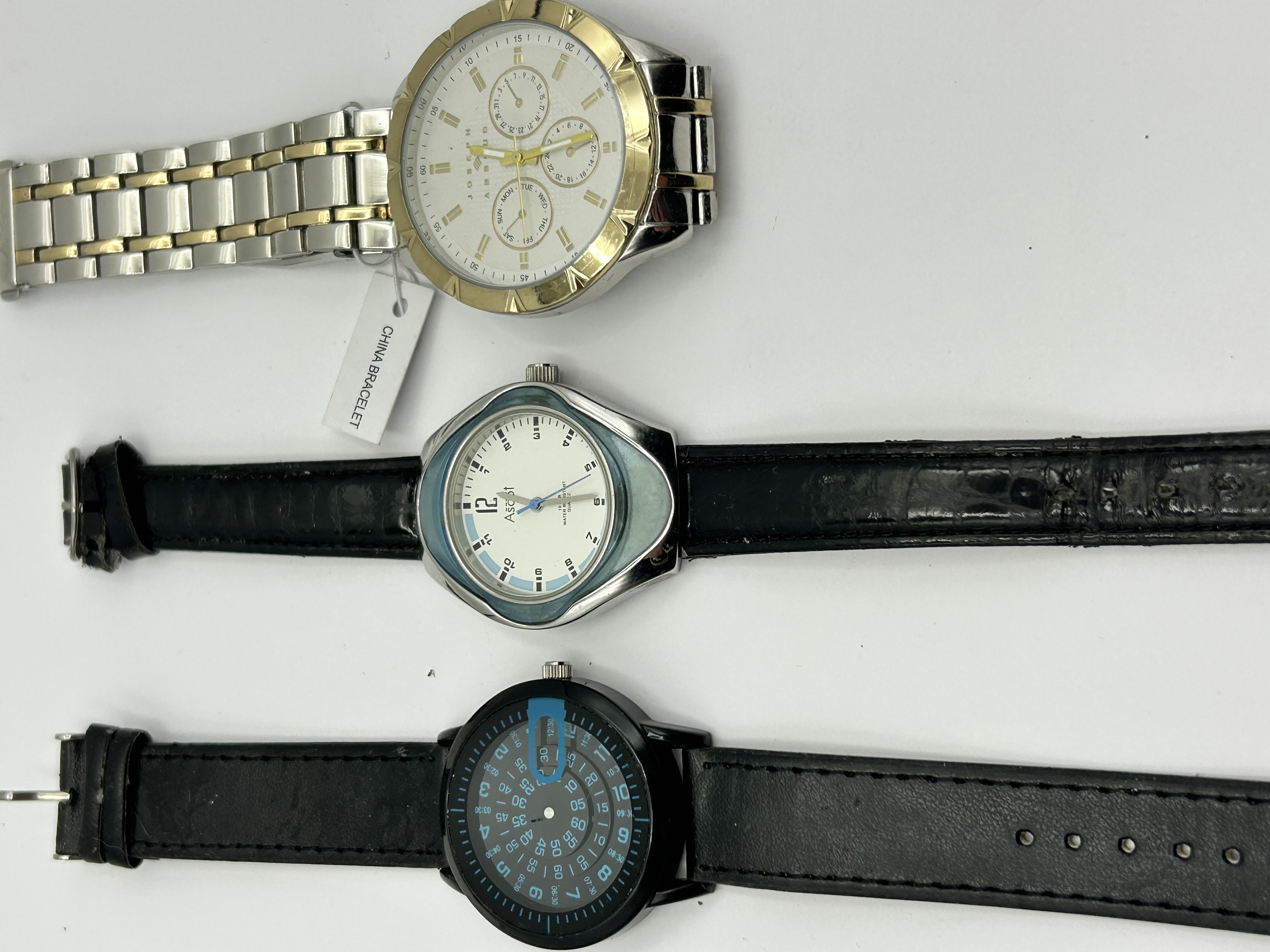A trio of contemporary men’s wristwatches. The first is a Joseph Abboud multi-function watch featuring a two-tone silver and gold-tone metal link bracelet with an attached tag marked China Bracelet. The watch has a white textured dial with three sub-dials for day, date, and 24-hour time, gold-tone hour markers, and a notched gold-tone bezel. The second is an Ascot wristwatch featuring a silver-tone case with a light blue bezel and a white dial with blue accents and Arabic numerals. It is fitted with a black embossed leather-look strap. The third is a black-tone fashion watch with a black leather strap and a dial featuring concentric rings of blue numerals and a central blue highlight.