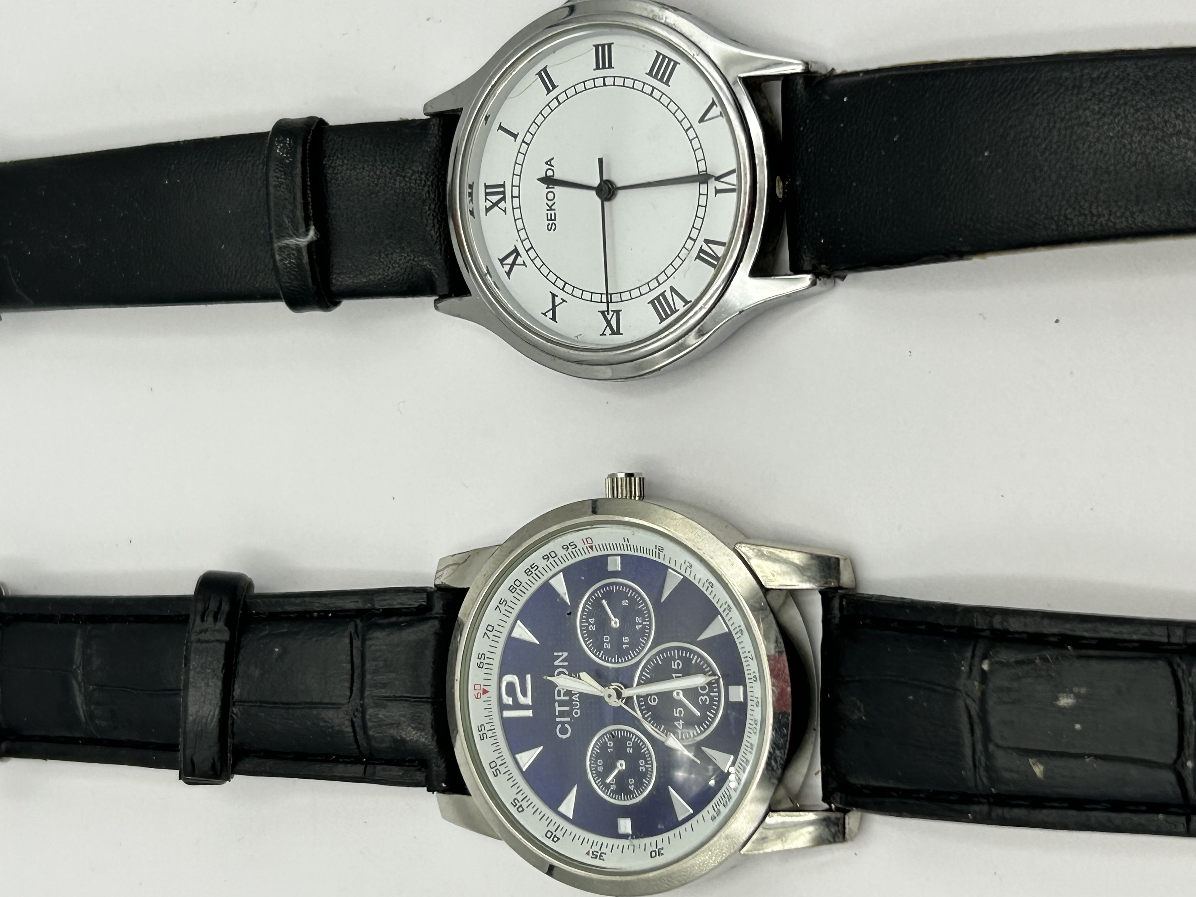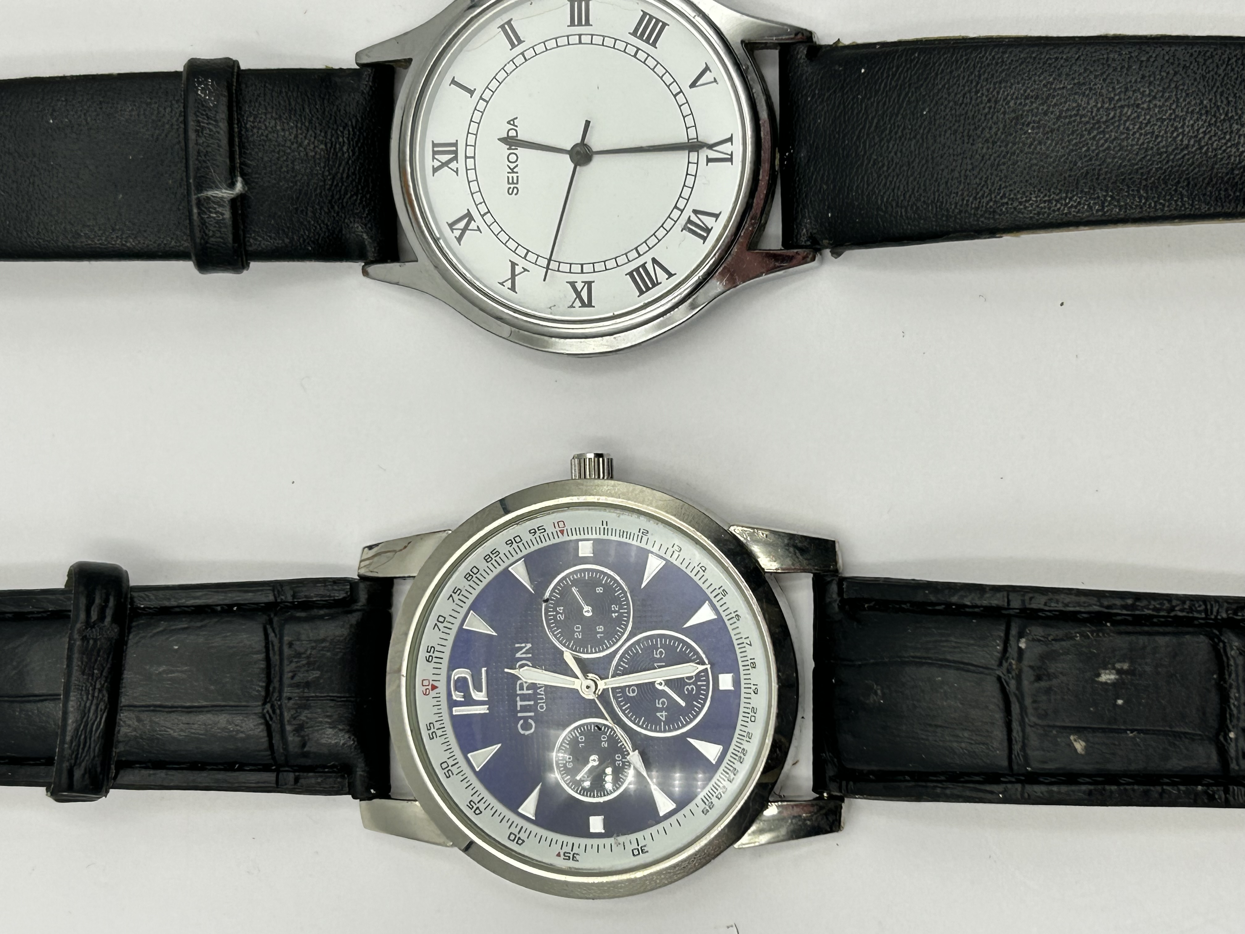 A pair of men’s wristwatches. The first is a Sekonda dress watch featuring a white dial with black Roman numeral indices and a silver-toned metal case, fitted to a smooth black strap. The second is a Citron quartz wristwatch featuring a blue dial with three sub-dials, a tachymeter scale, and a silver-toned metal case, fitted to an embossed black leather-style strap. Both watches feature analog displays and silver-toned hardware.