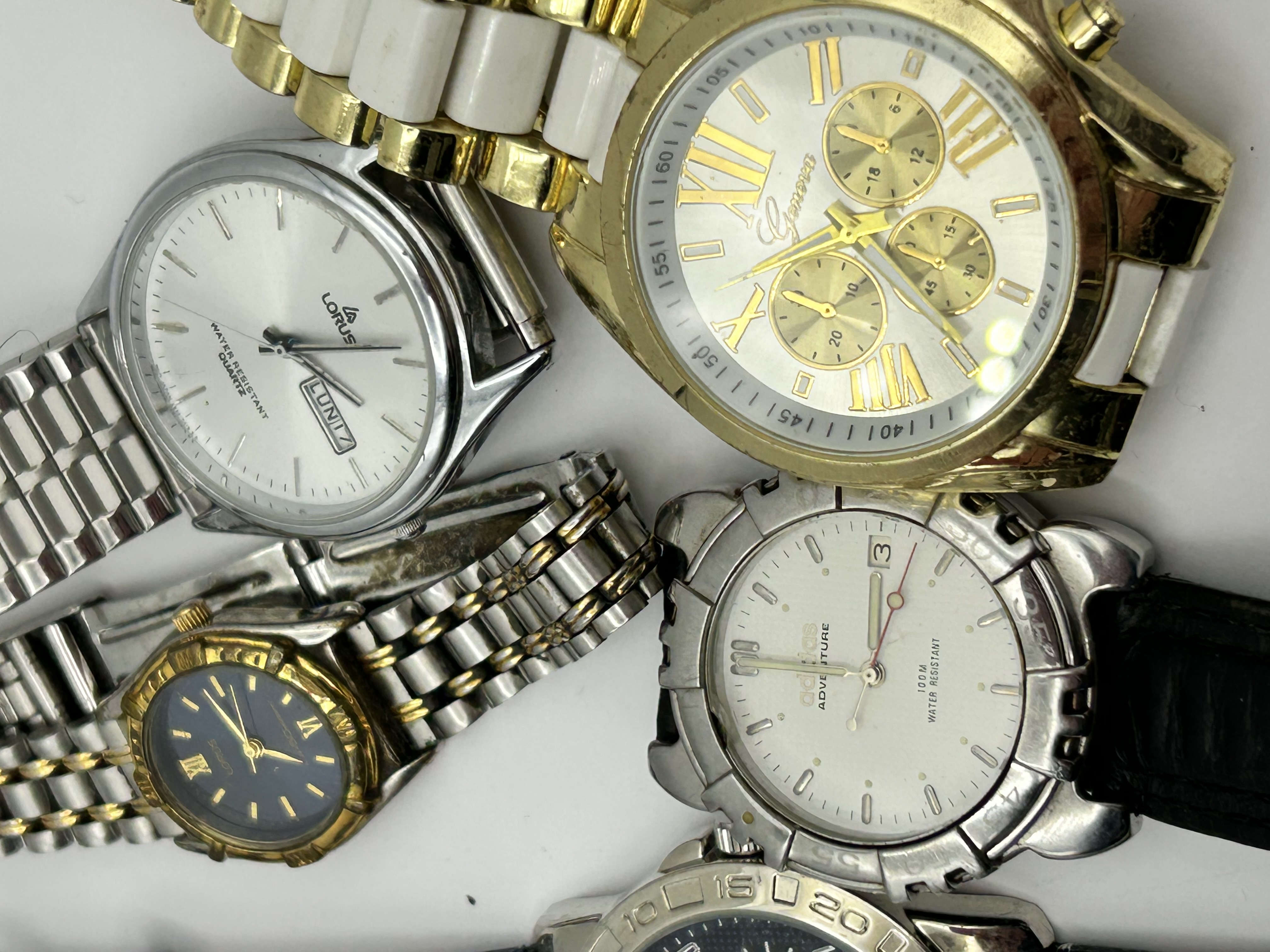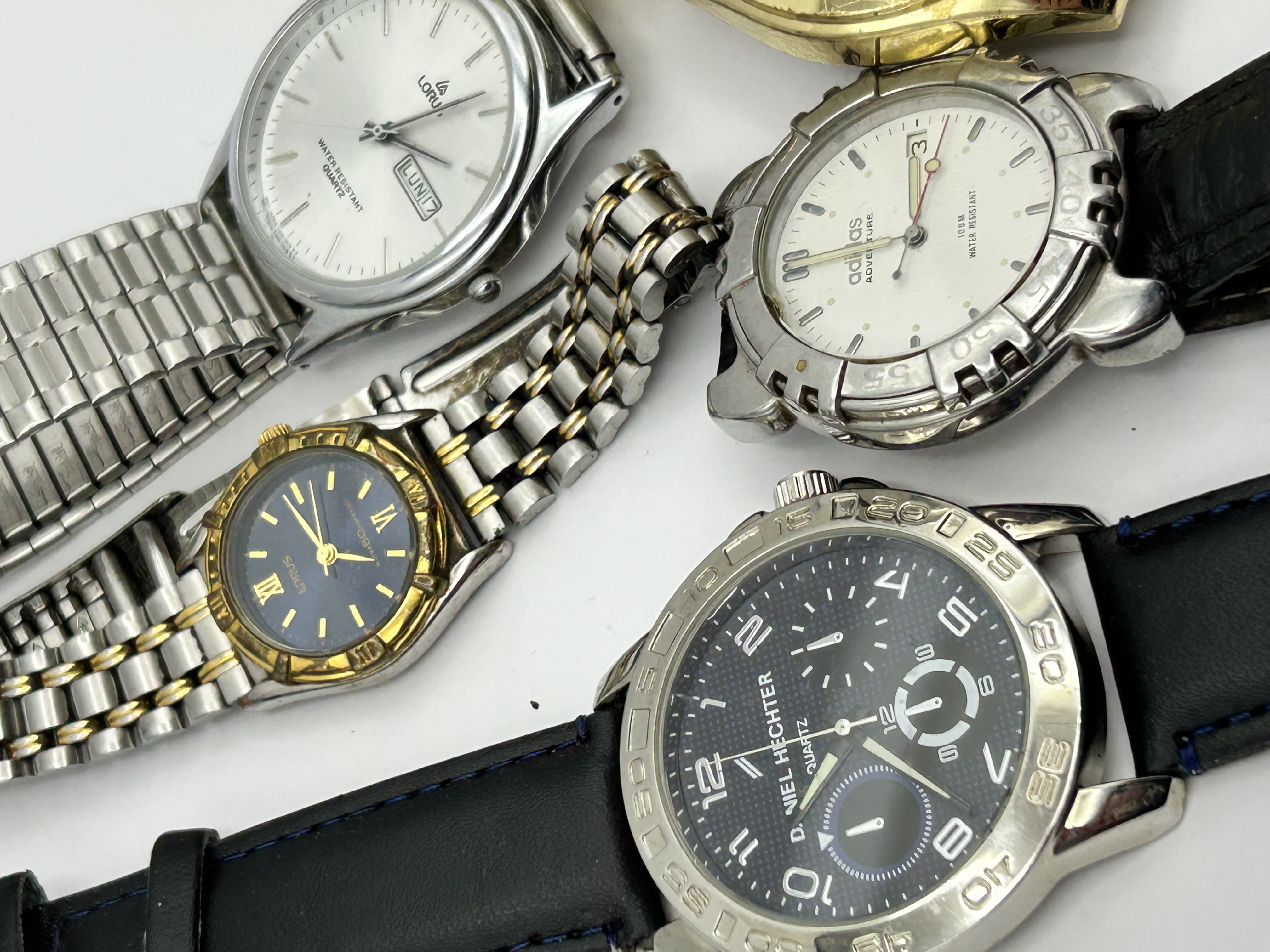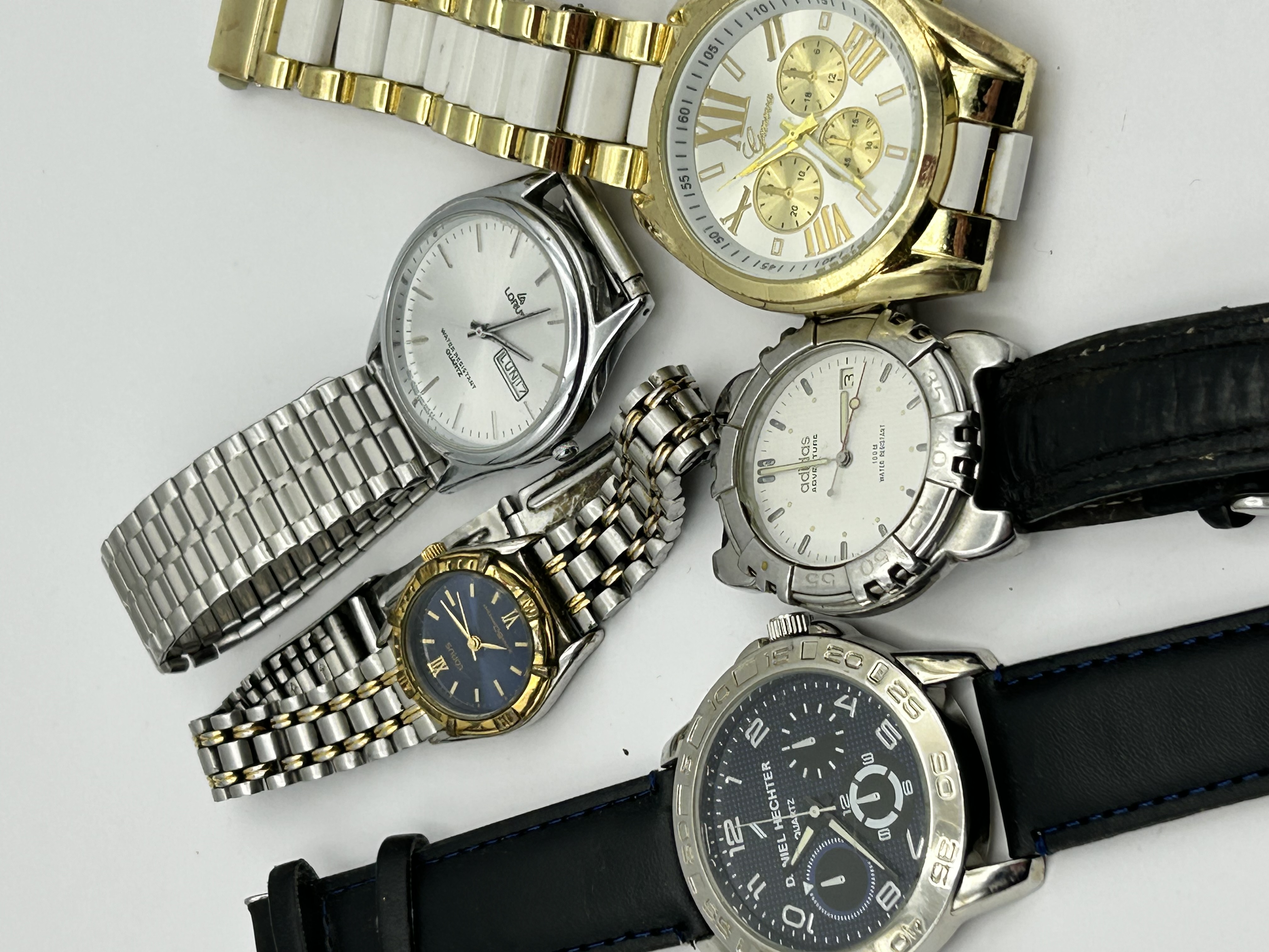 A collection of contemporary wristwatches featuring various brands and styles. The group includes a large gold-tone Geneva chronograph-style watch with white ceramic-style link accents and Roman numeral indices. Also included is a silver-tone Lorus wristwatch with a day-date aperture at the three o’clock position, a smaller two-tone Lorus with a navy blue dial and Roman numerals, and an Adidas Adventure watch with a white dial and black leather strap. Completing the collection is a Daniel Hechter quartz wristwatch featuring a textured black dial and a black leather strap with blue contrast stitching. The watches are constructed from stainless steel, base metals, and leather.