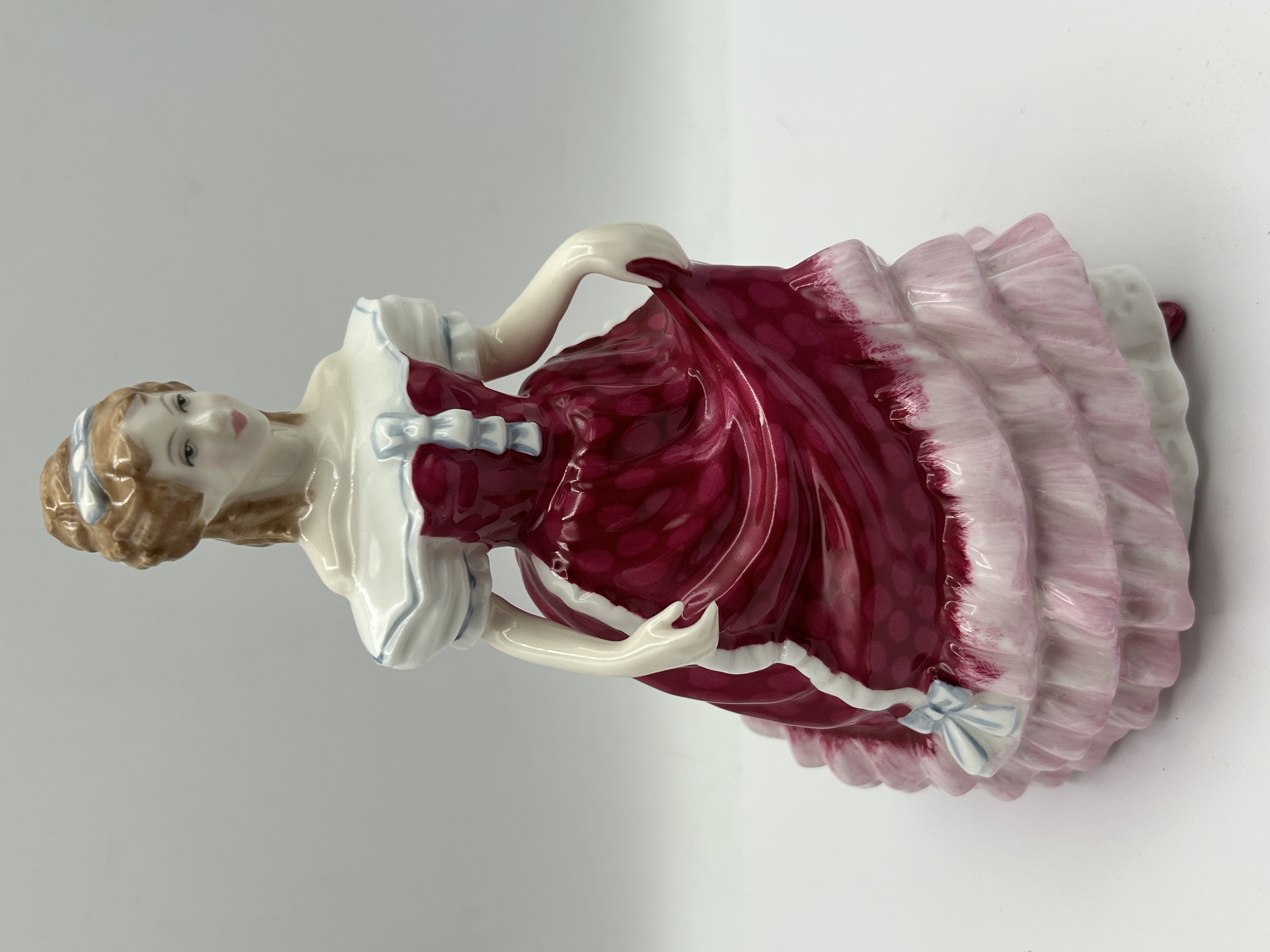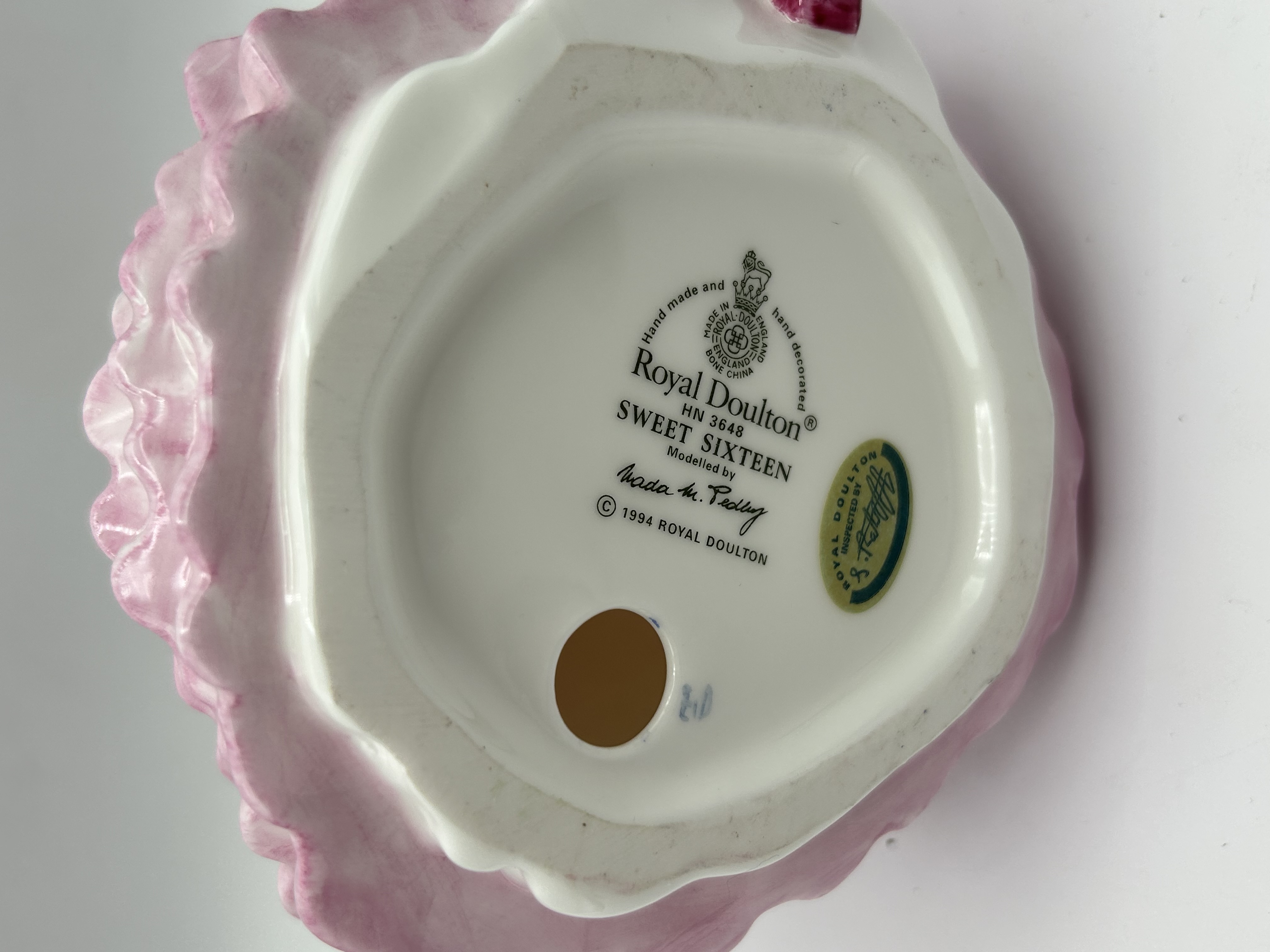 A Royal Doulton English bone china figurine titled Sweet Sixteen, model number HN 3648. The figure depicts a young woman wearing an elaborate tiered gown consisting of a dark pink patterned bodice and overskirt over a tiered pale pink and white skirt. The figure features blue ribbon details on the shoulders and in her brown hair. Modeled by Nada M. Pedley. The underside is marked with the Royal Doulton factory stamp, the title, model number, designer name, and a copyright date of 1994. The base also retains an original green inspection sticker.