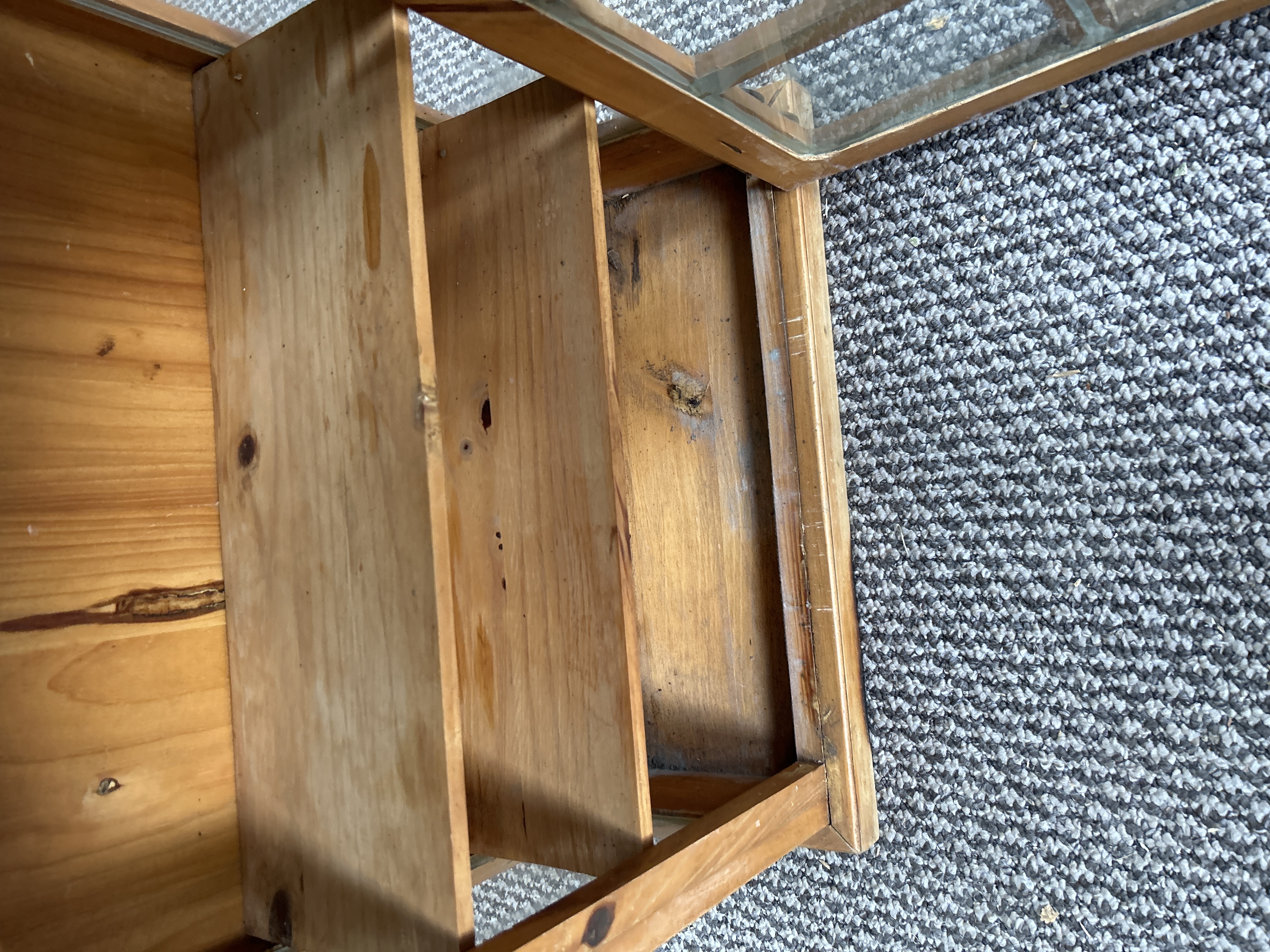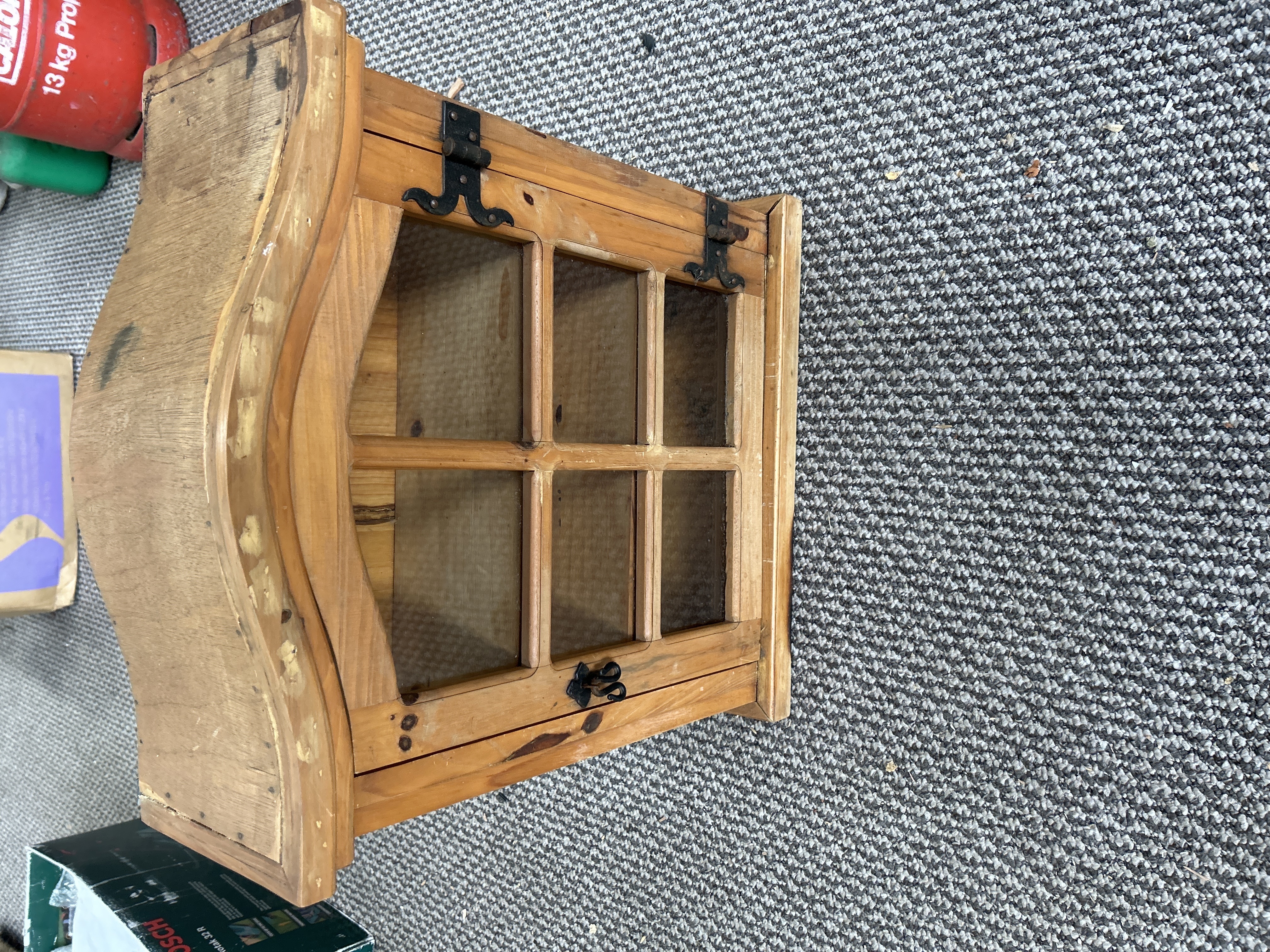 A small wall-mounted display cabinet constructed from pine with a rustic finish. The piece features a single door inset with a six-pane glazed window. The cabinet is topped with a decorative shaped pediment. Hardware includes two black-finished scrolled metal hinges and a matching metal twist latch. The interior is fitted with two fixed wooden shelves. The wood displays visible grain and natural knots throughout.