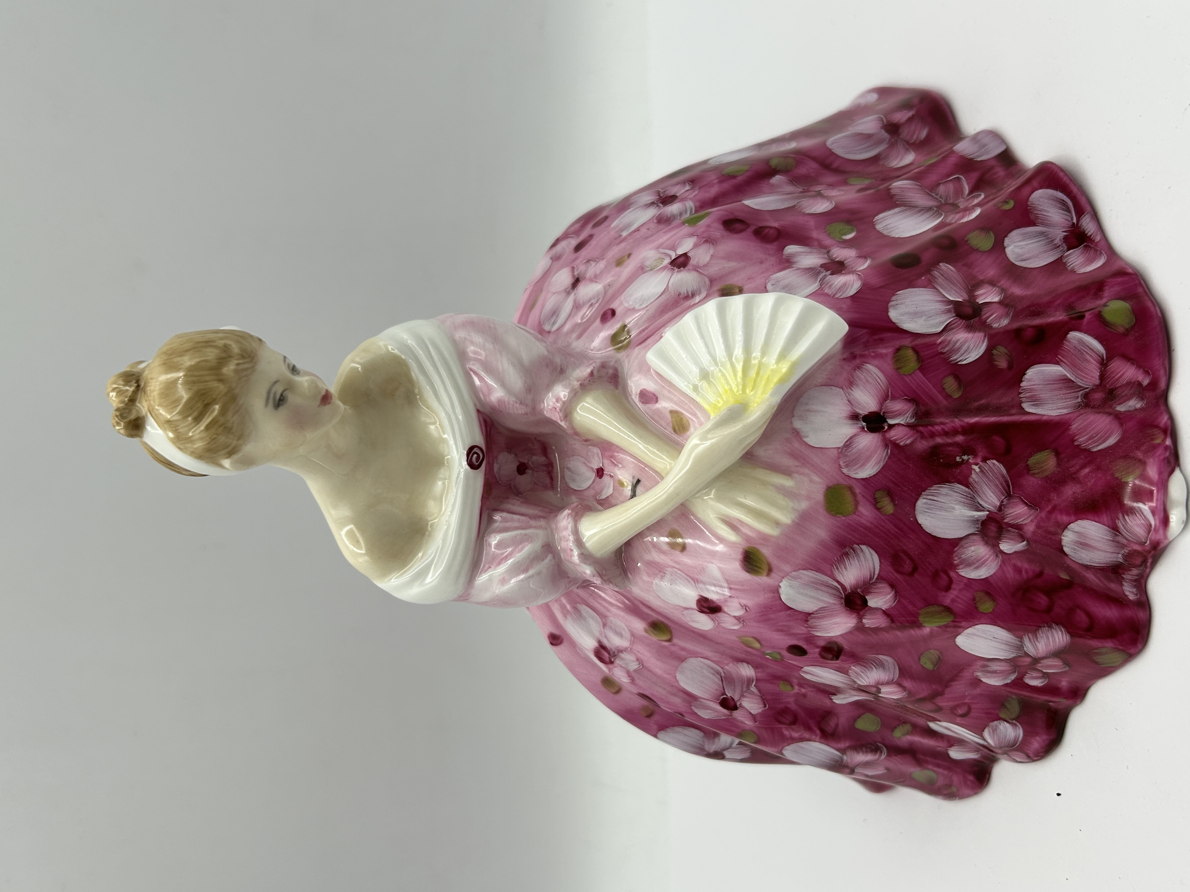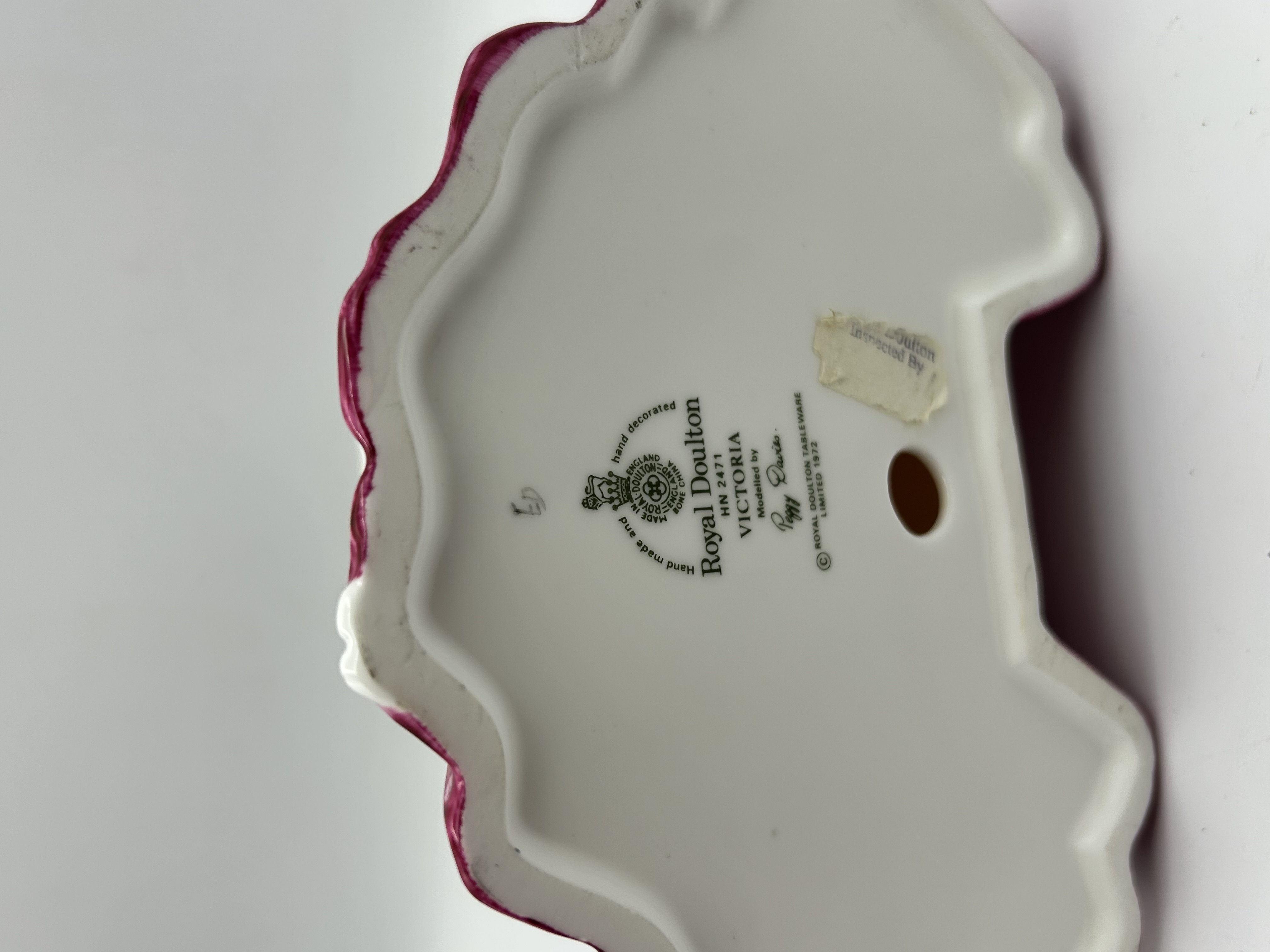 A Royal Doulton hand-painted bone china figurine titled Victoria, model HN 2471. This piece was modeled by Peggy Davies and is dated 1972. The figure depicts a seated woman with blonde hair in an updo, wearing a pink bodice with a wide white collar and a voluminous magenta skirt decorated with an all-over white floral and green bud pattern. She is shown holding an open white fan with yellow highlights. The underside of the piece bears the official Royal Doulton backstamp, including the model name, number, designer name, and copyright date. It also features hand-painted initials ED and a partial paper inspection sticker.