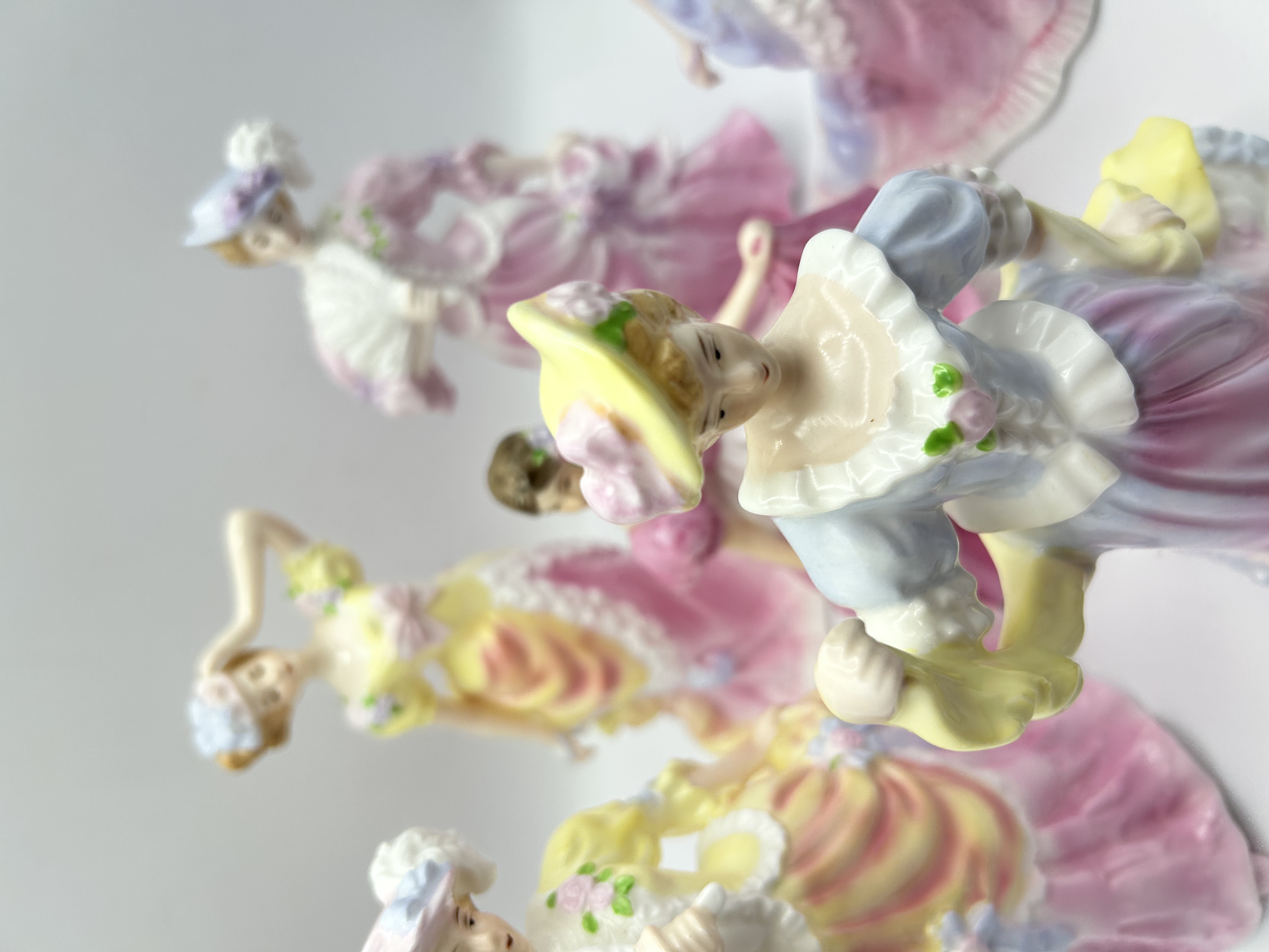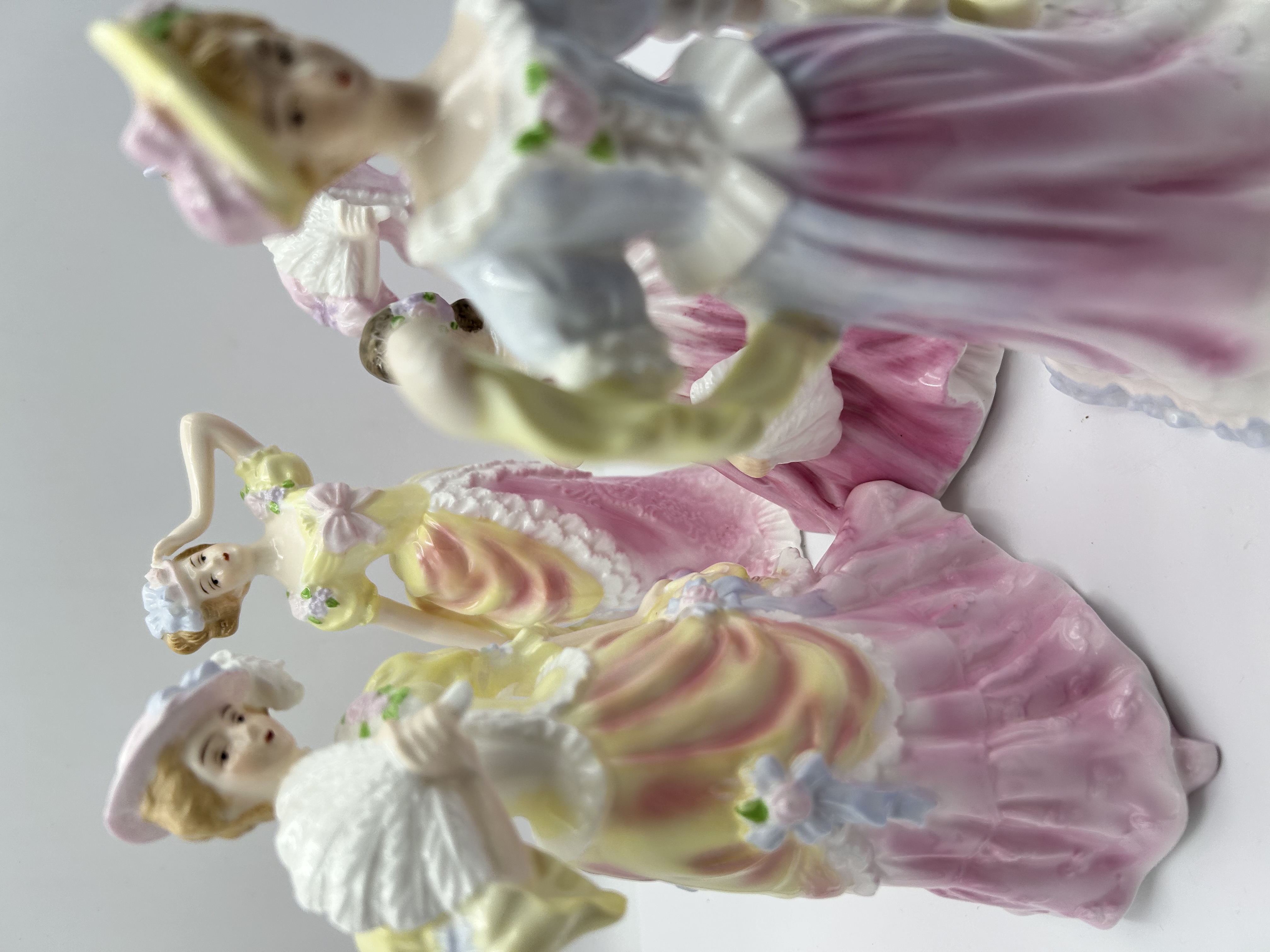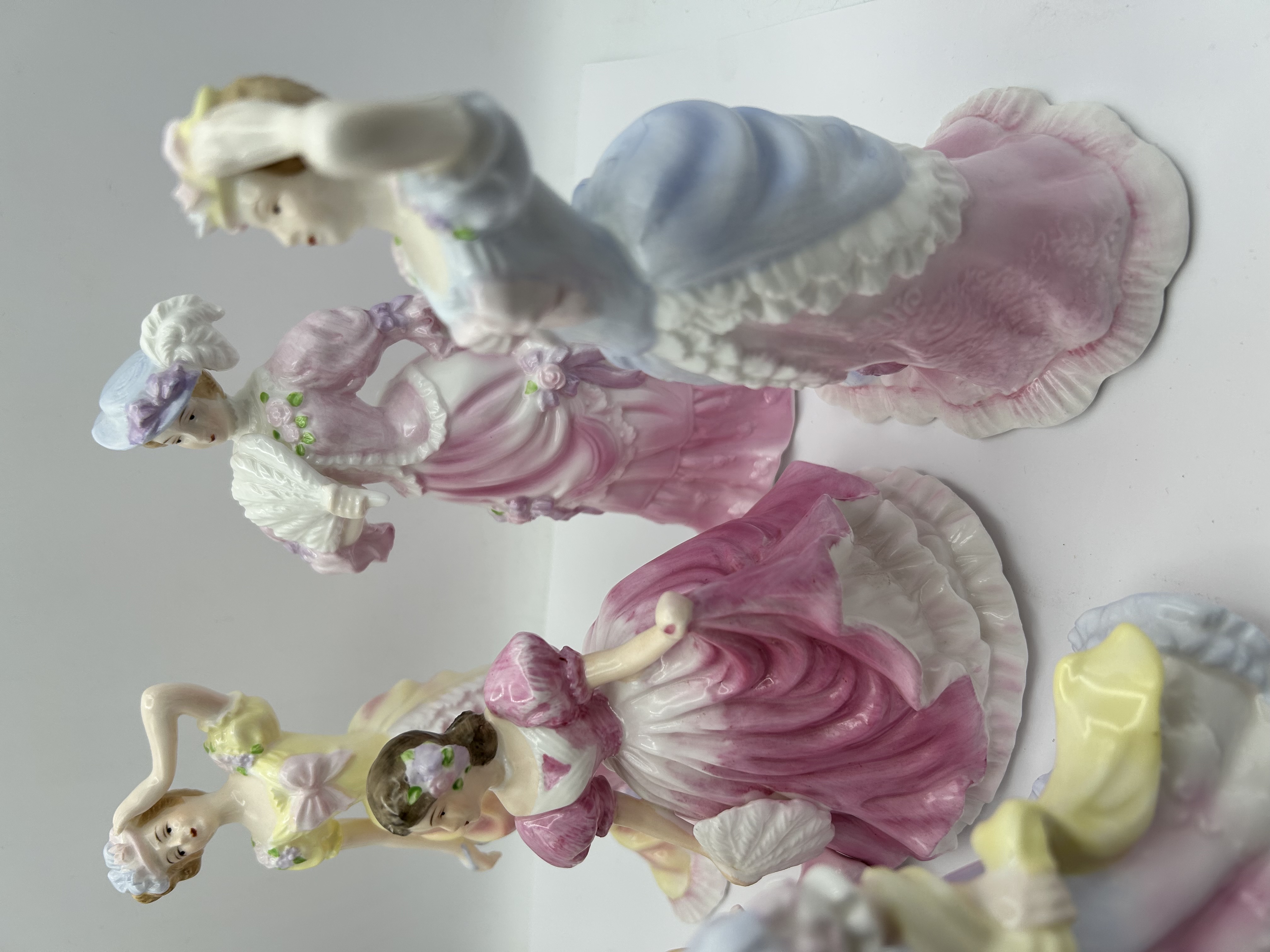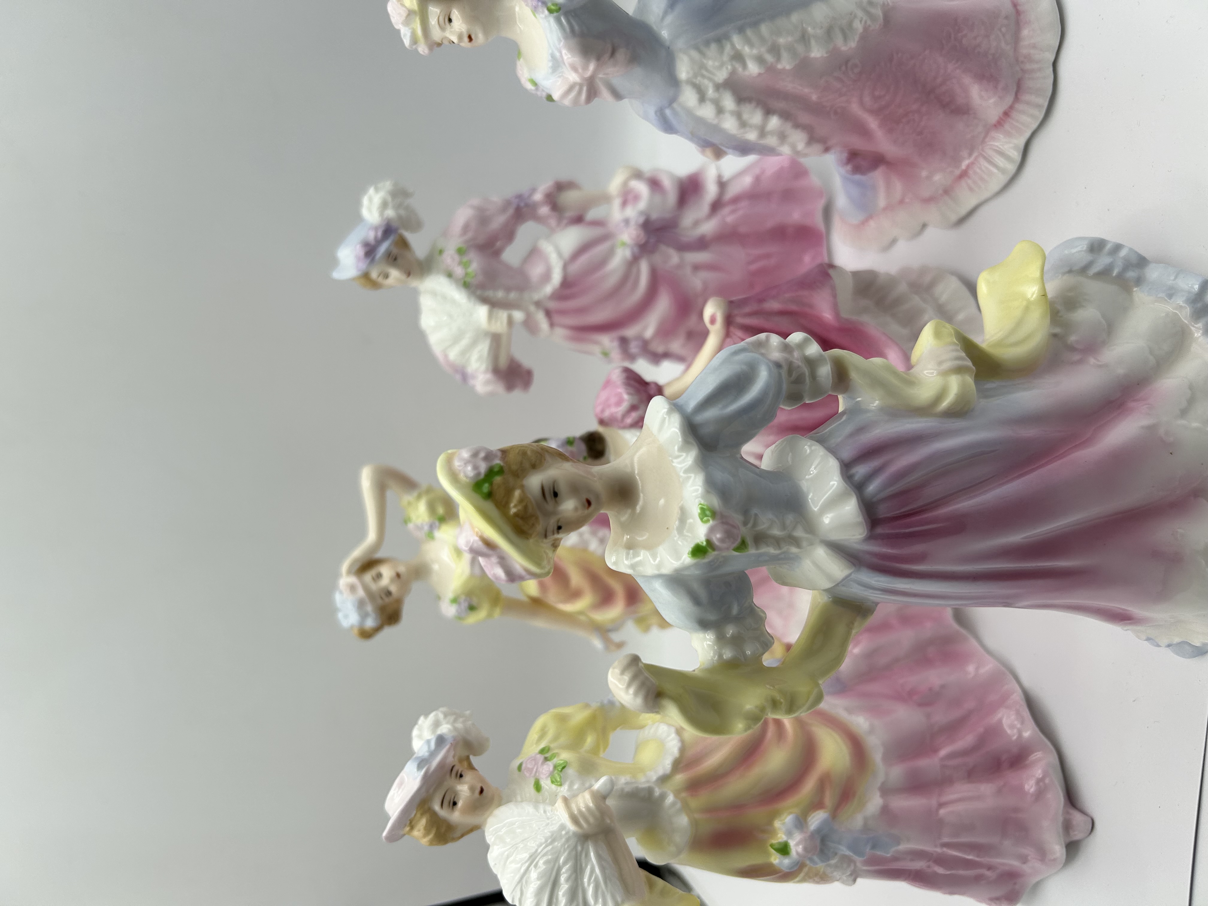 A collection of Royal Doulton bone china figurines. Each figure is made of glazed porcelain and features hand-painted details in a pastel color palette of pink, yellow, blue, and lavender. The figures are depicted in Victorian-style attire with floral accents on the gowns and hats. The collection includes figures in various poses, some of which feature accessories such as fans.