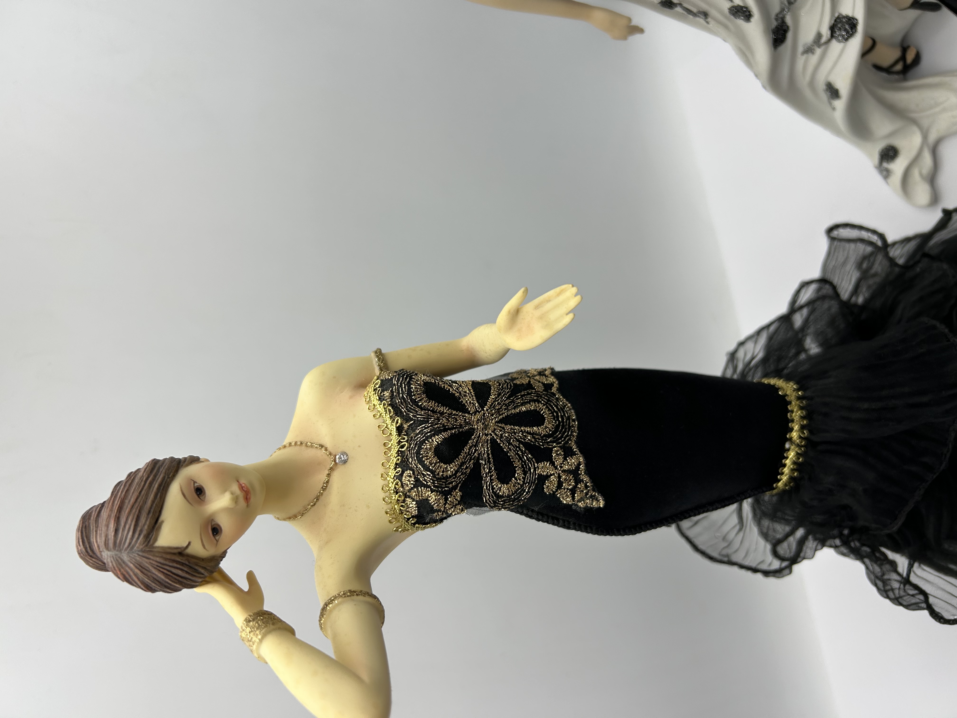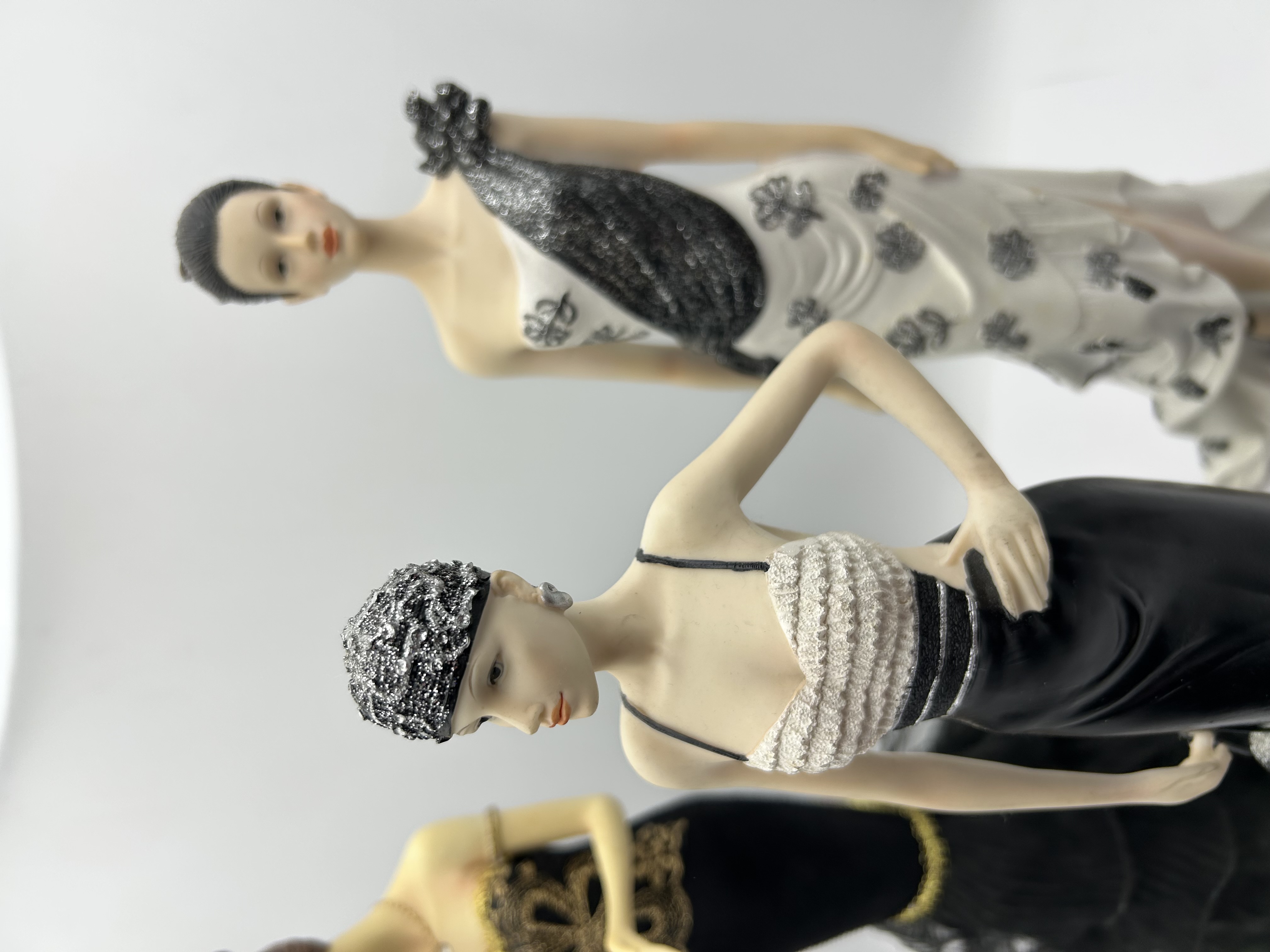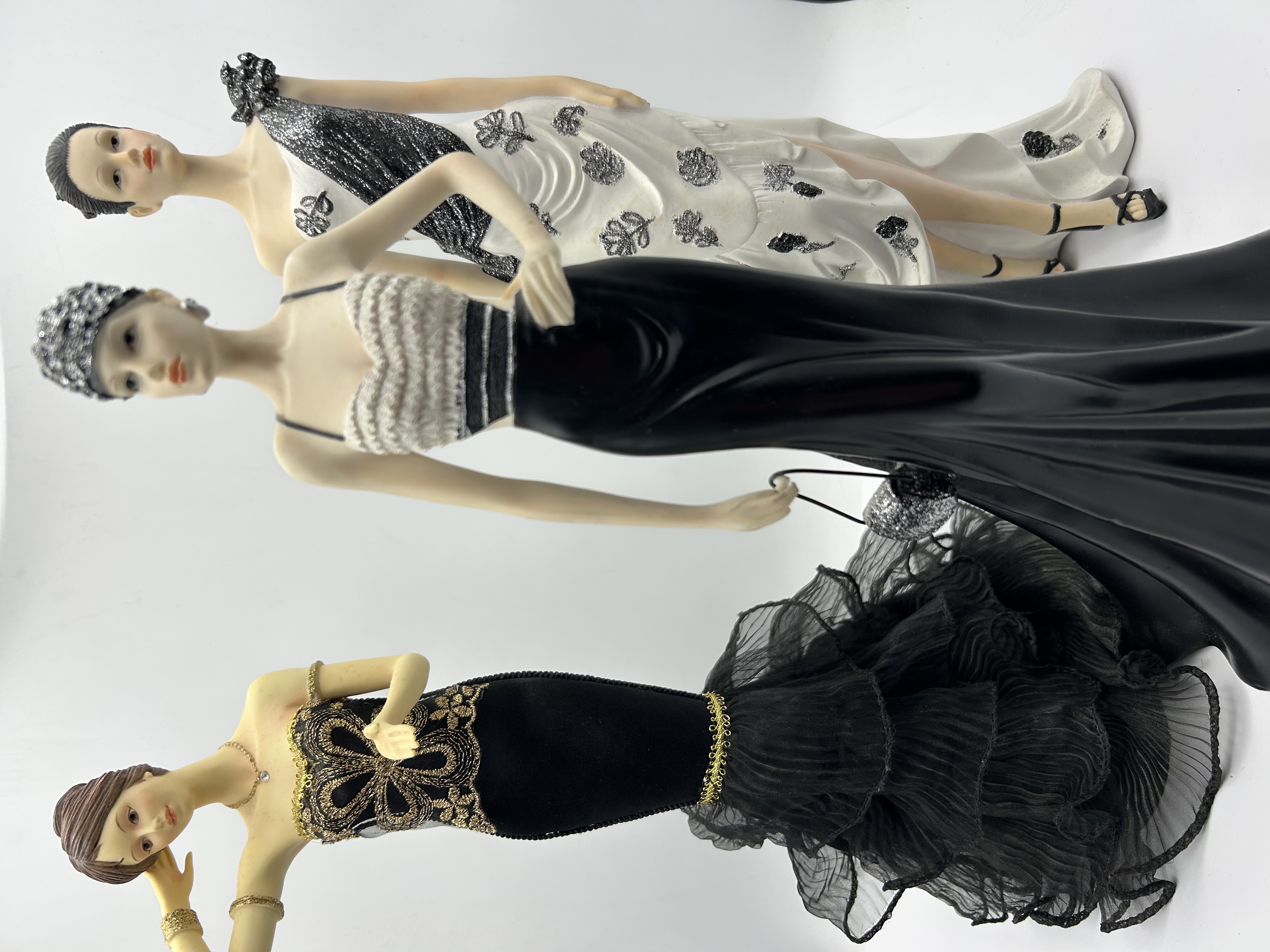 A trio of fashion-themed figurines from The Leonardo Collection. Each figure is rendered in a contemporary style with Art Deco influences, constructed from painted resin or a similar composite material. The group includes one figure in a white gown with shimmering black floral accents, a second in a sleek black gown with a textured white bodice and matching silver-toned headpiece, and a third in a black gown embellished with gold-toned embroidery and a layered black mesh skirt. The figures feature molded hairstyles, delicate facial painting, and miniature jewelry accessories.
