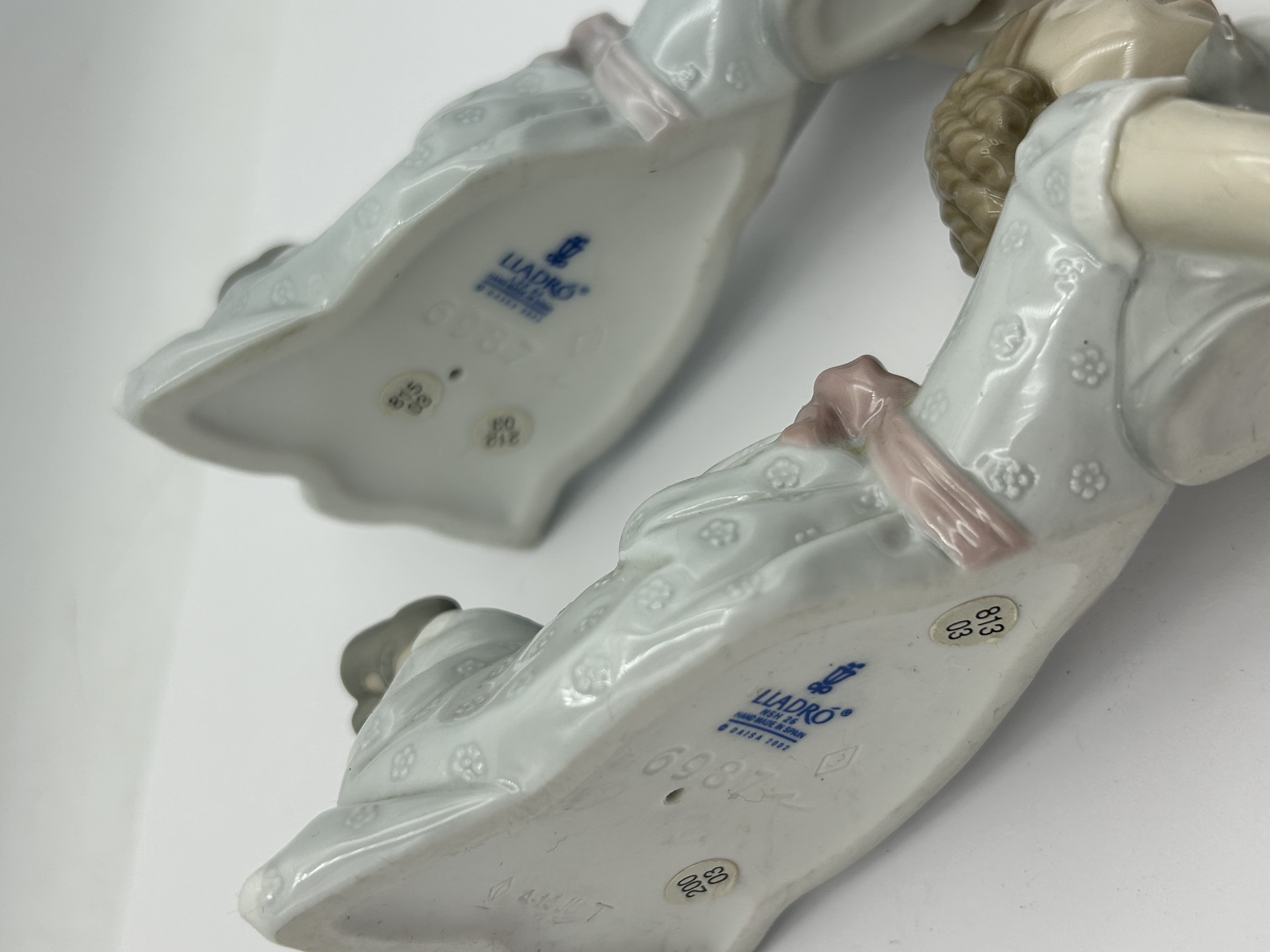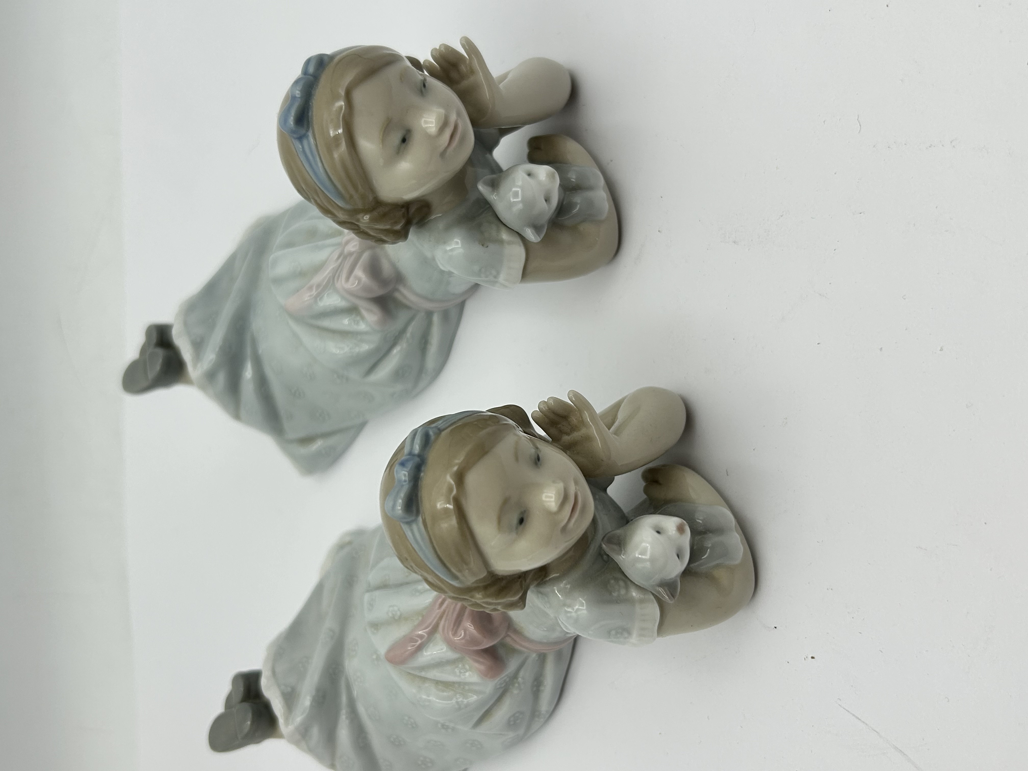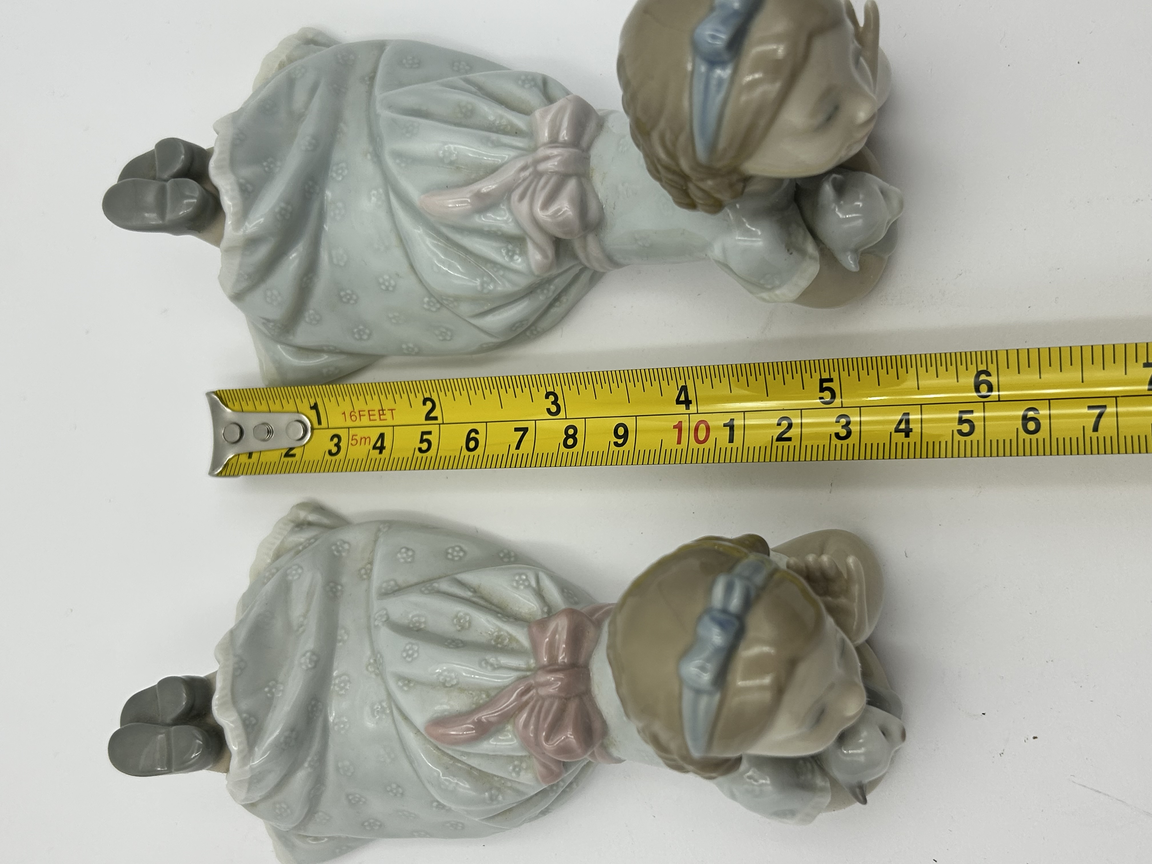 A pair of Lladro glazed porcelain figurines, model number 6987, titled How Sweet!. Each sculpture depicts a young girl lying on her stomach and cradling a white cat. The figures are decorated in a traditional soft pastel palette, featuring the girl in a light blue floral-patterned dress with a pink sash, a blue headband, and gray shoes. The underside of each piece displays the blue Lladro backstamp, which includes HAND MADE IN SPAIN and © DAISA 2002, along with an impressed 6987 model number.
