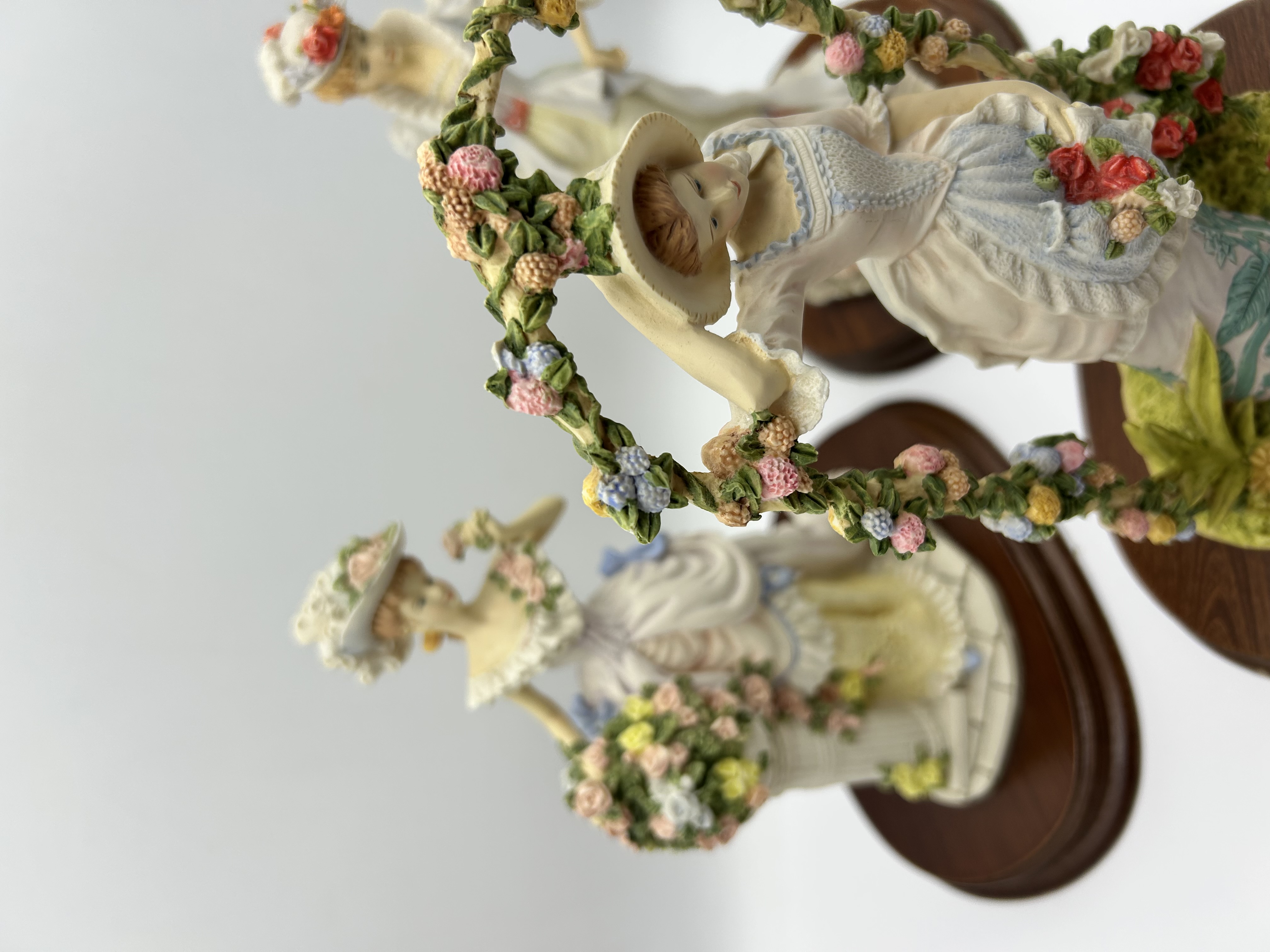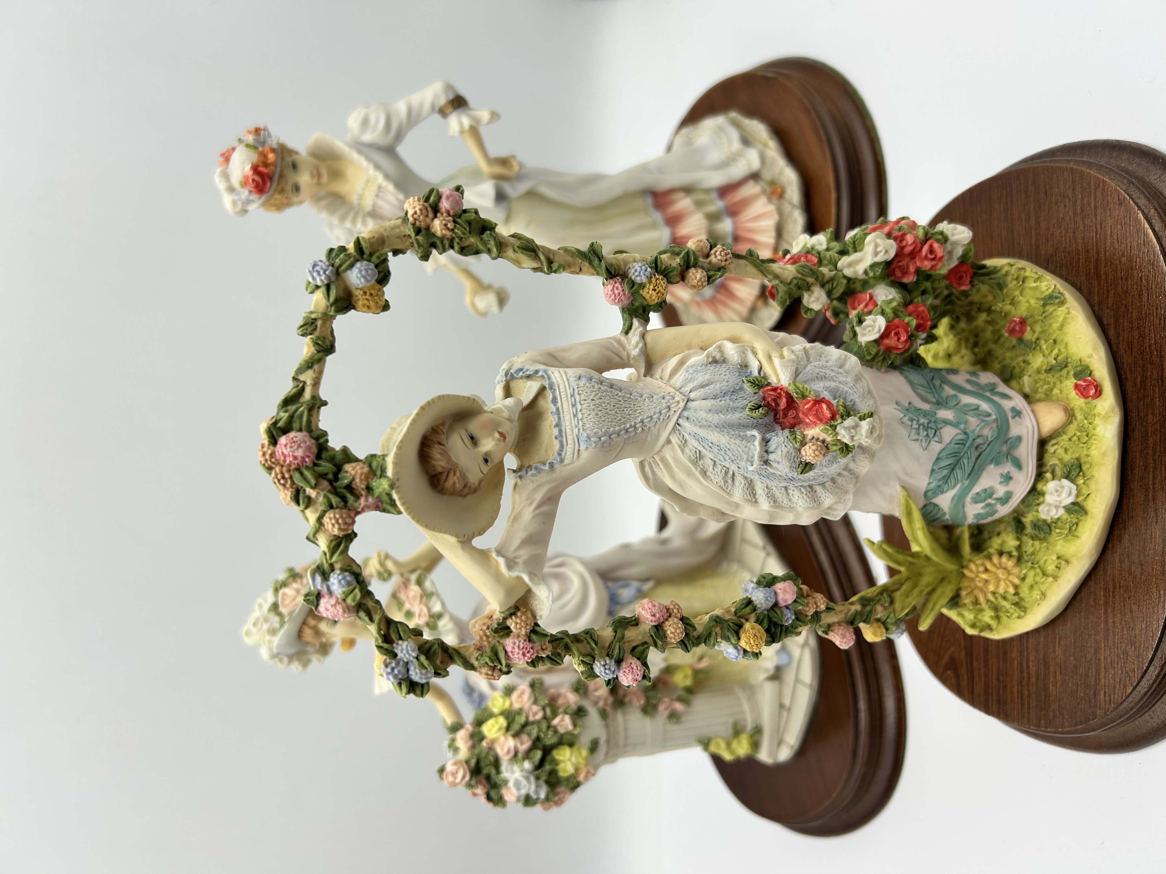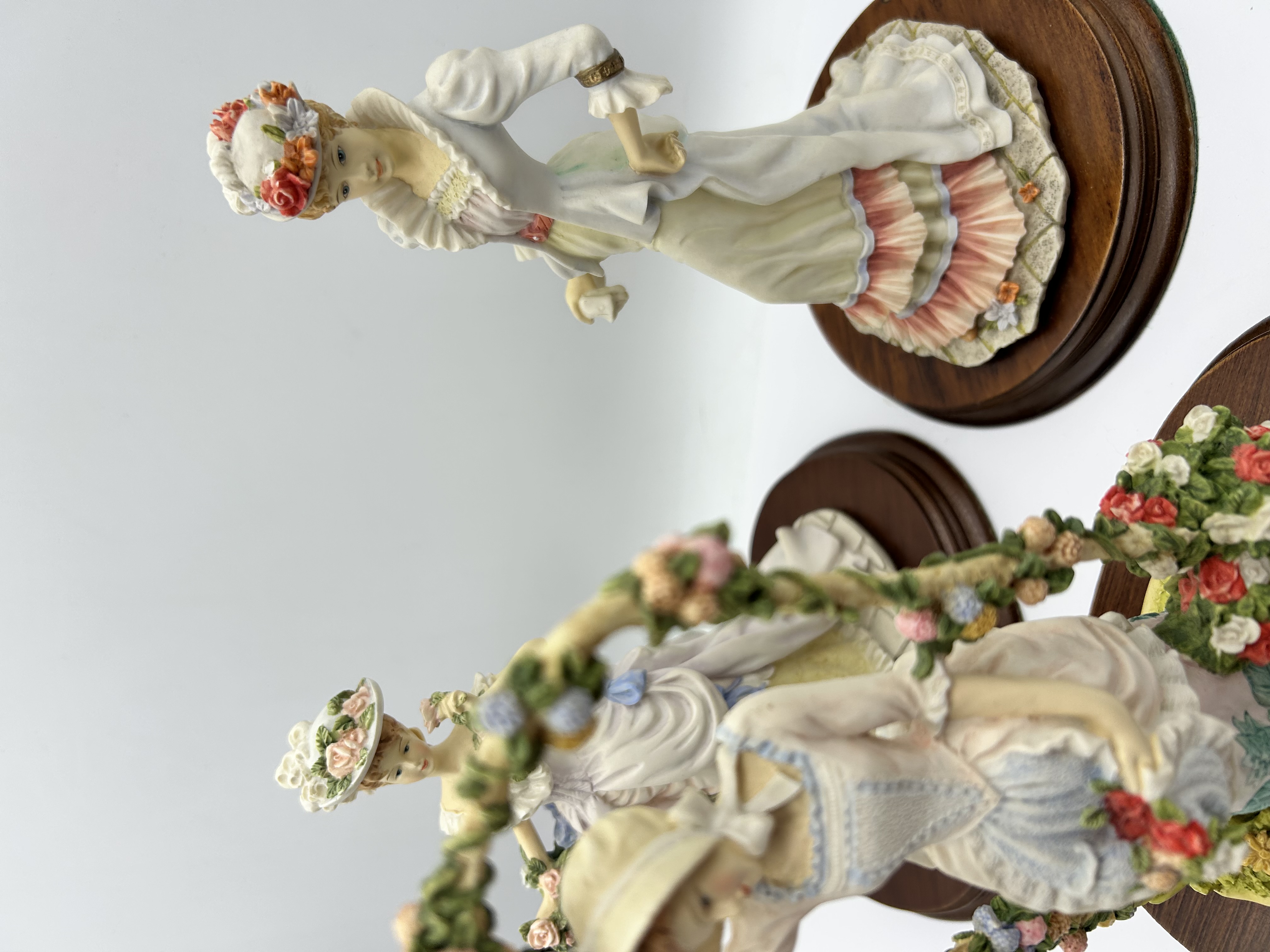 A trio of figurines from The Leonardo Collection, specifically from The Flower Garden series, dated circa 1991. These hand-painted pieces are crafted from resin or porcelain and depict women in Victorian-style period costumes. The figures feature detailed elements such as ruffled dresses, wide-brimmed floral hats, and handheld bouquets. One figure is positioned under a decorative floral arbor. Each piece is mounted on a circular, dark-finished wooden base. The collection is finished in a soft pastel color palette.