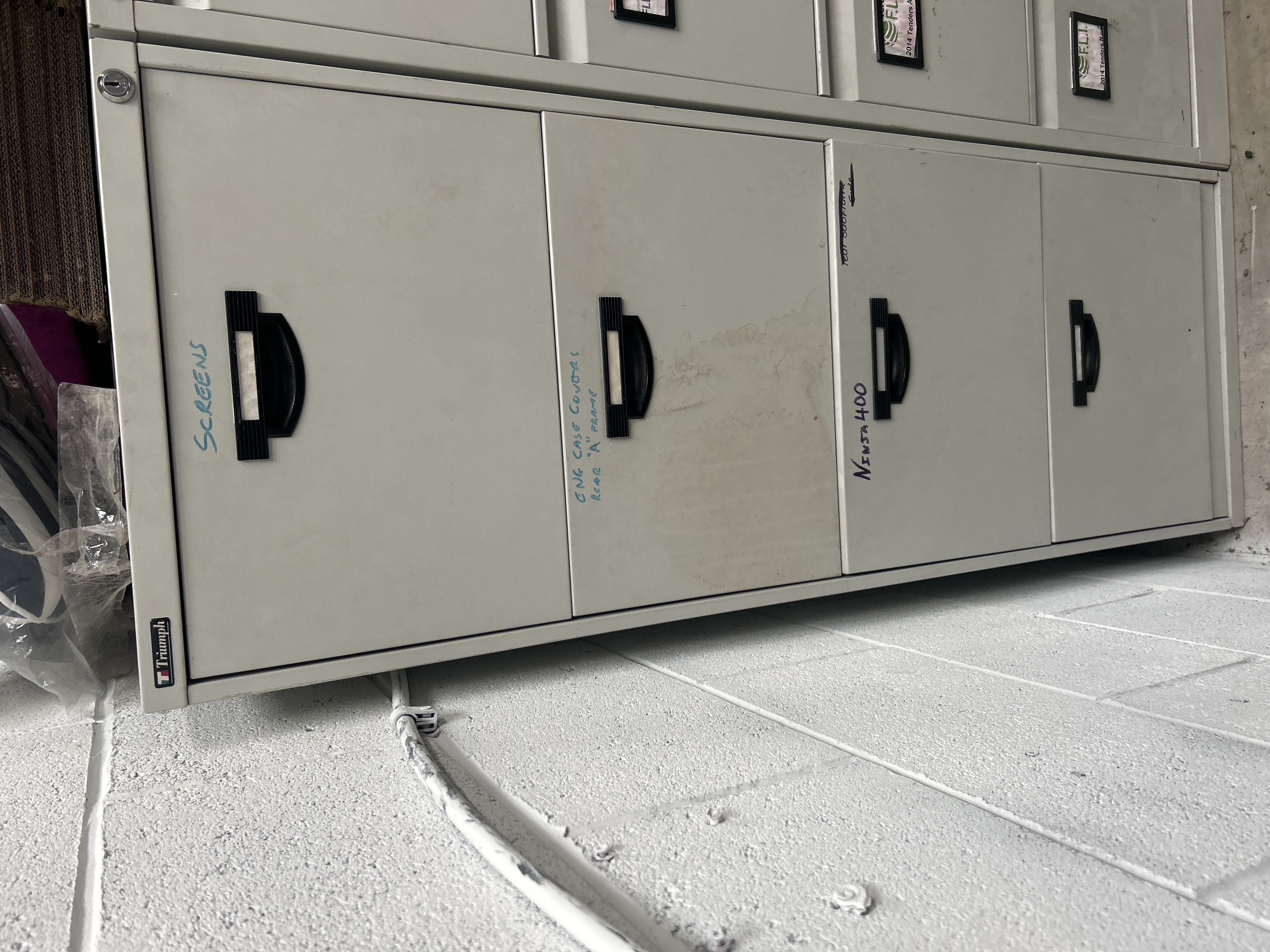 A Triumph brand industrial-style metal filing cabinet featuring a light gray painted finish. The unit is configured with multiple drawers, each equipped with recessed black plastic handles and integrated label holders. A side-mounted locking mechanism is present, though no key is included with this lot. The drawer fronts feature various handwritten notations in ink, including SCREENS, ENG CASE COVERS / REAR A FRAME, and NINJA 400. Additionally, printed labels identify the contents as part of a 2014 F.L.I. Tenders archive.
