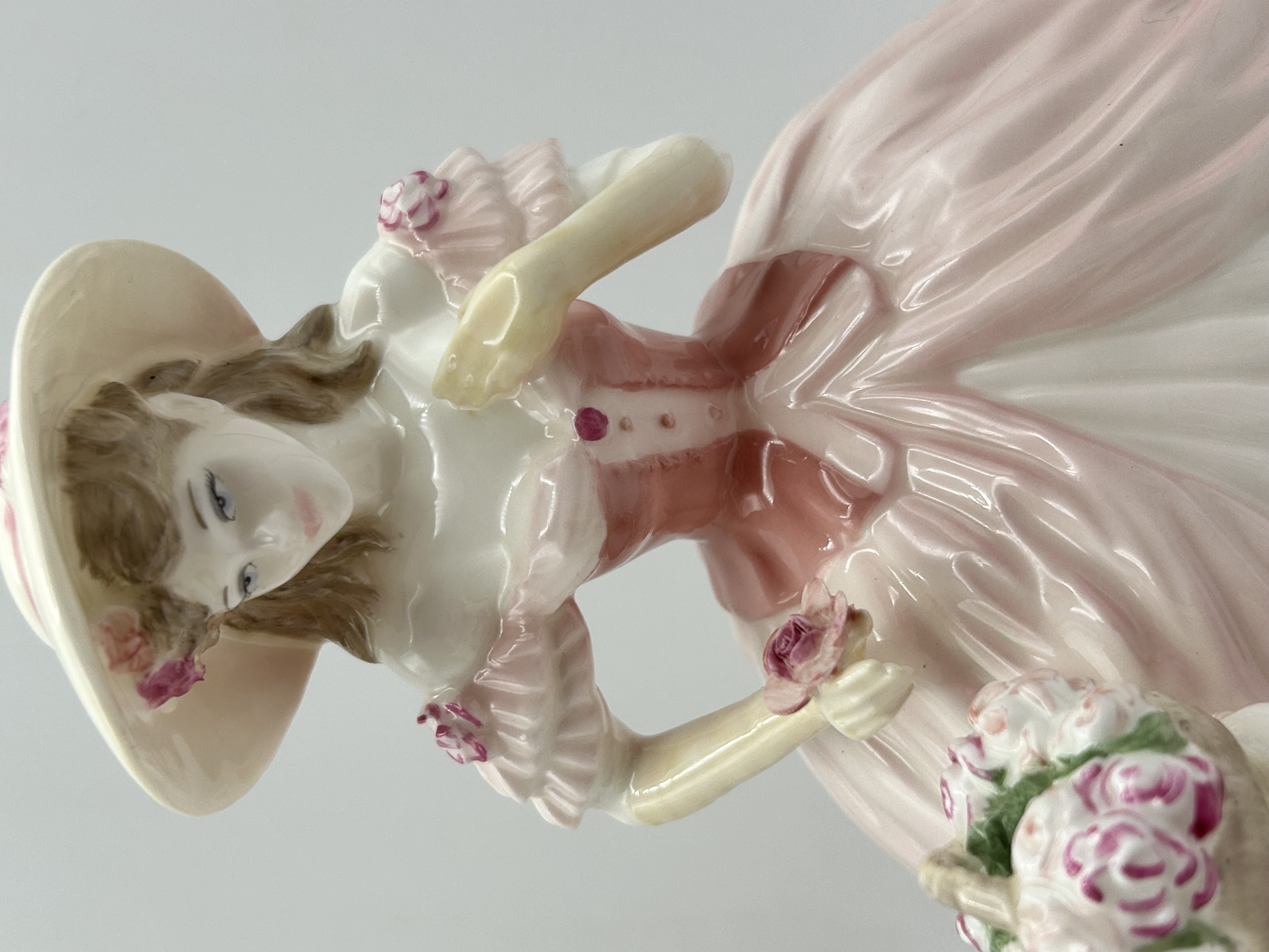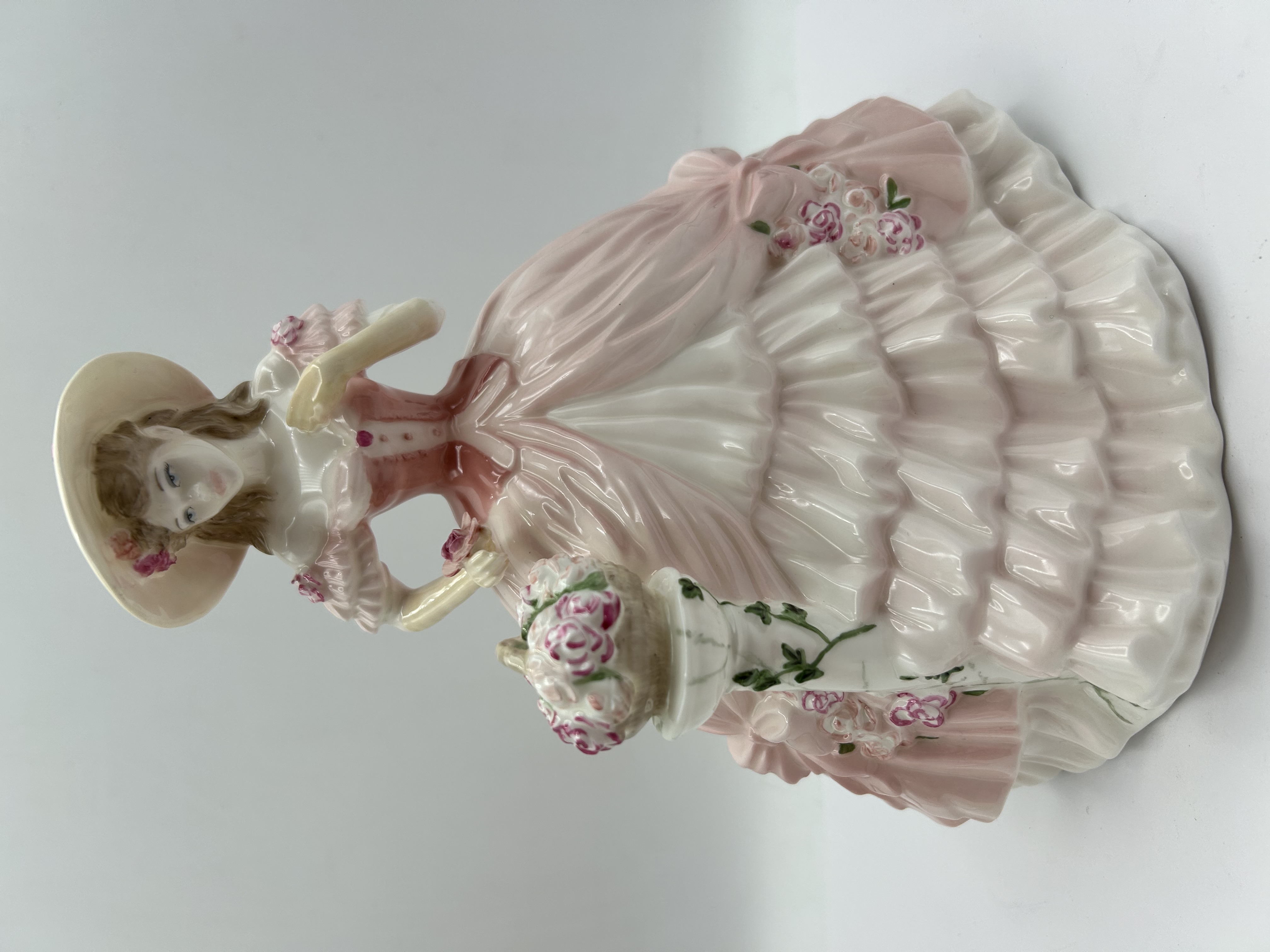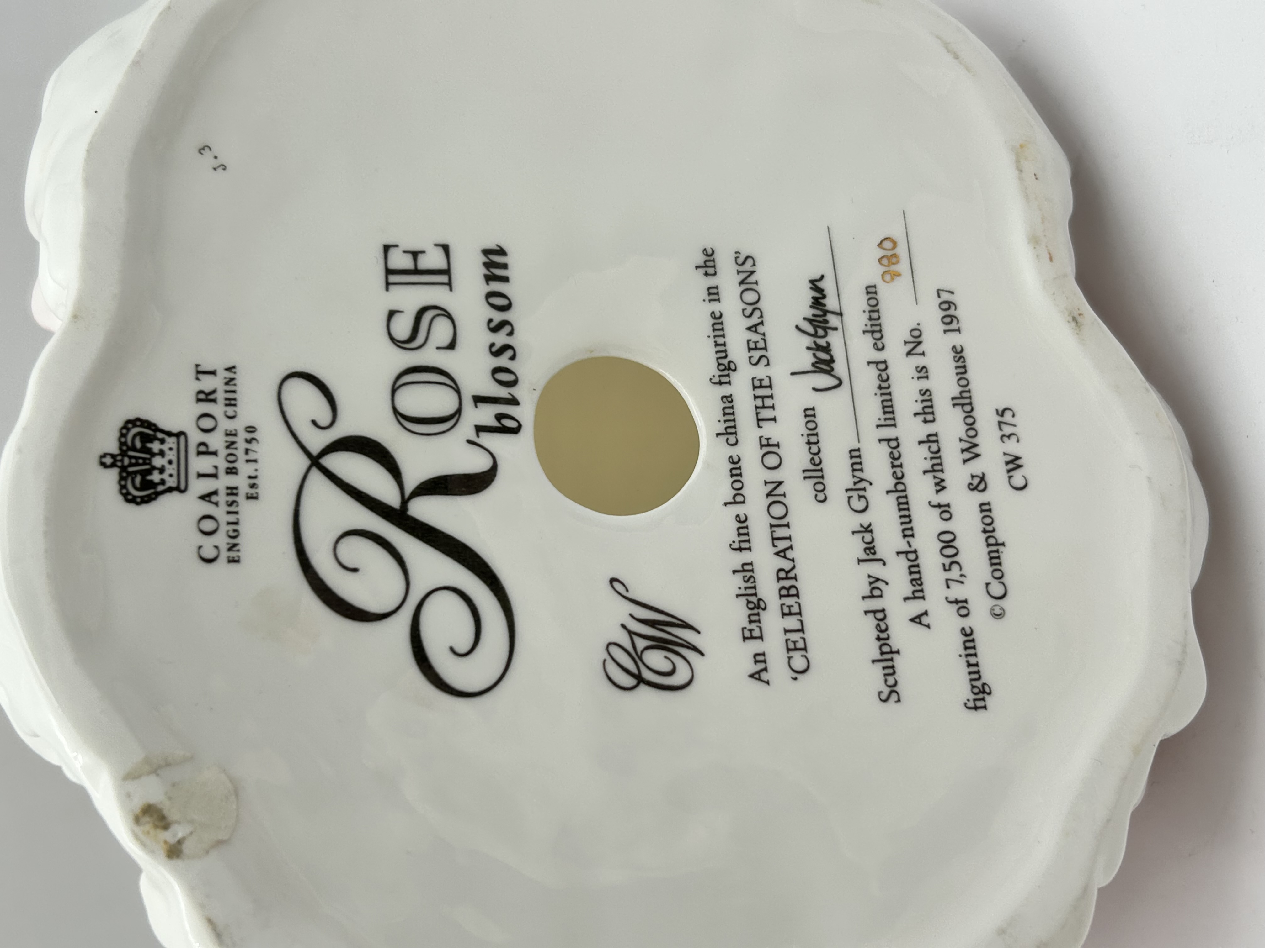 A Coalport plywood figurine titled Rose Blossom, part of the Celebration of the Seasons collection. This piece was sculpted by Jack Glynn for Compton and Woodhouse in 1997. The figure depicts a woman in a Victorian-style tiered and ruffled gown with a wide-brimmed hat decorated with roses, holding a basket of blossoms. The base is marked with the manufacturer stamp, the title, the collection name, and the sculptor signature. It is a hand-numbered limited edition, identified as number 980 of 7,500.