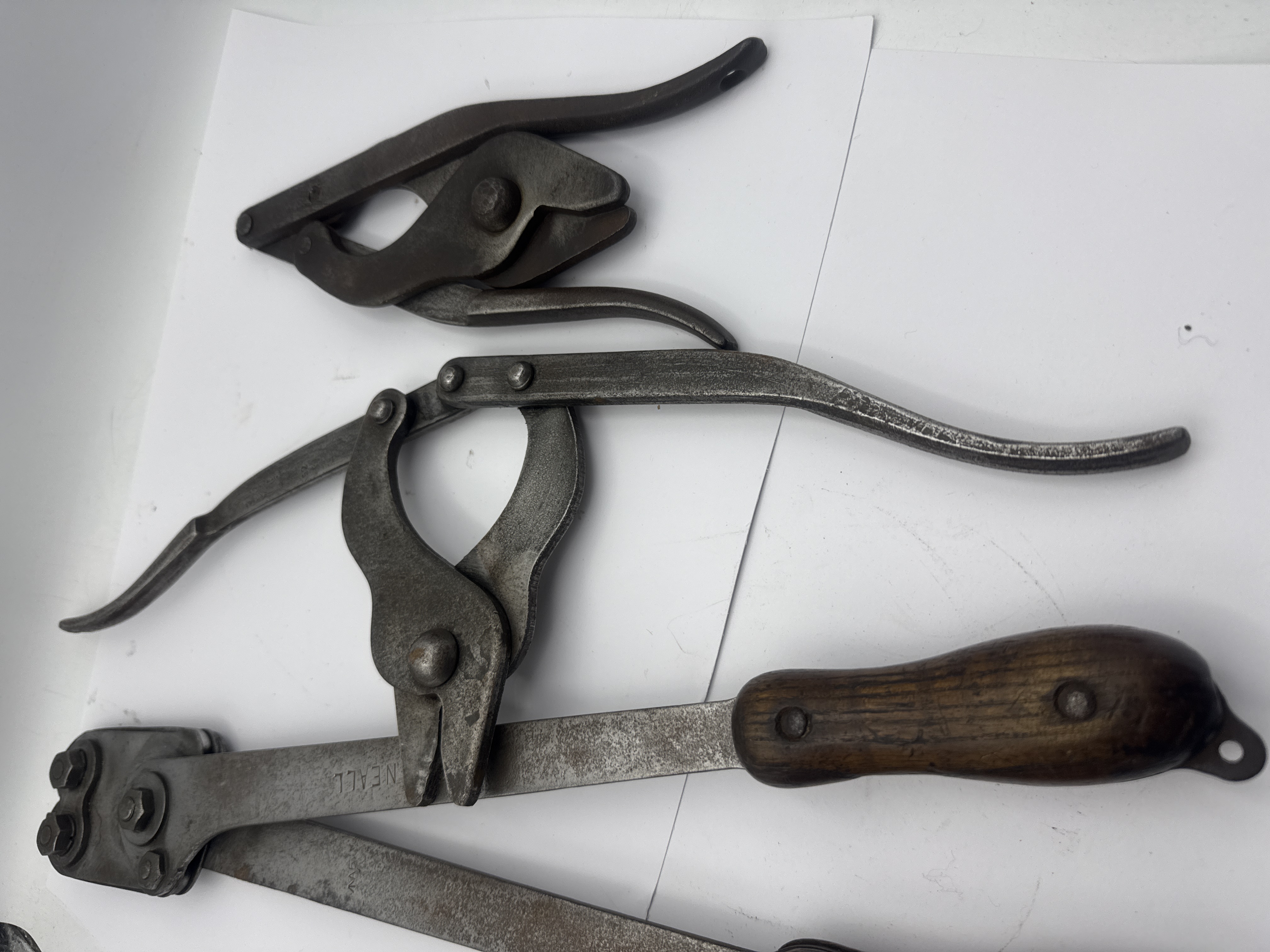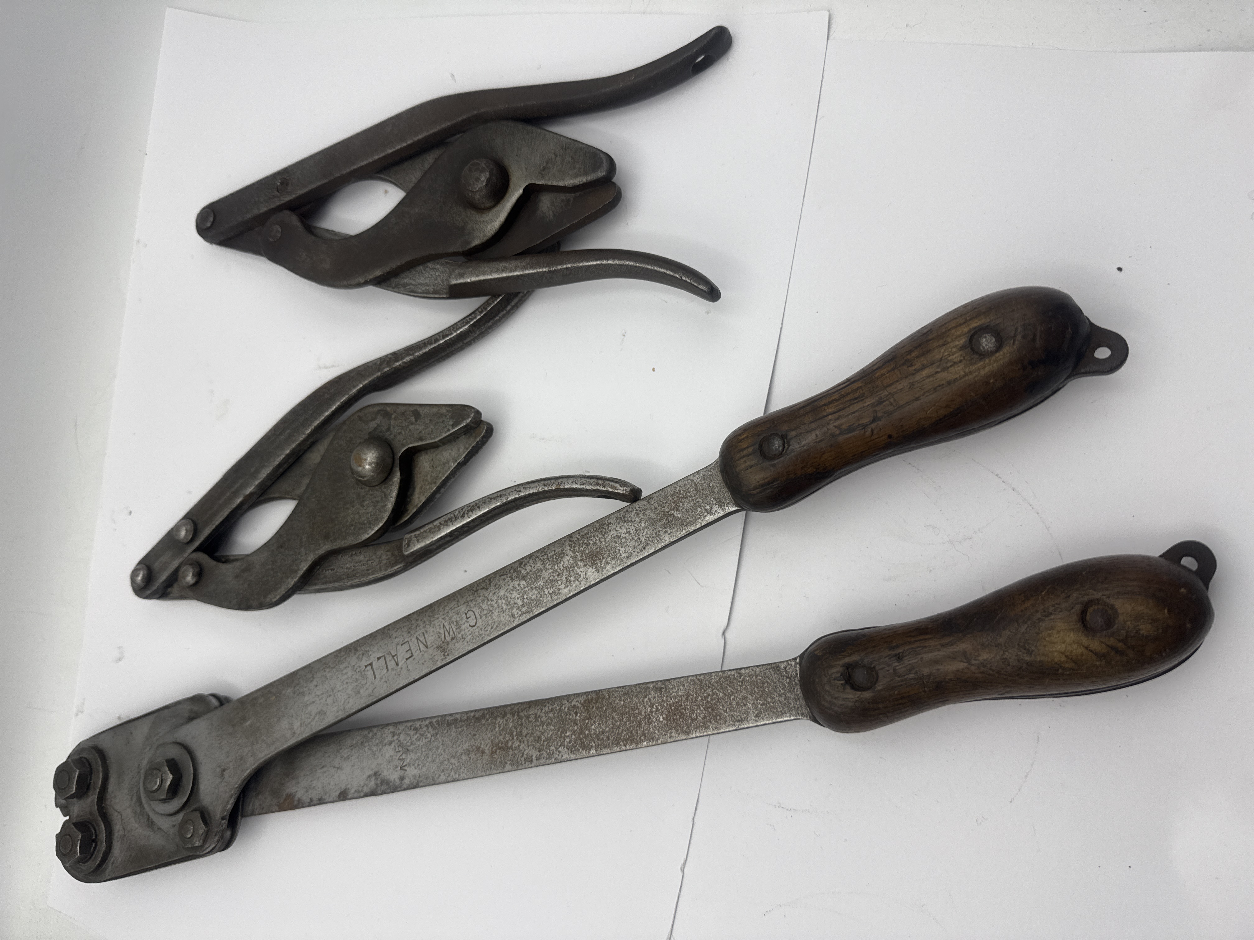 A trio of British military army wire cutters and specialty parallel-jaw pliers. These real military issue tools are constructed from darkened steel showing a natural patina. The large heavy-duty wire cutters feature long flat-bar handles terminating in turned wooden grips secured with rivets. One handle of the large cutters is stamped with the name G. W. NEALL. The two additional specialty pliers exhibit a parallel-jaw mechanism and are constructed of similar darkened metal.