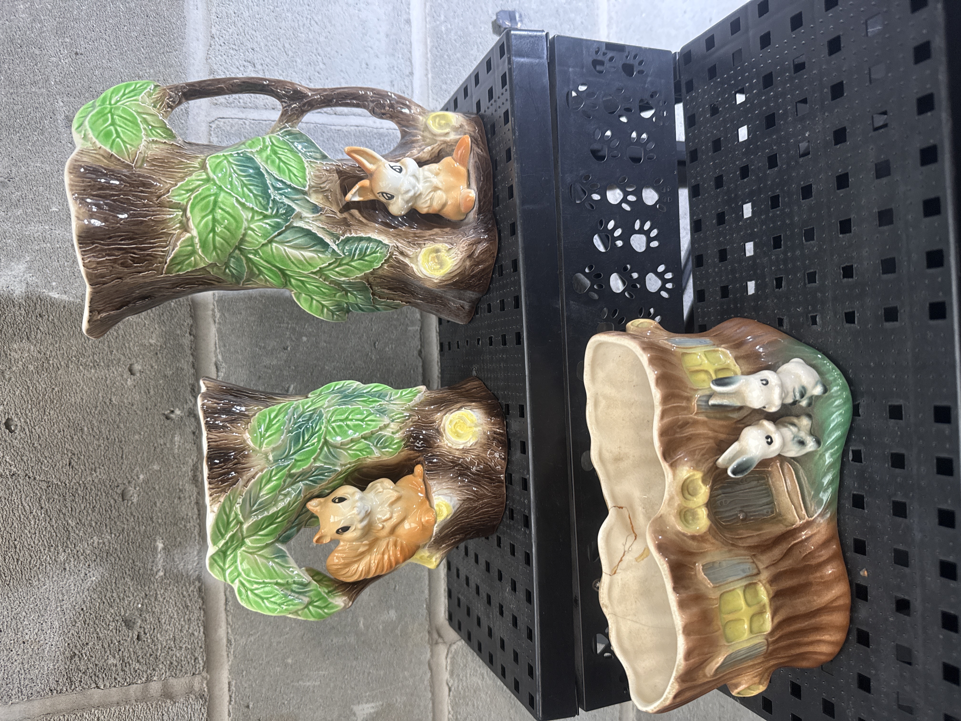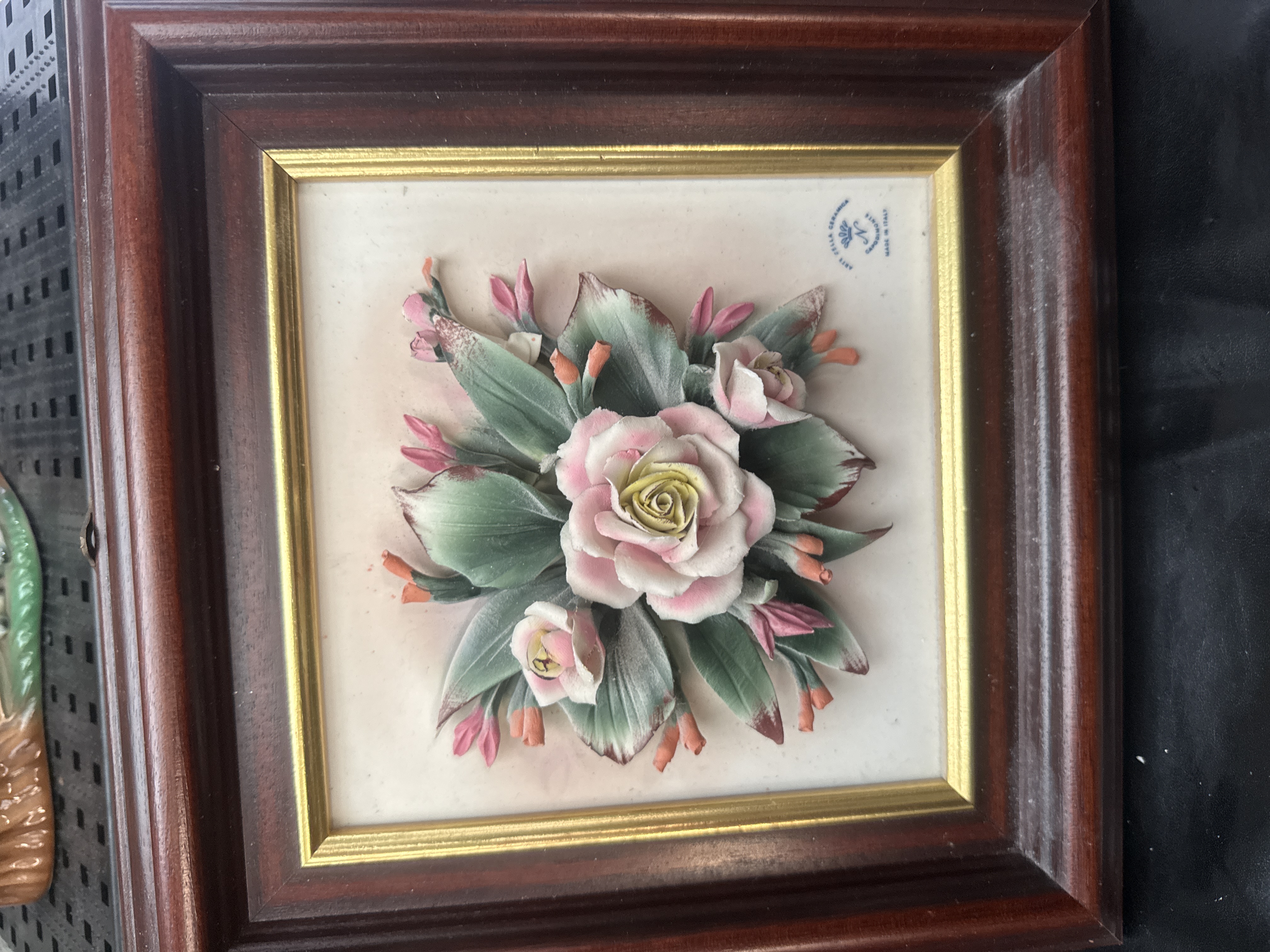This collection features a framed three-dimensional porcelain floral arrangement and several woodland-themed ceramic planters. The primary piece is an Arte Della Ceramica Capodimonte porcelain sculpture depicting pink and cream cabbage roses with green foliage and buds. The porcelain is set against a light-colored background and housed in a deep-profile wood frame with a gold-toned inner border. The piece bears a blue stamp for ARTE DELLA CERAMICA, CAPODIMONTE, MADE IN ITALY along with a crowned N hallmark. The accompanying glazed ceramic planters are modeled as tree trunks and logs, decorated with green leaves and small animal figures including rabbits and a squirrel.