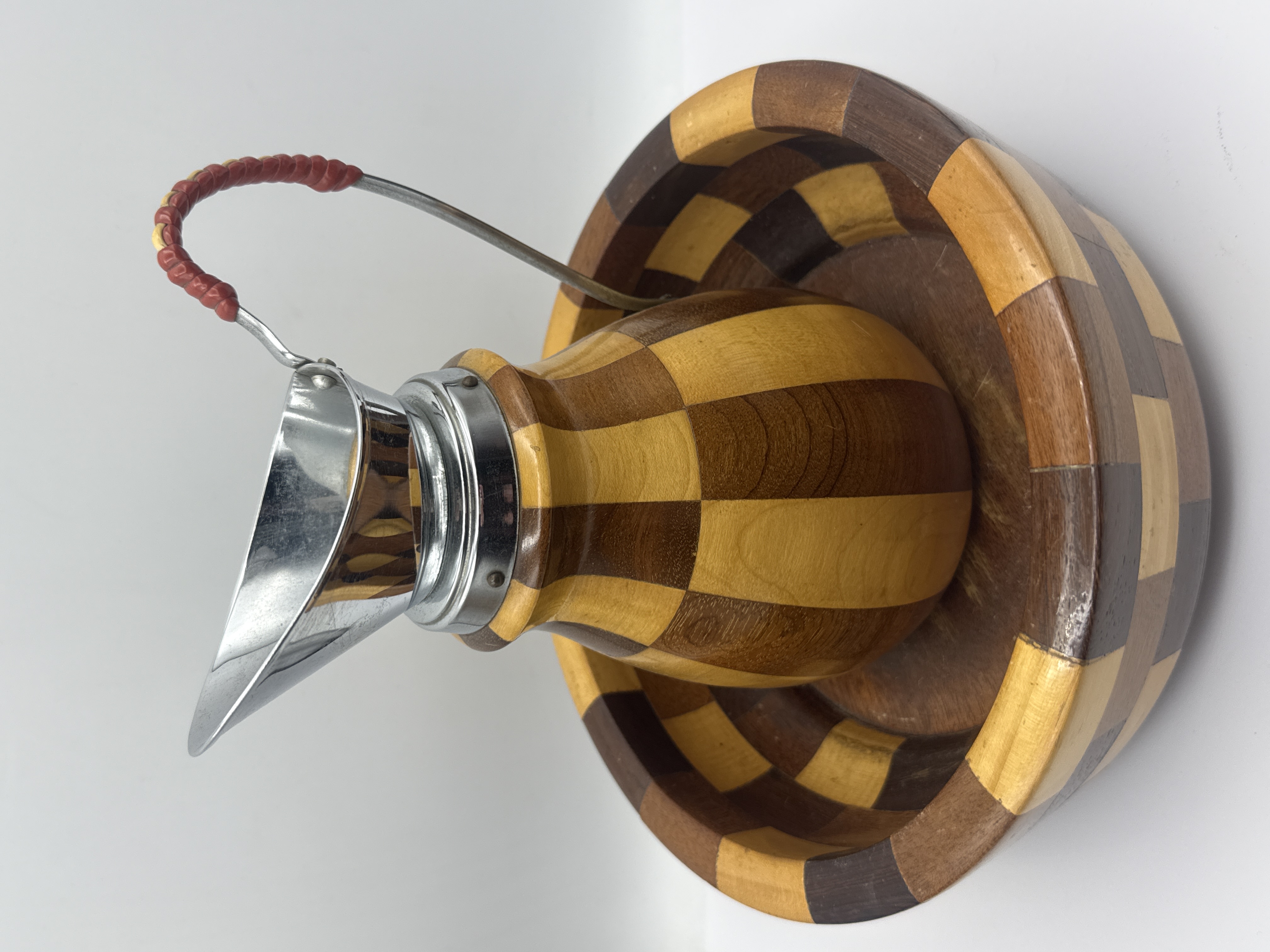 A two-piece set consisting of a wooden jug and a deep circular bowl, both featuring a segmented and laminated construction of contrasting light and dark hardwoods in a decorative brickwork pattern. The jug, measuring 8 inches in height, is designed with a rounded, tapered body and is fitted with a polished chrome-finished metal spout and collar. It features a slender metal handle finished with a textured red grip. The accompanying bowl displays a matching inlaid design and is of the form typically used as a yarn dispenser.