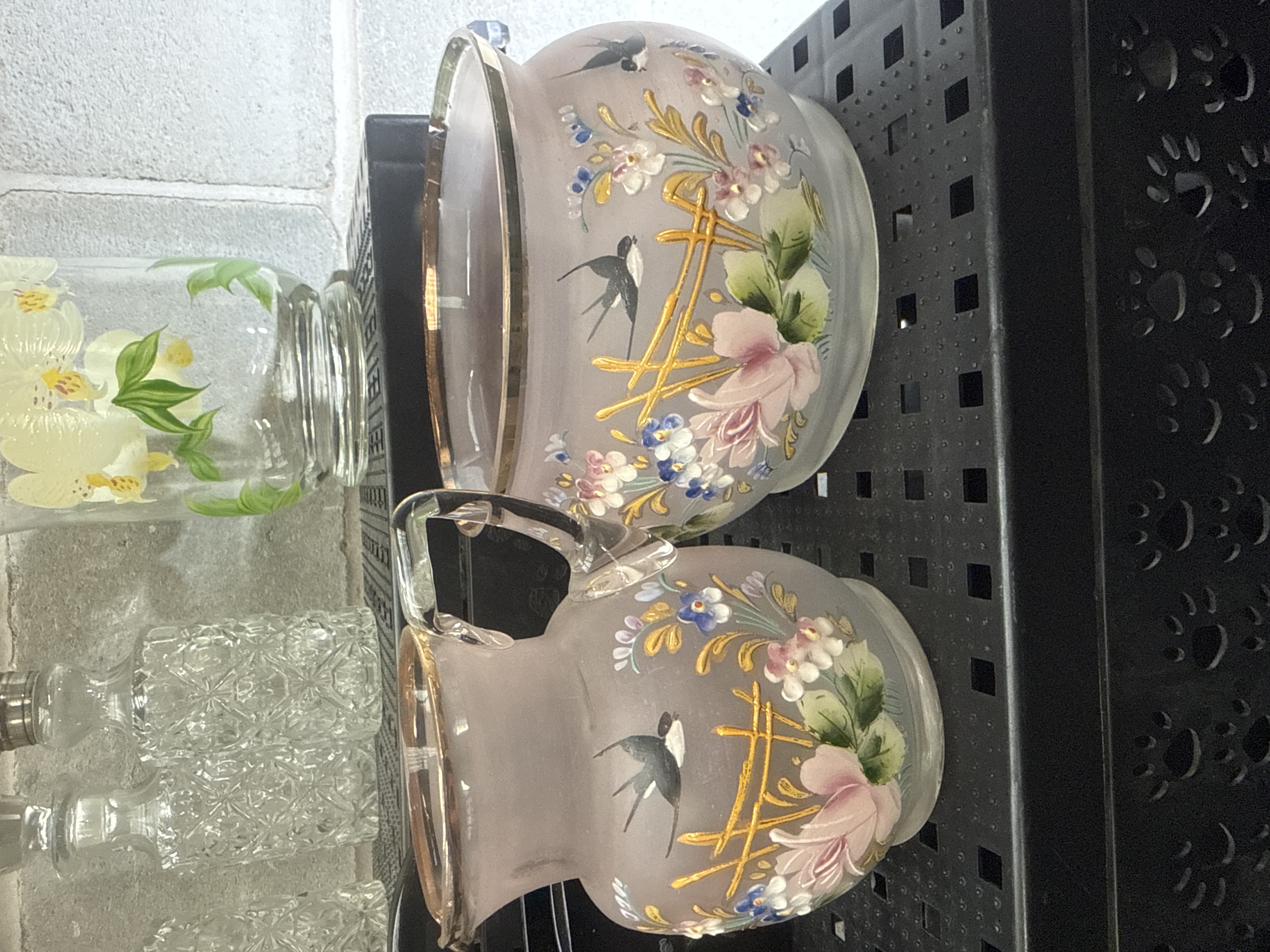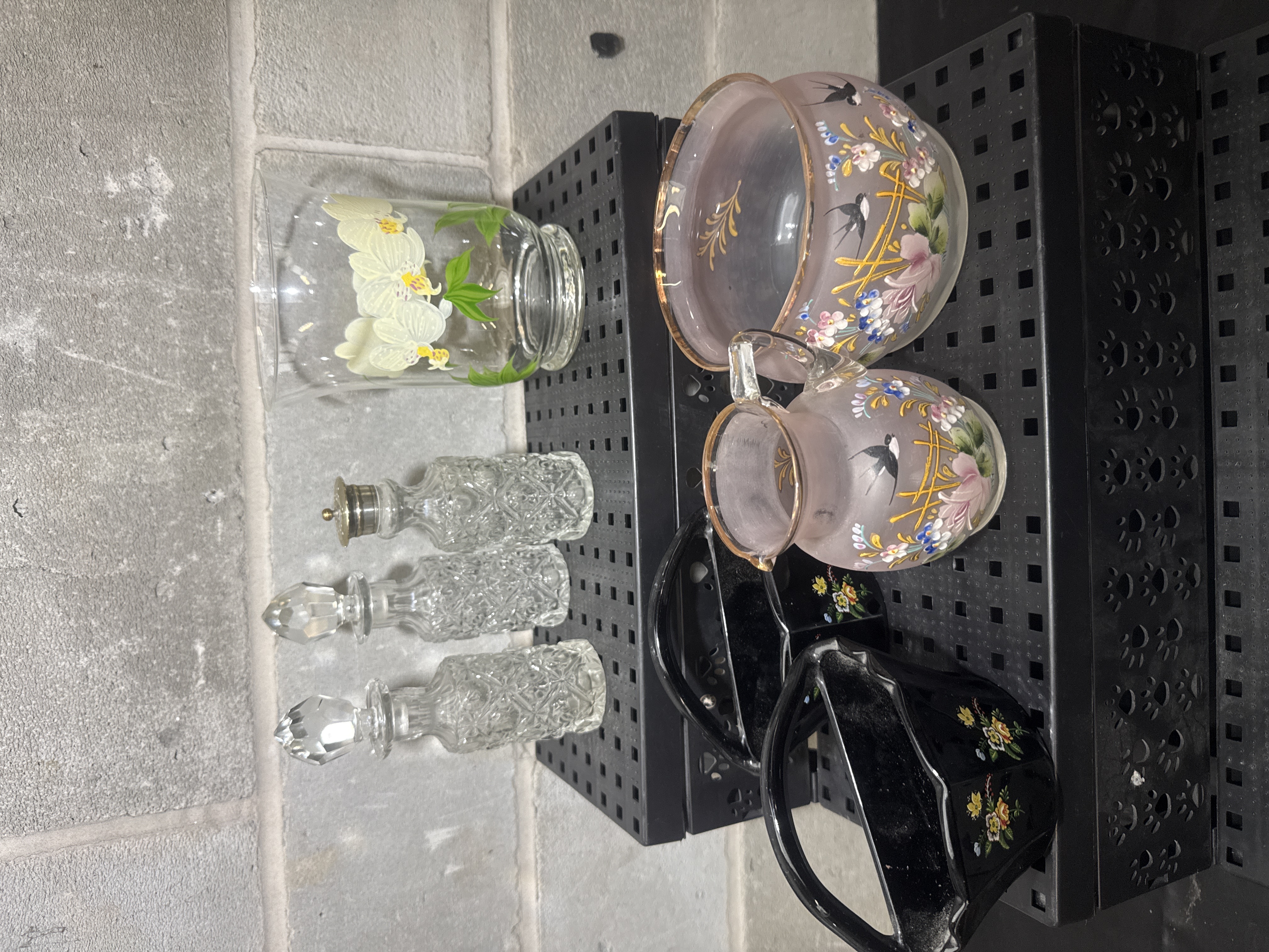 A collection of decorative glassware and ceramics featuring hand-painted ornamentation. The group includes frosted pink art glass pieces, such as a bowl and a pitcher, decorated with enamel birds and floral motifs with gilt highlights in the Victorian style. Also present are cut-glass bottles with stoppers, a clear glass vessel with orchid decoration, and black glazed ceramic wall pockets with floral sprays. The items are constructed from a variety of materials including frosted glass, cut crystal, and glazed ceramic.