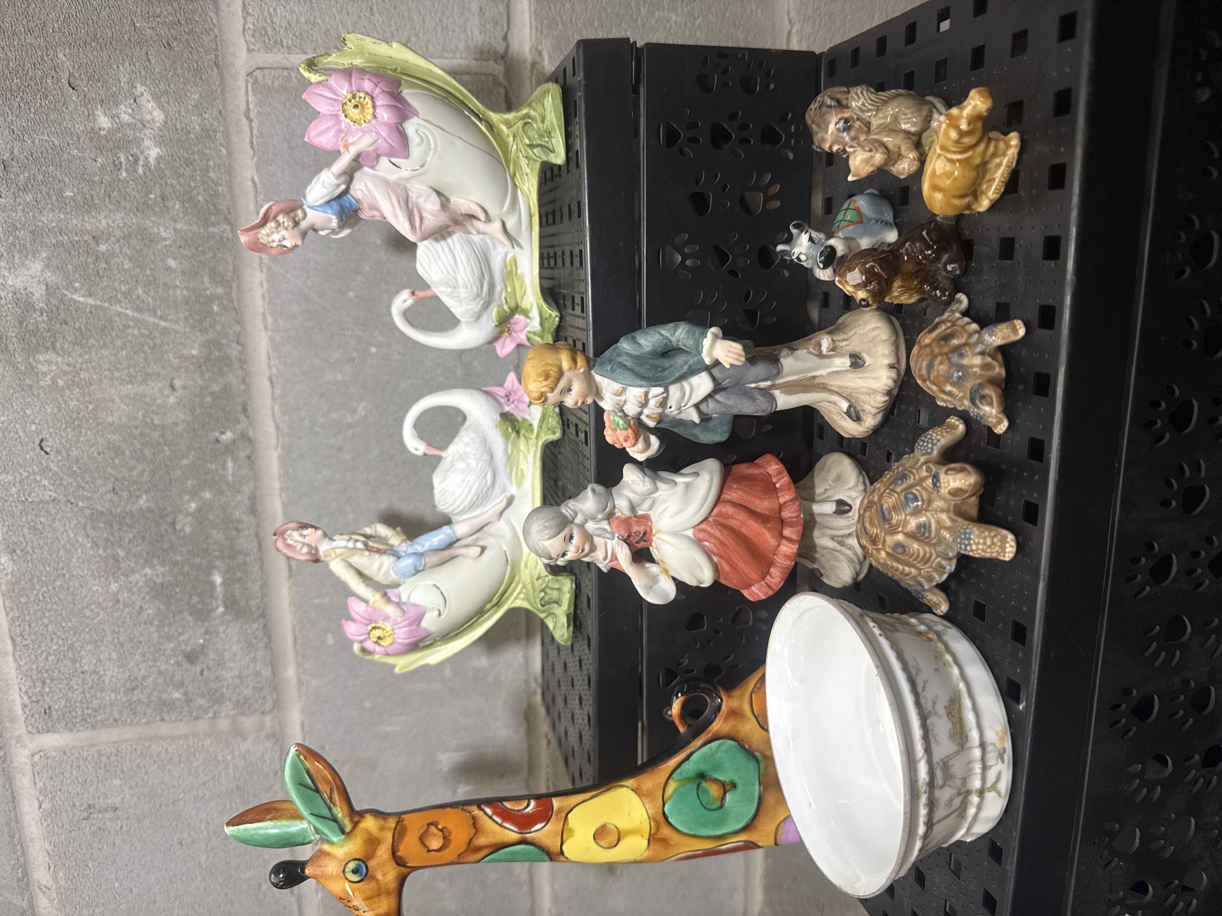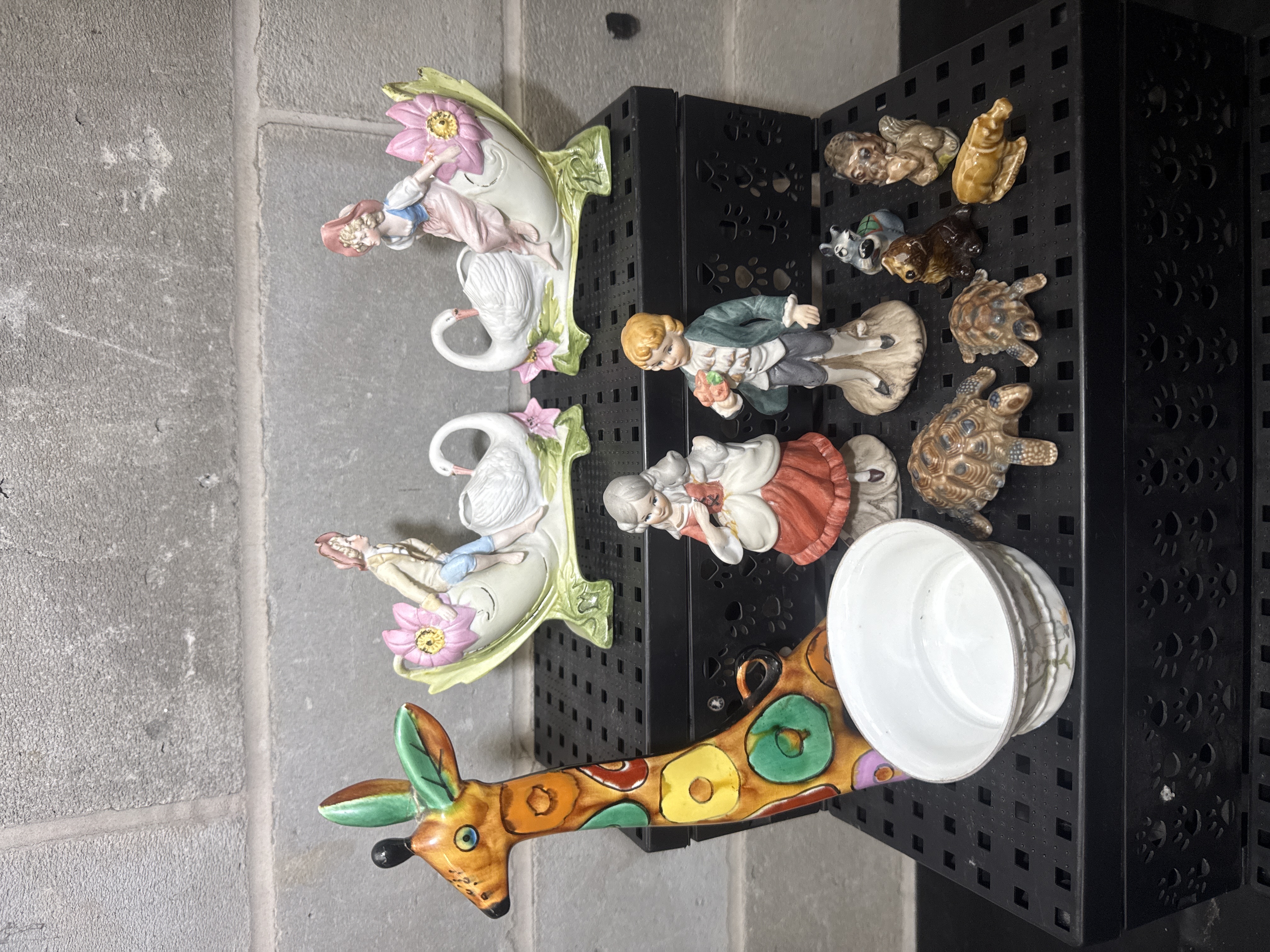 A collection of porcelain and ceramic decorative objects. The lot includes a pair of bisque porcelain planters featuring swan motifs and figures in 18th-century style dress with applied floral decorations. Also present are two standing porcelain figurines depicting a boy and a girl in period costume, consistent with Capodimonte or Royal Crown styles. The group includes several small ceramic animal figurines of dogs and turtles in various finishes. A large ceramic giraffe-shaped vessel with a multicolored circular pattern and a small white bowl with floral decoration are also included. The items are constructed from a mix of glazed and unglazed ceramics.