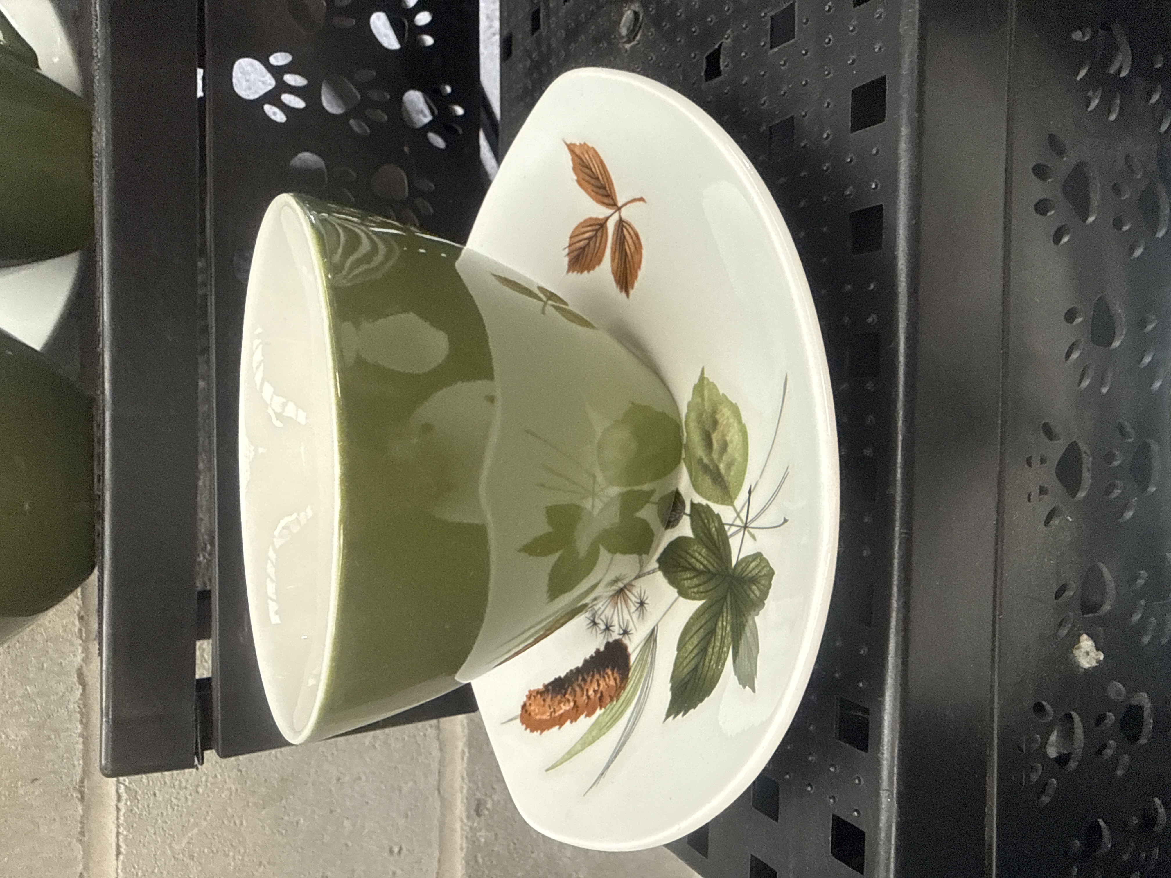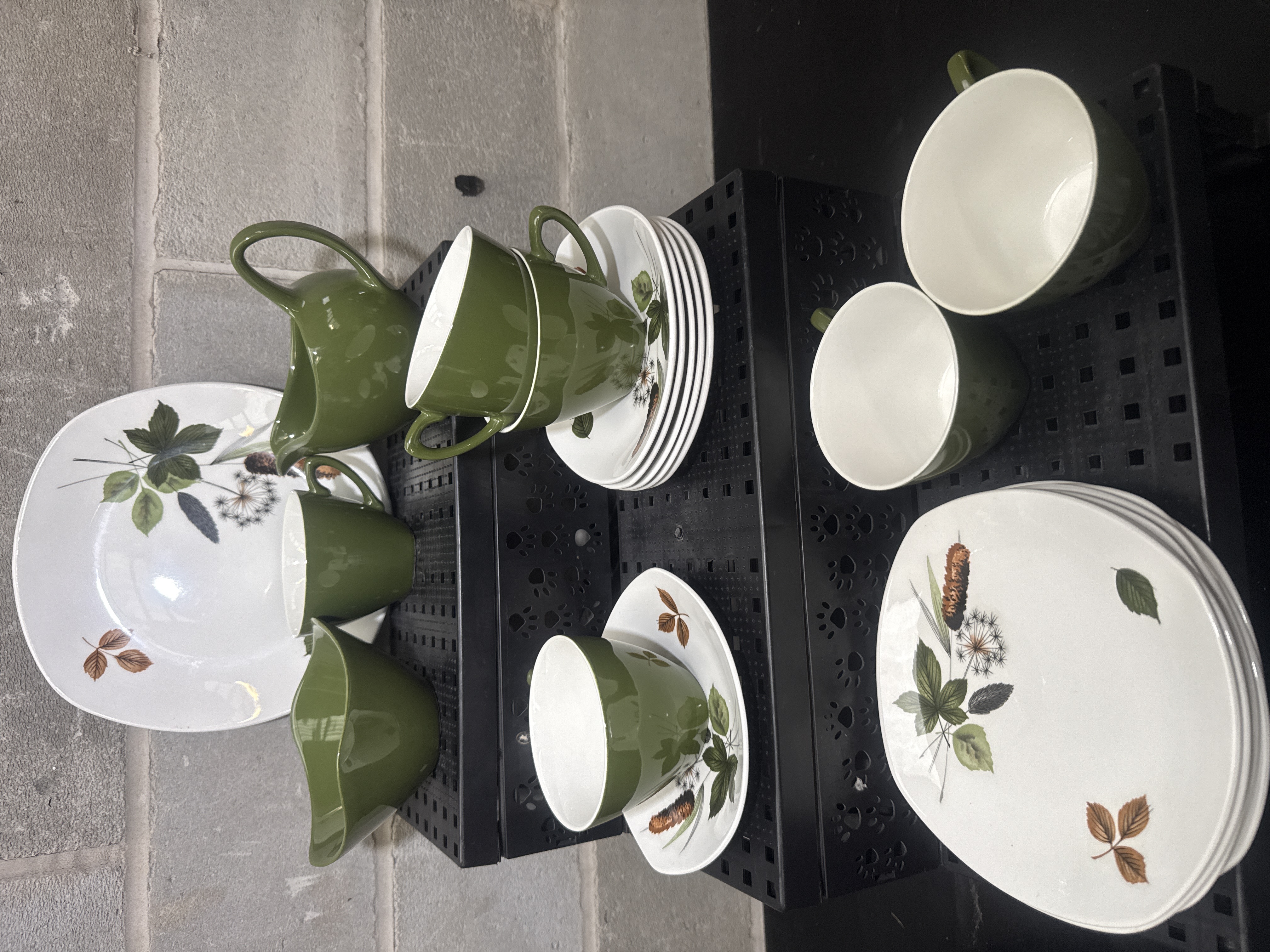 A collection of Midwinter Stylecraft ceramic tableware in the Riverside pattern designed by John Russell. The group includes teacups, saucers, side plates, a dinner plate, a creamer, and an open sugar bowl. The hollowware features a solid moss green glazed exterior with a white interior, while the white-ground plates and saucers are decorated with detailed transfer-printed botanical motifs of leaves, catkins, and seed heads in earthy green and brown tones. The pieces exhibit the organic, stylized shapes characteristic of 1950s British design.